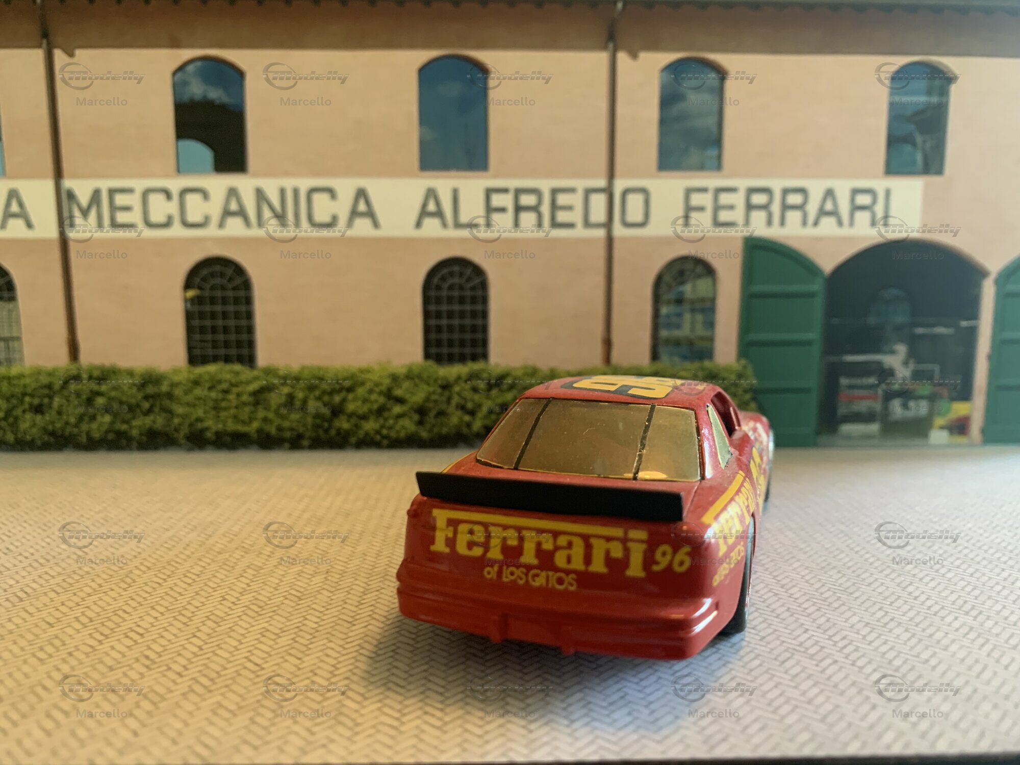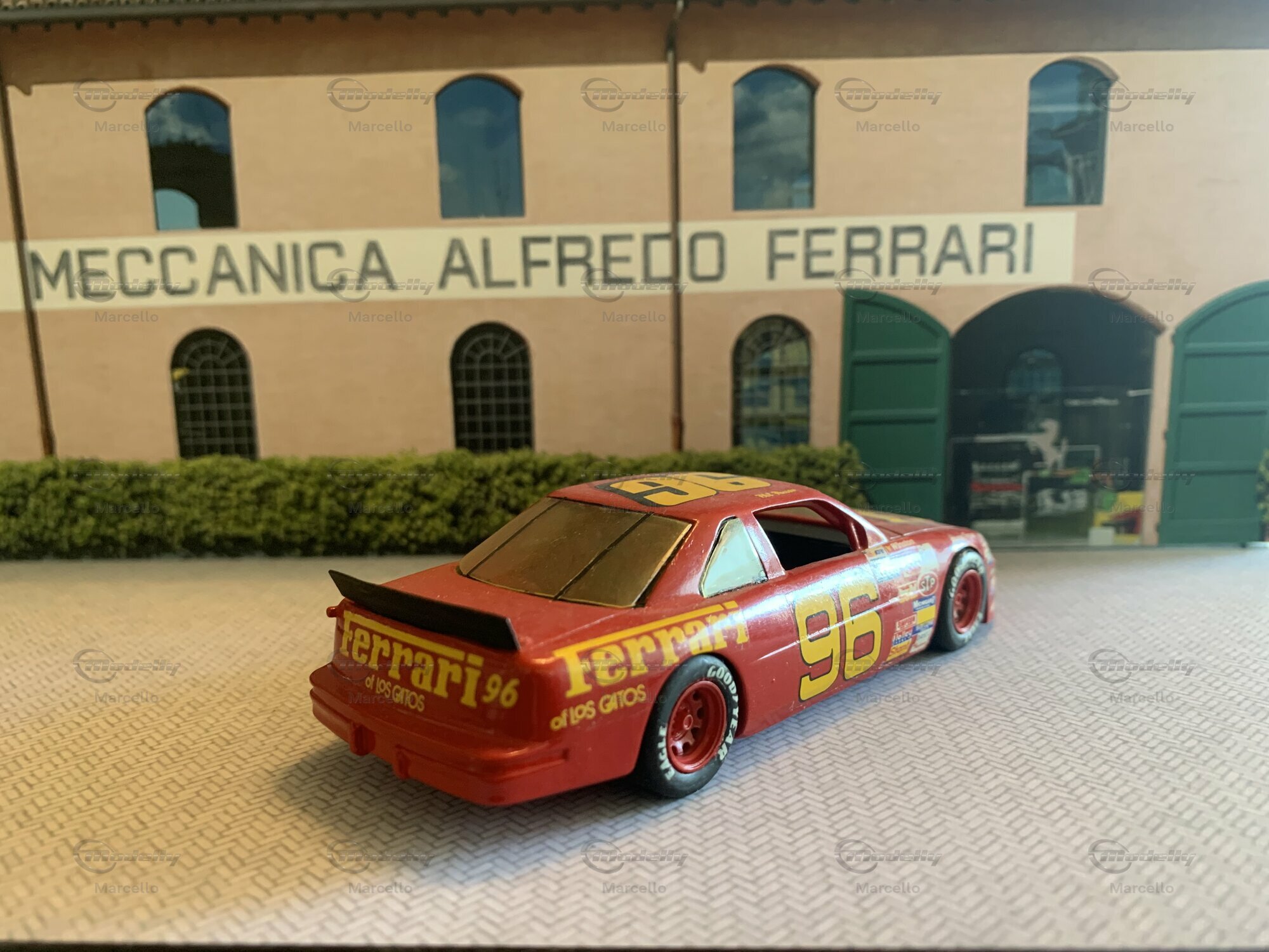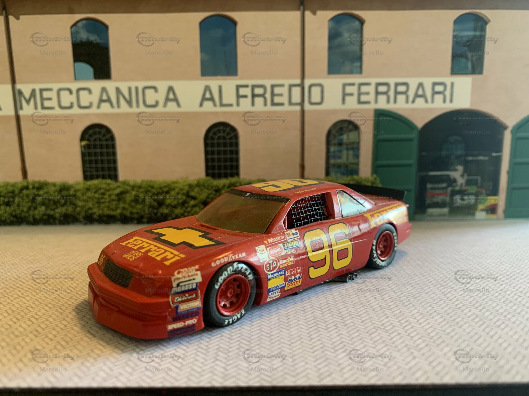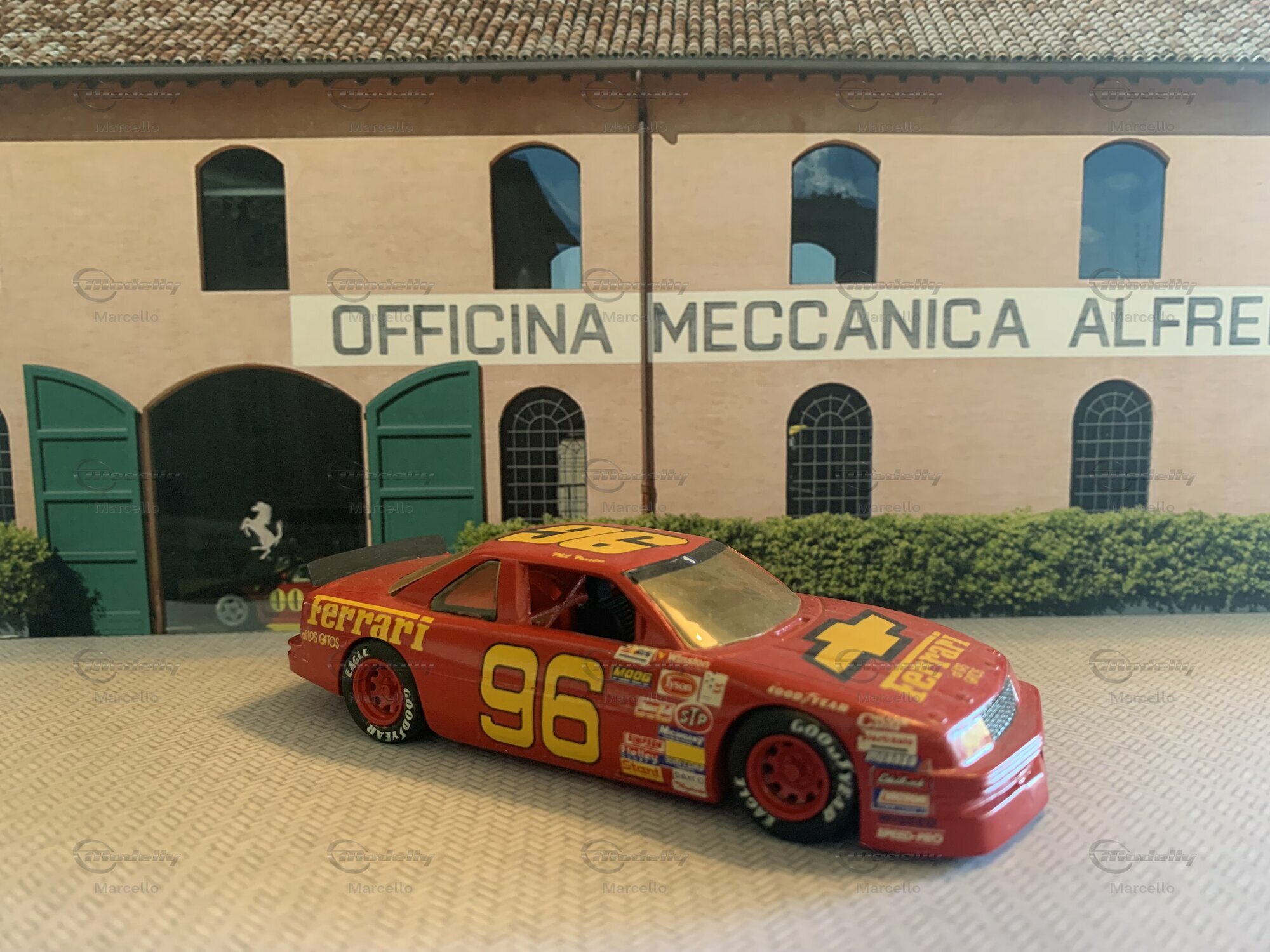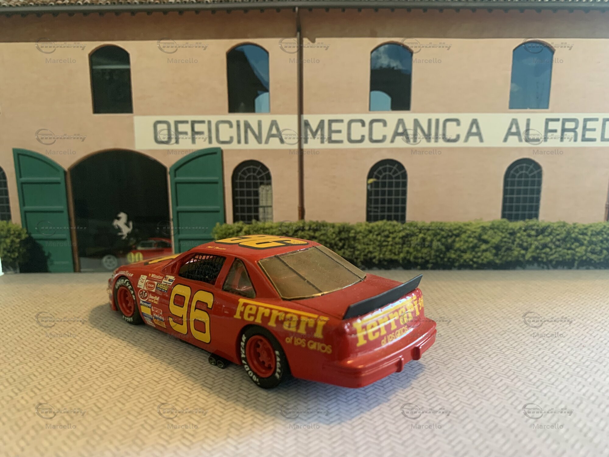 Das abgebildete Modellauto im 1:43 Maßstab stammt vom Hersteller Starter Bausatz und ist aus Resin gefertigt, einer robusten und präzise modellierbaren Kunstharzverbindung, die insbesondere im professionellen Modellbau für detailgetreue Umsetzungen geschätzt wird. Die Farbgestaltung des Modellautos orientiert sich an typischen NASCAR-Themen: Der Wagen ist in auffälligem Rot lackiert, mit großflächigen gelben Rennnummern „96“ auf Türen und Dach. Auf der Motorhaube befindet sich das markante gelbe Rennsymbol inklusive eines roten Kreuzmotivs. Die seitlichen Panels zeigen den Sponsorenaufdruck Ferrari, eine Hommage. Dieses Fahrzeug wie abgebildet, war 1990 in der NASCAR im Einsatz, mit dem Fahrer Phill Parsons. Sponsor vom Team war das Autohaus Ferrari Los Gatos. Besonders auffällig sind die zahlreichen Sponsorenlogos, zu denen GoodYear, Winston, STP, Holley, Magna und Moroso zählen – alle sorgfältig als Decals dargestellt und auf den Fotos deutlich sichtbar. Die Details an Felgen und Reifen, die Nachbildung der Sicherheitsfenster und die feine Gravur der Karosserie sorgen für einen authentischen Eindruck.