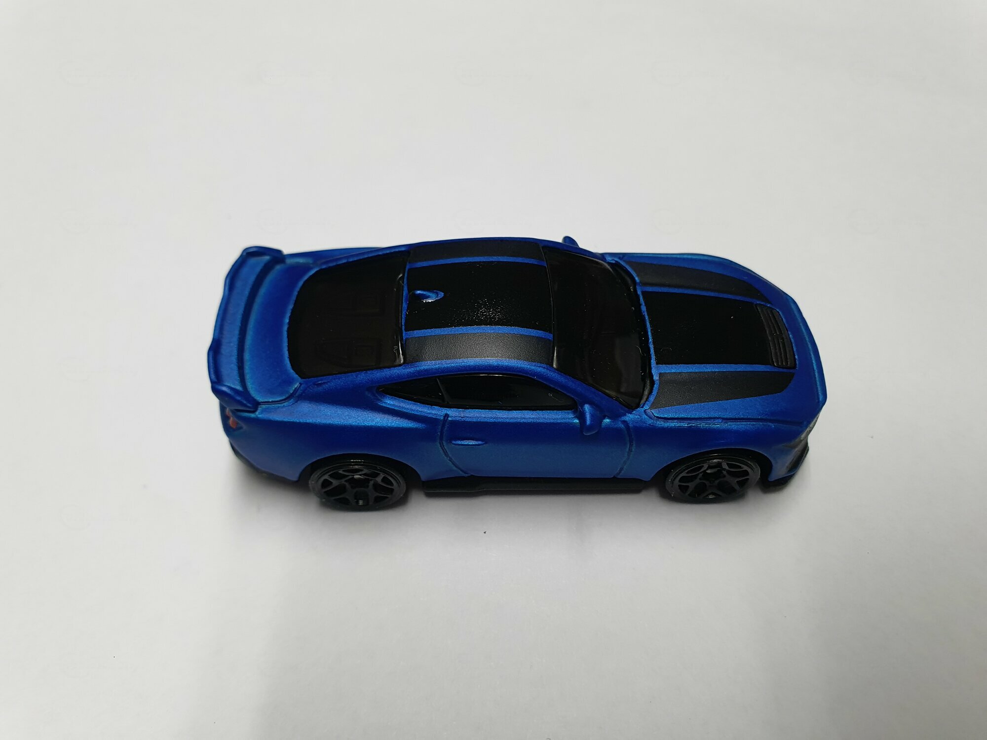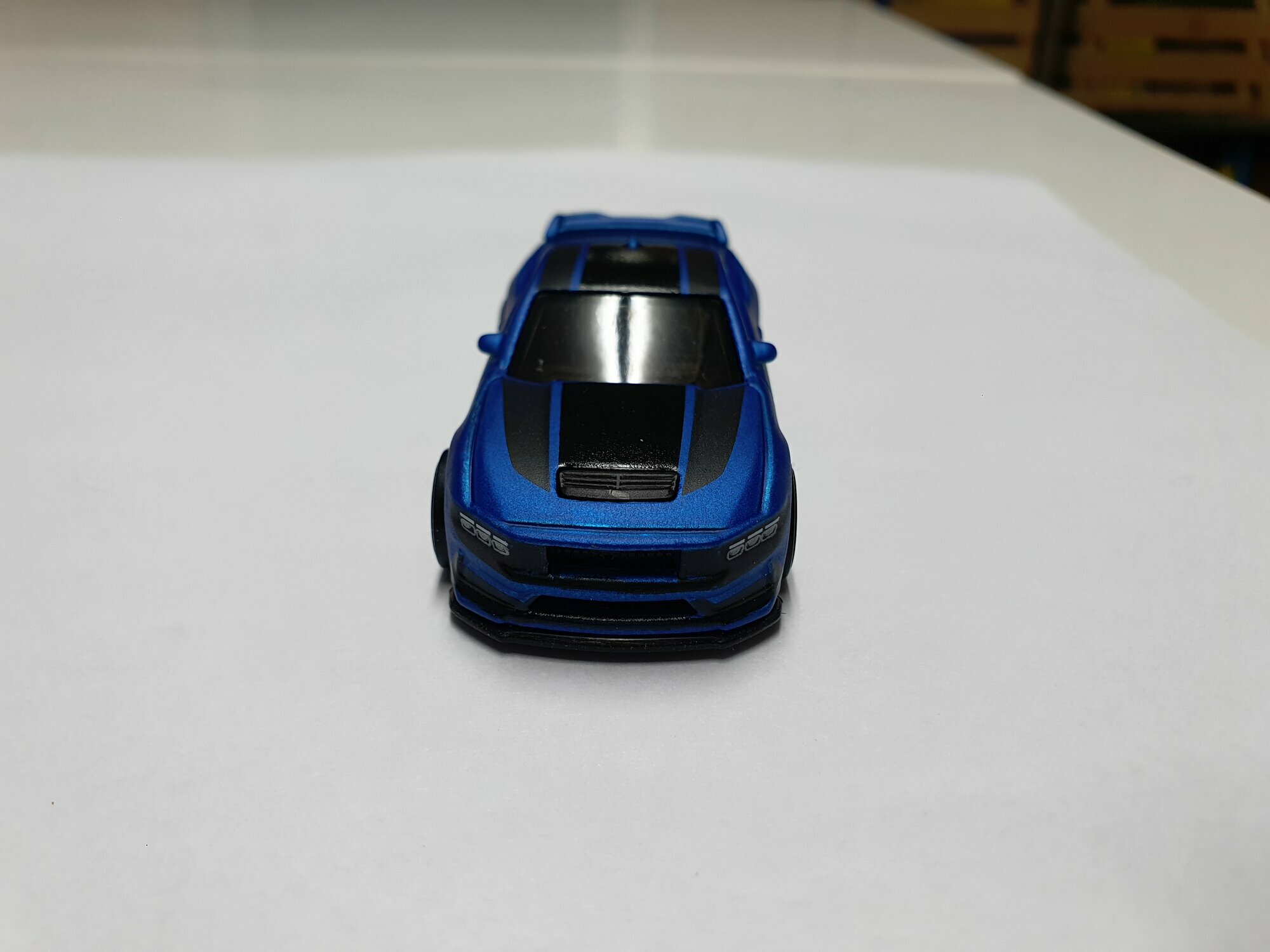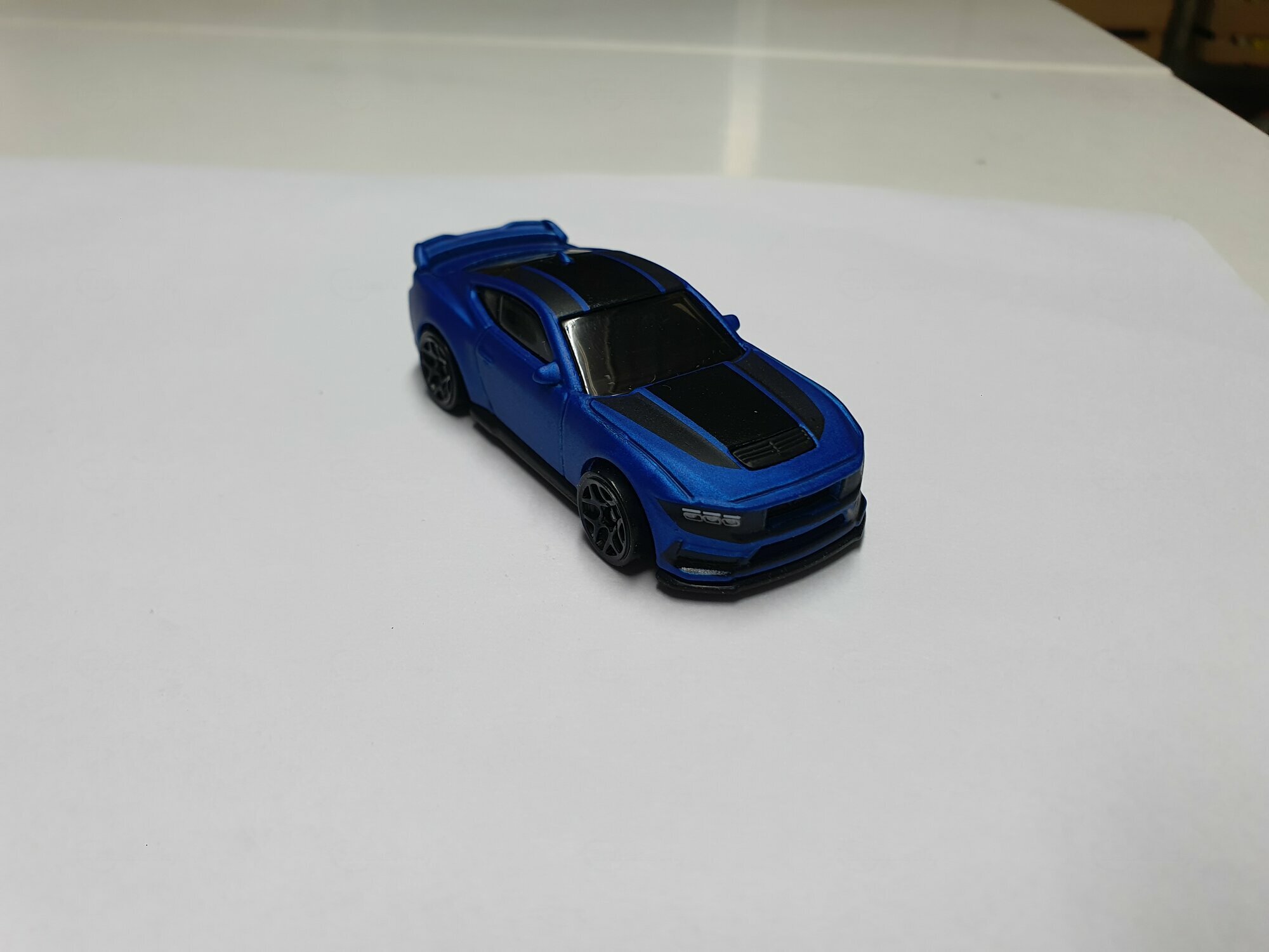Das Hot-Wheels-Modell, das Teil der Sammlung des Nutzers "martin852" ist, hebt sich durch seine hochwertige Umsetzung hervor. Die leuchtend blaue Lackierung in Kombination mit den tiefschwarzen Streifen sorgt für eine visuell kontrastreiche Erscheinung. Der Innenraum lässt sich durch die getönten Scheiben nur erahnen, enthält jedoch angedeutete Details, die die Authentizität des Modells unterstreichen. Auf der Frontpartie sind die charakteristischen Luftöffnungen und der geschlossene Kühlergrill des Dark Horse klar erkennbar. Das Heck des Modells ist mit einem kleinen integrierten Spoiler ausgestattet, der das aerodynamische Konzept des Originals perfekt wiedergibt. Dieses Miniaturauto ist nicht nur ein Spielzeug, sondern eine Nachbildung, die der Performance-Legende des Ford Mustang Dark Horse gerecht wird und einen Ehrenplatz in jeder Sammlung verdient.
