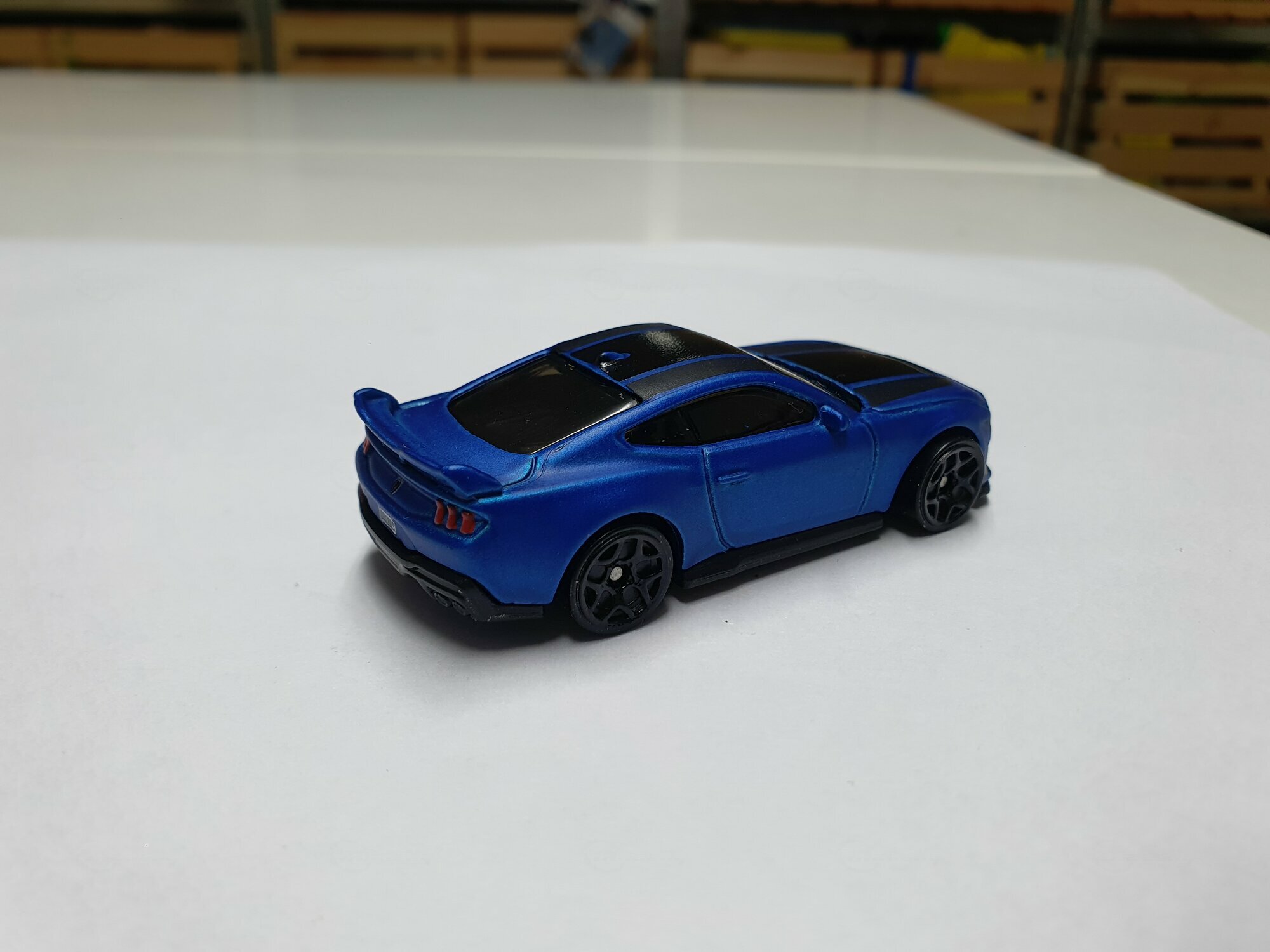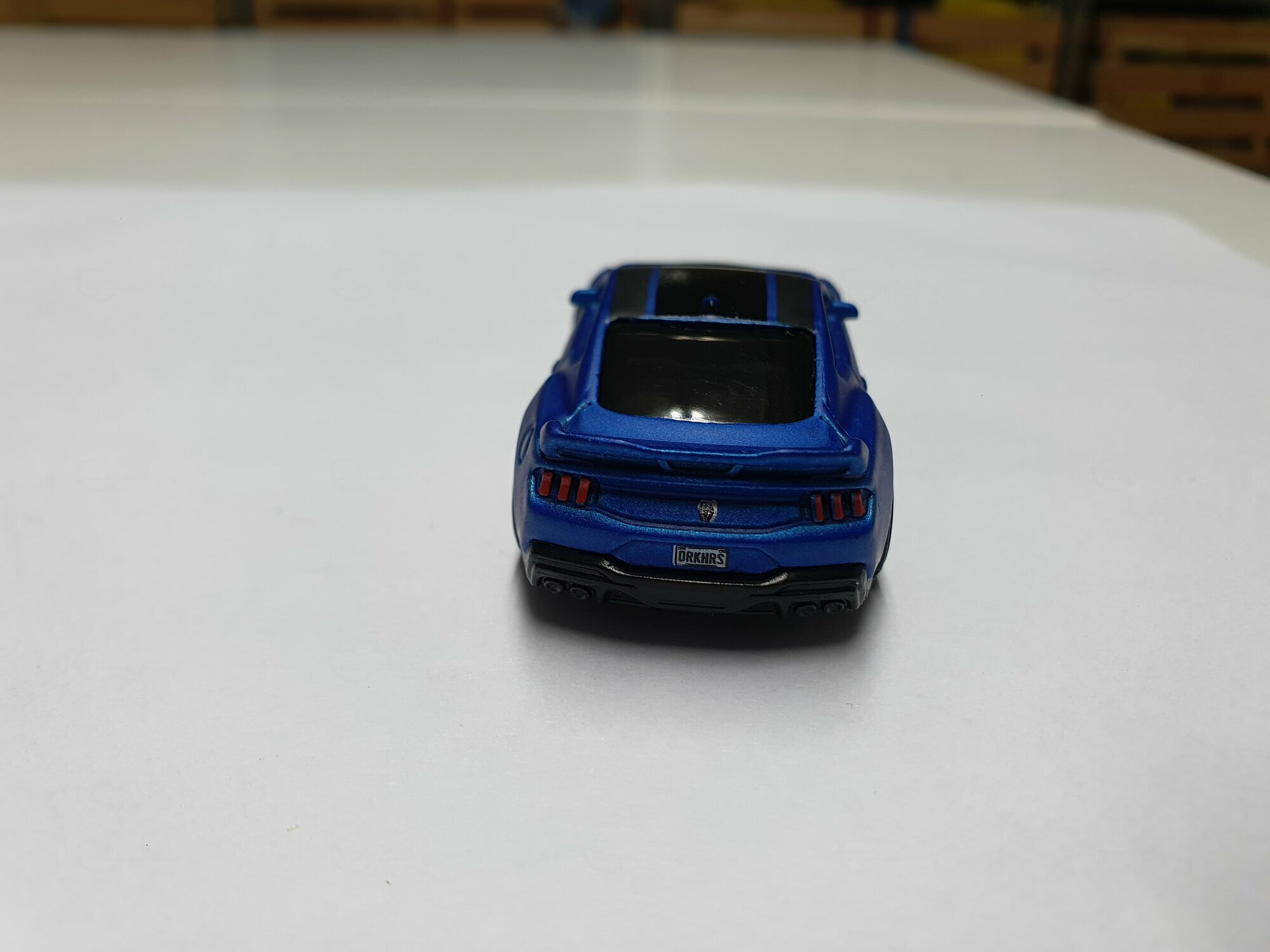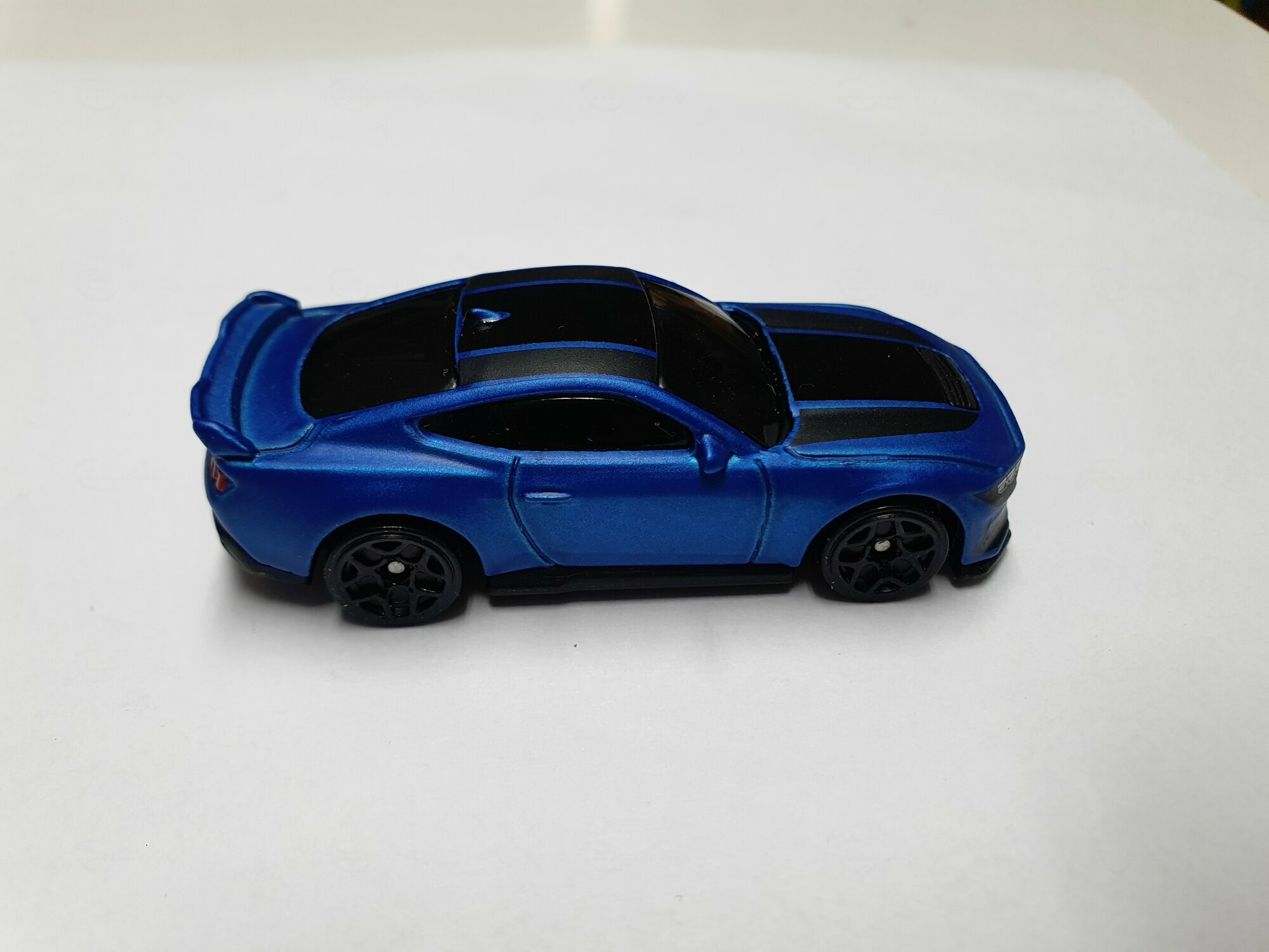 Das gezeigte Miniaturfahrzeug stammt von Hot Wheels, einem weltweit bekannten Hersteller für Modellautos. Die Detailgenauigkeit dieses Modells im Maßstab 1:64 ist bemerkenswert. Die Karosserie des Modells ist aus gemischtem Material gefertigt, was die Struktur langlebiger und detailreicher macht. Auffällig ist die blaue Lackierung mit schwarzen Akzenten, die den aggressiven Charakter des Originals widerspiegelt. Auf der Motorhaube und dem Dach sind schwarze Streifen zu sehen, die perfekt auf das Design der echten Version abgestimmt sind. Die Detailtreue setzt sich bei den Felgen fort: Hierbei handelt es sich um stilisierte Nachbildungen, deren Design sich an den originalen Performance-Felgen des Ford Mustang Dark Horse orientiert.