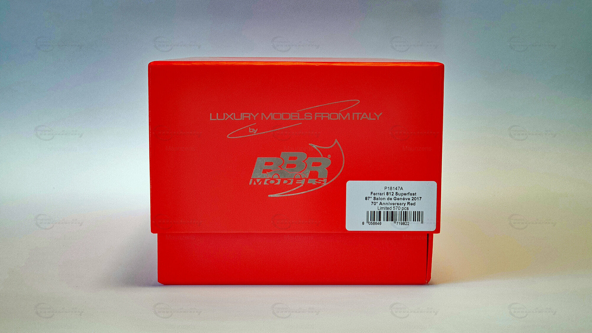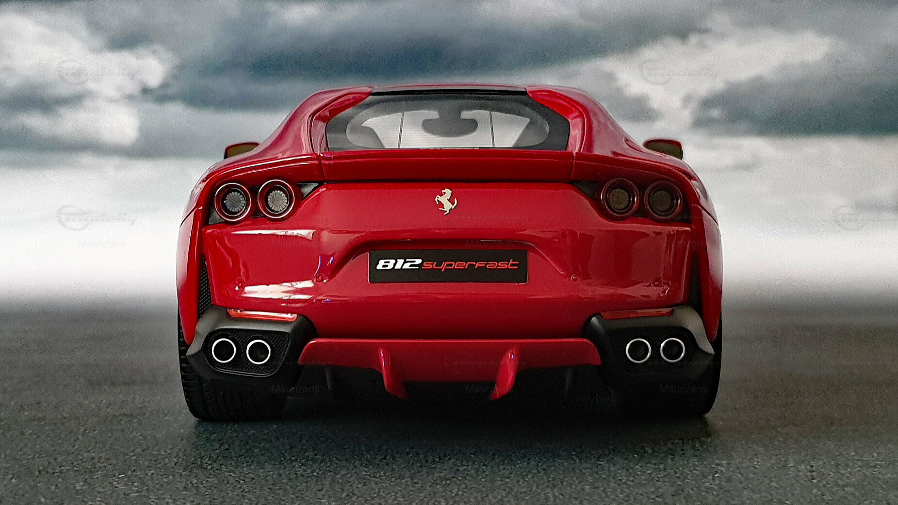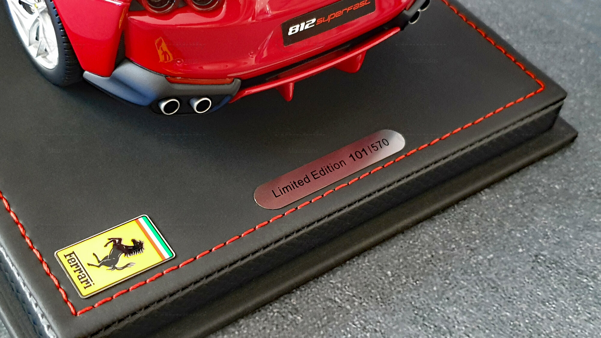 Das Modellauto ist nicht nur ein optischer Genuss, sondern bietet auch viele Details, die es zu einem begehrten Sammlerstück machen. Die Karosserie des Modells ist präzise nachgebildet, einschließlich der eleganten Linien und Konturen, die den Ferrari 812 Superfast so unverwechselbar machen. Das Heck des Modells zeigt die speziellen Rückleuchten und den Doppelrohrauspuff, die auch am Original zu finden sind. Jedes Detail, von den Felgen bis hin zu den Emblemen, wurde sorgfältig reproduziert. Interessant ist auch, dass auf den Fotos keine spezifischen Tuning-Firmen oder spezielle Felgenhersteller erkennbar sind, was darauf schließen lässt, dass das Modell die Standardversion des Originalfahrzeugs darstellt. Diese Liebe zum Detail und die genaue Replikation machen die Modelle von BBR im 1:18-Maßstab zu beliebten Objekten in der Modellautosammlerszene.