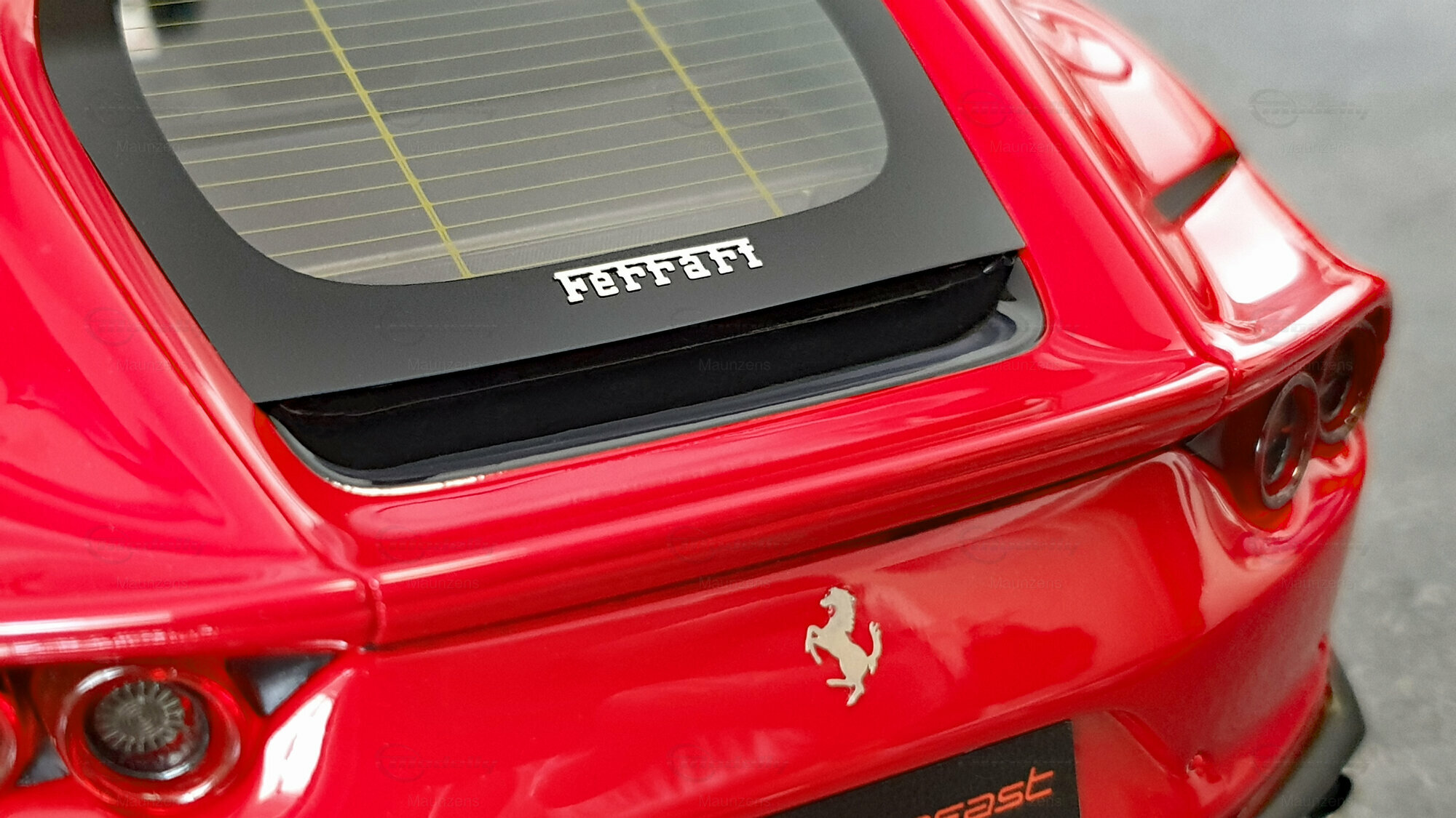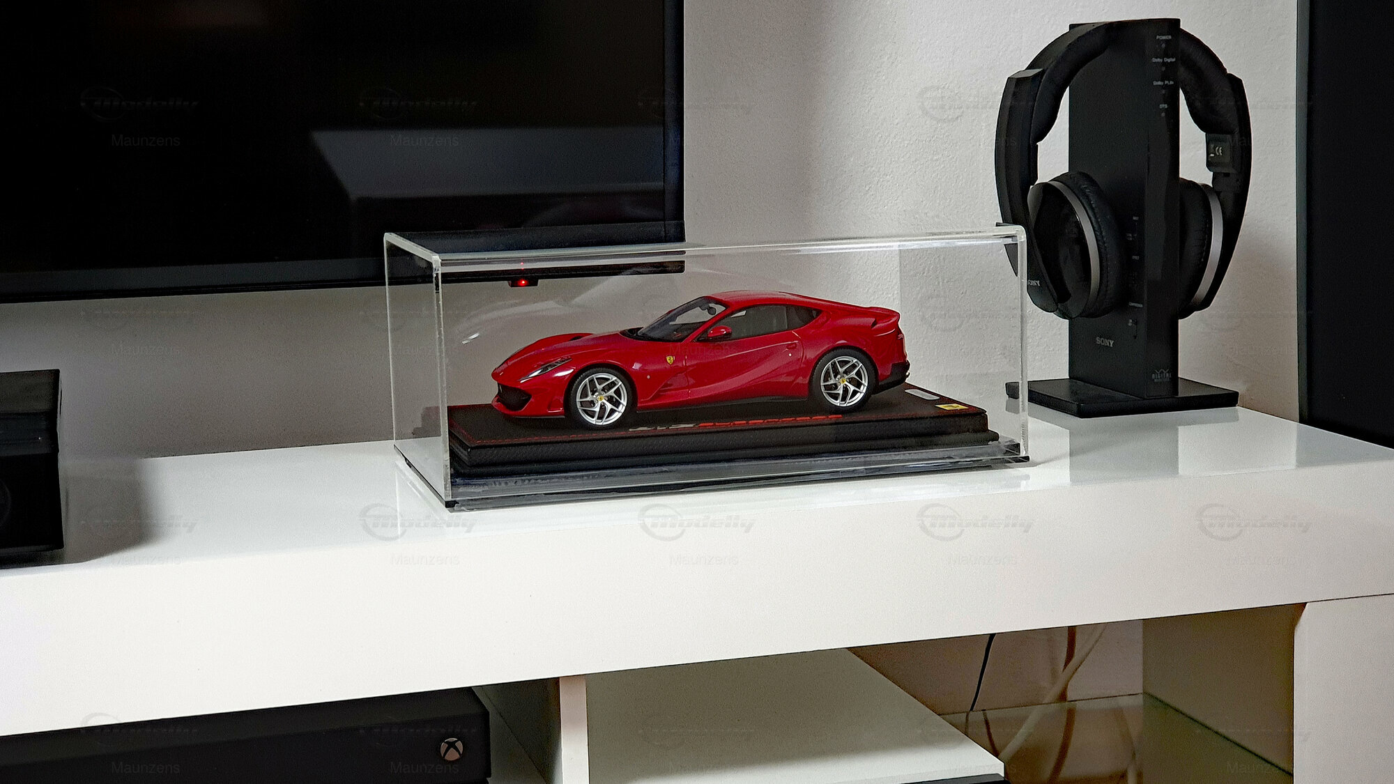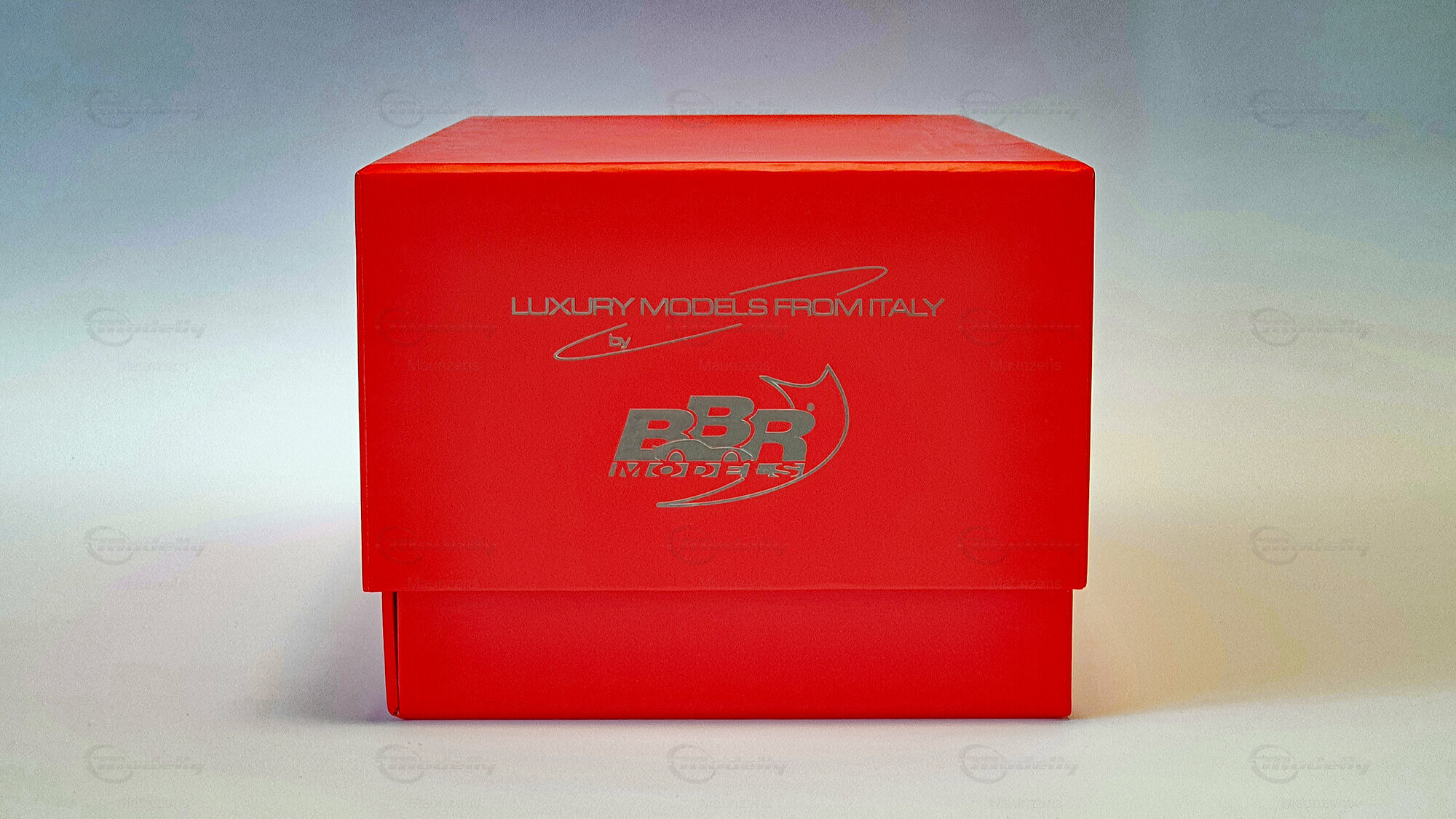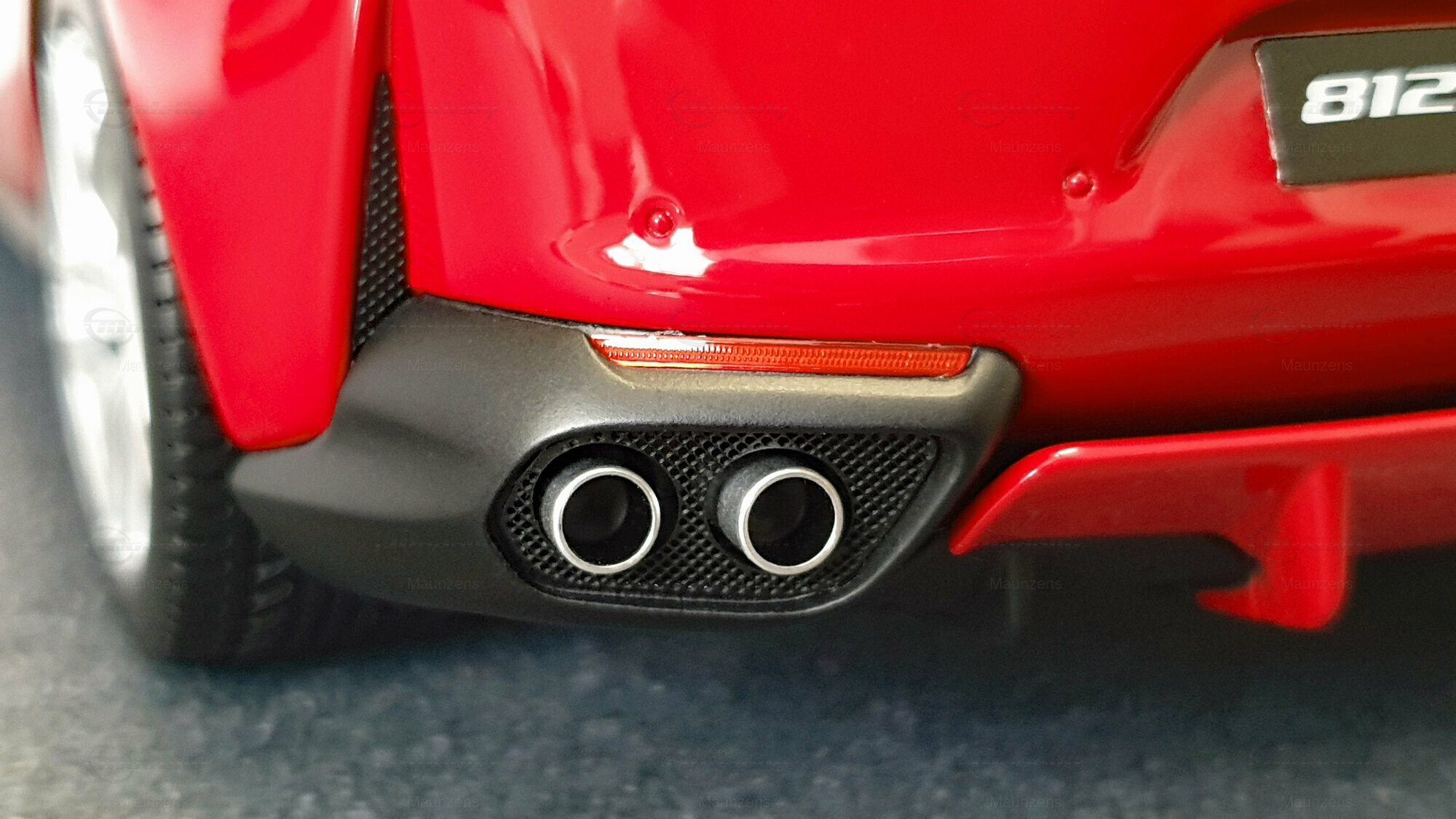 Das Modellauto ist nicht nur ein optischer Genuss, sondern bietet auch viele Details, die es zu einem begehrten Sammlerstück machen. Die Karosserie des Modells ist präzise nachgebildet, einschließlich der eleganten Linien und Konturen, die den Ferrari 812 Superfast so unverwechselbar machen. Das Heck des Modells zeigt die speziellen Rückleuchten und den Doppelrohrauspuff, die auch am Original zu finden sind. Jedes Detail, von den Felgen bis hin zu den Emblemen, wurde sorgfältig reproduziert. Interessant ist auch, dass auf den Fotos keine spezifischen Tuning-Firmen oder spezielle Felgenhersteller erkennbar sind, was darauf schließen lässt, dass das Modell die Standardversion des Originalfahrzeugs darstellt. Diese Liebe zum Detail und die genaue Replikation machen die Modelle von BBR im 1:18-Maßstab zu beliebten Objekten in der Modellautosammlerszene.