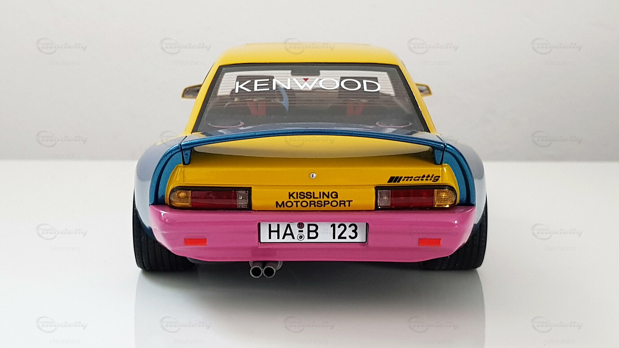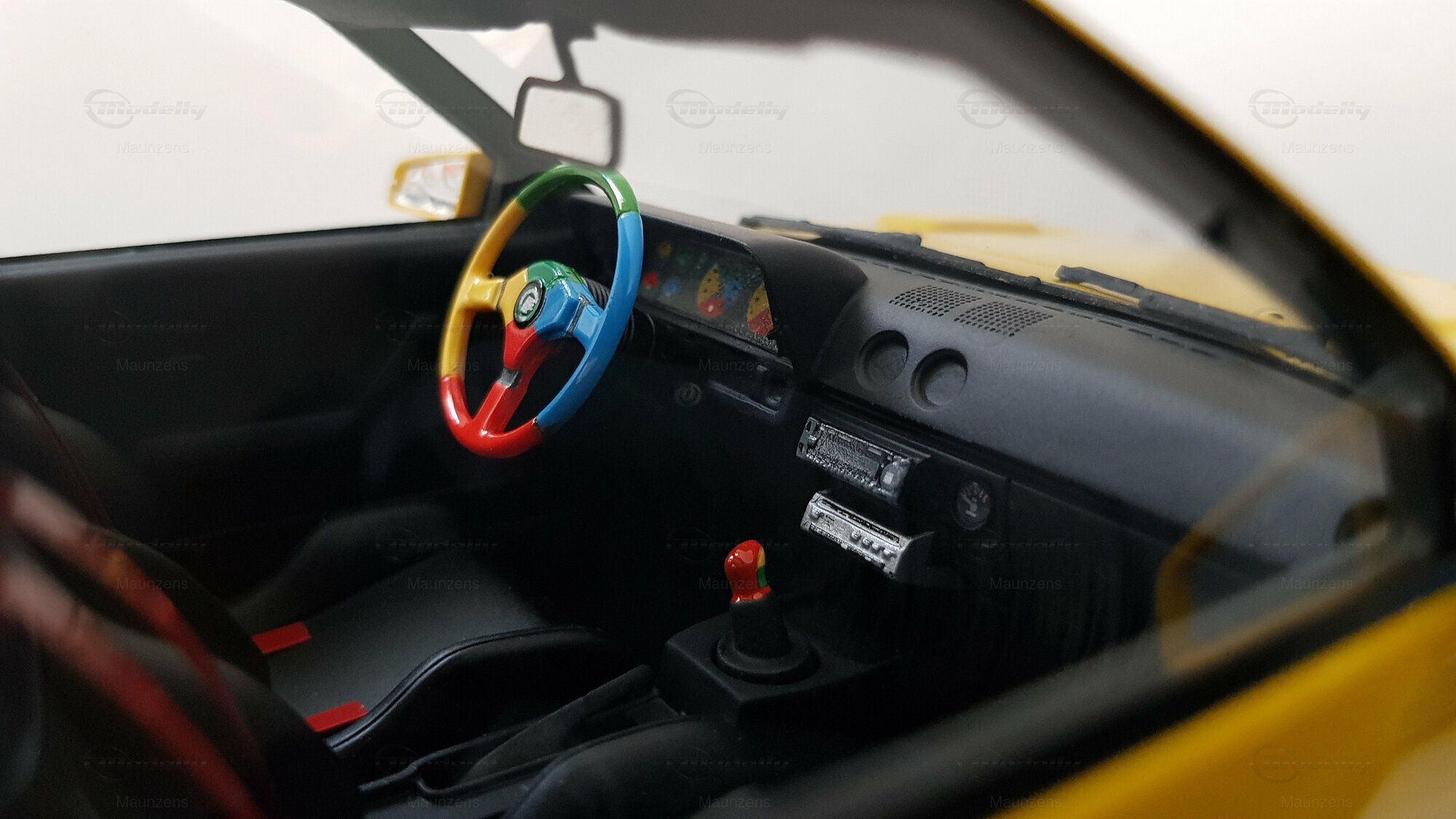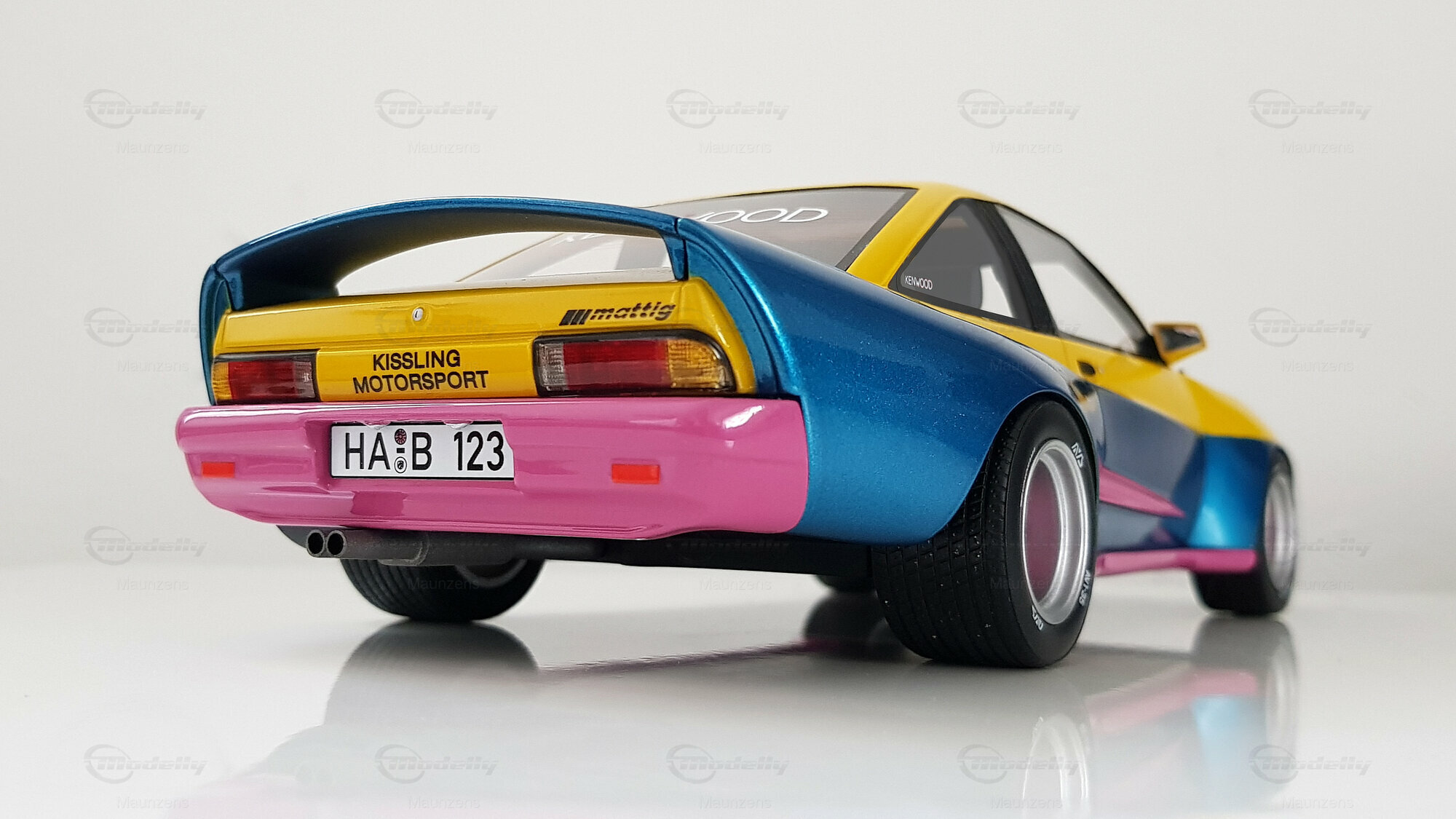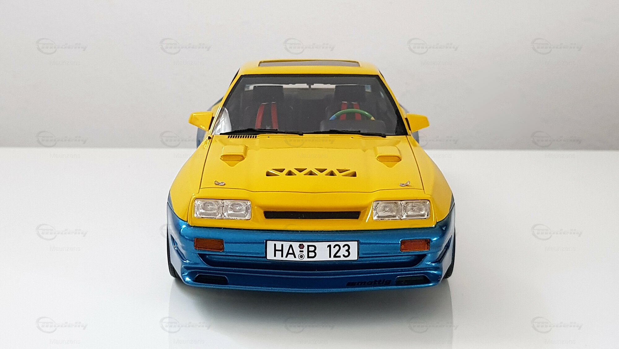 Das 1:18-Modell von BoS Models überzeugt durch seine auffällige Lackierung in leuchtendem Gelb, kombiniert mit metallicblauen und pinkfarbenen Akzenten an den Seiten und auf den Felgen. Die genaue Platzierung der Mattig-Logos, die Form des Spoilers und die Aufkleberdetails wie der „KENWOOD“-Schriftzug an der Scheibe, sind klar zu erkennen. Besonderheiten wie die authentischen Nachbildungen der Reifen und Felgen heben das Modell hervor. Die Radkappen und Reifen entsprechen optisch Modellen damaliger Marken wie BBS oder ATS, wobei auf den Fotos die Aufschrift „AV3“ zu lesen ist, was auf eine spezielle Ausführung von ATS Felgen schließen lässt. Das Auto, das dem Miniaturmodell als Vorbild diente, ist durch den markanten Look ebenfalls in der Populärkultur verankert, wurde aber nach Sicht der vorliegenden Fotos keinem bekannten Film oder Serie originalgetreu nachempfunden. Die Besonderheit dieses Modells liegt also klar in seiner Darstellung von authentischem 1980er-Jahre-Tuningstil, der für Miniaturauto- und Modellautoliebhaber weltweit ein interessantes Sammelobjekt darstellt.