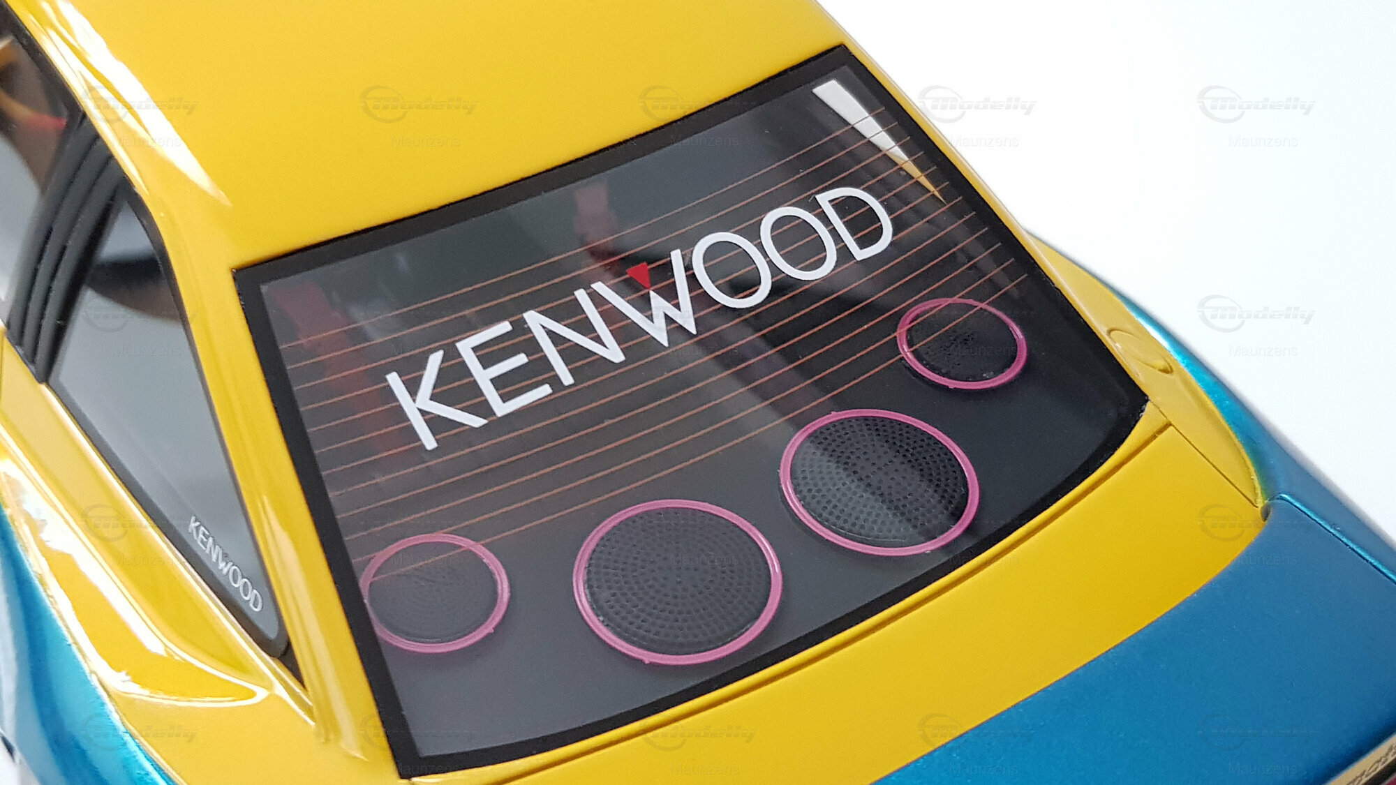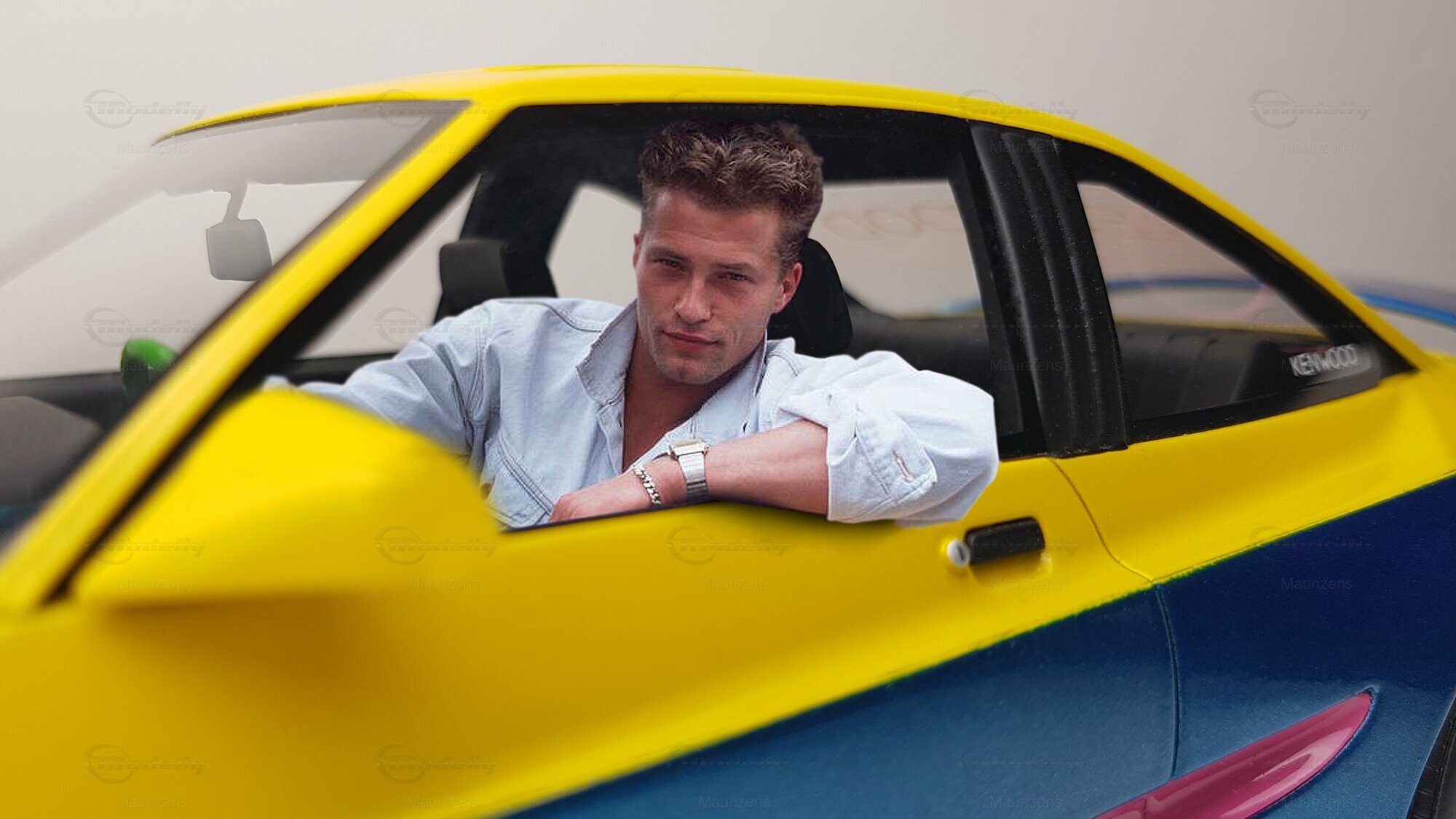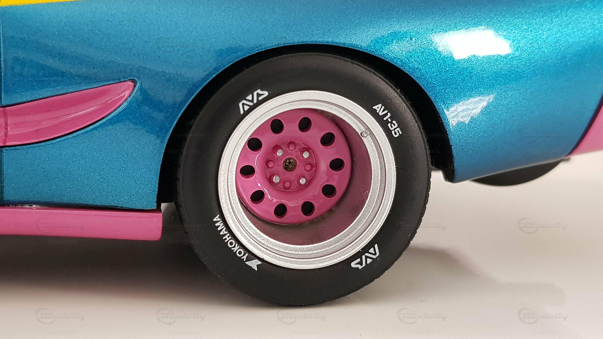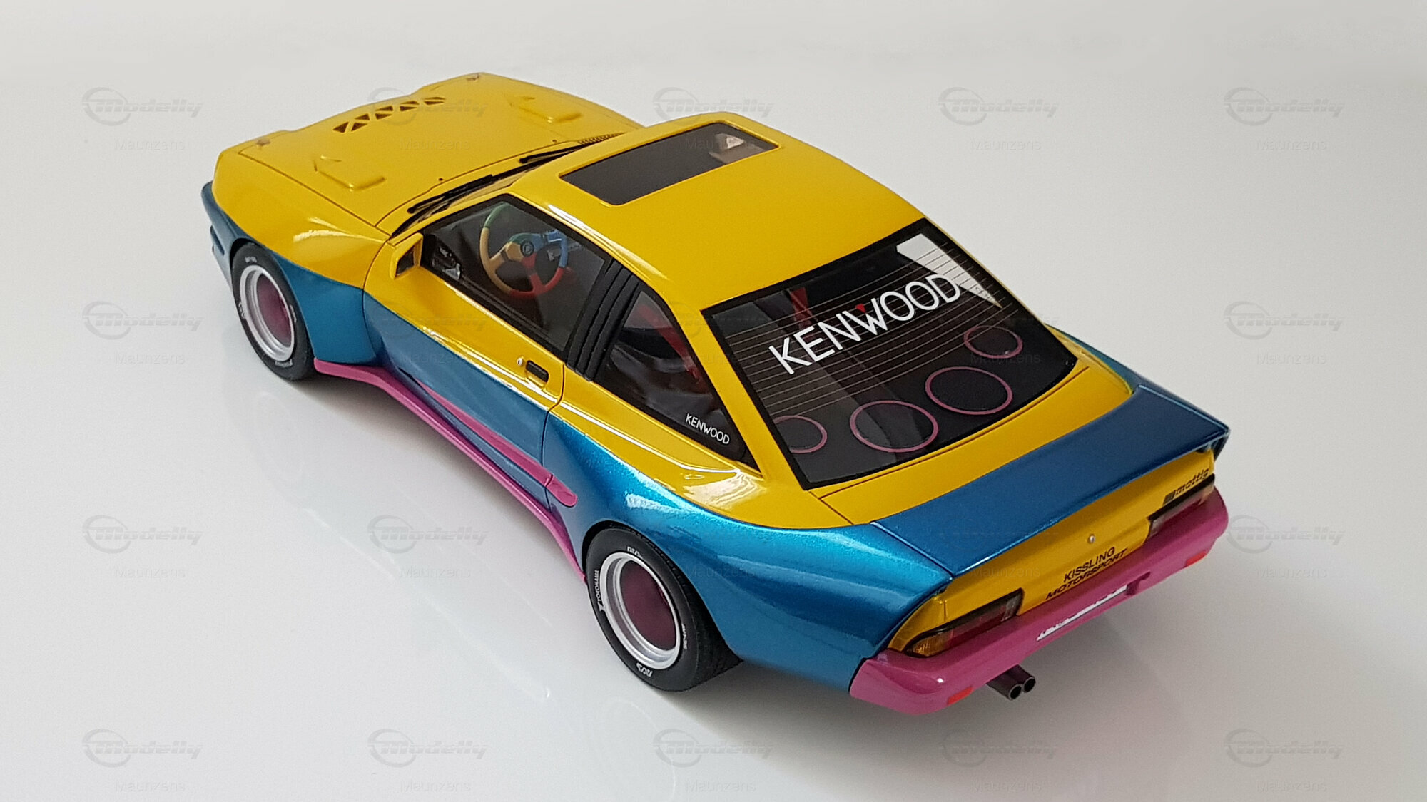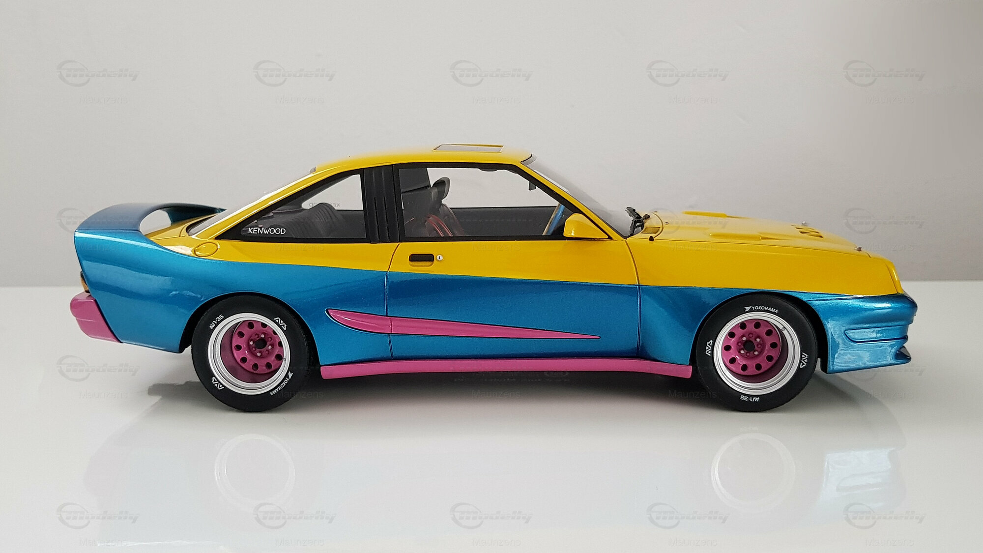 Das 1:18-Modell von BoS Models überzeugt durch seine auffällige Lackierung in leuchtendem Gelb, kombiniert mit metallicblauen und pinkfarbenen Akzenten an den Seiten und auf den Felgen. Die genaue Platzierung der Mattig-Logos, die Form des Spoilers und die Aufkleberdetails wie der „KENWOOD“-Schriftzug an der Scheibe, sind klar zu erkennen. Besonderheiten wie die authentischen Nachbildungen der Reifen und Felgen heben das Modell hervor. Die Radkappen und Reifen entsprechen optisch Modellen damaliger Marken wie BBS oder ATS, wobei auf den Fotos die Aufschrift „AV3“ zu lesen ist, was auf eine spezielle Ausführung von ATS Felgen schließen lässt. Das Auto, das dem Miniaturmodell als Vorbild diente, ist durch den markanten Look ebenfalls in der Populärkultur verankert, wurde aber nach Sicht der vorliegenden Fotos keinem bekannten Film oder Serie originalgetreu nachempfunden. Die Besonderheit dieses Modells liegt also klar in seiner Darstellung von authentischem 1980er-Jahre-Tuningstil, der für Miniaturauto- und Modellautoliebhaber weltweit ein interessantes Sammelobjekt darstellt.