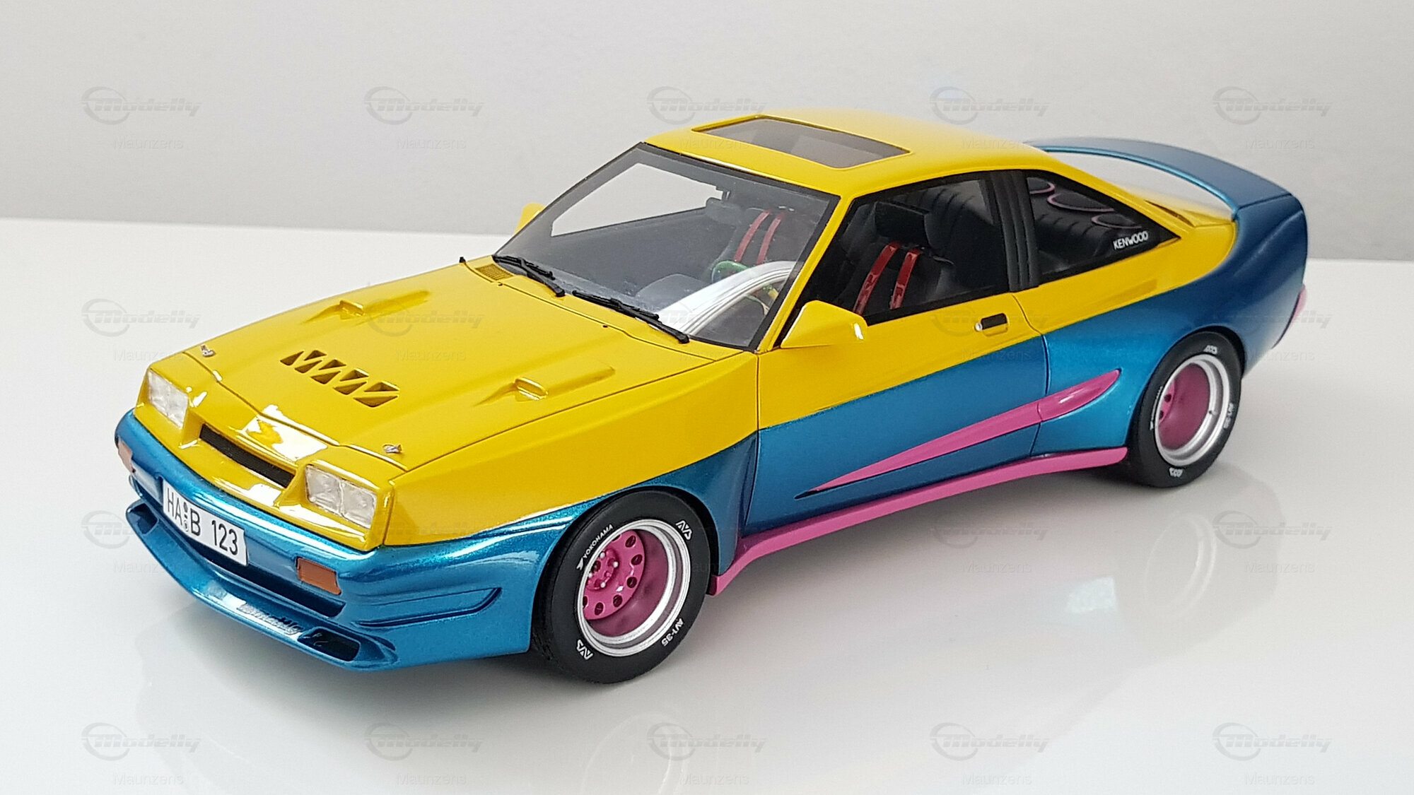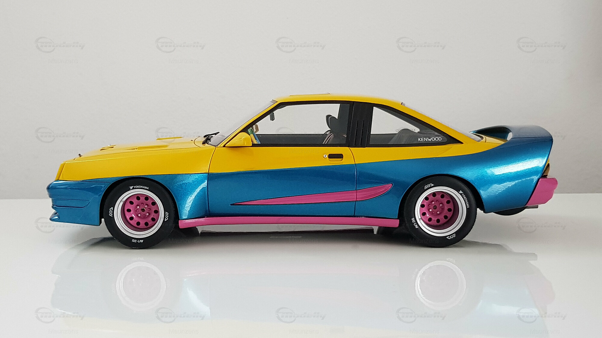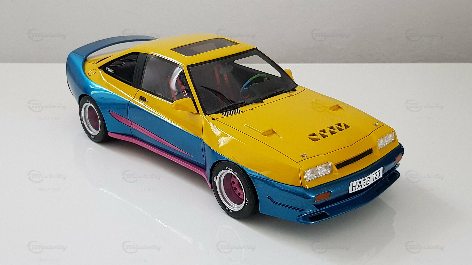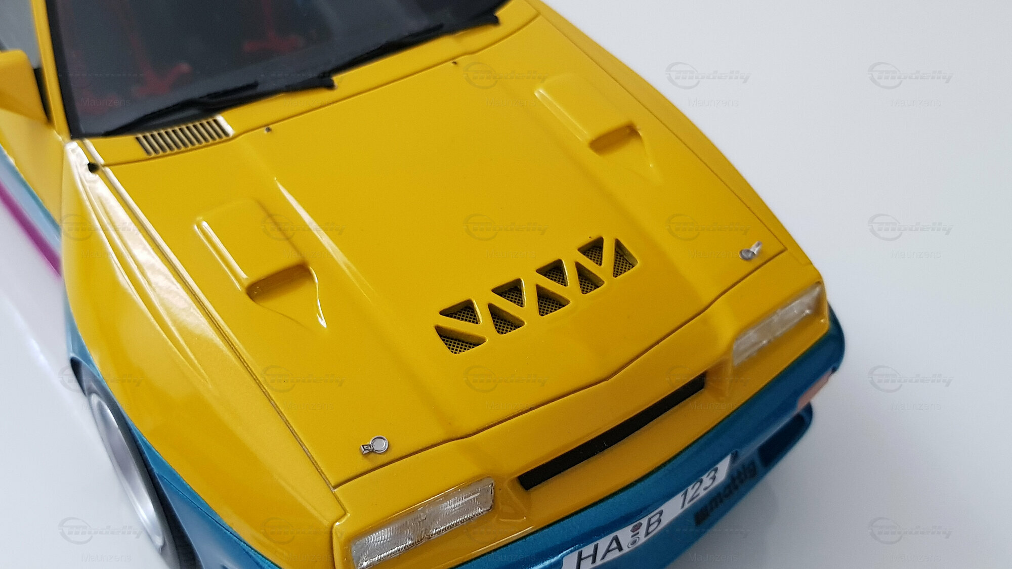 Das abgebildete Modellauto ist eine präzise Nachbildung des Opel Manta B Mattig im Maßstab 1:18, gefertigt von BoS Models. Bei diesem Modell handelt es sich um ein Sammlerstück aus Resin, was zu besonders feinen Details und sauberen Linien bei der Umsetzung führt. Das Modell gehört zur Sammlung des Modelly-Mitglieds "Maunzens" und wurde mit einem besonderen Augenmerk auf Authentizität und Detailtreue gestaltet. Zu den auffälligen Merkmalen zählen die detailreiche Ausführung der Kotflügelverbreiterungen, der Mattig-Frontspoiler, die charakteristischen Haubenentlüftungen und die sehr speziellen Felgen, welche den Look der 1980er-Jahre perfekt einfangen. Die Farbkombination besteht aus einem kräftigen Gelb in Verbindung mit metallisch-blauen Flächen und pinken Akzenten, wie sie bei vielen Tuning-Umbauten jener Zeit typisch waren. Auch der Innenraum des Modells ist dem Original nachempfunden und zeigt farblich passende Sportsitze sowie das markante Mehrfarb-Lenkrad, das bei Individualumbauten oft gewählt wurde.