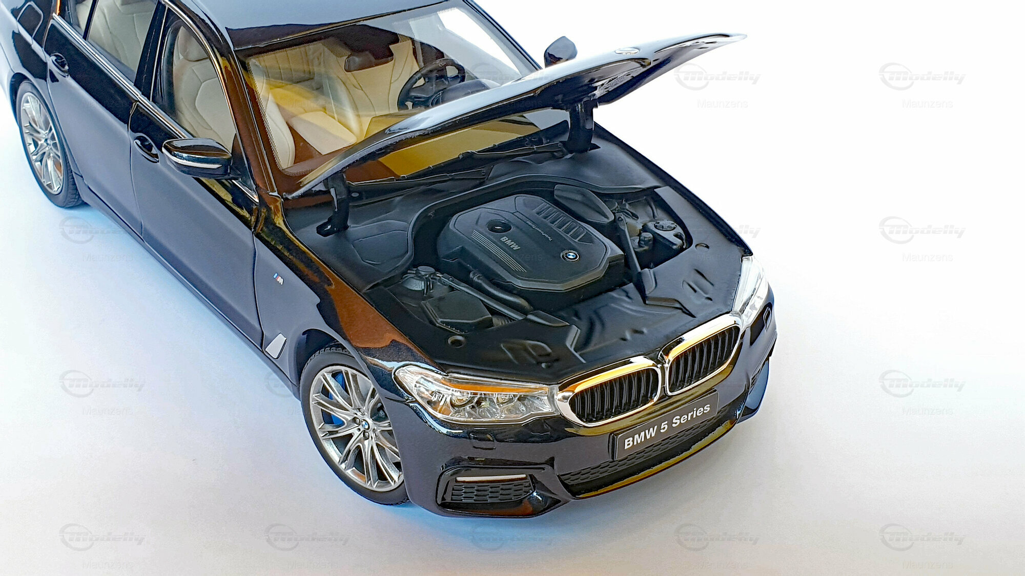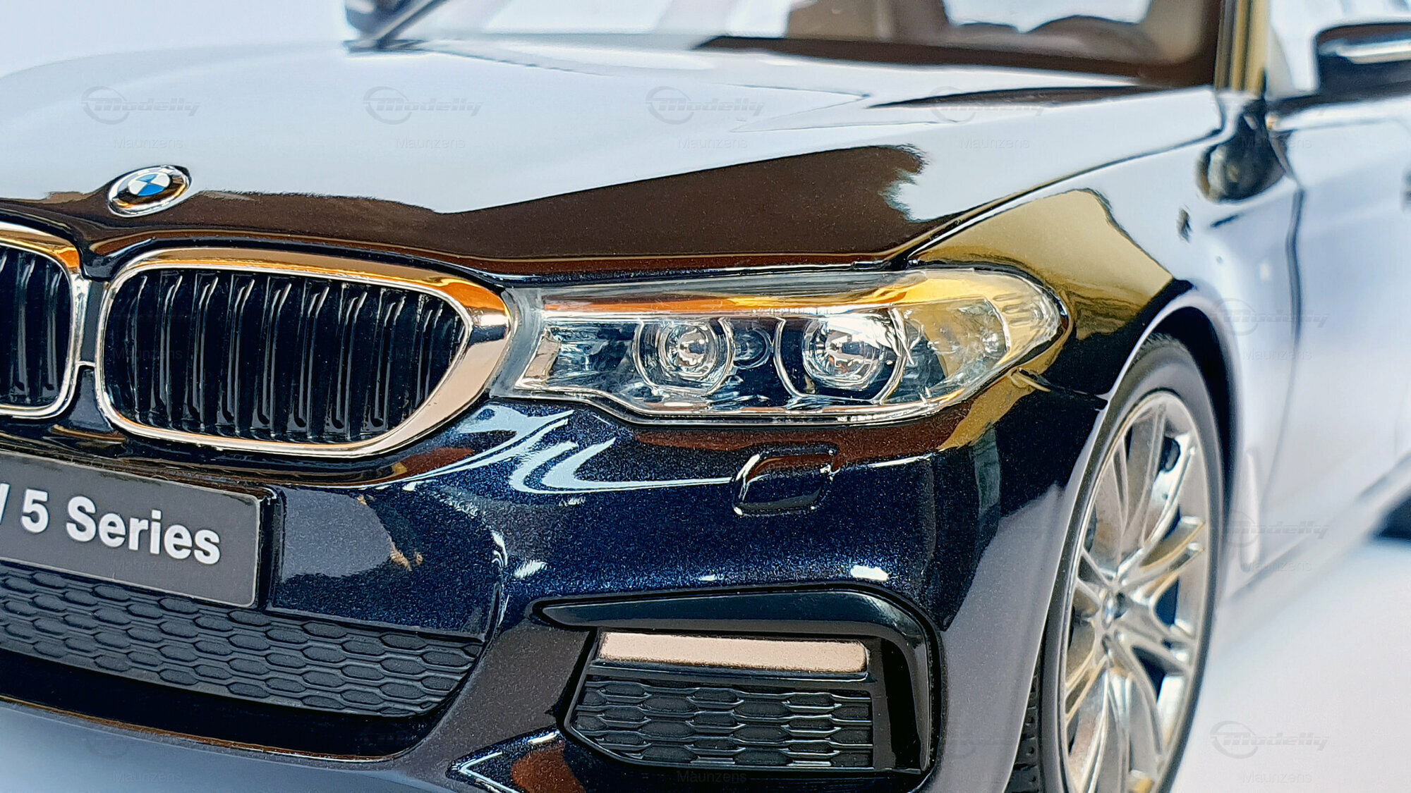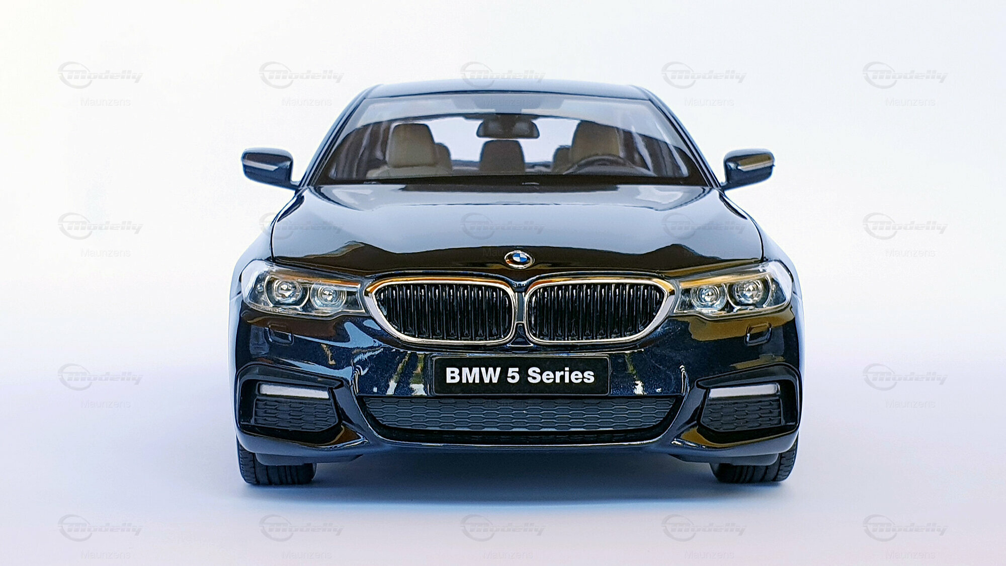 Ein weiterer Pluspunkt des 1:18 Maßstabs Modells von Kyosho ist die exakte Nachbildung der Lackierung und des Gesamtauftritts. Die tiefschwarze Metallic-Lackierung, die silbernen Akzente und die prägnanten BMW-Detailarbeiten sind hervorstechend. Was dieses Modell besonders für Sammler interessant macht, ist die perfekte Balance zwischen Ästhetik und Funktionalität. Aus der Perspektive der Frontansicht im Bild erkennt man das unverwechselbare Design des BMW 5er (G30) mit seiner markanten Doppelniere und den scharfen Lichterlinien.
