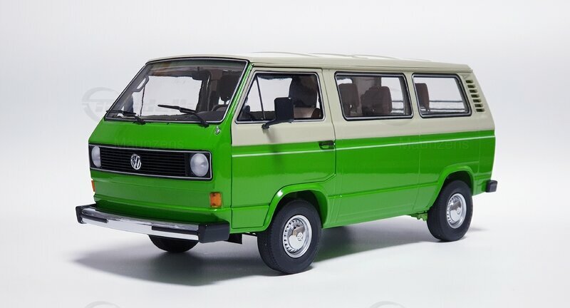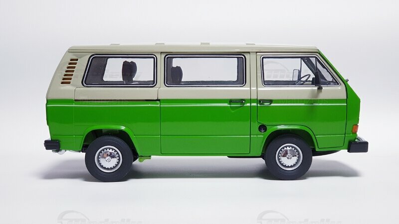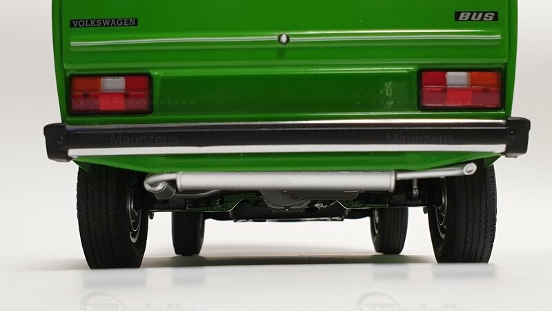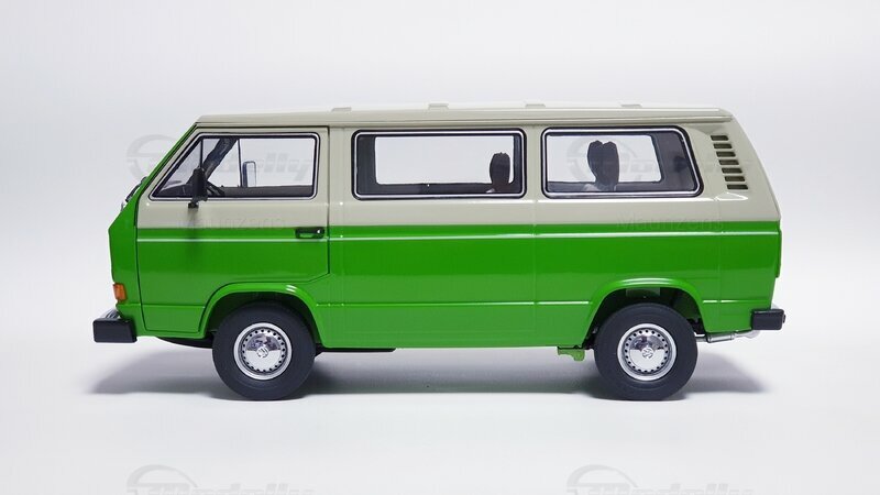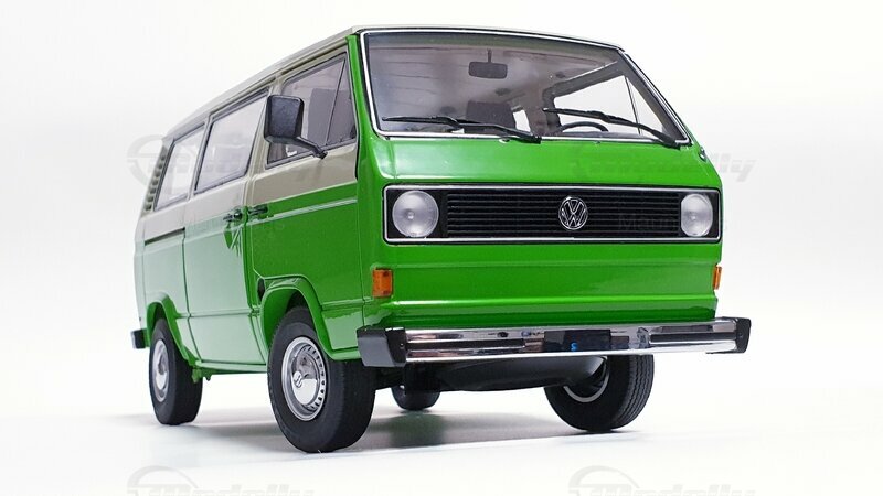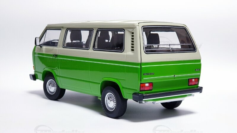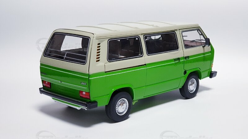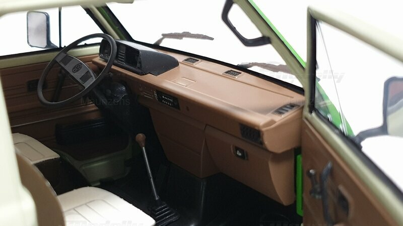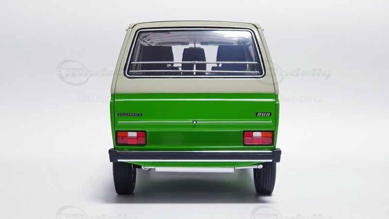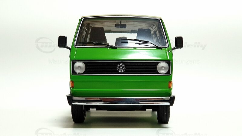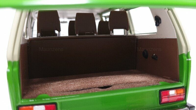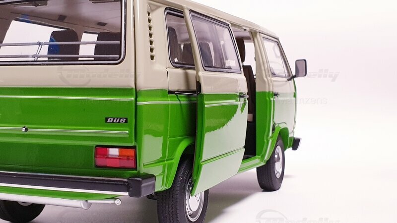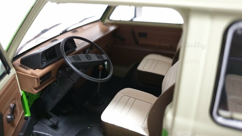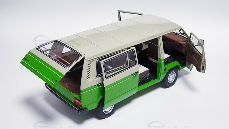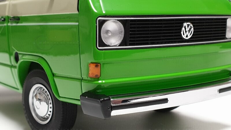 Das Modellauto von Schuco im Maßstab 1:18 zeichnet sich durch eine hohe Detailgenauigkeit aus. Die markante Front des Volkswagen T3 Bus mit den rechteckigen Scheinwerfern und dem unverwechselbaren VW-Logo ist originalgetreu nachempfunden. Die Fensterrahmen sowie der Innenraum sind ebenfalls präzise gestaltet. Vom Armaturenbrett bis zu den Sitzen sind feinste Details erkennbar, die den Sammlern und Liebhabern solcher Modelle besonders gefallen werden.