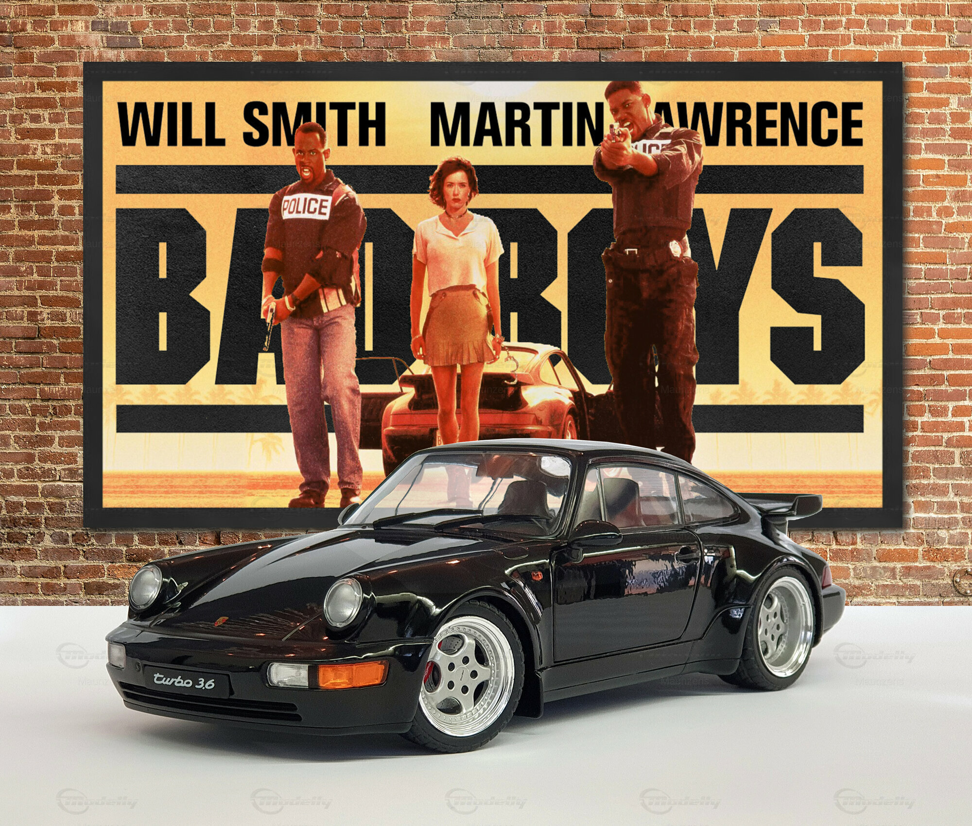 Das gezeigte Modell erinnert sofort an eine prominente Filmkulisse – den Action-Film Bad Boys von 1995. In Bad Boys findet man den Porsche 911 (964) Turbo 3.6 in mehreren packenden Szenen, in denen er von den Charakteren Detective Mike Lowrey, gespielt von Will Smith, und Detective Marcus Burnett, gespielt von Martin Lawrence, gefahren wird. Die Verfolgungsszenen, in denen dieser Porsche eine zentrale Rolle spielt, sind legendär und haben wesentlich zur Popularität und zum kulturellen Erbe des Fahrzeugs beigetragen. Im Film steht dieser Porsche symbolisch für Geschwindigkeit, Stil und Macht und hat somit den Kultstatus des 964 Turbo 3.6 in der Automobilwelt weiter gefestigt.