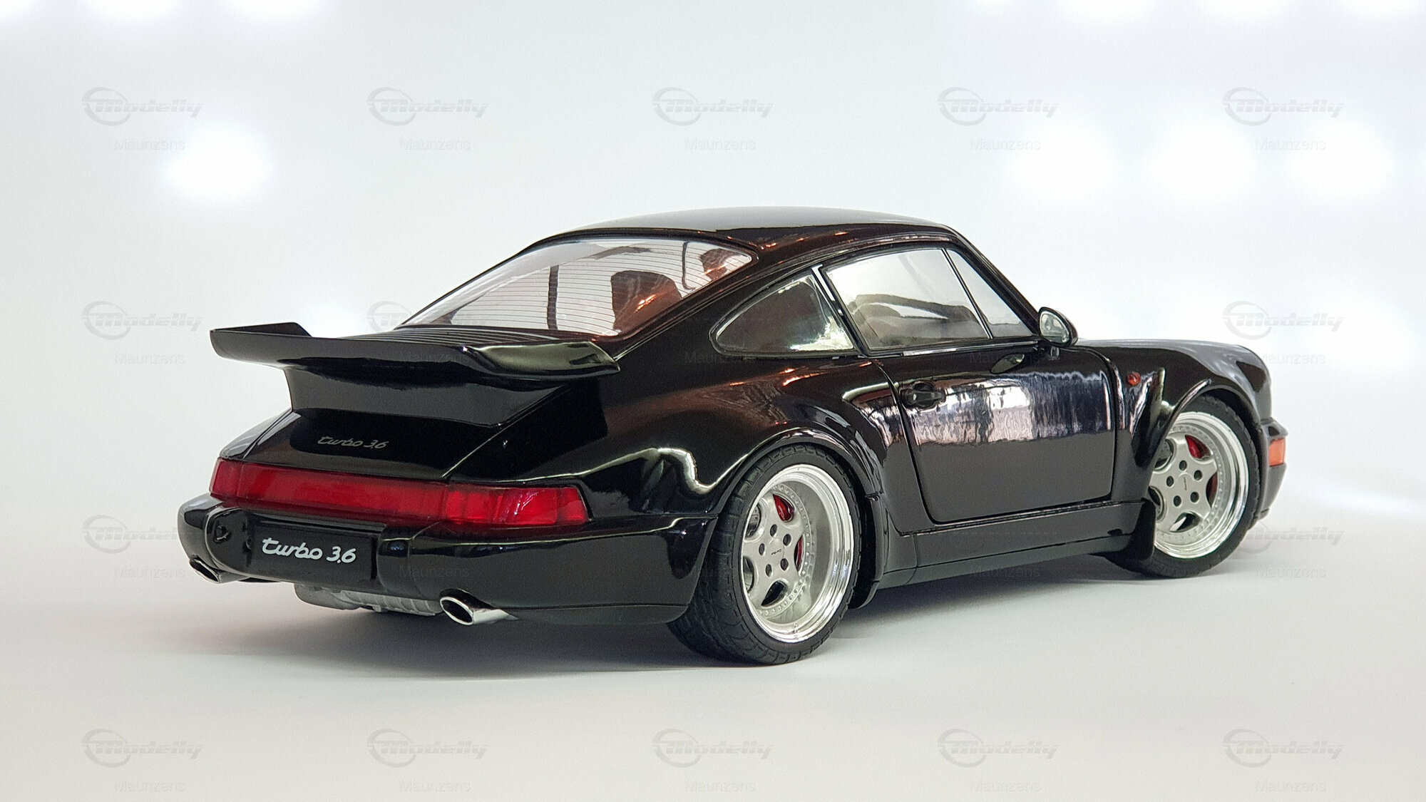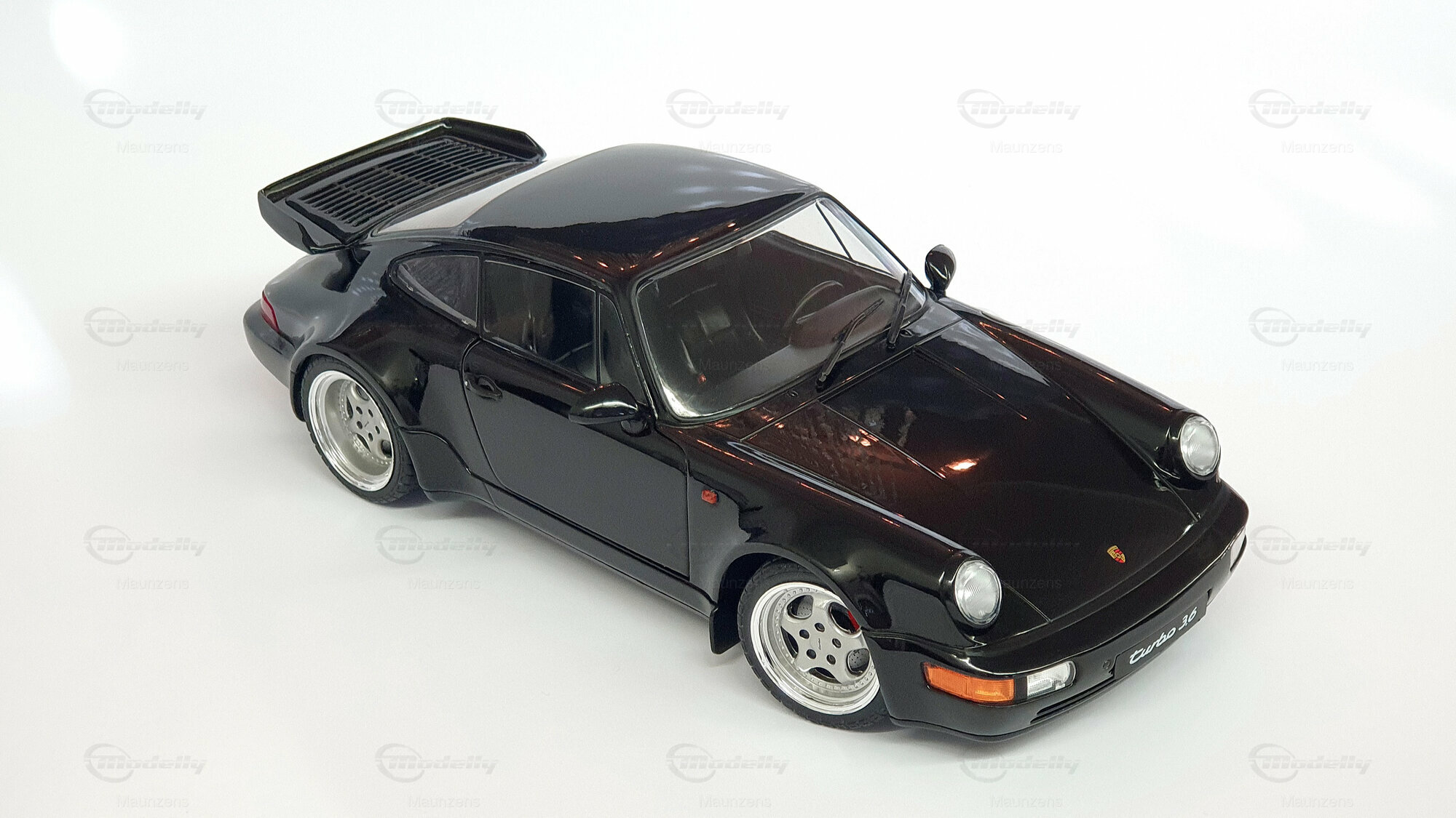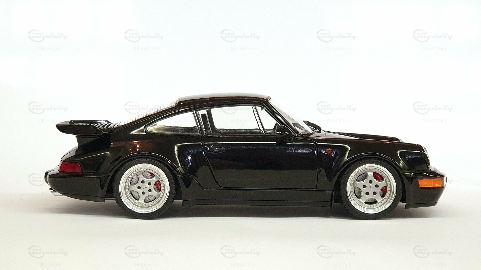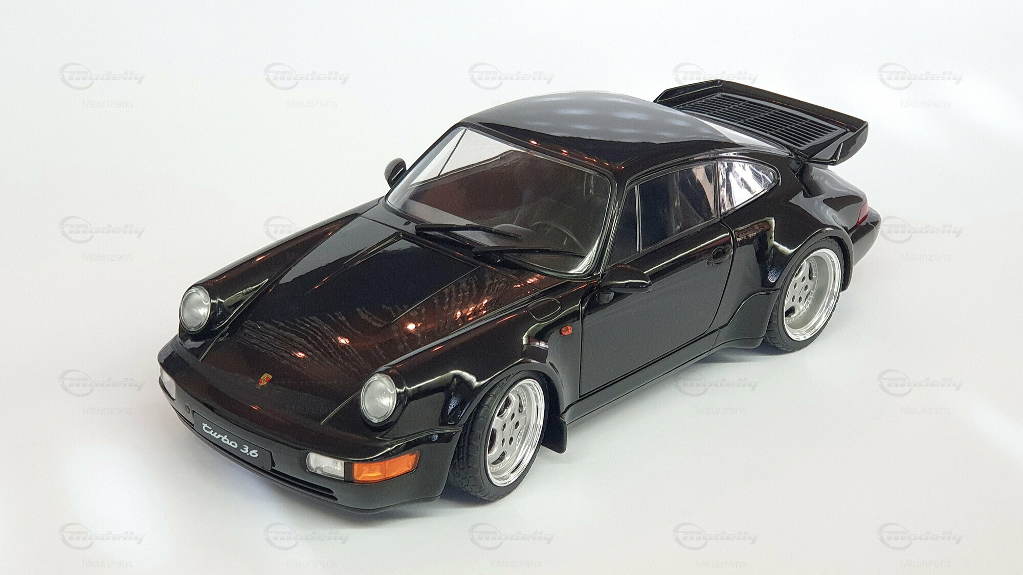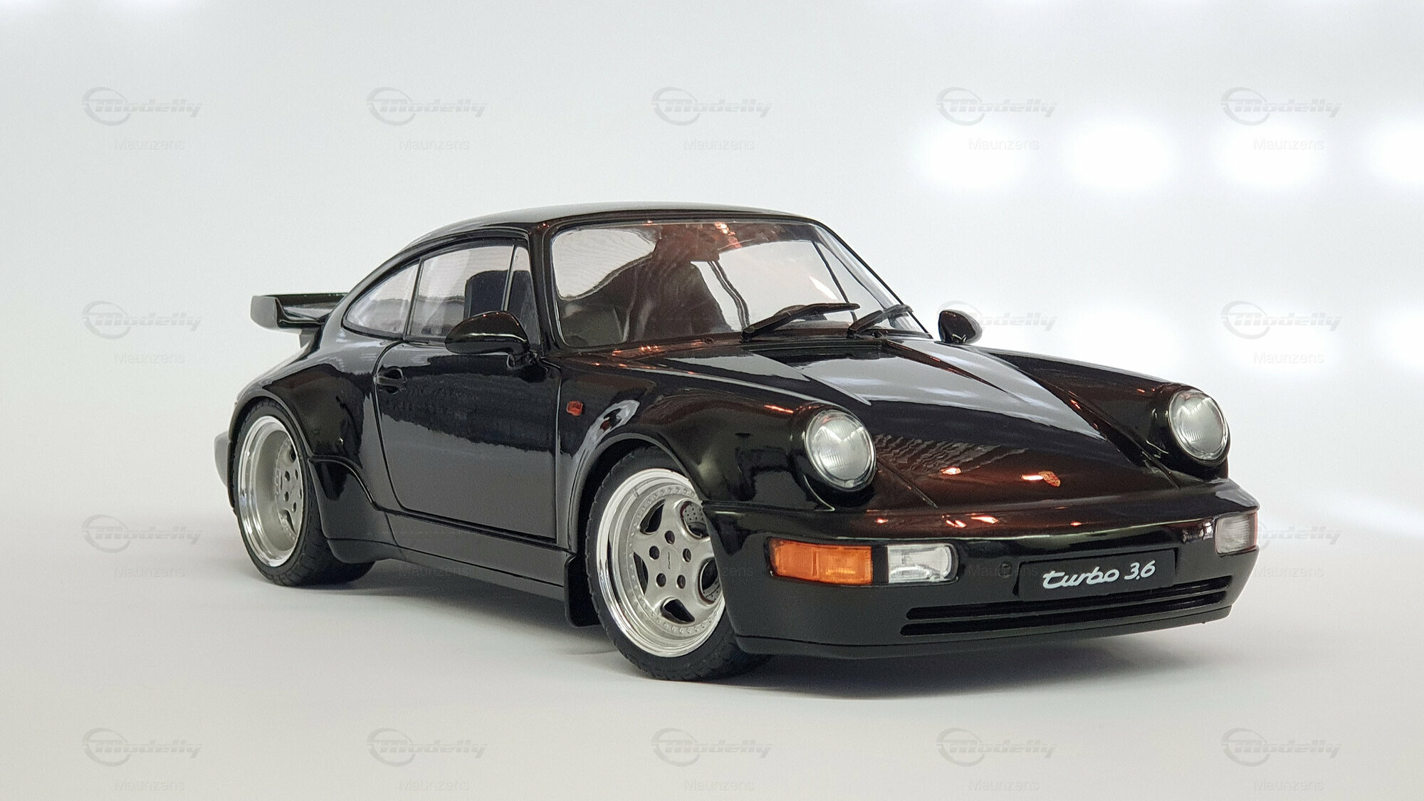 Das präsentierte Modellauto ist ein detailgetreuer Nachbau des Porsche 911 (964) Turbo 3.6, hergestellt von Solido im Maßstab 1:18. Dieses Modell besticht durch seine hohe Detailtreue, die besonders Sammler weltweit anzieht. Die sichtbaren Merkmale umfassen die markante schwarze Lackierung und die präzise nachgebildeten Details der Scheinwerfer und Rückleuchten. Auffällig sind auch die Felgen, die wie Originale von Speedline aussehen, was die Authentizität des Modells unterstreicht. Der Innenraum ist ebenfalls detailliert nachgebildet und zeigt das Cockpit in einem ebenfalls dunklen Farbton. Das Modell ist aus Diecast-Material hergestellt, was für seine Robustheit und Langlebigkeit sorgt. Bemerkenswert ist, dass dieses Modellauto in der Sammlung von Modelly-Mitglied "Maunzens" zu finden ist, was seine Exklusivität und Sammlerwert erhöht.