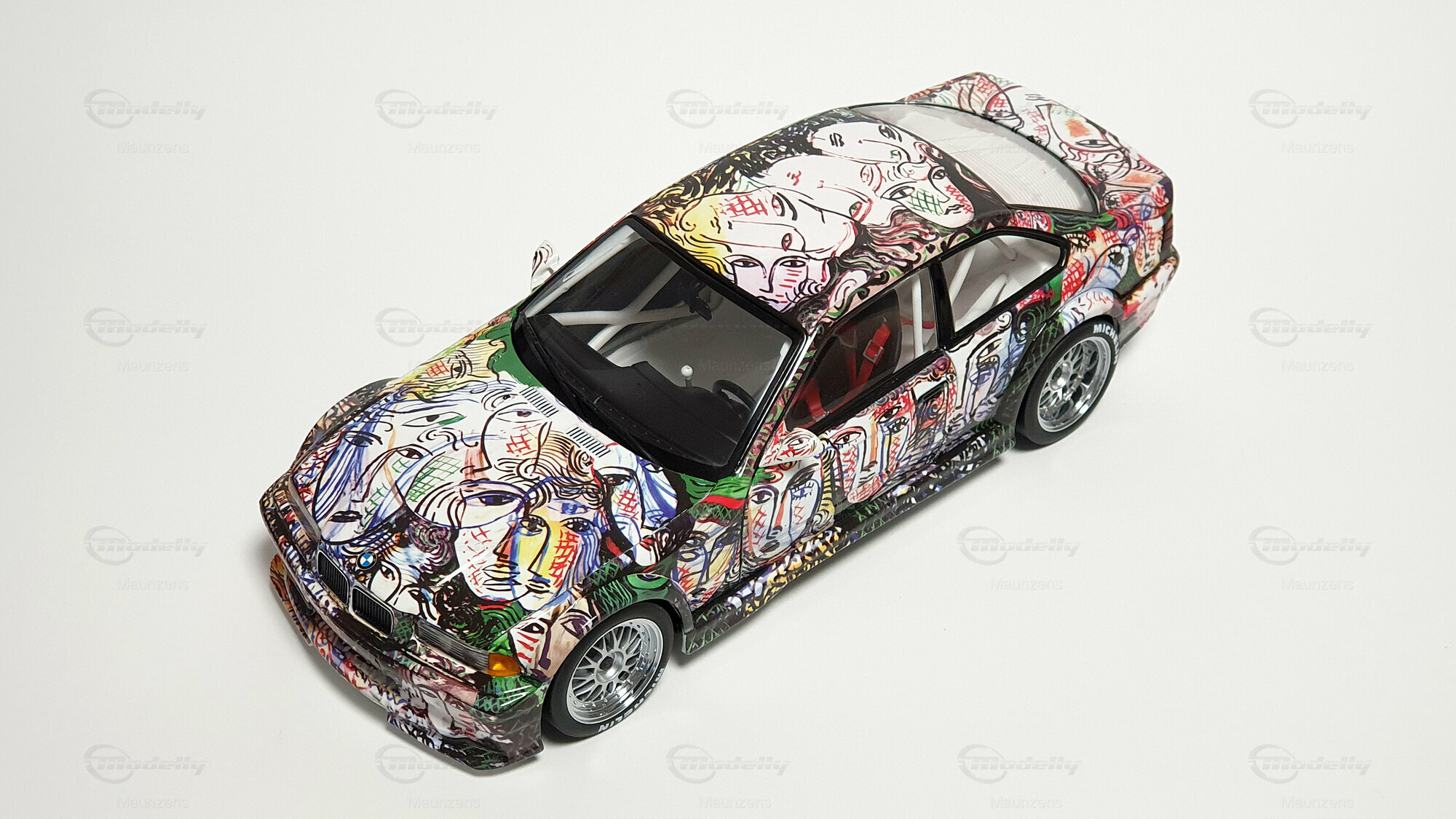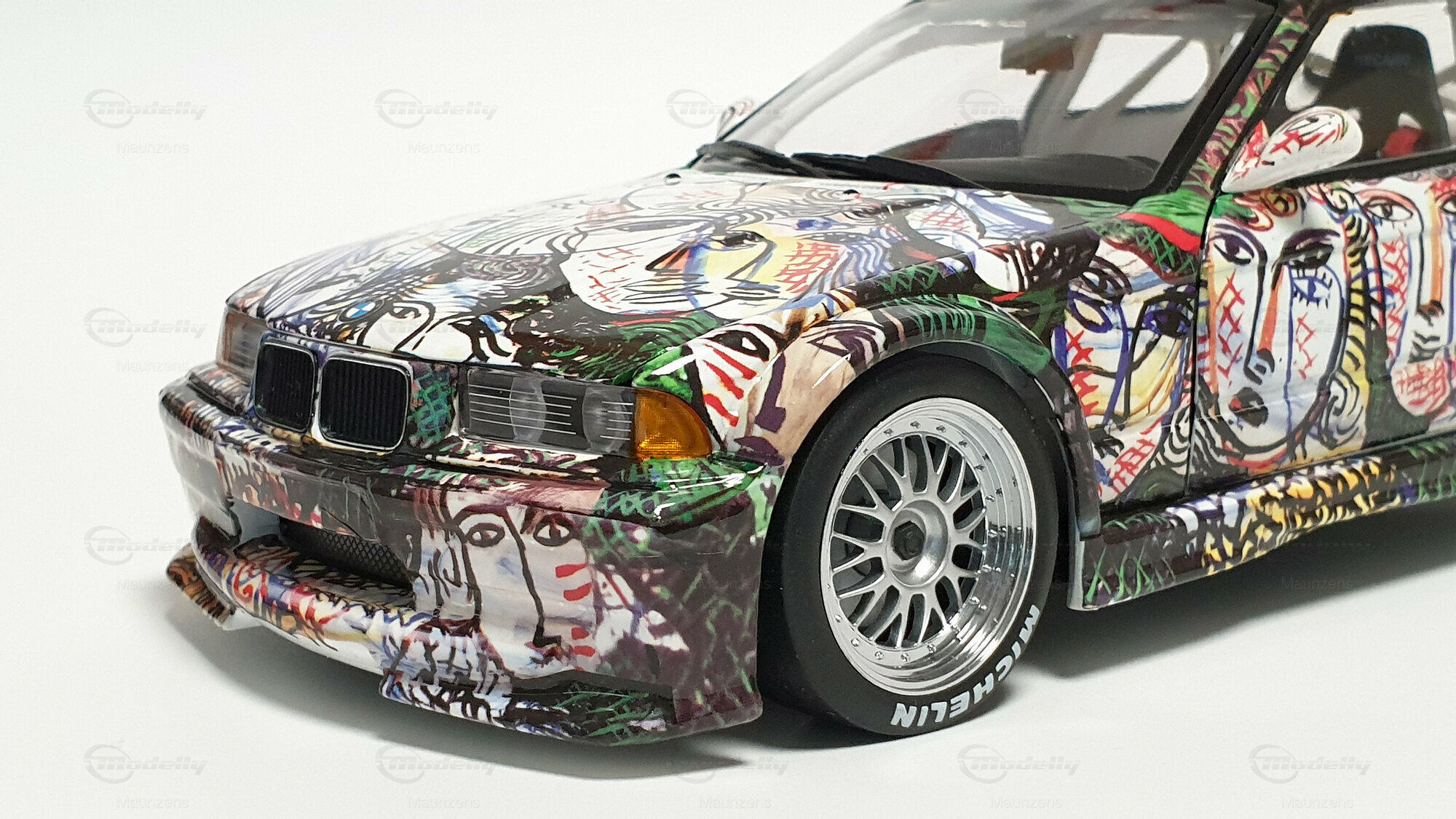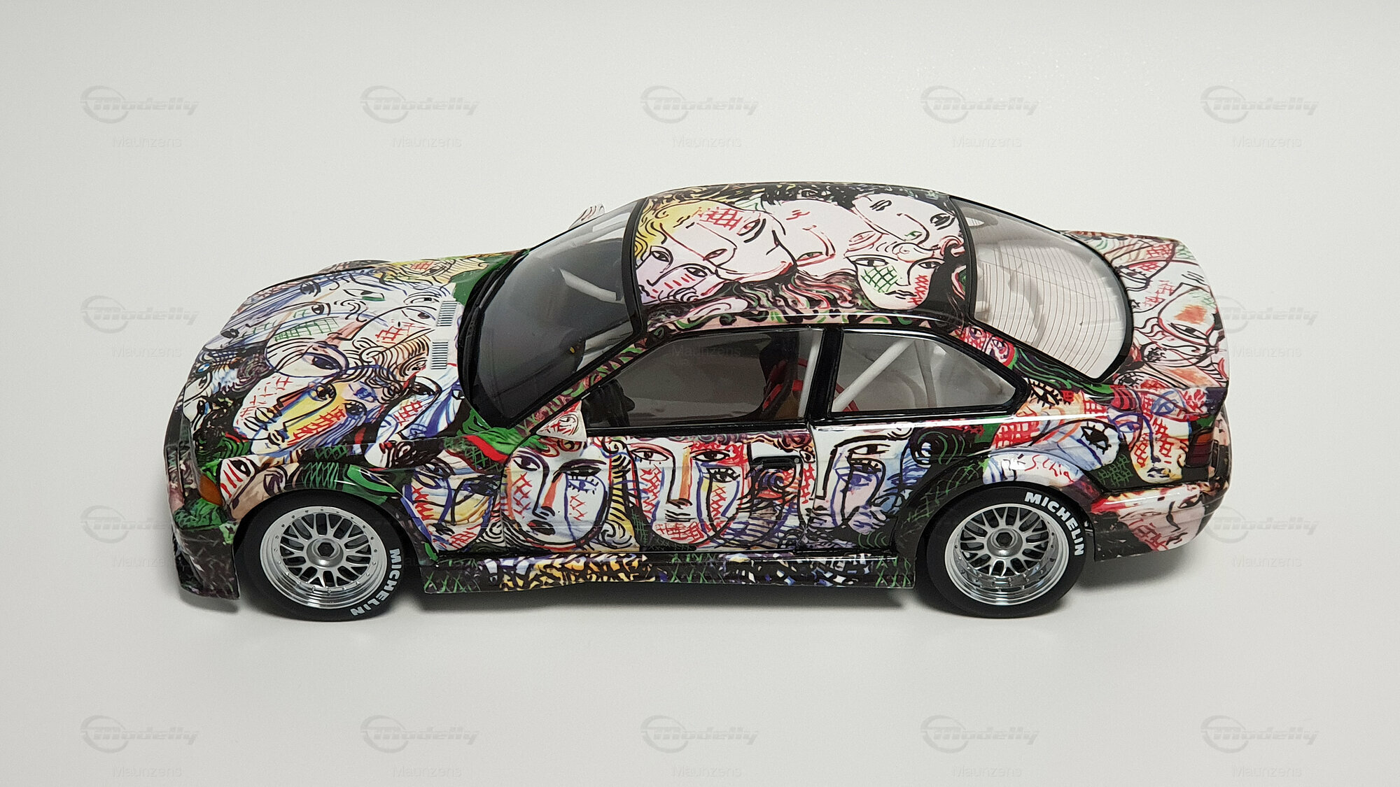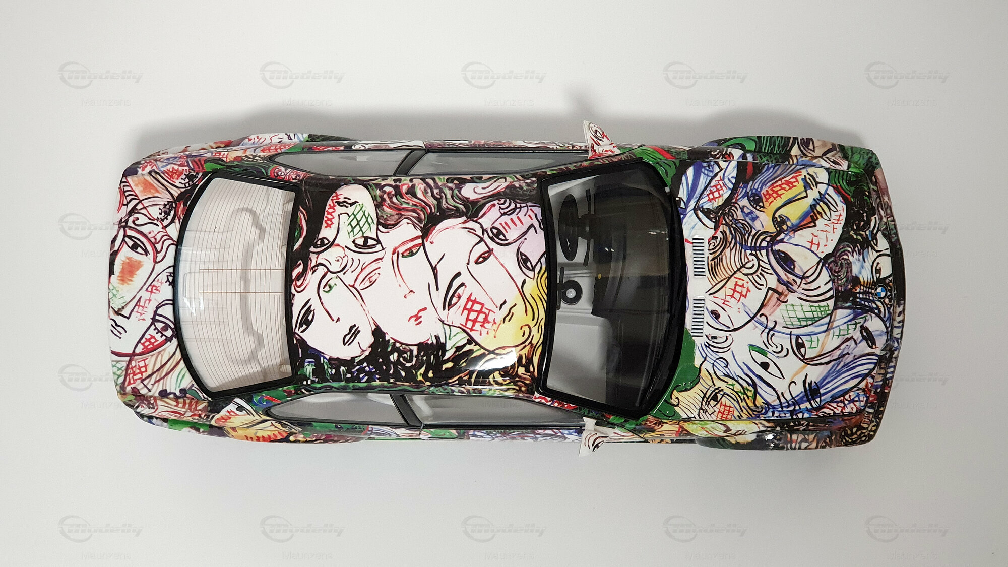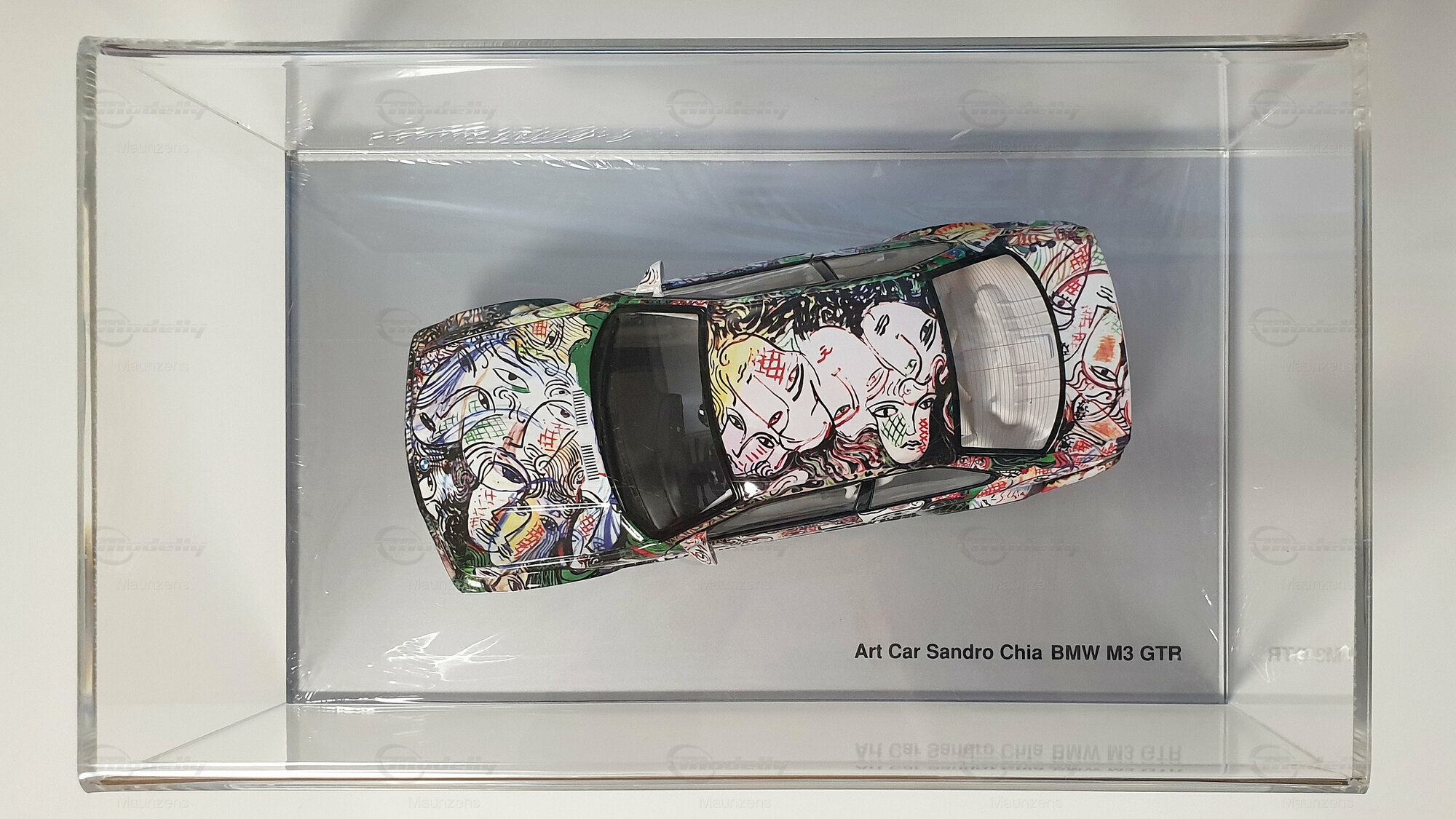 Die Lackierung des Modells stellt ein sogenanntes Art Car dar, ein Konzept, das bei BMW Rennfahrzeugen seit den 1970er Jahren umgesetzt wird. Besonderes Merkmal dieses Modells: Die Karosserie ist nahezu vollständig mit abstrakten Motiven und stilisierten Gesichtern versehen, die sich über Motorhaube, Seiten und Dach erstrecken. Die kunstvolle Gestaltung in verschiedenfarbigen Linien, Grün-, Rot-, Gelb- und Schwarztönen hebt das Fahrzeug optisch hervor. Laut Sockelbeschriftung handelt es sich um eine Lackierung nach Vorbild von Sandro Chia. Wie bei Art Cars typisch, ist auch auf diesem Modell das BMW-Logo auf der Motorhaube klar zu erkennen, zusammen mit weiteren Bemalungen, die Gesichtszüge und Augen zeigen – charakteristisch für den Stil des Künstlers. Das Design steht damit im Kontrast zur eher funktional-technischen Anmutung klassischer Rennfahrzeuge und macht das Modell bei Sammlern einzigartig.