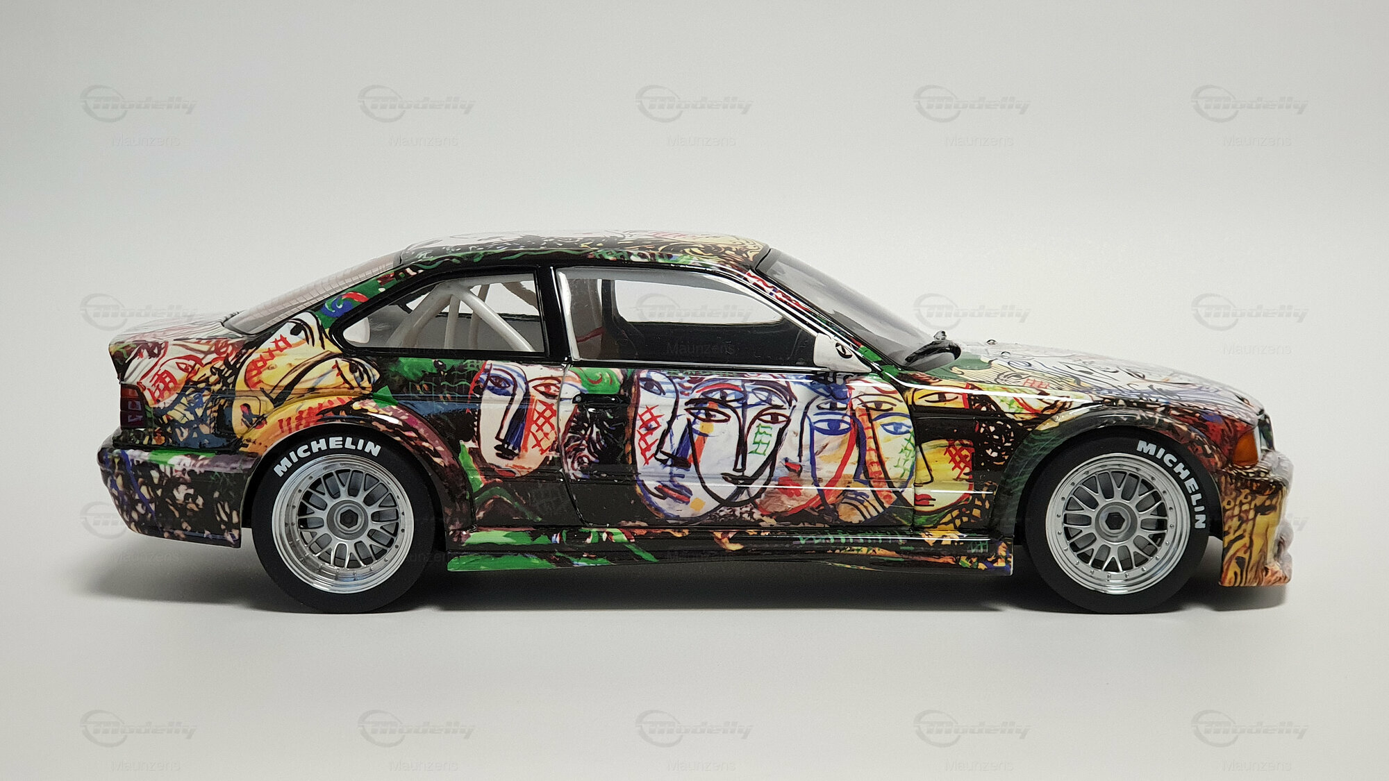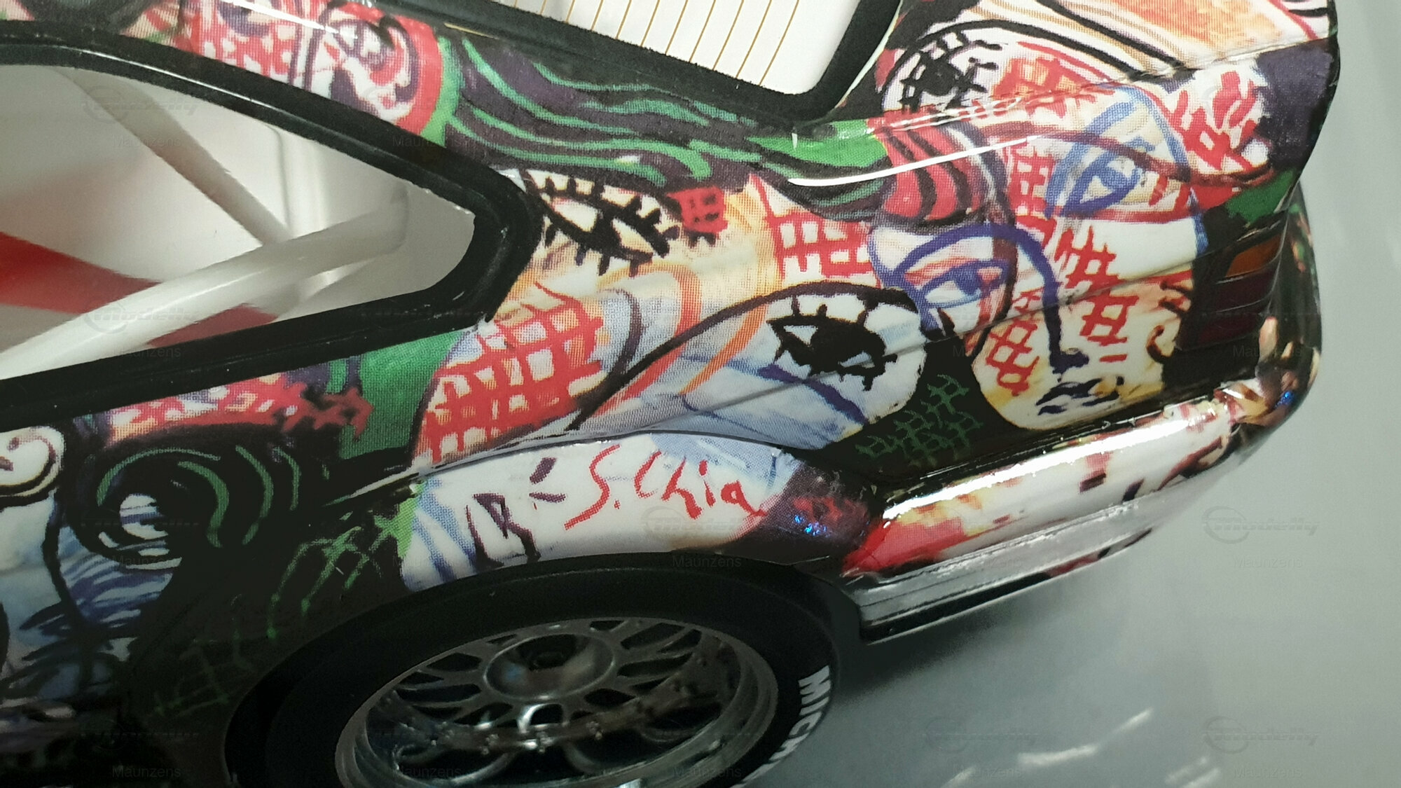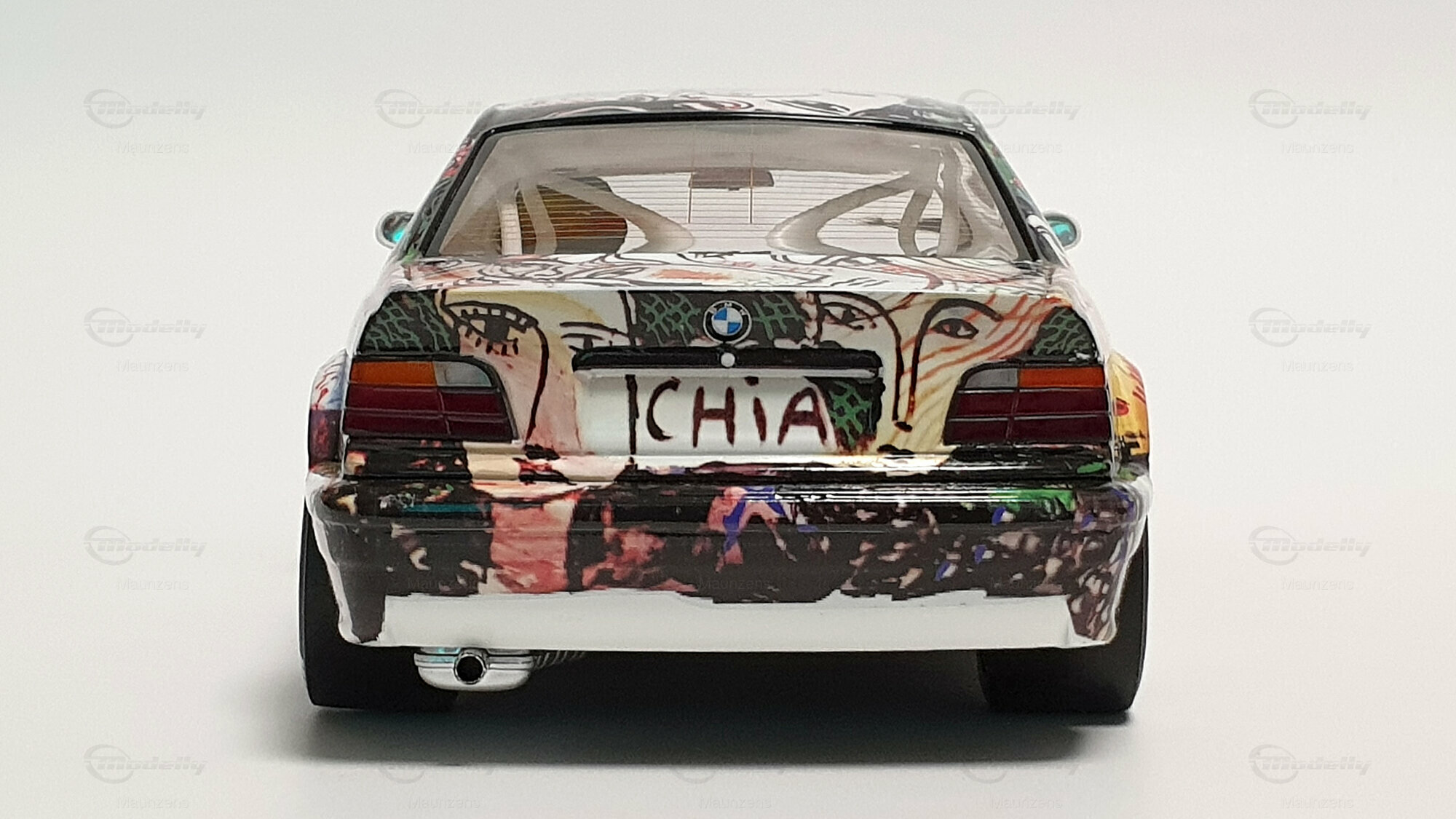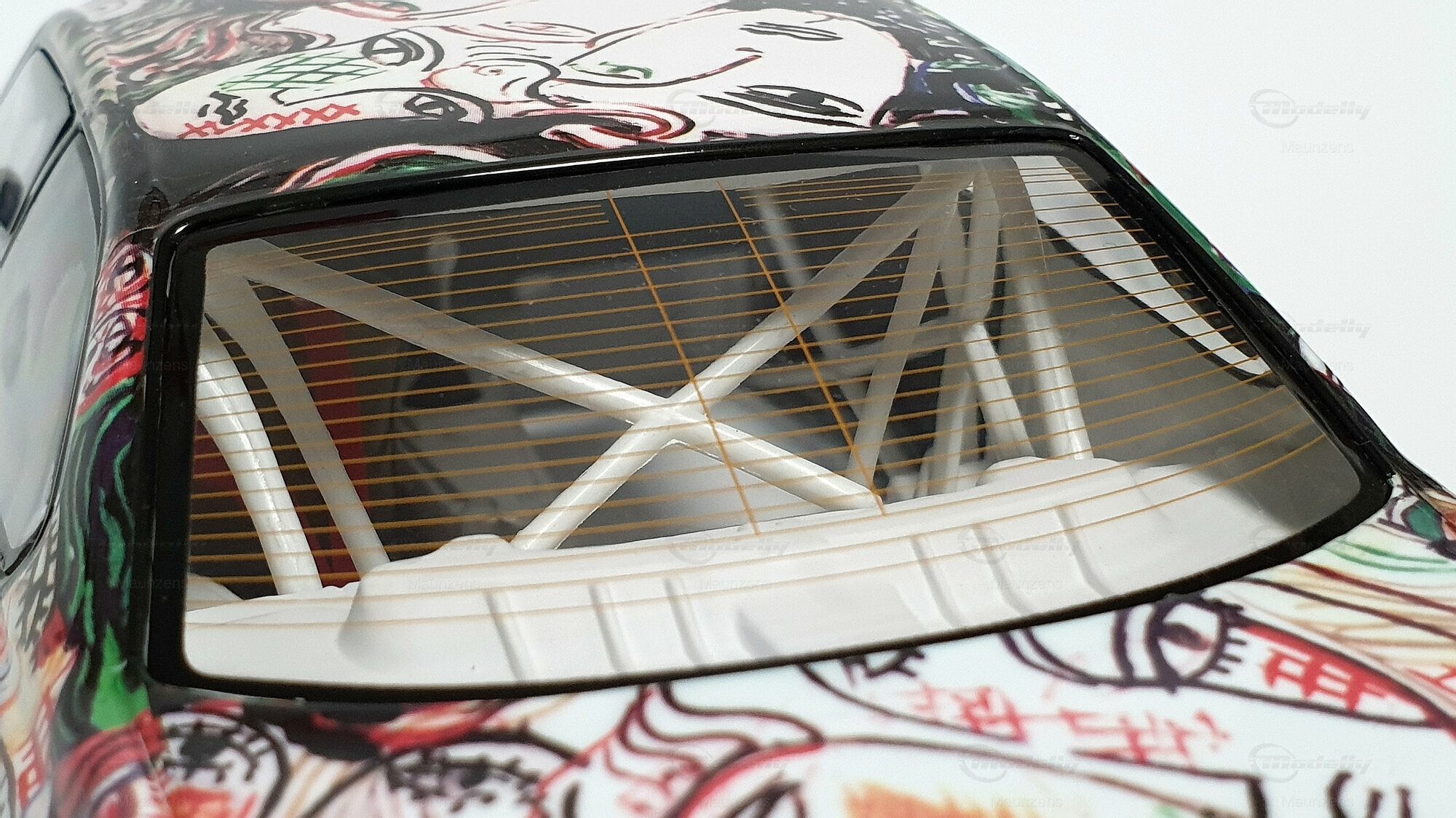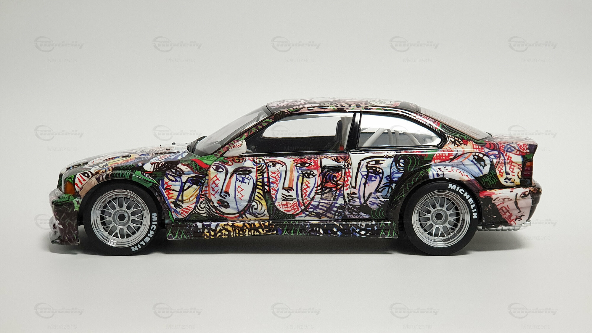 Die Lackierung des Modells stellt ein sogenanntes Art Car dar, ein Konzept, das bei BMW Rennfahrzeugen seit den 1970er Jahren umgesetzt wird. Besonderes Merkmal dieses Modells: Die Karosserie ist nahezu vollständig mit abstrakten Motiven und stilisierten Gesichtern versehen, die sich über Motorhaube, Seiten und Dach erstrecken. Die kunstvolle Gestaltung in verschiedenfarbigen Linien, Grün-, Rot-, Gelb- und Schwarztönen hebt das Fahrzeug optisch hervor. Laut Sockelbeschriftung handelt es sich um eine Lackierung nach Vorbild von Sandro Chia. Wie bei Art Cars typisch, ist auch auf diesem Modell das BMW-Logo auf der Motorhaube klar zu erkennen, zusammen mit weiteren Bemalungen, die Gesichtszüge und Augen zeigen – charakteristisch für den Stil des Künstlers. Das Design steht damit im Kontrast zur eher funktional-technischen Anmutung klassischer Rennfahrzeuge und macht das Modell bei Sammlern einzigartig.