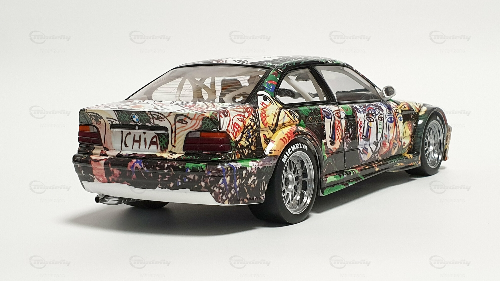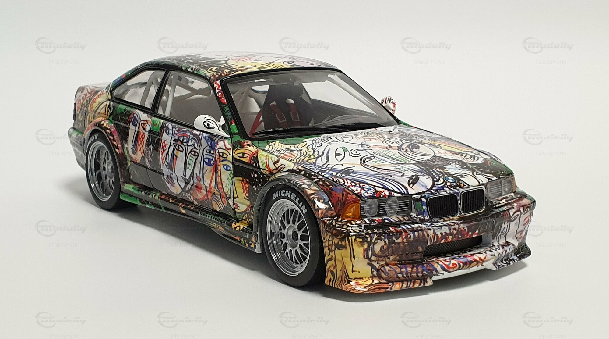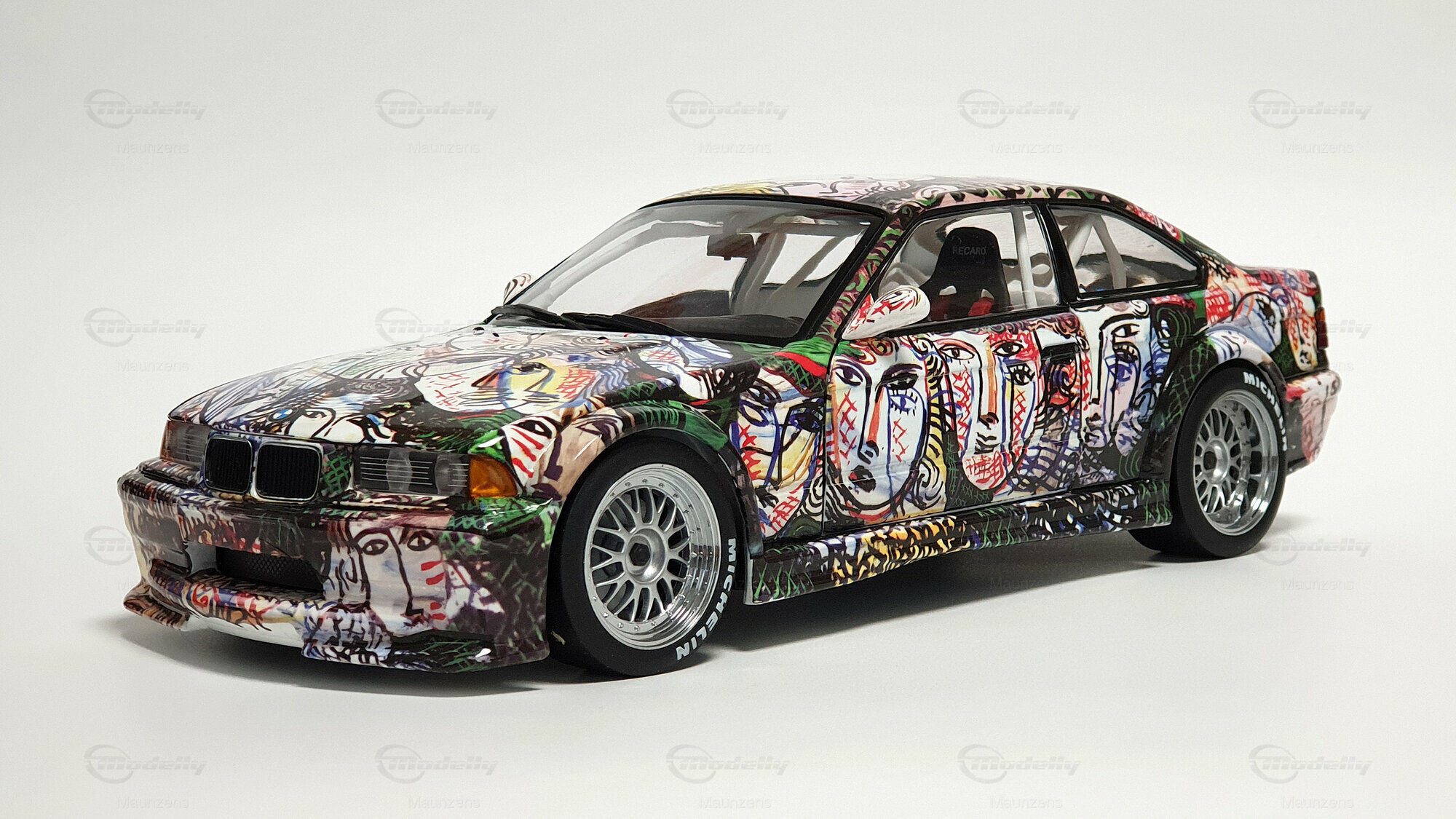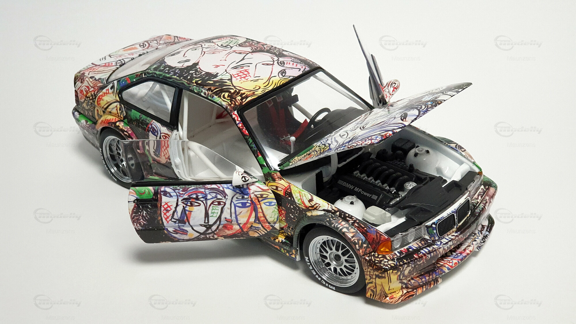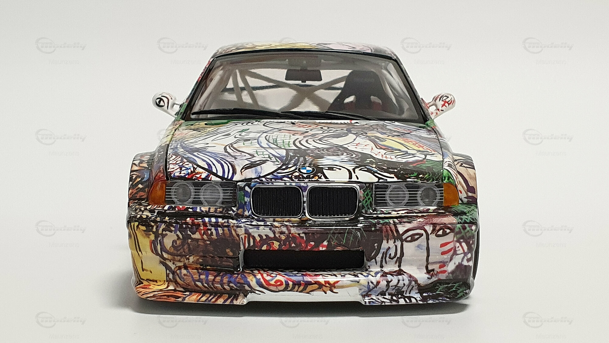 Die Lackierung des Modells stellt ein sogenanntes Art Car dar, ein Konzept, das bei BMW Rennfahrzeugen seit den 1970er Jahren umgesetzt wird. Besonderes Merkmal dieses Modells: Die Karosserie ist nahezu vollständig mit abstrakten Motiven und stilisierten Gesichtern versehen, die sich über Motorhaube, Seiten und Dach erstrecken. Die kunstvolle Gestaltung in verschiedenfarbigen Linien, Grün-, Rot-, Gelb- und Schwarztönen hebt das Fahrzeug optisch hervor. Laut Sockelbeschriftung handelt es sich um eine Lackierung nach Vorbild von Sandro Chia. Wie bei Art Cars typisch, ist auch auf diesem Modell das BMW-Logo auf der Motorhaube klar zu erkennen, zusammen mit weiteren Bemalungen, die Gesichtszüge und Augen zeigen – charakteristisch für den Stil des Künstlers. Das Design steht damit im Kontrast zur eher funktional-technischen Anmutung klassischer Rennfahrzeuge und macht das Modell bei Sammlern einzigartig.