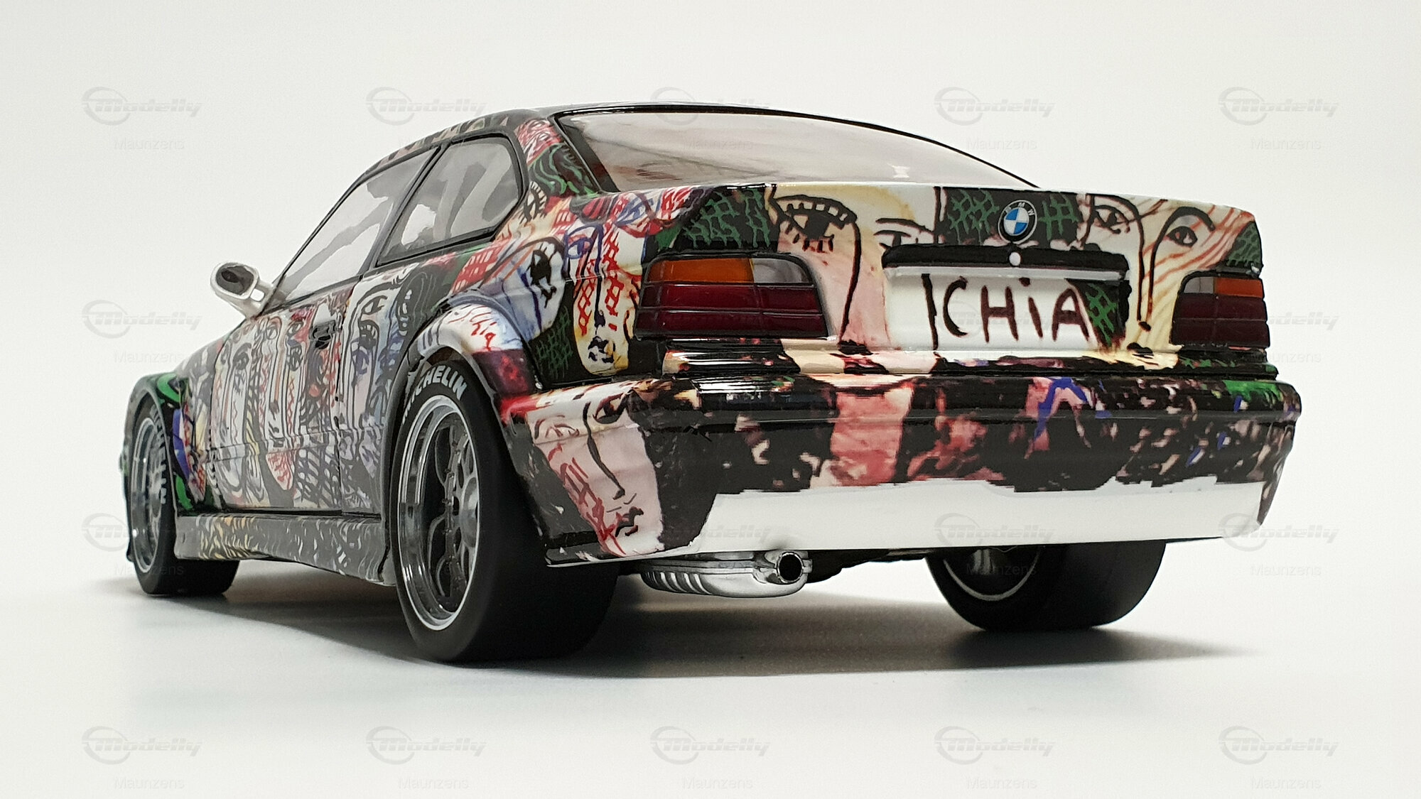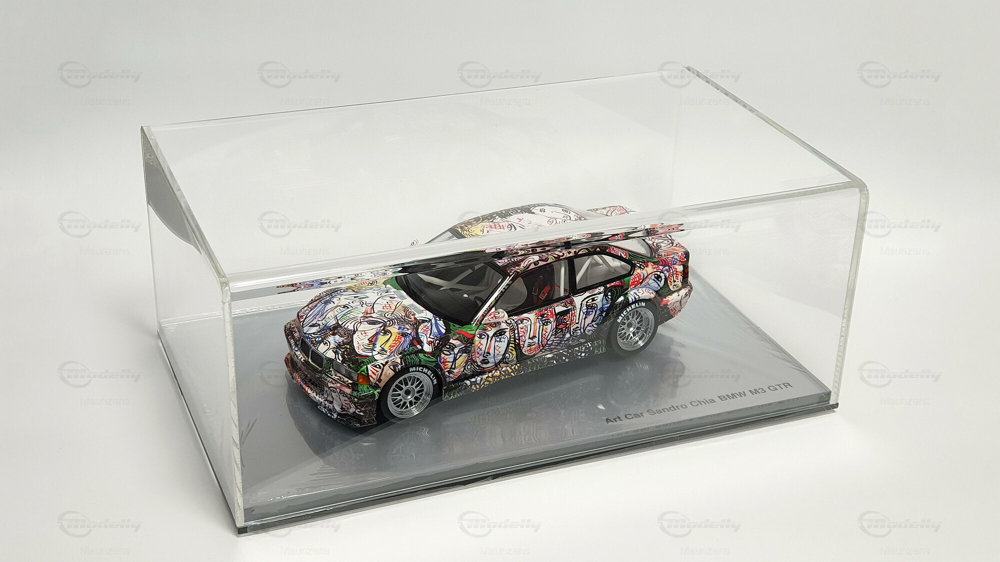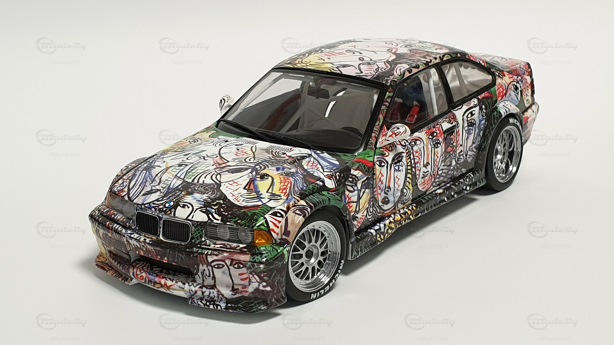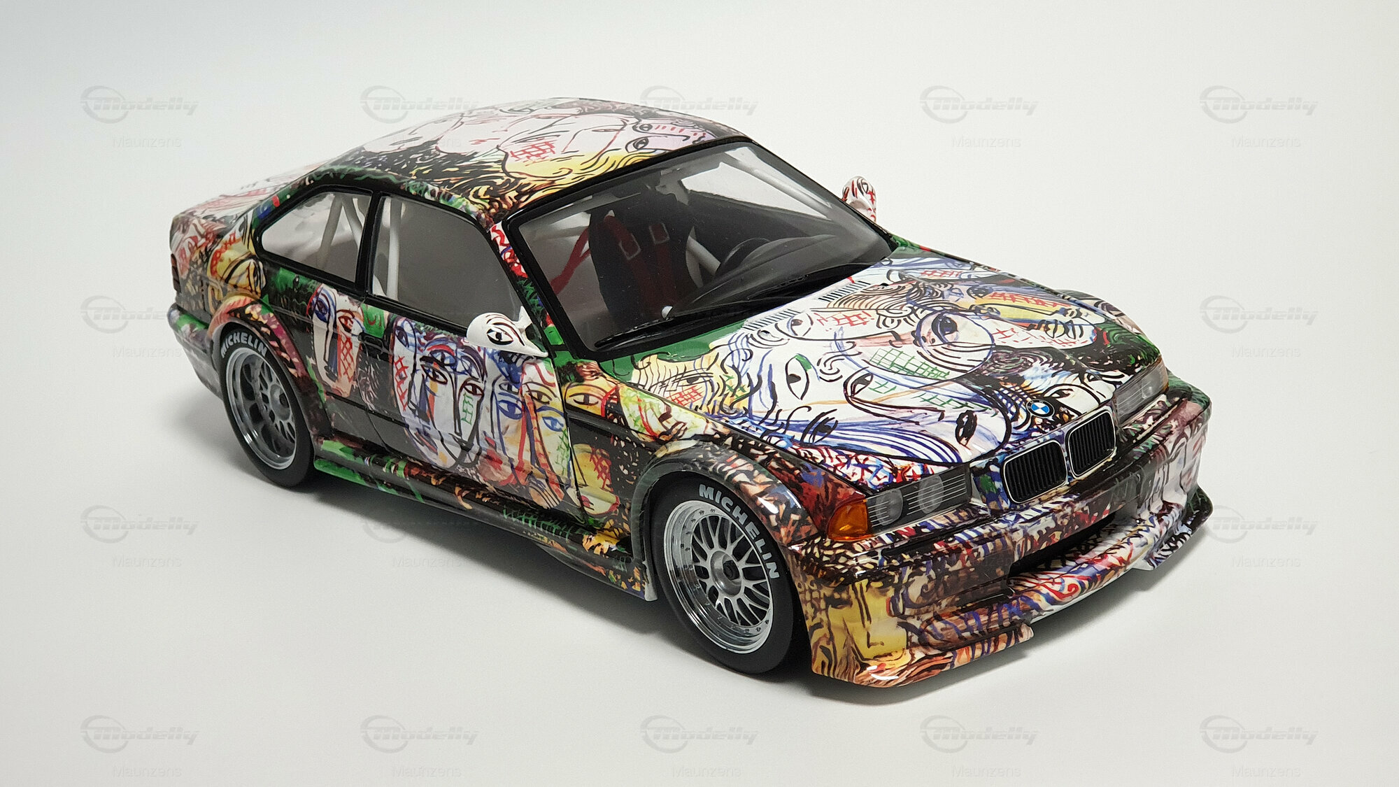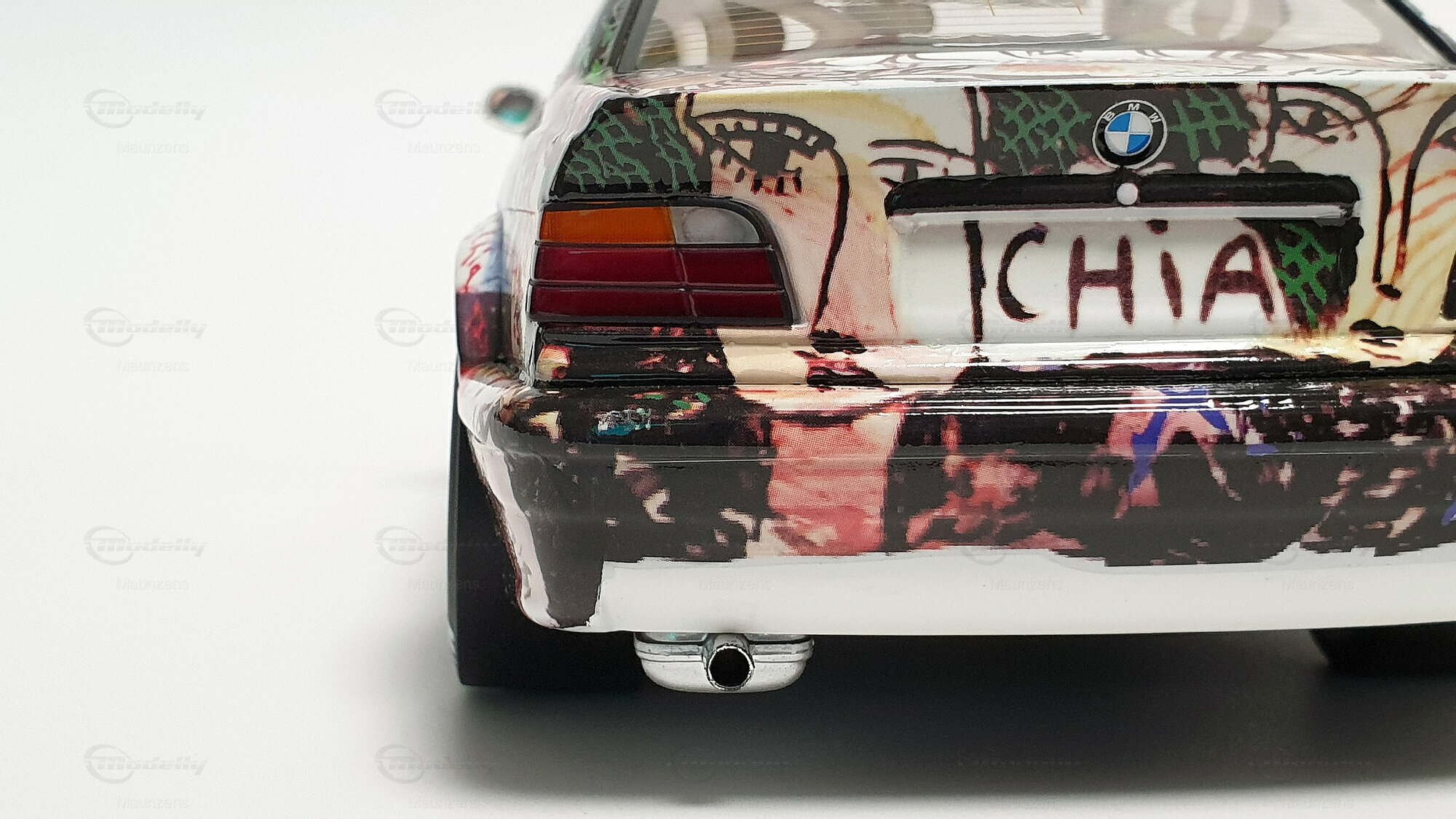 Die Lackierung des Modells stellt ein sogenanntes Art Car dar, ein Konzept, das bei BMW Rennfahrzeugen seit den 1970er Jahren umgesetzt wird. Besonderes Merkmal dieses Modells: Die Karosserie ist nahezu vollständig mit abstrakten Motiven und stilisierten Gesichtern versehen, die sich über Motorhaube, Seiten und Dach erstrecken. Die kunstvolle Gestaltung in verschiedenfarbigen Linien, Grün-, Rot-, Gelb- und Schwarztönen hebt das Fahrzeug optisch hervor. Laut Sockelbeschriftung handelt es sich um eine Lackierung nach Vorbild von Sandro Chia. Wie bei Art Cars typisch, ist auch auf diesem Modell das BMW-Logo auf der Motorhaube klar zu erkennen, zusammen mit weiteren Bemalungen, die Gesichtszüge und Augen zeigen – charakteristisch für den Stil des Künstlers. Das Design steht damit im Kontrast zur eher funktional-technischen Anmutung klassischer Rennfahrzeuge und macht das Modell bei Sammlern einzigartig.