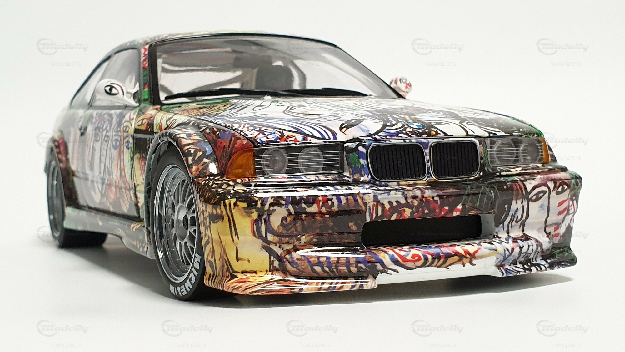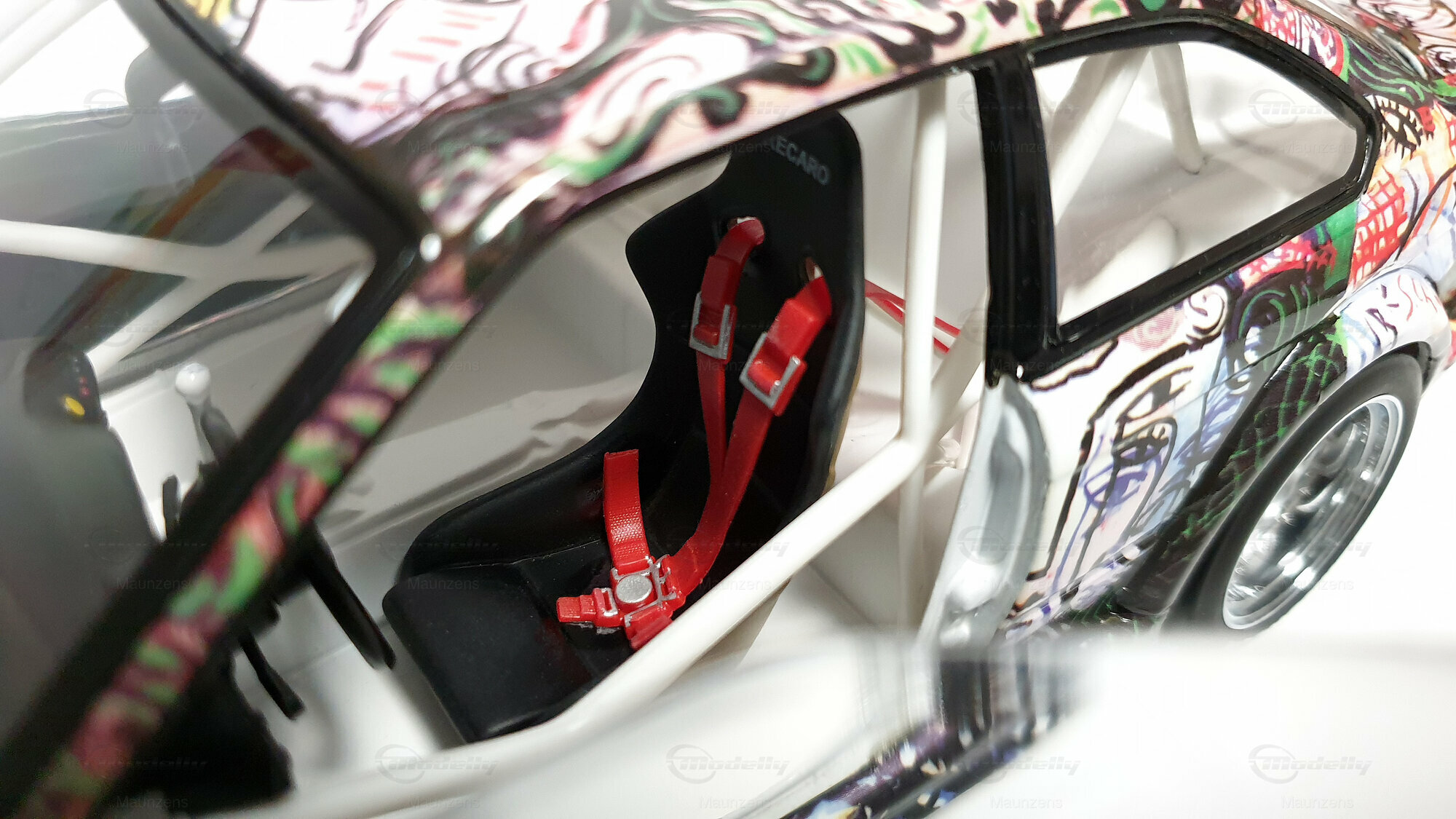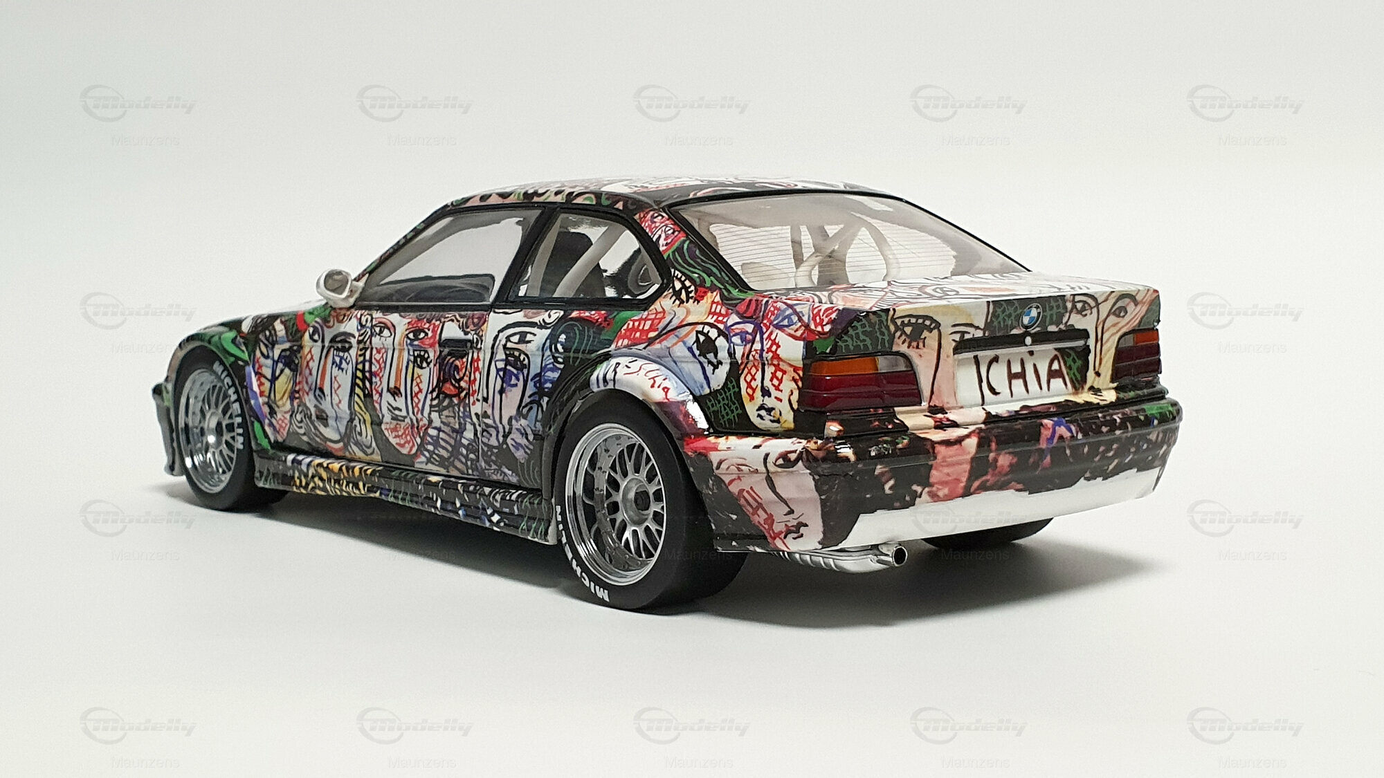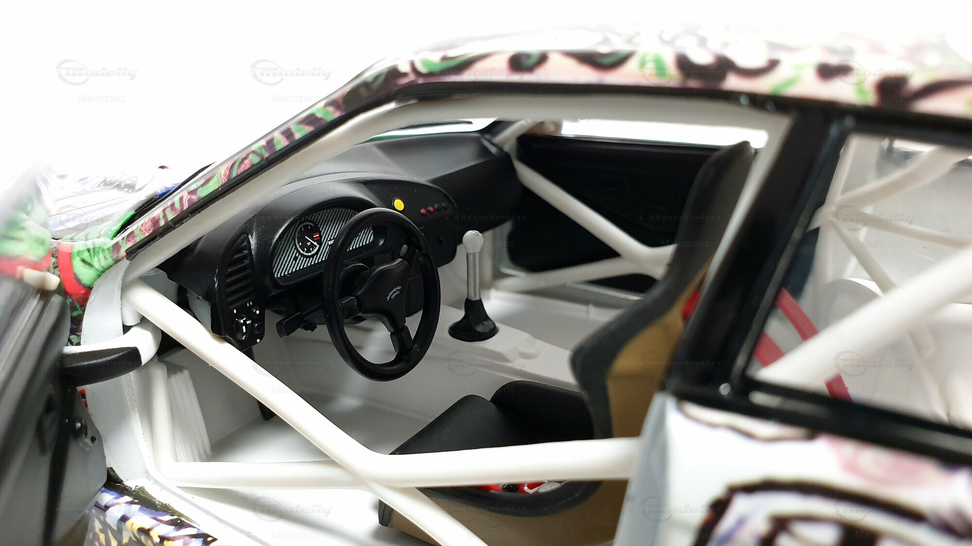 Das hier abgebildete Modellauto wurde von UT Models im 1:18 Maßstab gefertigt und spiegelt zahlreiche Details des BMW M3 E36 GTR wider. Dieses Sammlerstück in der Sammlung von Modelly-Mitglied „Maunzens“ zeigt das Rennfahrzeug in einer besonders auffälligen Art-Car-Lackierung. Hergestellt ist dieses Modell aus robustem Diecast-Material, was einen soliden Eindruck vermittelt und für Langlebigkeit im Sammelregal sorgt. Besonders auffällig sind beim Modell die ausgeprägten Radläufe sowie die typischen Lufteinlässe in der Frontschürze, die identisch zum Vorbild sind. Der gut sichtbare Überrollkäfig im Innenraum und die Einzelsitze mit nachgebildetem 5-Punkt-Gurt geben das Motorsport-Flair exakt wieder. UT Models ist bekannt für detailgenaue Nachbildungen von Rennwägen im 1:18 Format – dies ist bei diesem Exemplar deutlich erkennbar.
