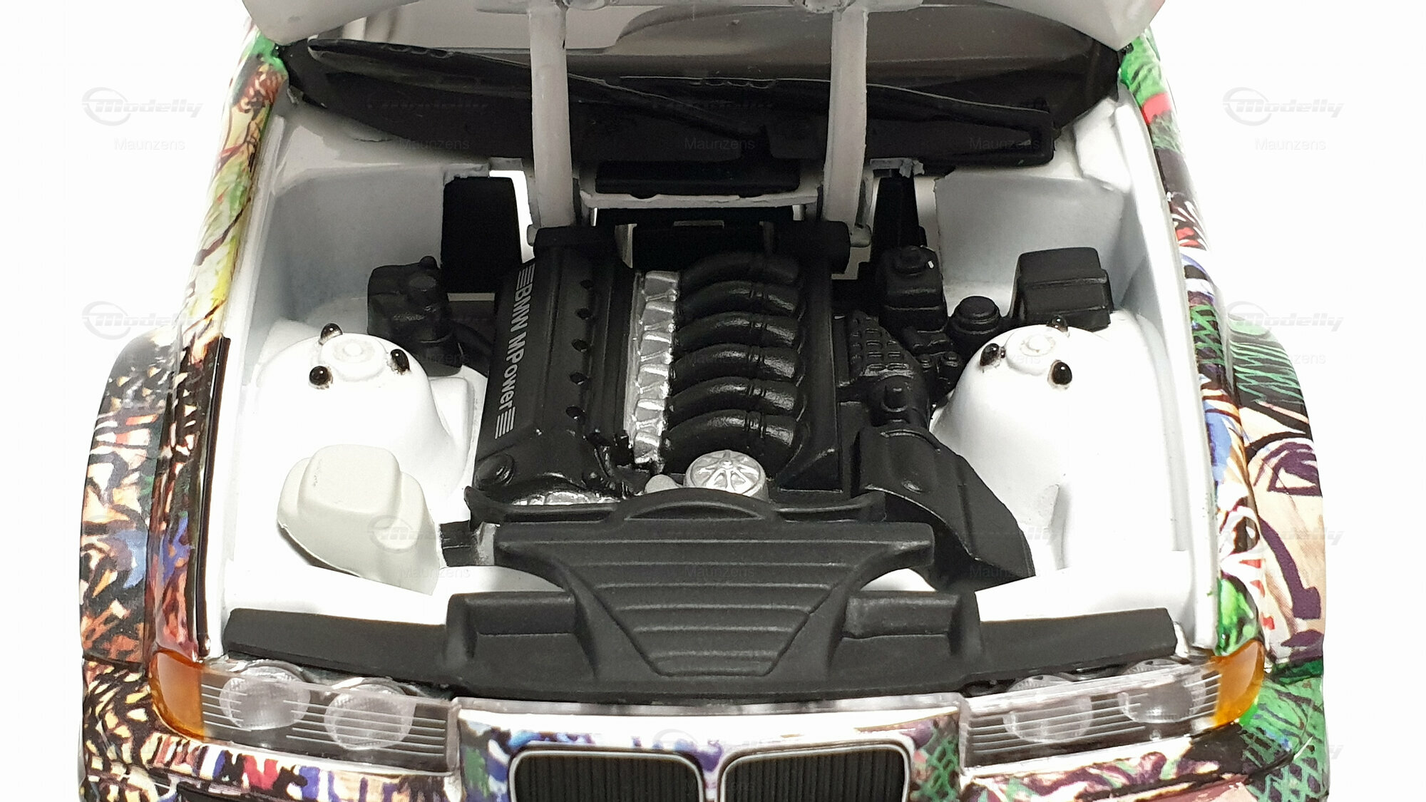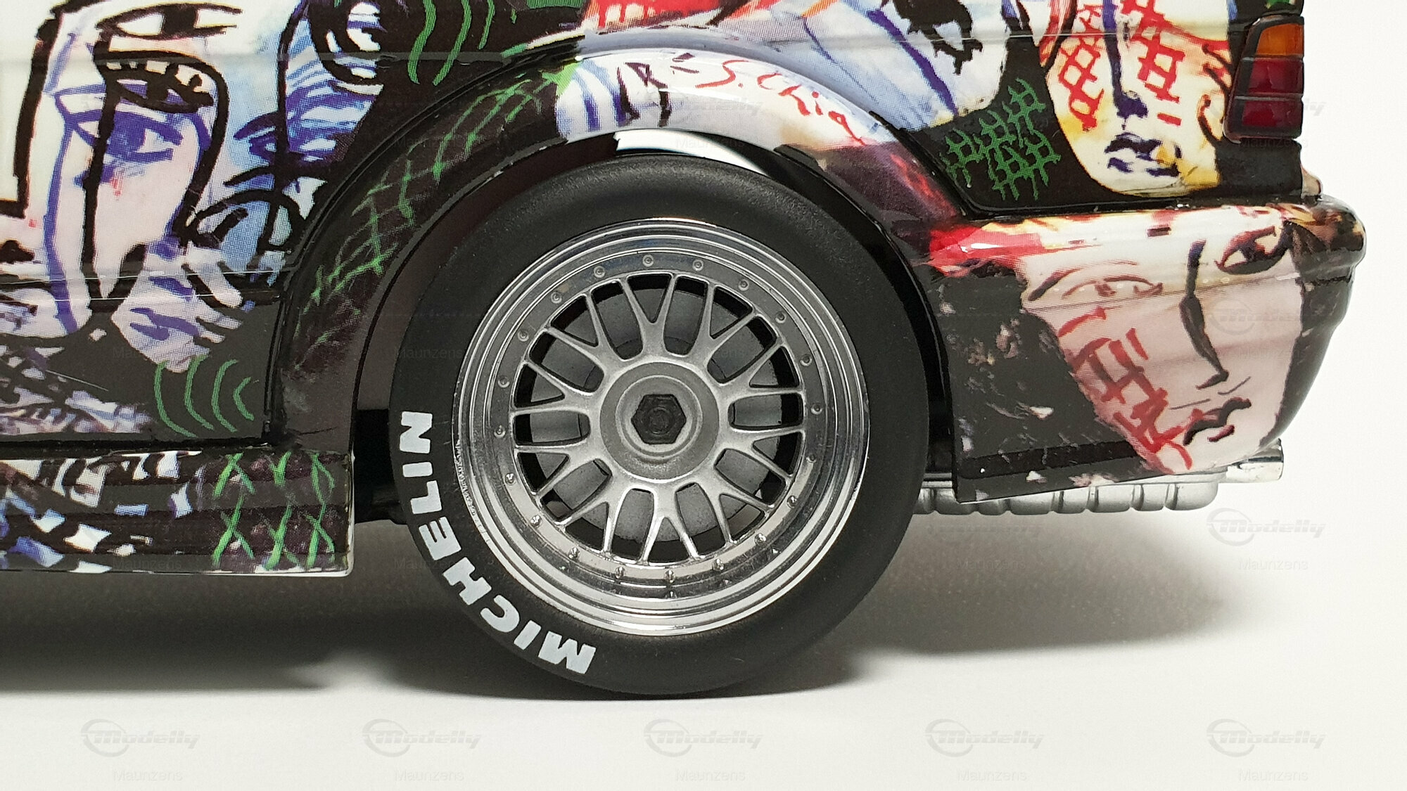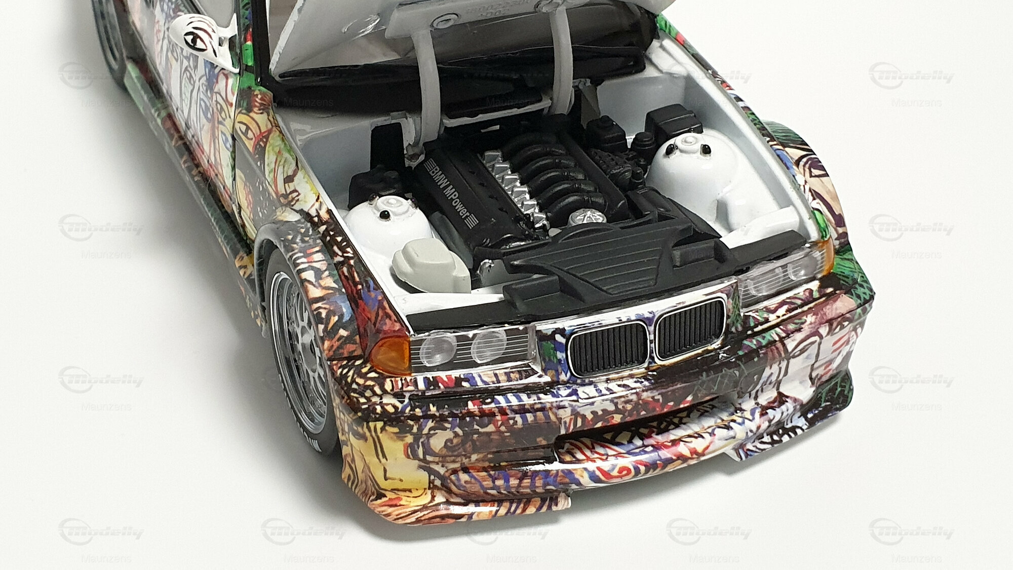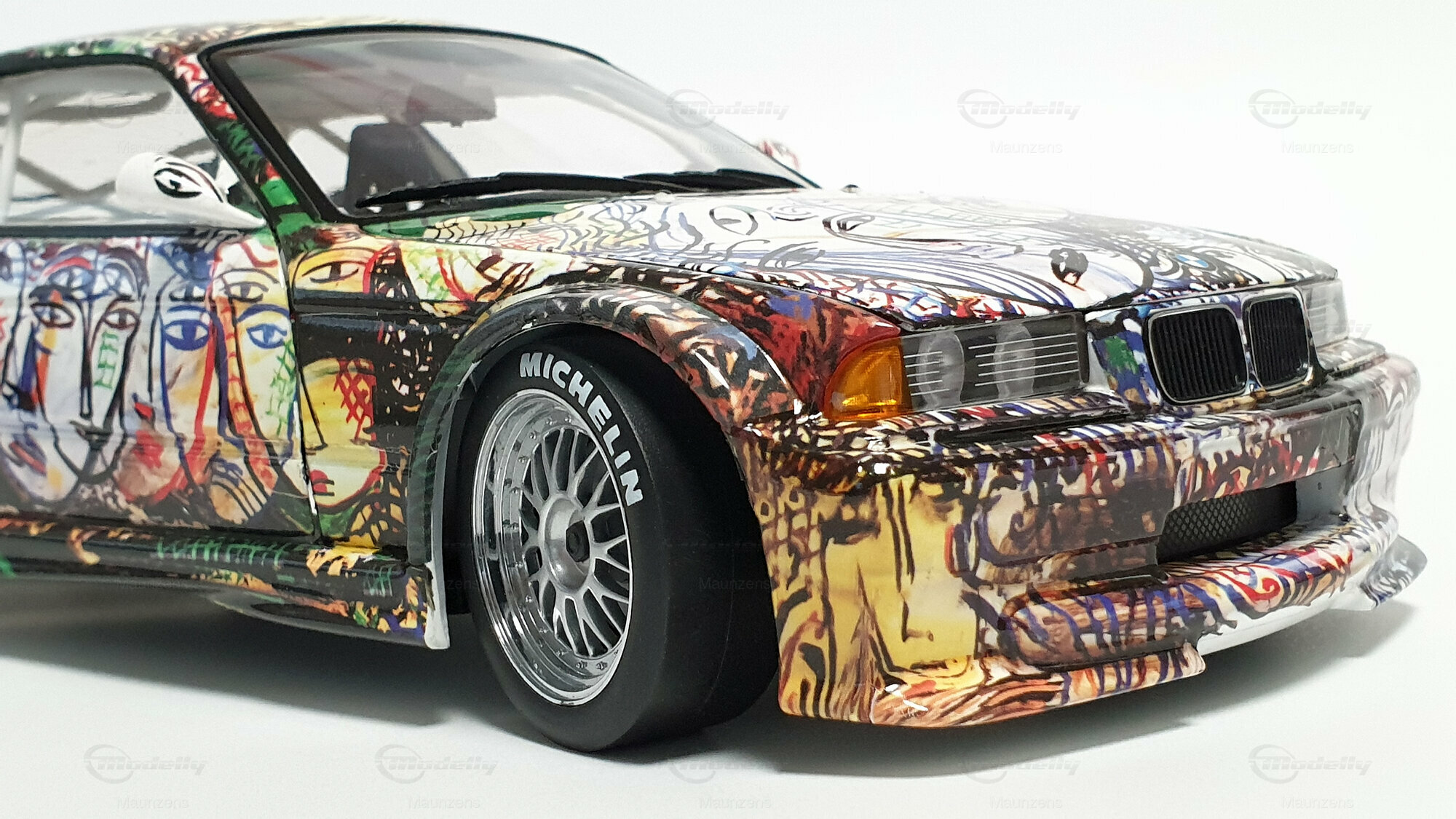 Das 1:18-Modell von UT Models zeigt die auf Sportwagen klassischen Rennsport-Felgen, die im Stil der BBS-Räder gehalten sind und auf den Reifen den Schriftzug Michelin tragen. Dies gibt einen Hinweis auf die prominente Verwendung solcher Felgen- und Reifenkombinationen im damaligen Motorsport. Sammlerfreundlich präsentiert sich das Modell in einer klappbaren Acrylhaube, was eine staubfreie Aufbewahrung sowie eine ansprechende Präsentation zur Schau stellt. Der Umfang an Details bei Gittereinsätzen, Scheinwerfern und Spiegeln ist vollständig und spiegelt den Anspruch an hochwertige Diecast-Modellautos wider. Die Nachbildung der Rollkäfigstruktur und die real wirkenden Rennsitze unterstreichen, dass diese Miniatur ein begehrtes Sammlerstück bei Modellauto-Enthusiasten ist. Erwähnenswert ist außerdem, dass dieses spezifische Modell von UT Models als Diecast-Version im 1:18 Maßstab mehrfach in internationalen Sammlungen gelistet ist und durch seinen Art Car-Look besonders bei Fans der BMW-Kunstautos einen festen Platz gefunden hat.