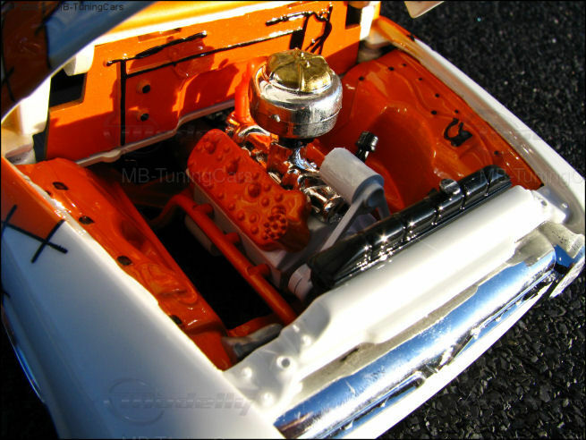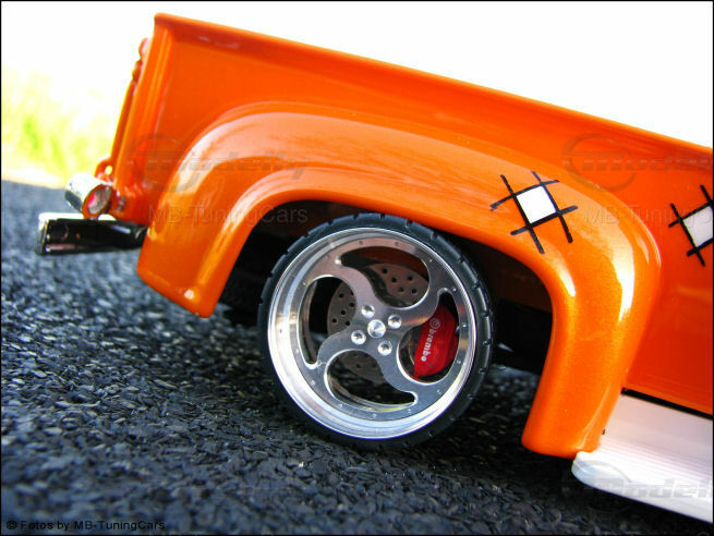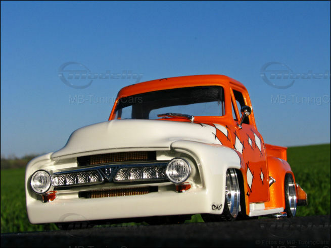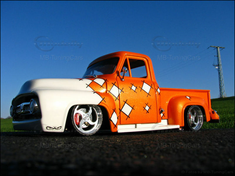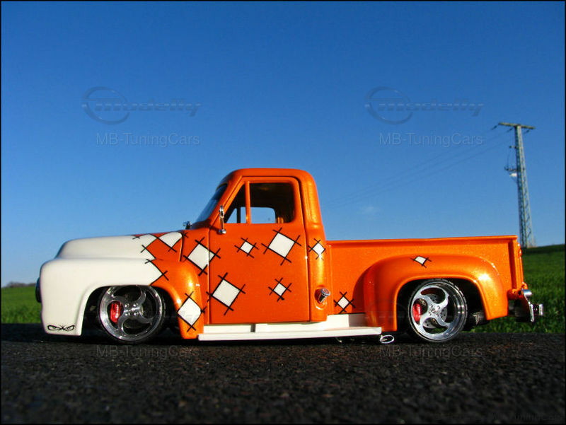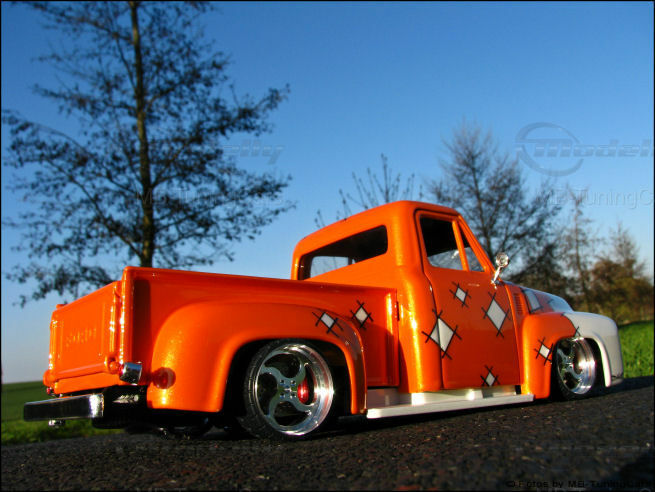 Diese spezielle Miniatur, die Teil der Sammlung von Modelly-Mitglied "MB-TuningCars" ist, zeichnet sich durch den hohen Detailgrad und die präzise Nachbildung des Originals aus. Die Lackierung in Orange und Weiß sowie die akribisch gestaltete Frontpartie mit originalgetreuen Kühlergrill und Scheinwerfern machen dieses Modell zu einem Highlight jeder Sammlung. Die polierten Felgen von Boyd Coddington verleihen der Miniatur zusätzlichen Glanz und unterstreichen die Liebe zum Detail. Sammeln von Modellautos im Maßstab 1:18 von Ertl bedeutet, ein Stück Automobilgeschichte in den eigenen Händen zu halten, das trotz seiner kleinen Größe die Größe des Originals widergespiegelt.Im Jahr 1953, als der Ford F-100 eingeführt wurde, geschahen bedeutende Ereignisse wie der Tod von Josef Stalin oder die Krönung von Königin Elisabeth II.. Diese Beispiele geben einen Einblick in die epochale Zeit, in der dieser ikonische Truck auf den Markt kam. Einer der beliebtesten Songs des Jahres war "Vaya Con Dios" von Les Paul and Mary Ford, was eine Vorstellung davon vermittelt, welche Melodien in den Ohren der Menschen ertönten, als sie Fahrzeuge wie den Ford F-100 erwarben.