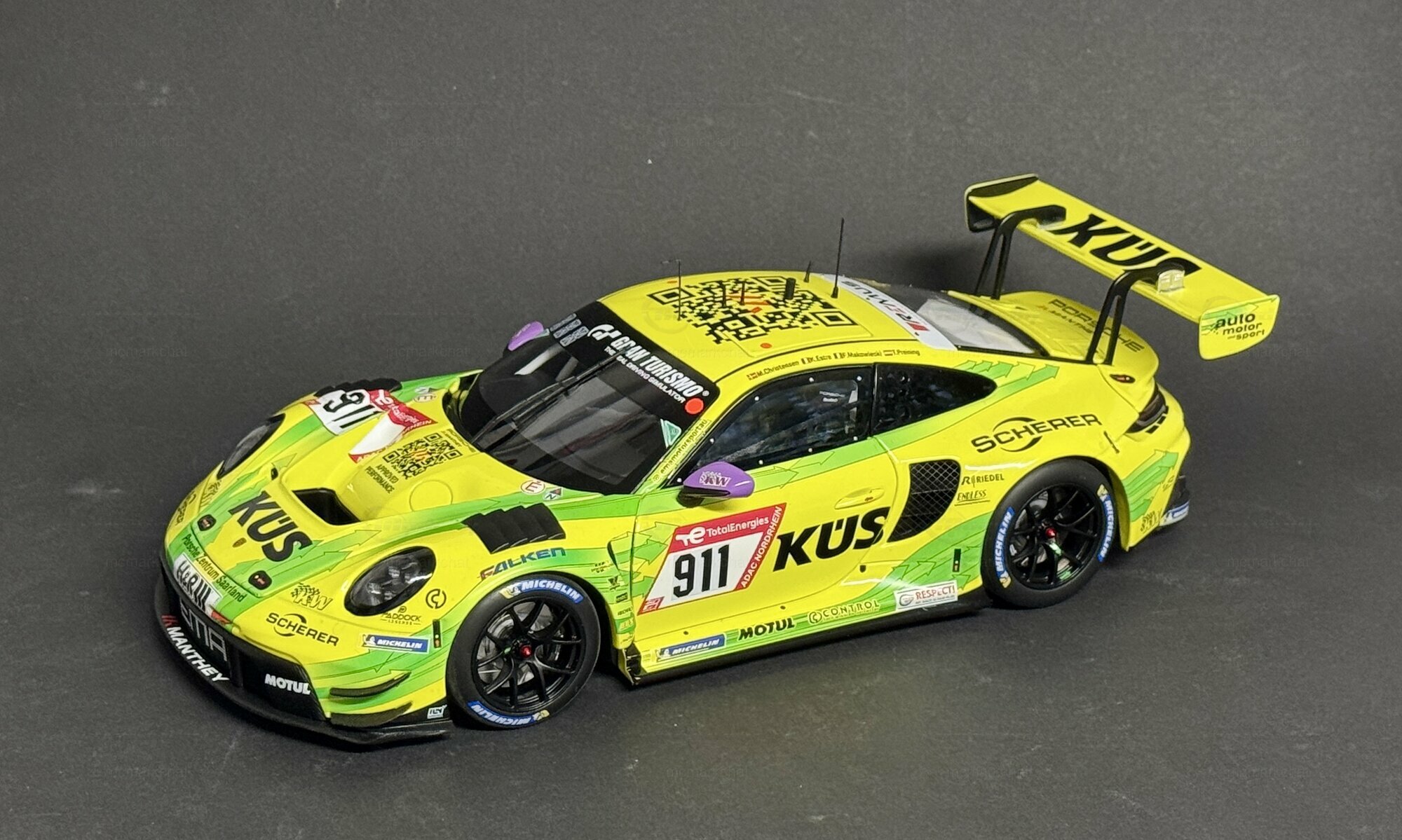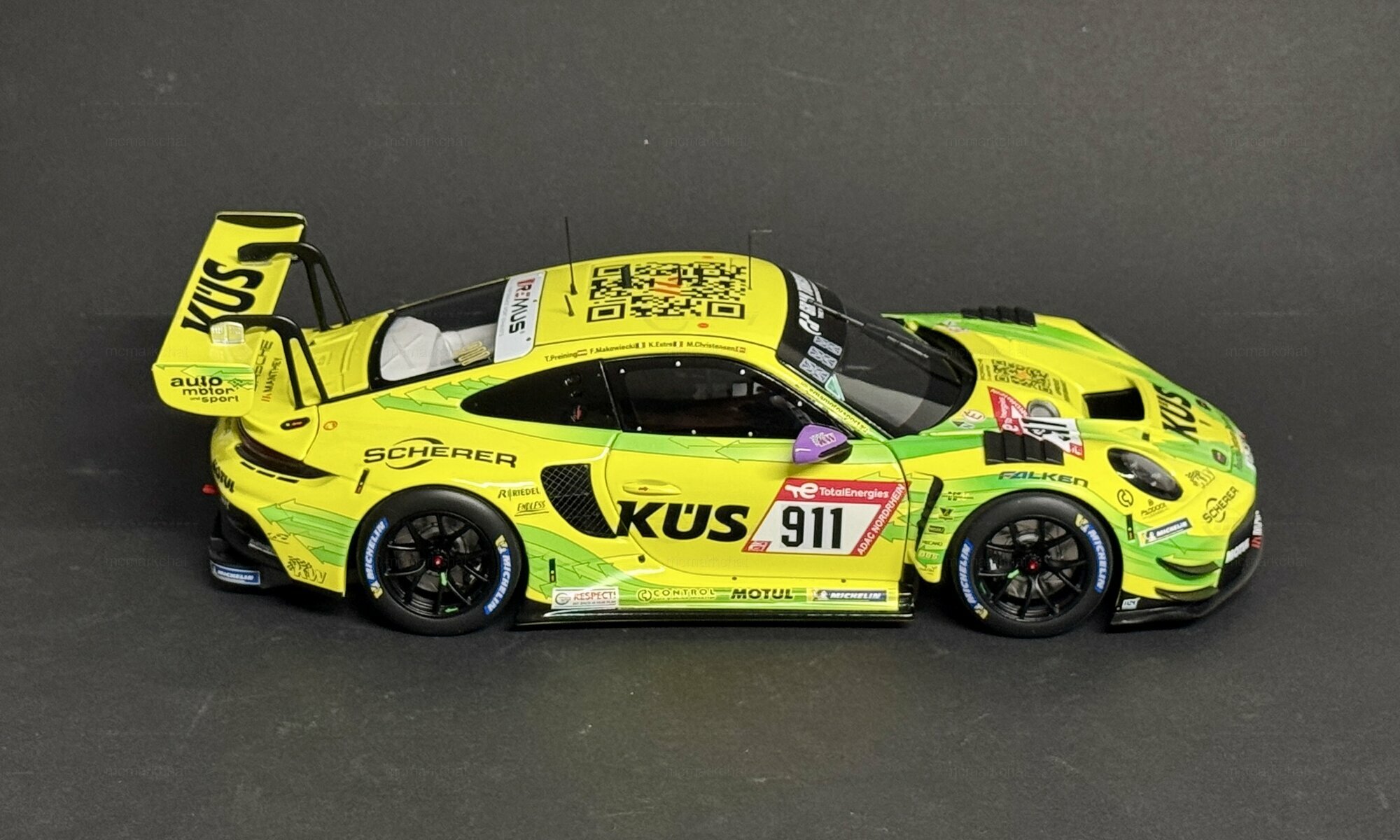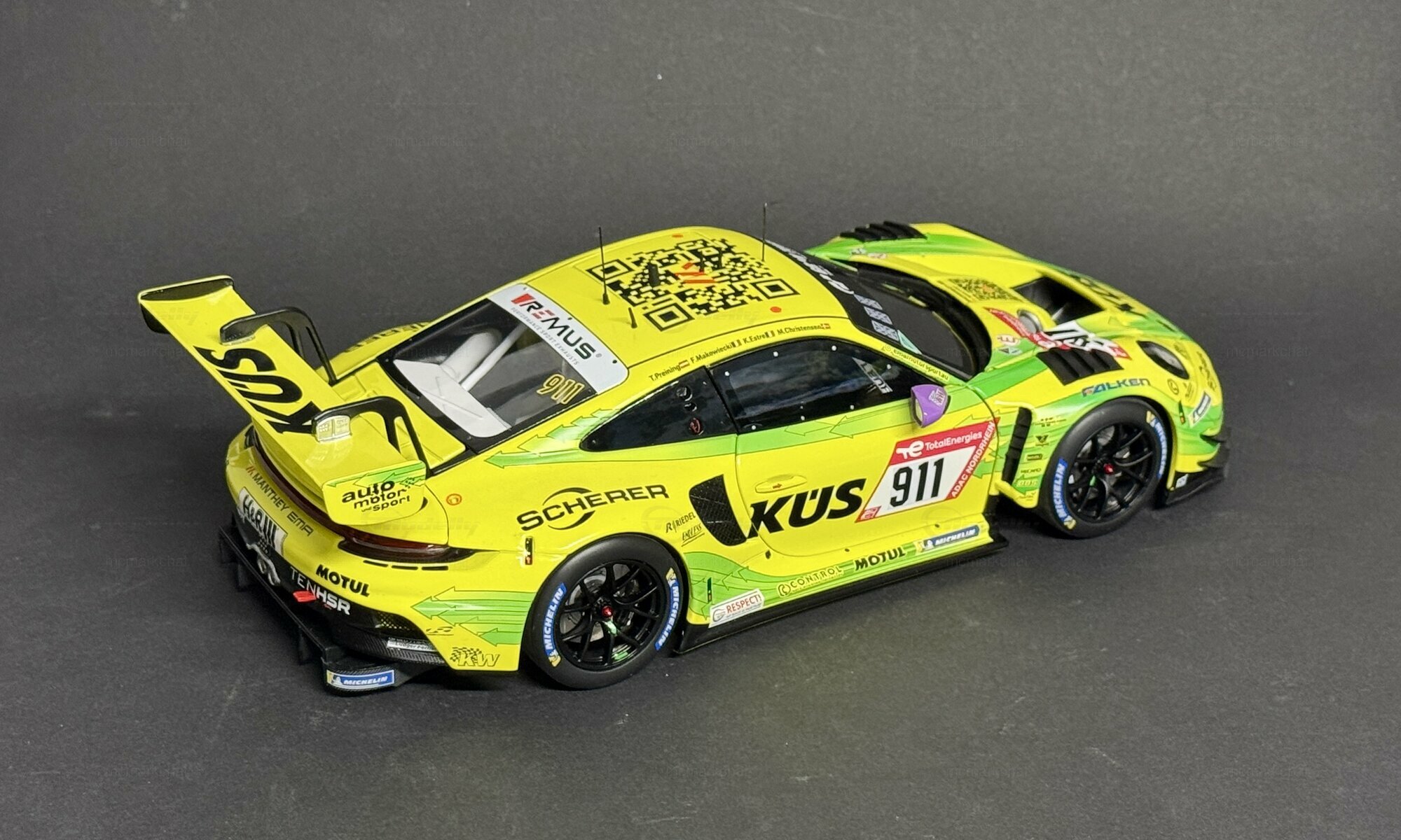 Für Sammler und Enthusiasten bietet dieses Modell in 1:18 Scale von Minichamps eine detailgetreue Nachbildung des Originals. Das Modell ist aus einem Materialmix gefertigt, der Metall, Kunststoff und Gummi kombiniert, um Authentizität sowie eine hochwertige Haptik zu gewährleisten. Es handelt sich um eine streng limitierte Auflage von nur 300 Stück weltweit. Diese Exklusivität macht das Modell zu einem begehrten Sammlerstück.Die Verarbeitung des Modells ist geprägt von höchster Präzision: Die Sponsorenlogos, darunter Falken, KÜS, Motul, H&R und Scherer, sind akribisch aufgebracht. Besonders auffällig ist die lackierte Startnummer „911“, die das Modell zu einem echten Hingucker macht. Der massive Heckflügel und die markanten Lüftungsschlitze an den Seiten fangen die Rennsport-DNA des Originals perfekt ein. Reifen- und Bremsdetails unterstreichen die Detailverliebtheit und verleihen dem Modell einen realitätsgetreuen Look.