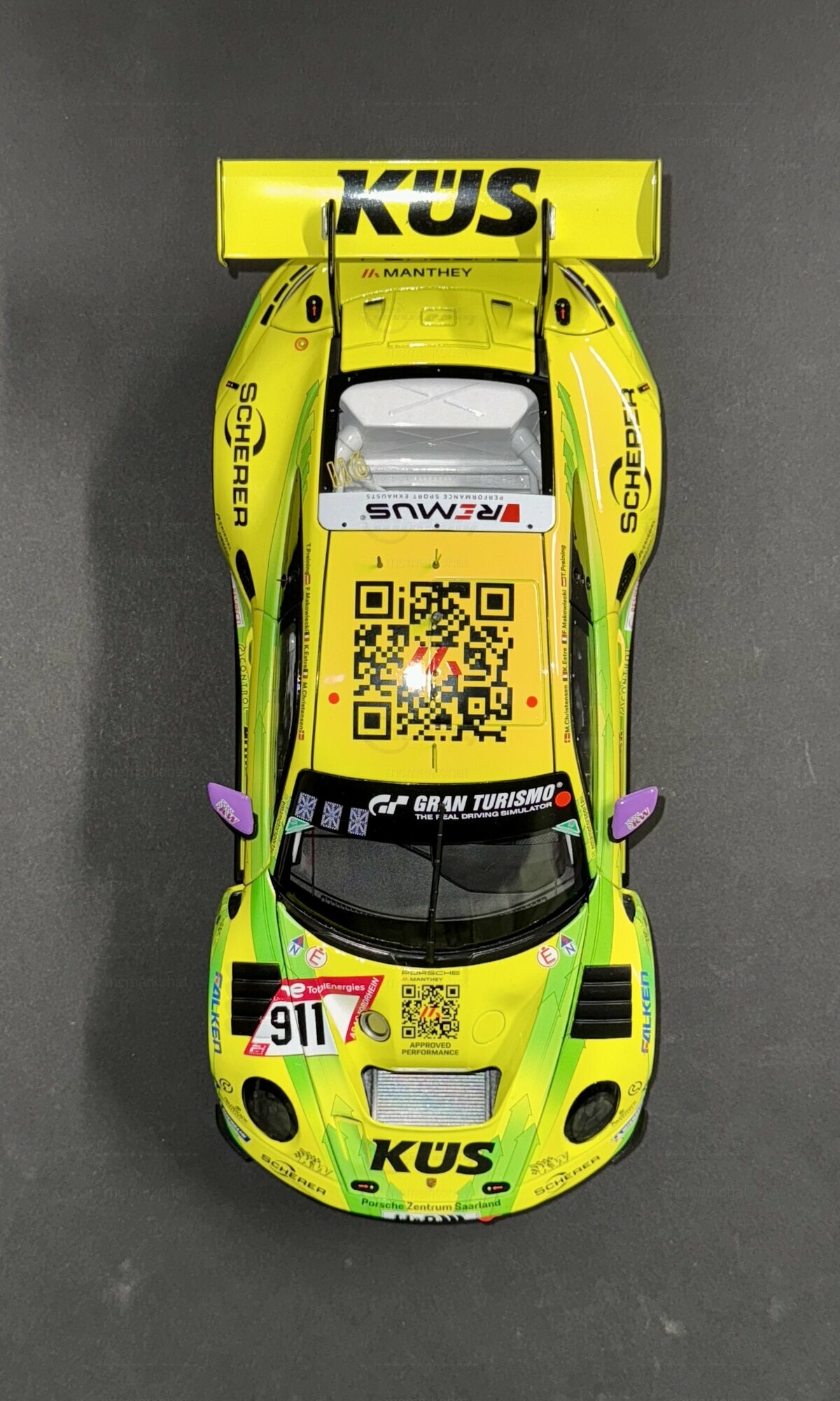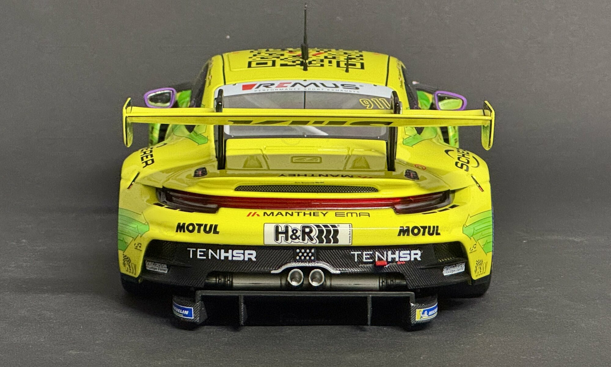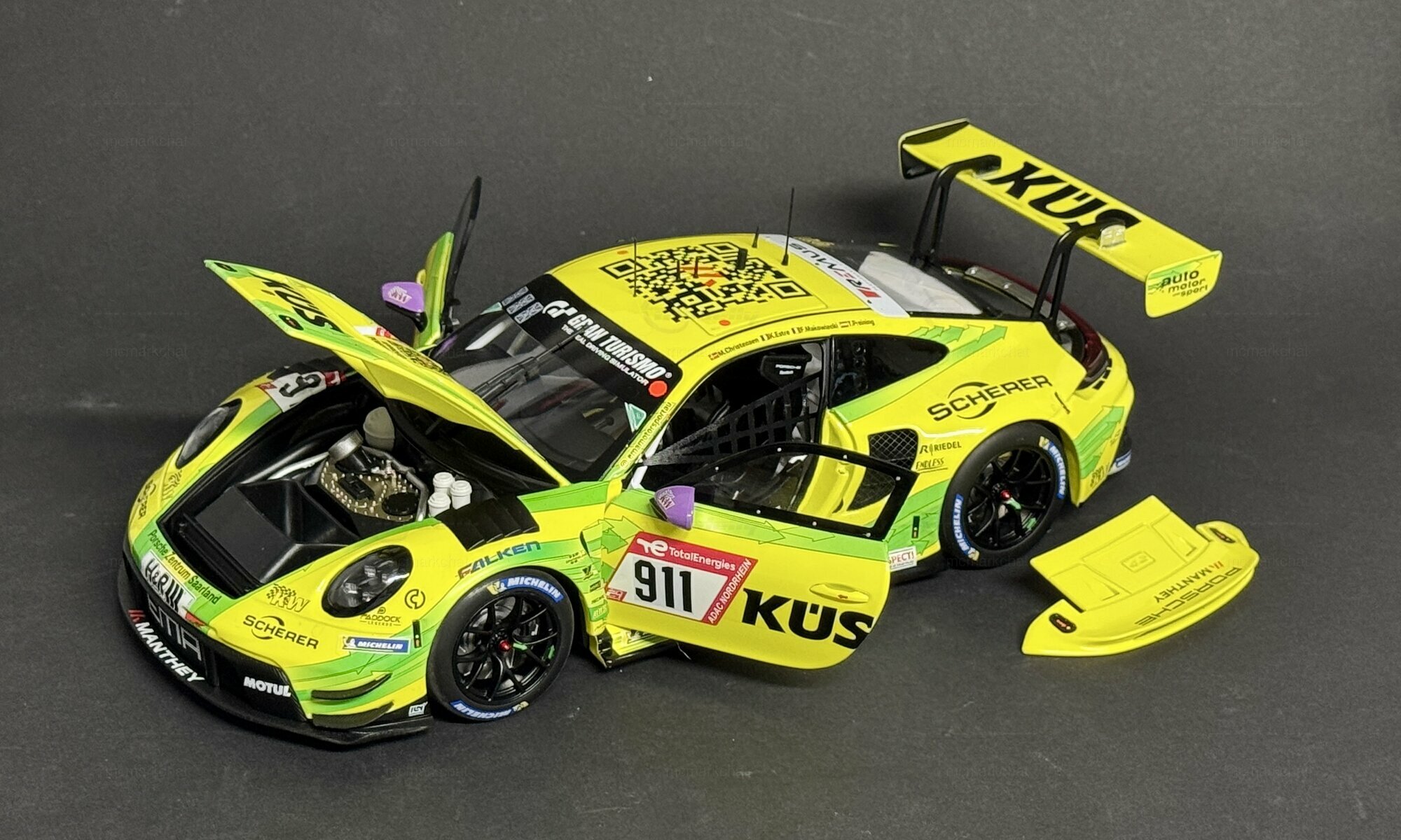 Für Sammler und Enthusiasten bietet dieses Modell in 1:18 Scale von Minichamps eine detailgetreue Nachbildung des Originals. Das Modell ist aus einem Materialmix gefertigt, der Metall, Kunststoff und Gummi kombiniert, um Authentizität sowie eine hochwertige Haptik zu gewährleisten. Es handelt sich um eine streng limitierte Auflage von nur 300 Stück weltweit. Diese Exklusivität macht das Modell zu einem begehrten Sammlerstück.Die Verarbeitung des Modells ist geprägt von höchster Präzision: Die Sponsorenlogos, darunter Falken, KÜS, Motul, H&R und Scherer, sind akribisch aufgebracht. Besonders auffällig ist die lackierte Startnummer „911“, die das Modell zu einem echten Hingucker macht. Der massive Heckflügel und die markanten Lüftungsschlitze an den Seiten fangen die Rennsport-DNA des Originals perfekt ein. Reifen- und Bremsdetails unterstreichen die Detailverliebtheit und verleihen dem Modell einen realitätsgetreuen Look.
