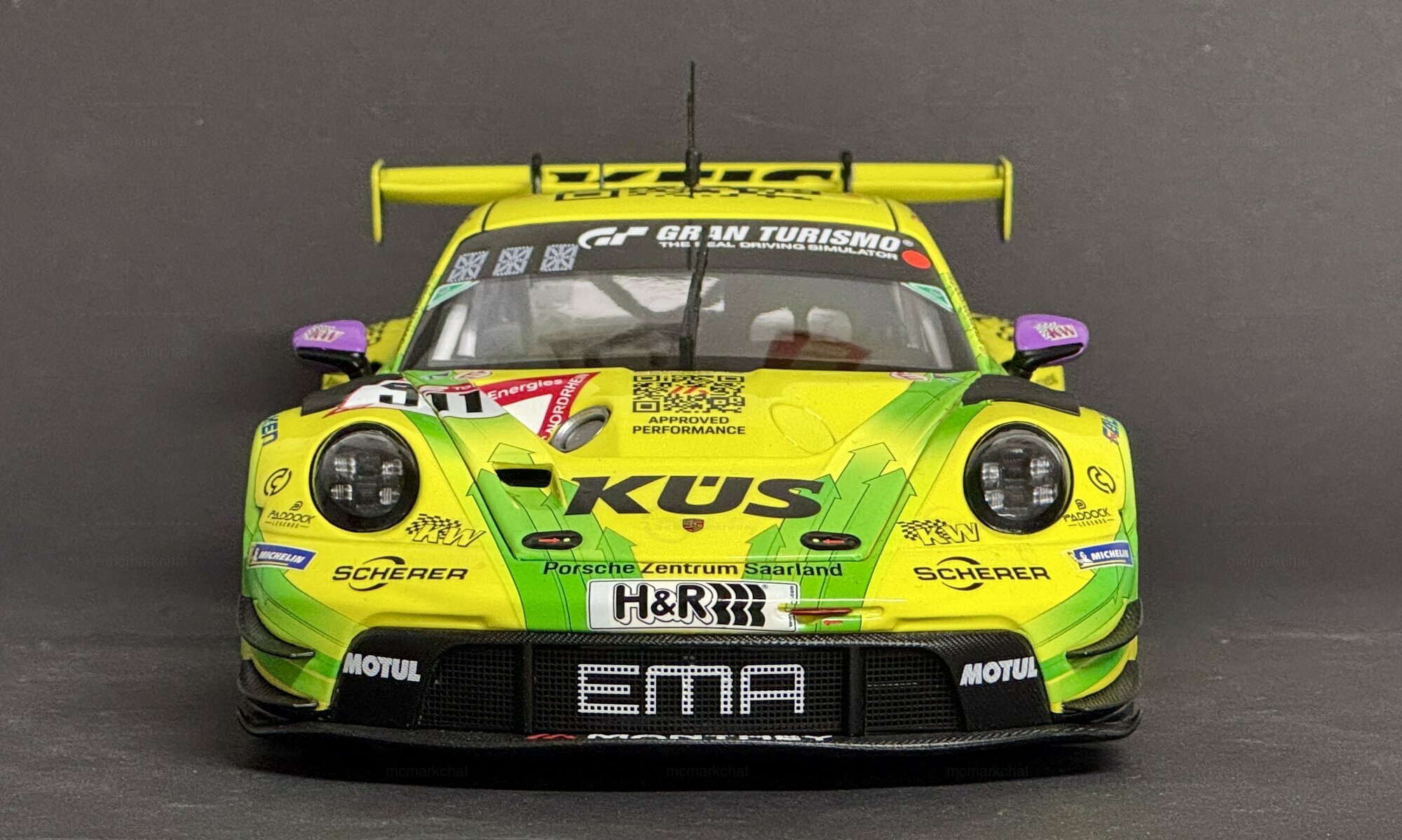 Das Miniaturmodell glänzt durch eine auffällige Gelb-Grün-Lackierung, die im Motorsporttypischen Stil des Porsche 911 (992) GT3 R gehalten ist. Grüne Akzentpfeile ziehen sich über die Flanken und die Motorhaube und verschaffen dem Modell eine dynamische Wirkung. Dieser markante Farbmix findet sich auch bei den realen Motorsportvarianten wieder und lässt das Modell sofort als Mitglied der Rennwelt erkennen.Besondere Details sind die violetten Seitenspiegel sowie fein aufgedruckte QR-Codes auf der Motorhaube und dem Dach. Diese Codes symbolisieren innovative Ansätze im Sponsoring und Marketing moderner Rennwagen. Dank der vielen originalgetreuen Sponsoren- und Veranstaltungslogos bekommt das Modell nicht nur eine realistische Note, sondern fängt auch die Motorsport-Atmosphäre des Originals in Perfektion ein.