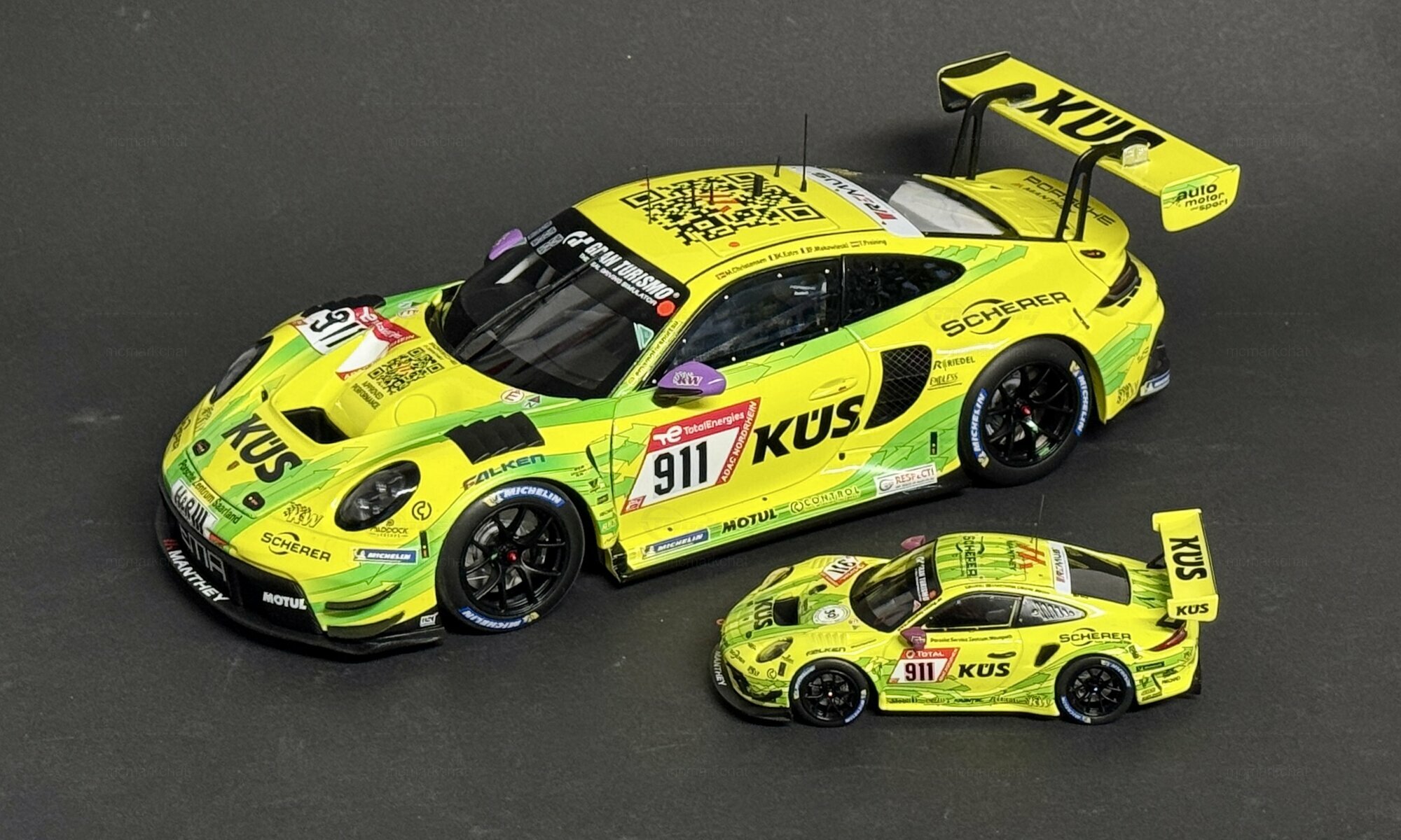 Dieses Modell aus der Sammlung von Modelly-Mitglied „mcmarkchat“ hebt sich durch seine Detailtreue und Verarbeitung hervor. In der strengen Auflage von weltweit nur 300 Stück ist es ein Sammlerstück, das durch seine Präzision und Exklusivität überzeugt. Auffällig sind die individuellen Rennsport-Elemente wie der große Heckspoiler, die detaillierte Frontpartie und die authentischen Logos.Die farbliche Markierung des KÜS-Sponsoring auf gelbem Hintergrund bleibt unverkennbar und verleiht dem Modell seinen besonderen Charakter. Ob bei der Darstellung in einer Vitrine oder als Highlight in einer Sammlung, dieses Modell in 1:18 Scale, produziert von Minichamps, vereint alle Merkmale, die Sammler schätzen: Detailliert, limitiert und optisch ansprechend. Für Liebhaber des Motorsports und Modellautos ist dieses Stück ein Muss.