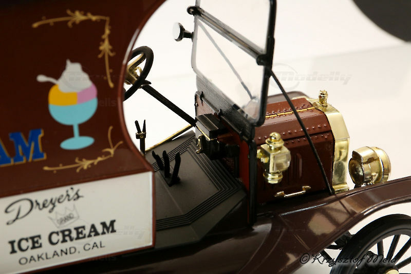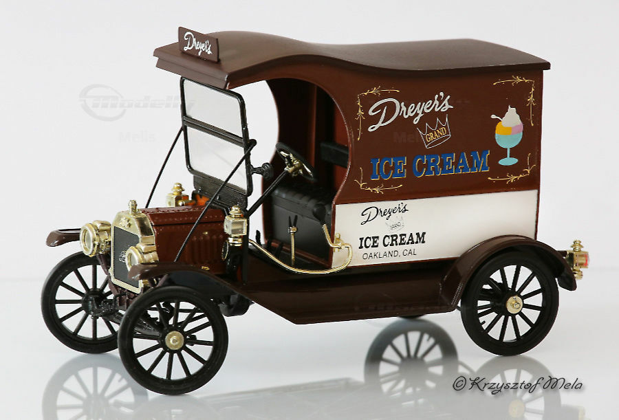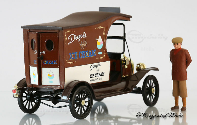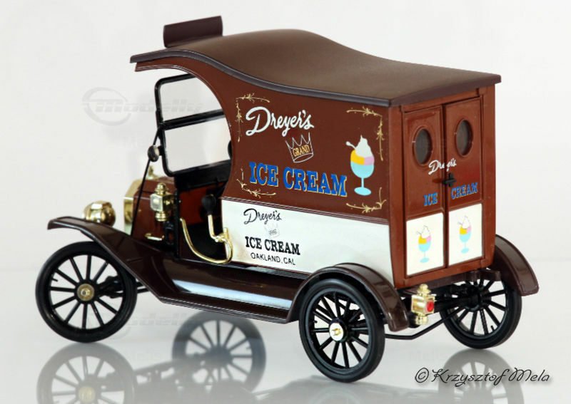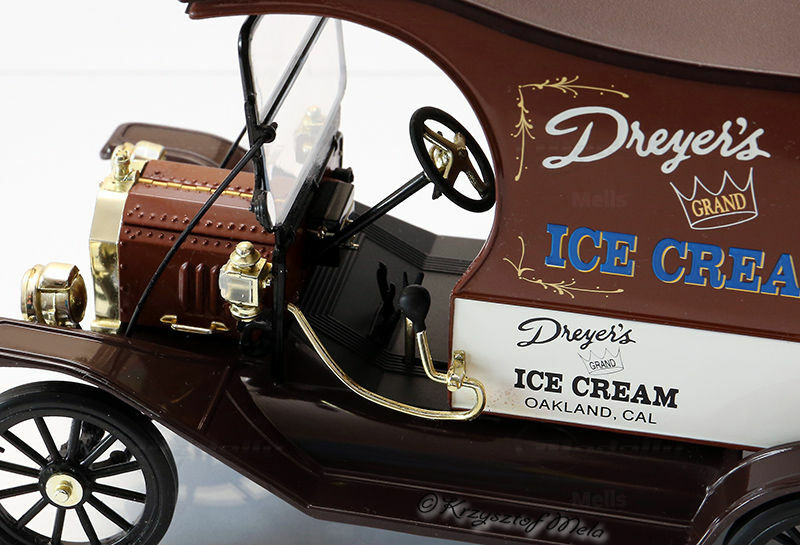 Die Fenster, das Lenkrad und die Scheinwerfer sind originalgetreu nachgebildet und verleihen dem Modell zusätzliches Flair. Der Schriftzug "Dreyer’s Ice Cream, Oakland, Cal" an den Seitenwänden und der Rückseite des Lieferwagens ist eine detailgetreue Nachbildung der historischen Werbung und unterstreicht die Authentizität des Fahrzeugs. Dieses Modell ist definitiv ein Highlight für jede Sammlung und bietet einen faszinierenden Einblick in die Geschichte des Automobilbaus und des frühen 20. Jahrhunderts.