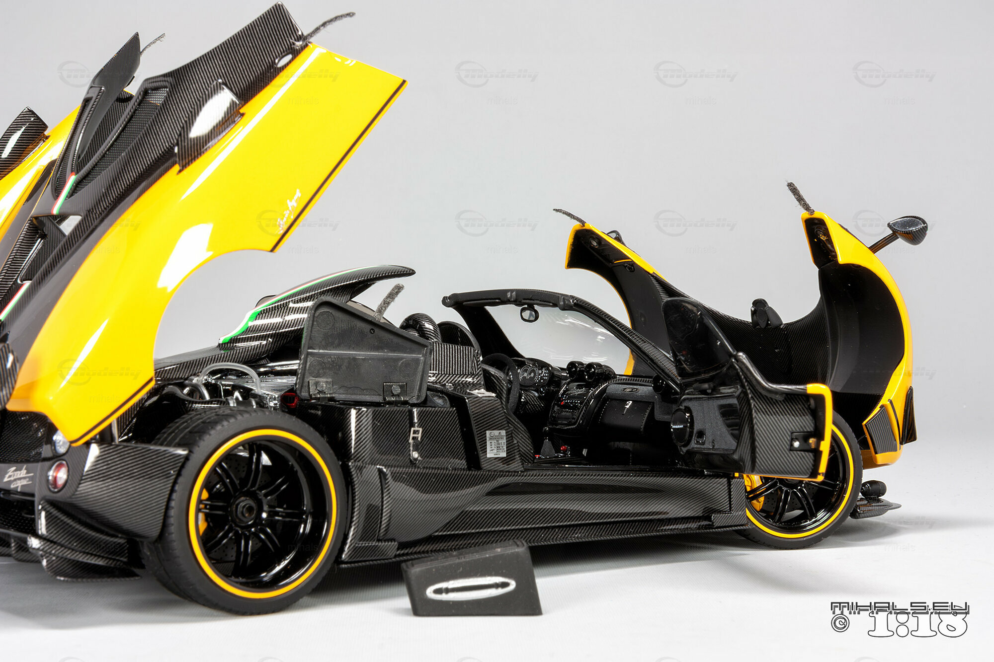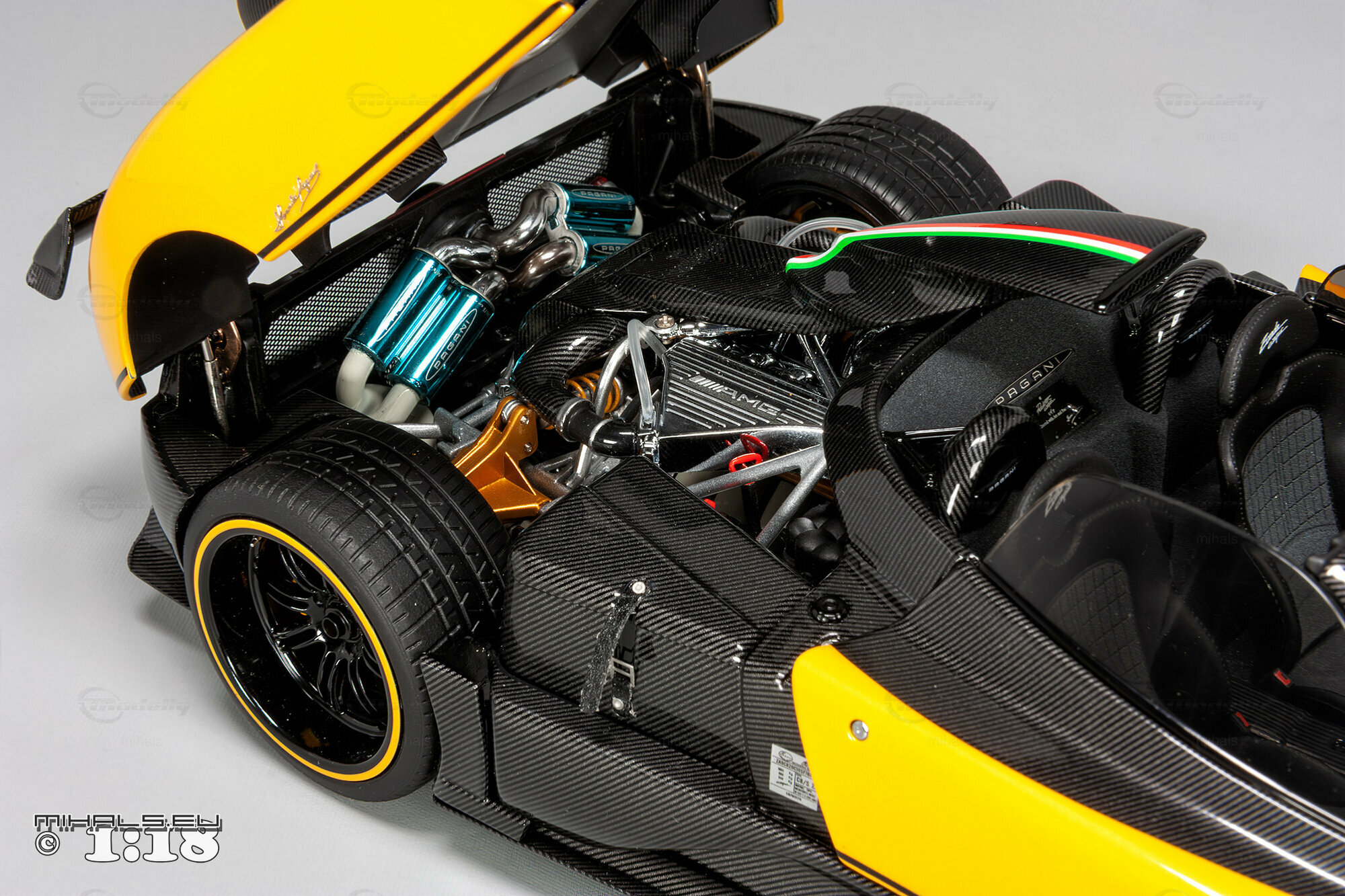 Die Detailtreue des Modells zeigt sich in verschiedenen Bereichen. Besonders auffällig sind die mit Kohlefaser nachgebildeten Bauteile, wie der große Heckspoiler und die seitlichen Luftleitwerke. Auch das Cockpit des Modells ist reich an Details: der Innenraum zeigt filigrane Elemente, wie z.B. präzise angedeutete Instrumente, Sportsitze und Lenkrad. Der Pagani Zonda Cinque Roadster im Original war mit einer speziell angepassten Aerodynamik ausgestattet, um maximalen Anpressdruck zu gewährleisten, was sich in diesem Modell ebenfalls in der Gestaltung der Frontschürze sowie des Diffusors widerspiegelt.