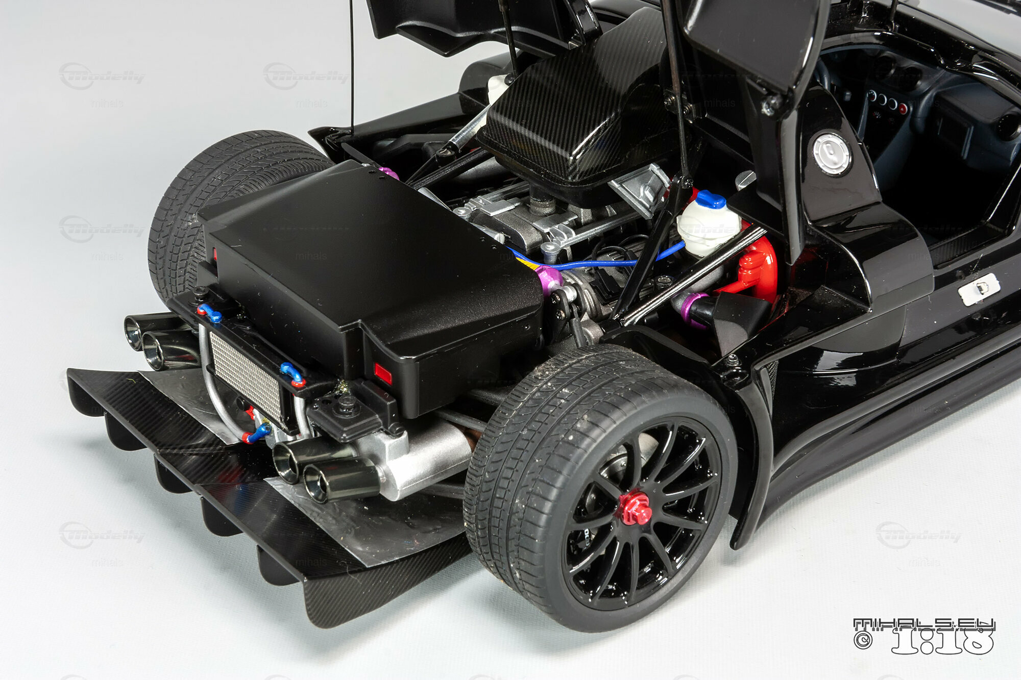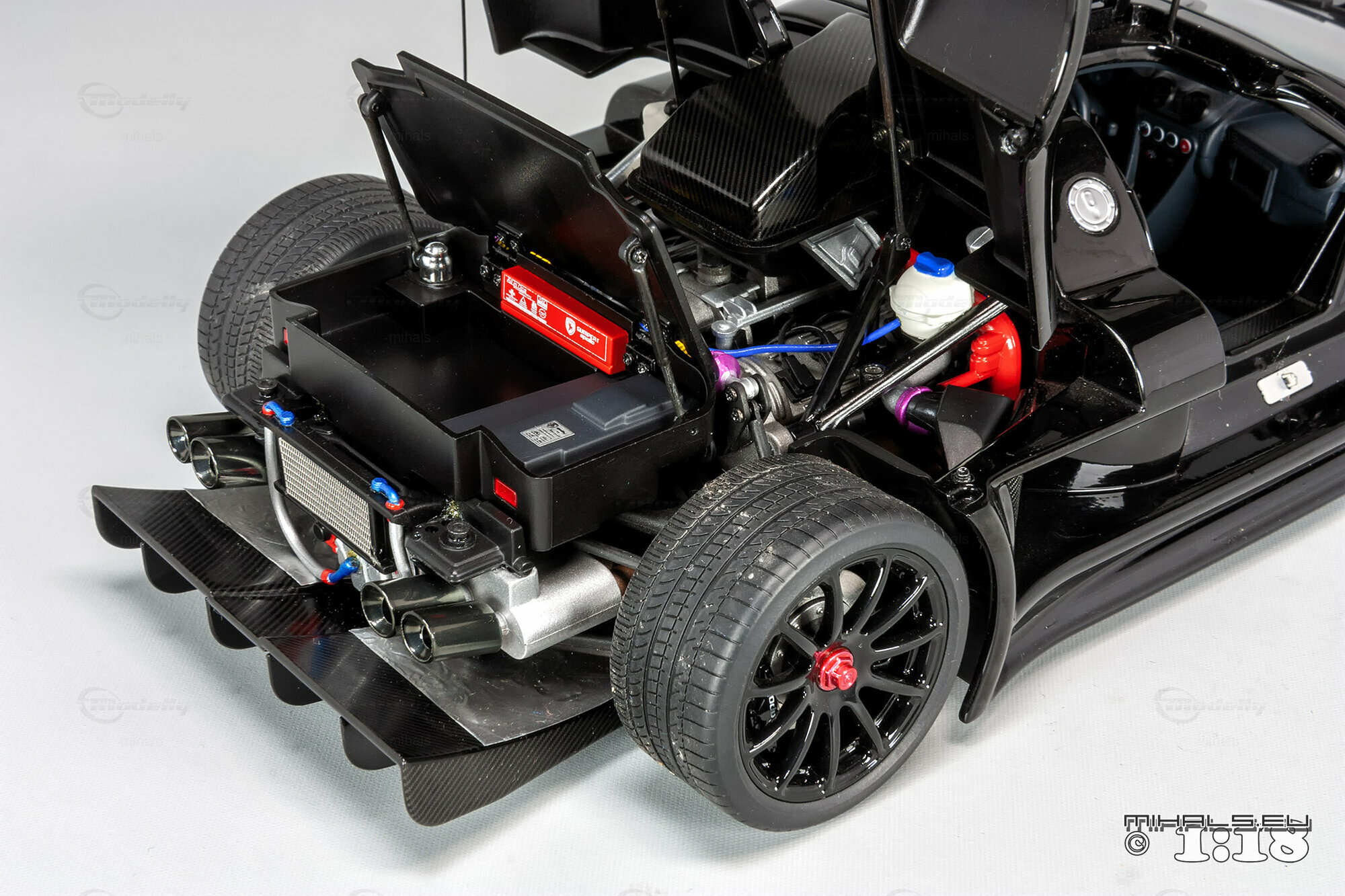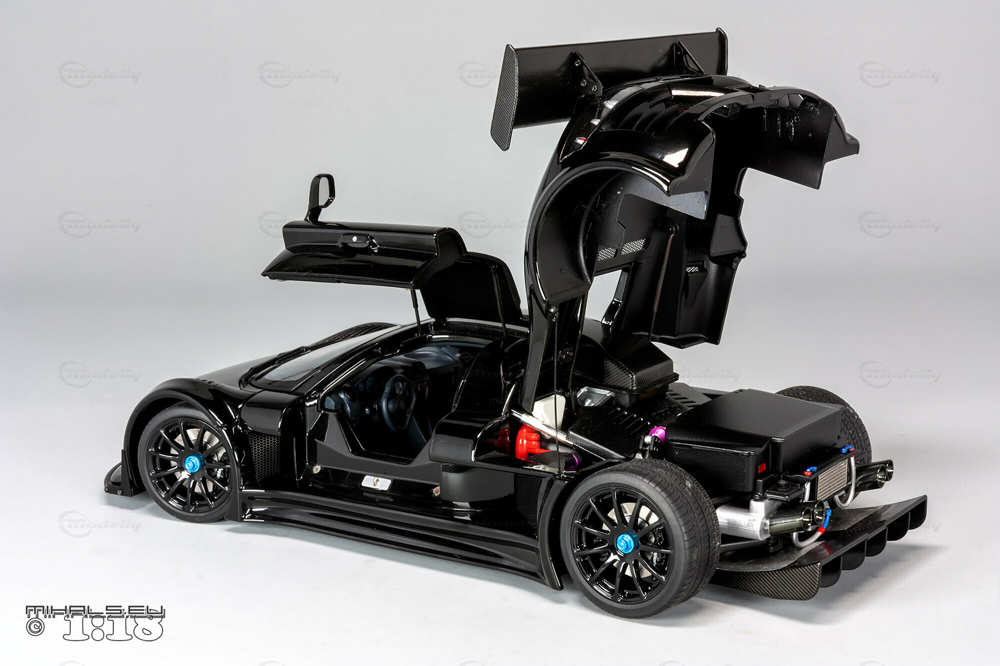 Das Modell von AUTOart Signature im Maßstab 1:18 fängt die Details und Besonderheiten des Originalfahrzeugs mit hoher Präzision ein. Neben der exakten Nachbildung der aerodynamischen Karosserie zeigt das Modell auch die charakteristischen Details wie die großen Räder und den eindrucksvollen Heckflügel. Besonders die Felgen und die Bremssättel, mit ihren blauen Akzenten, sind ein Hingucker und verleihen dem Modell eine sportliche Note. Der Innenraum des Miniaturfahrzeugs ist ebenfalls detailliert gestaltet und spiegelt das Cockpit des Originals wider. Selbst die kleinsten Details wie die Logos und Beschriftungen sind bei diesem Modell sorgfältig umgesetzt.
