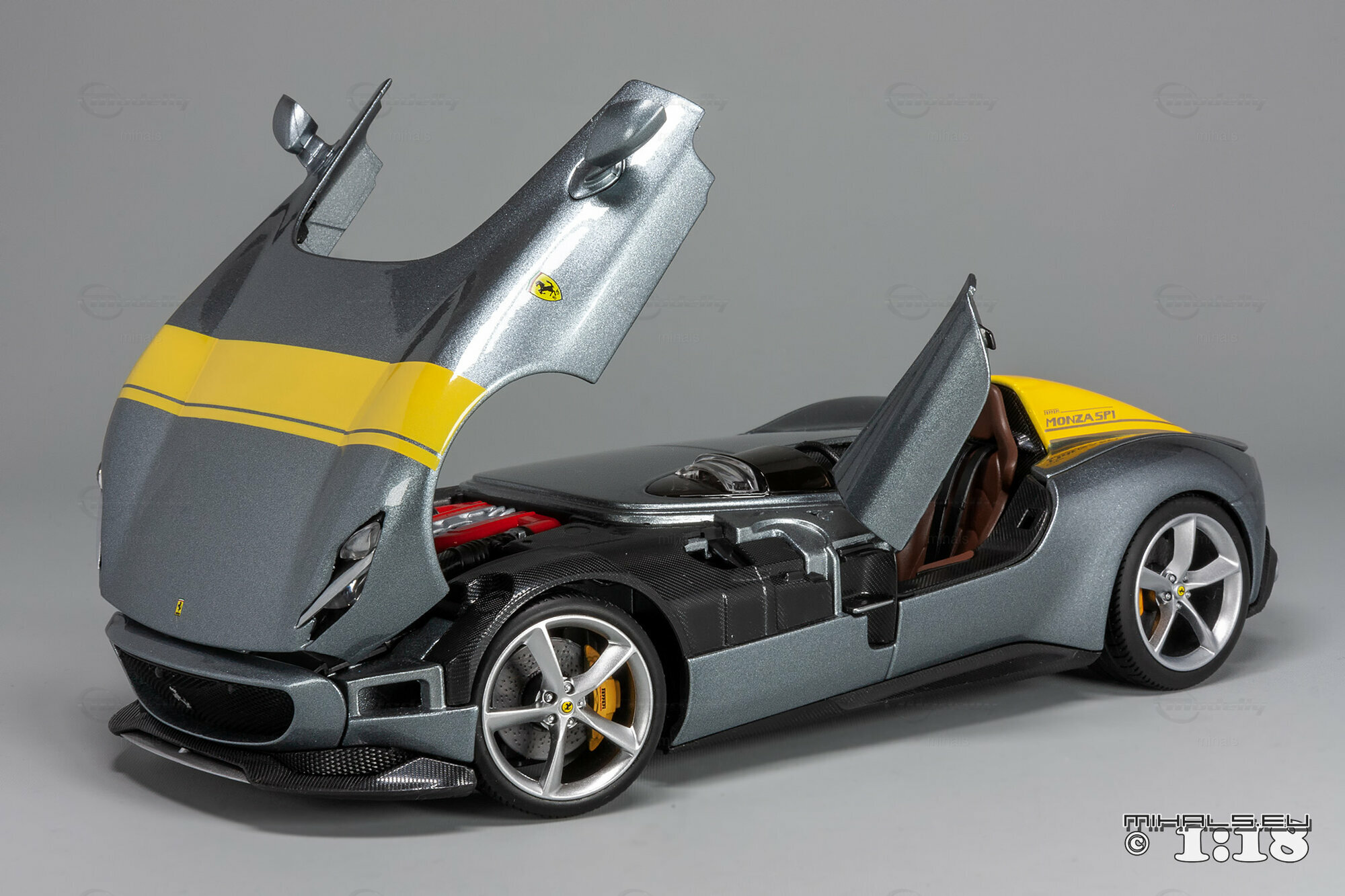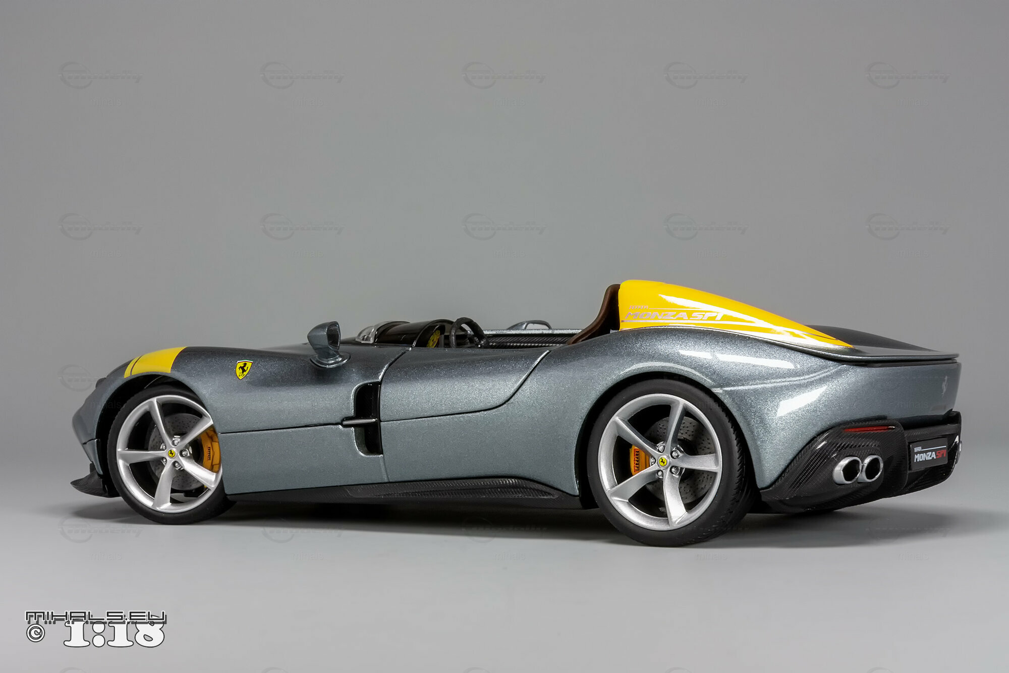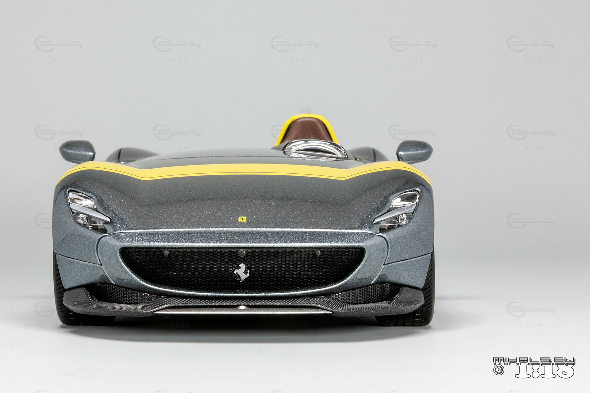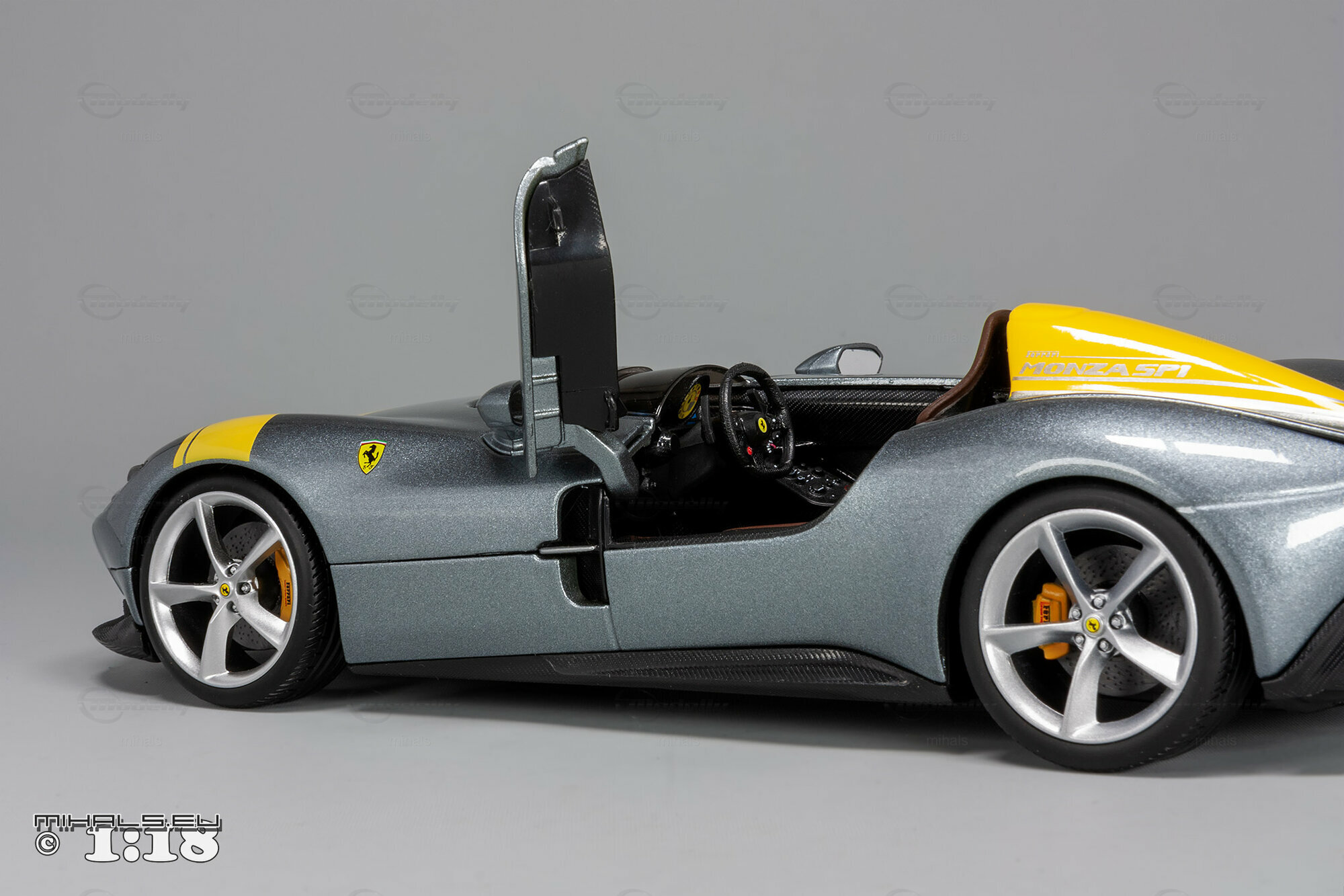 Das 1:18 maßstabsgetreue Modell des Ferrari Monza SP1 von Bburago Race Play spiegelt die Eleganz und Kraft des Originals wider, klar erkennbar in der detaillierten Ausführung aus Diecast-Material. Der Lack des Modells ist in einem strahlenden metallic-grau gestaltet und wird durch charakteristische gelbe Akzente auf dem Kotflügel und der hinteren Verkleidung ergänzt. Deutlich sichtbar ist auch das Ferrari-Emblem auf der Fahrzeugfront und den Seiten, was das Modell zu einem Blickfang in jeder Sammlung macht. Die Felgen der Miniatur sind originalgetreu gestaltet, reklamieren den ikonischen Fünfspeichen-Design-Look, der für Ferrari typisch ist. Dieses Modell gehört zur Sammlung von Modelly-Mitglied "mihals" und ist ein Muss für jeden Ferrari-Enthusiasten.