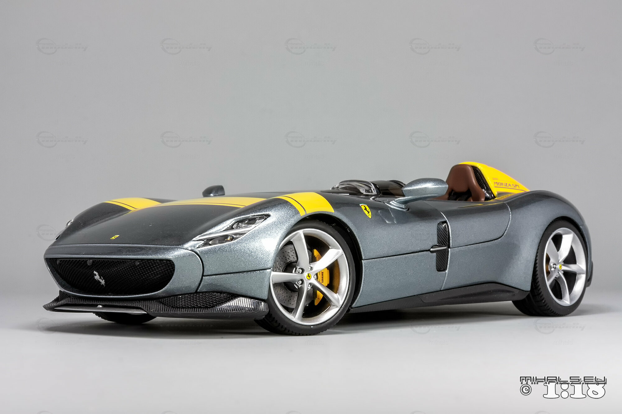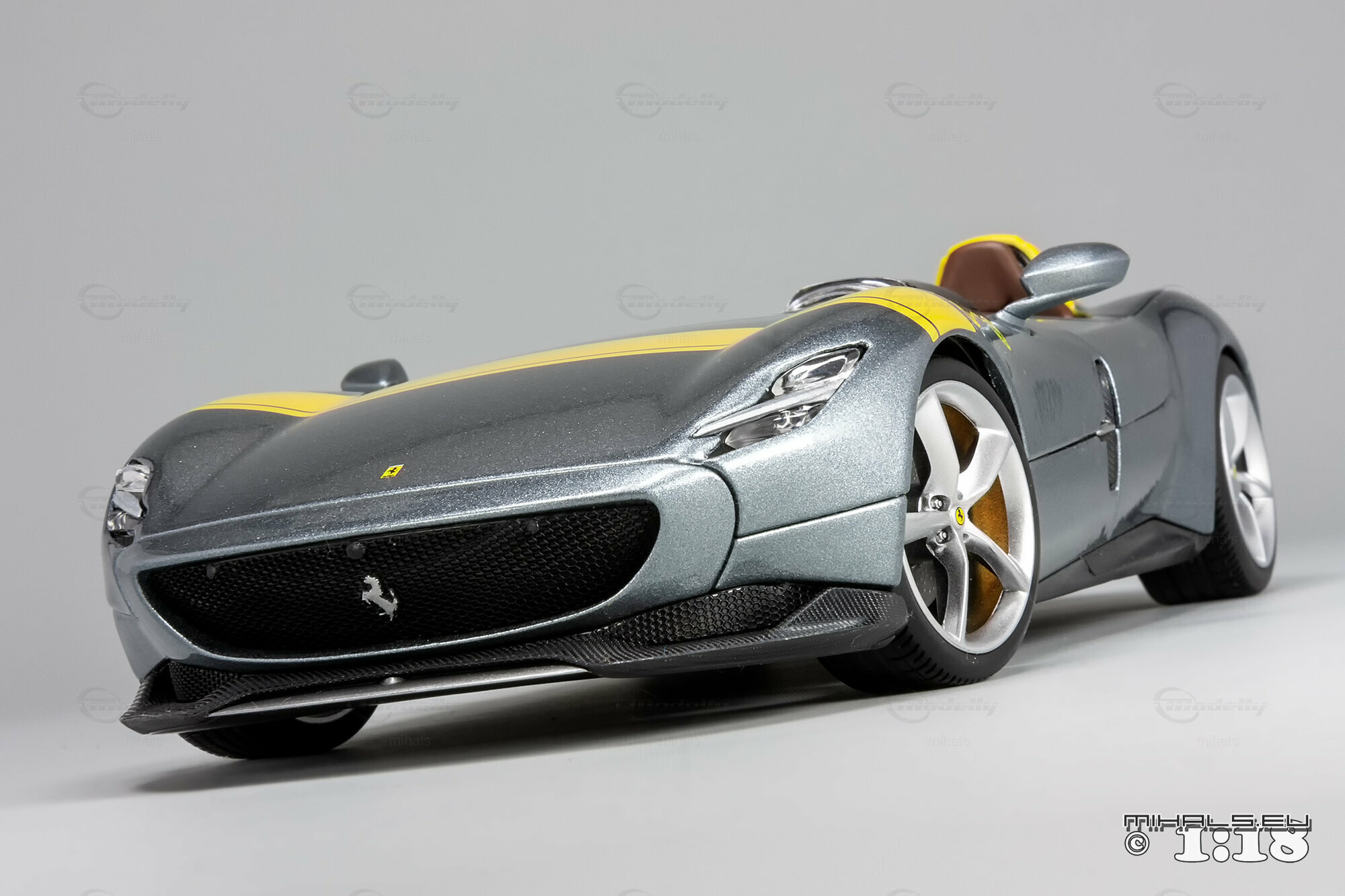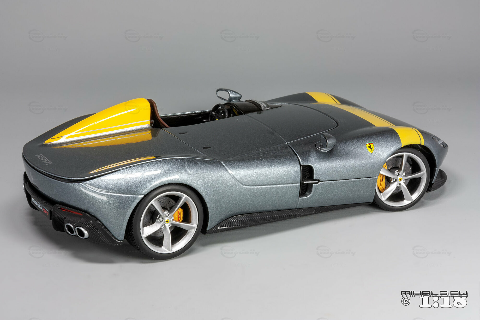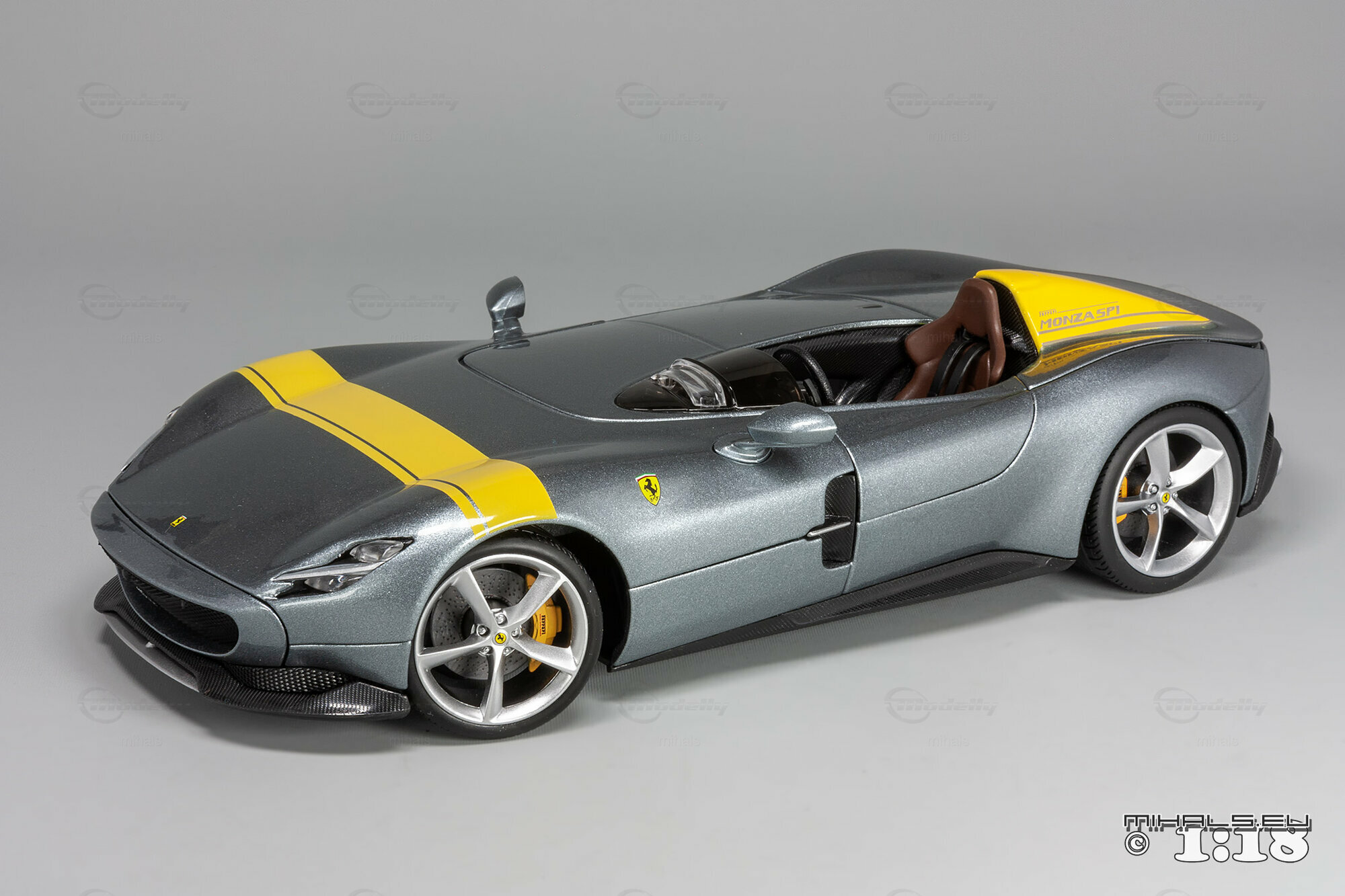 Das 1:18 maßstabsgetreue Modell des Ferrari Monza SP1 von Bburago Race Play spiegelt die Eleganz und Kraft des Originals wider, klar erkennbar in der detaillierten Ausführung aus Diecast-Material. Der Lack des Modells ist in einem strahlenden metallic-grau gestaltet und wird durch charakteristische gelbe Akzente auf dem Kotflügel und der hinteren Verkleidung ergänzt. Deutlich sichtbar ist auch das Ferrari-Emblem auf der Fahrzeugfront und den Seiten, was das Modell zu einem Blickfang in jeder Sammlung macht. Die Felgen der Miniatur sind originalgetreu gestaltet, reklamieren den ikonischen Fünfspeichen-Design-Look, der für Ferrari typisch ist. Dieses Modell gehört zur Sammlung von Modelly-Mitglied "mihals" und ist ein Muss für jeden Ferrari-Enthusiasten.