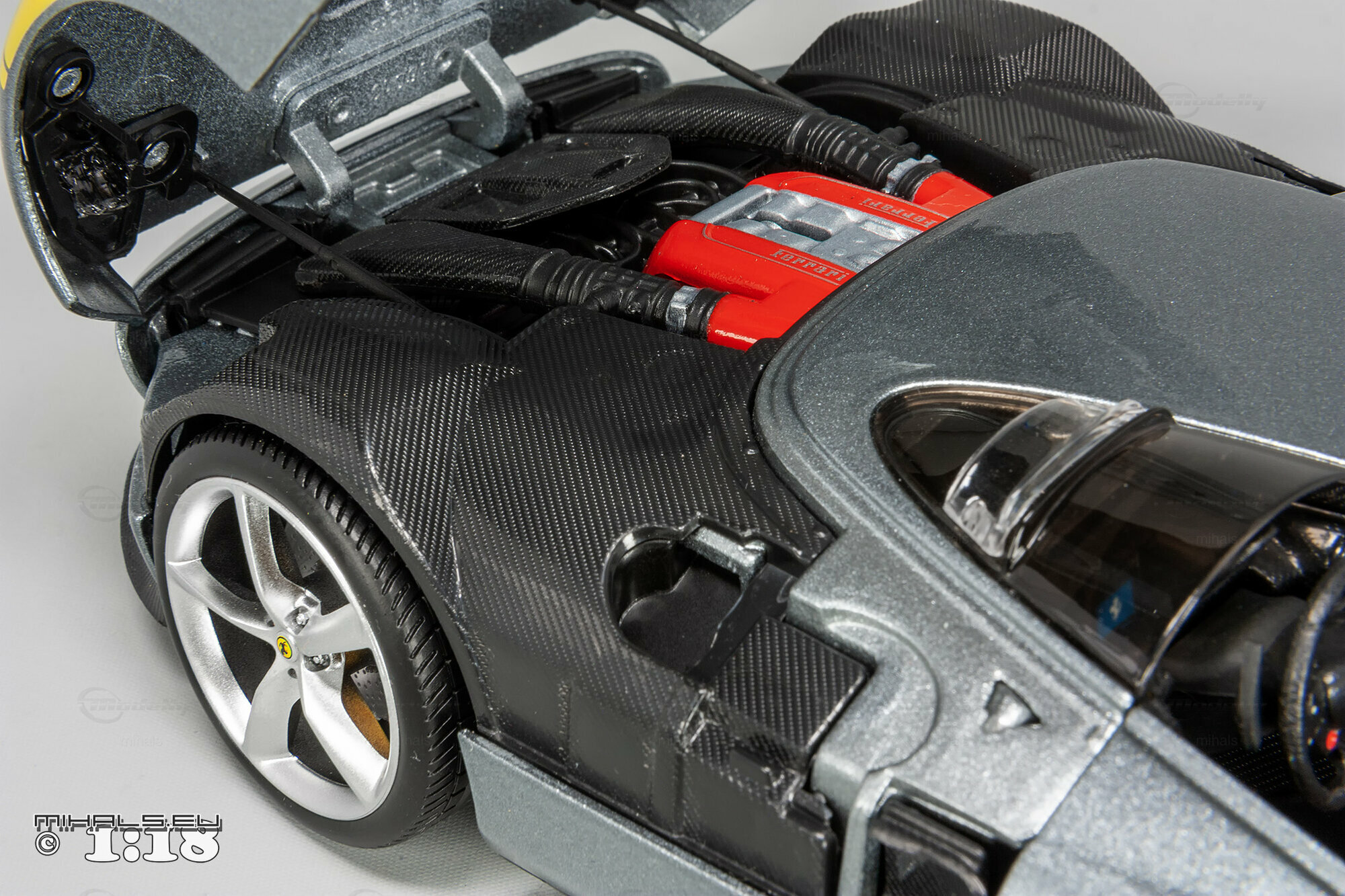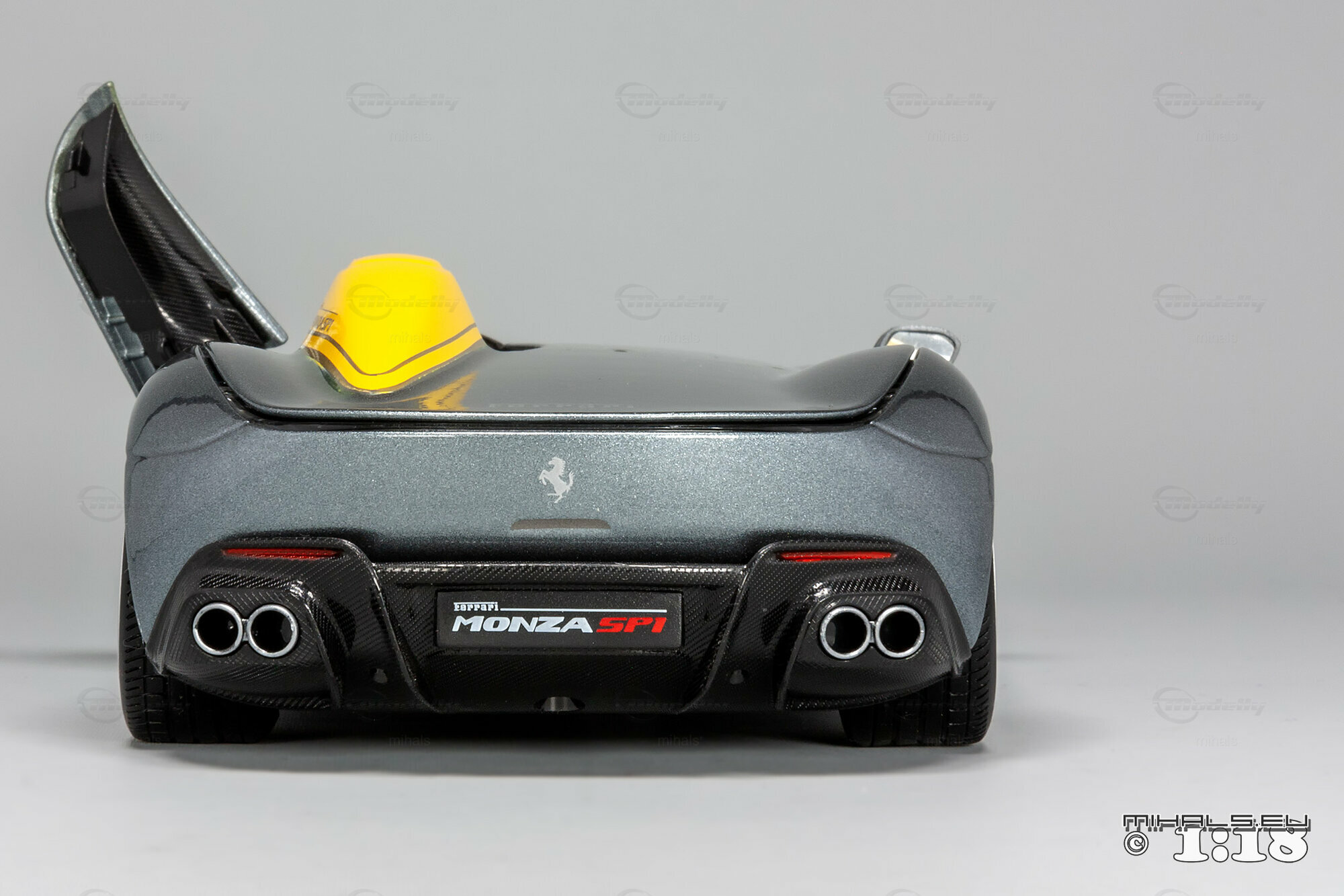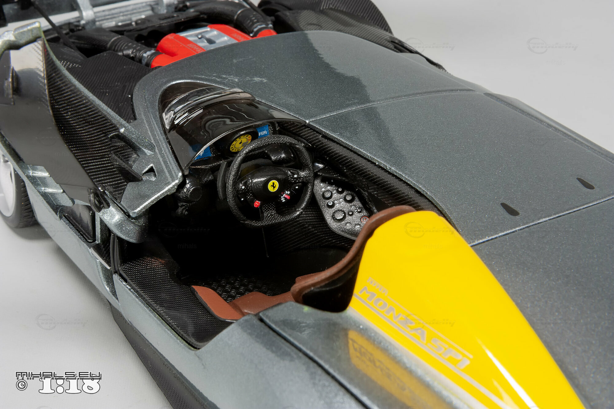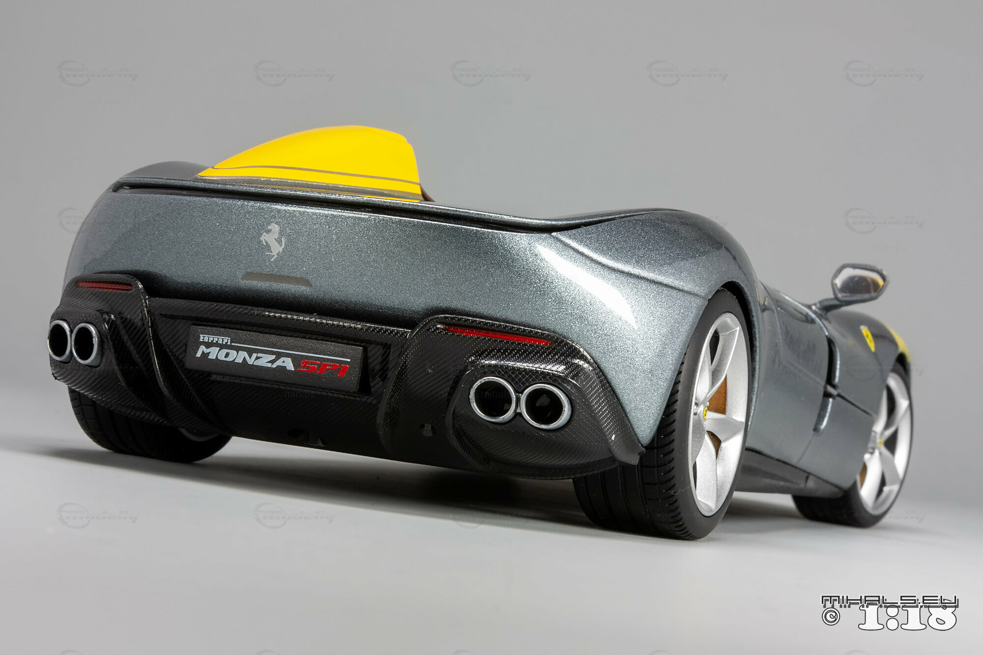 Das 1:18 maßstabsgetreue Modell des Ferrari Monza SP1 von Bburago Race Play spiegelt die Eleganz und Kraft des Originals wider, klar erkennbar in der detaillierten Ausführung aus Diecast-Material. Der Lack des Modells ist in einem strahlenden metallic-grau gestaltet und wird durch charakteristische gelbe Akzente auf dem Kotflügel und der hinteren Verkleidung ergänzt. Deutlich sichtbar ist auch das Ferrari-Emblem auf der Fahrzeugfront und den Seiten, was das Modell zu einem Blickfang in jeder Sammlung macht. Die Felgen der Miniatur sind originalgetreu gestaltet, reklamieren den ikonischen Fünfspeichen-Design-Look, der für Ferrari typisch ist. Dieses Modell gehört zur Sammlung von Modelly-Mitglied "mihals" und ist ein Muss für jeden Ferrari-Enthusiasten.