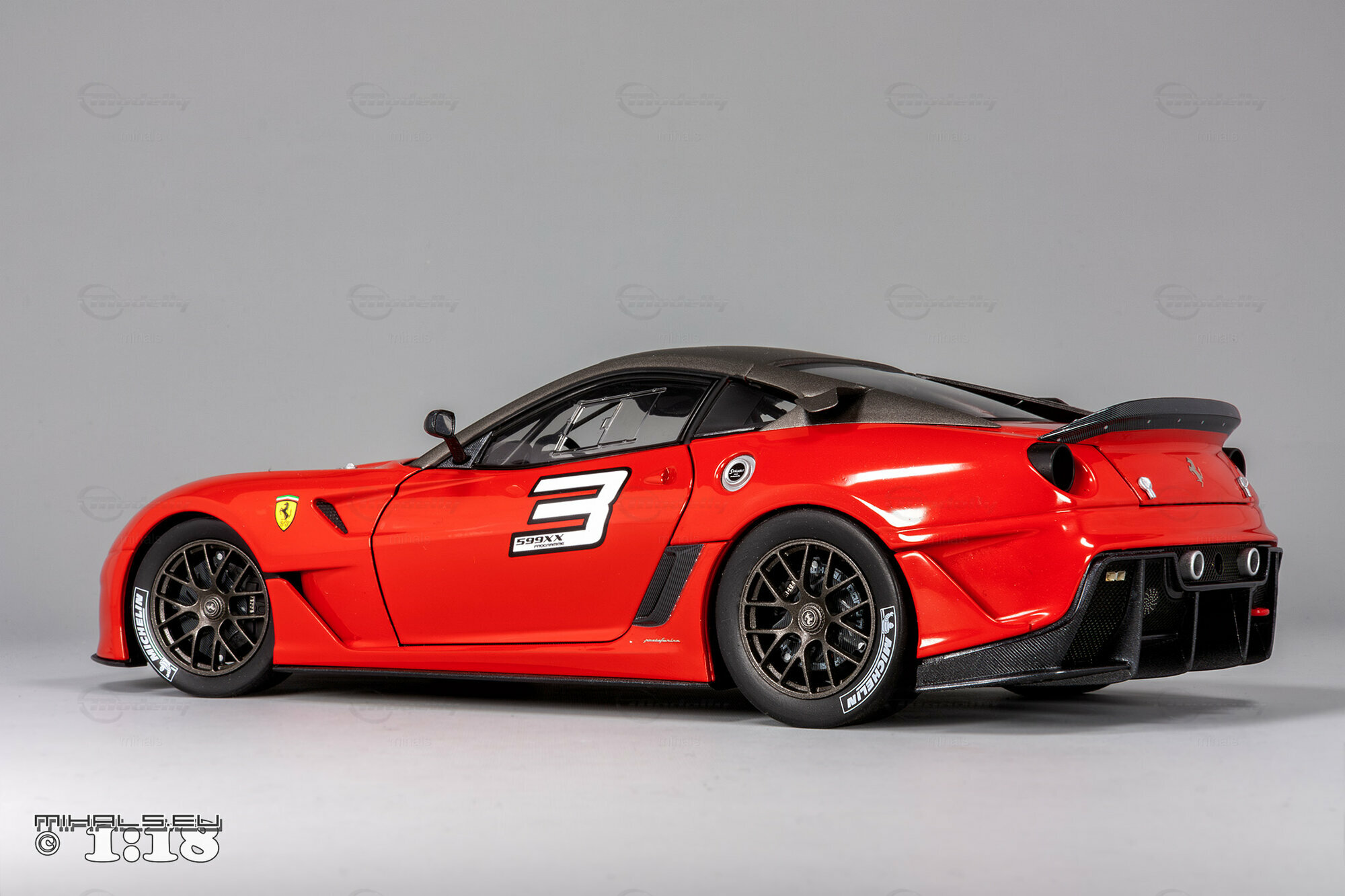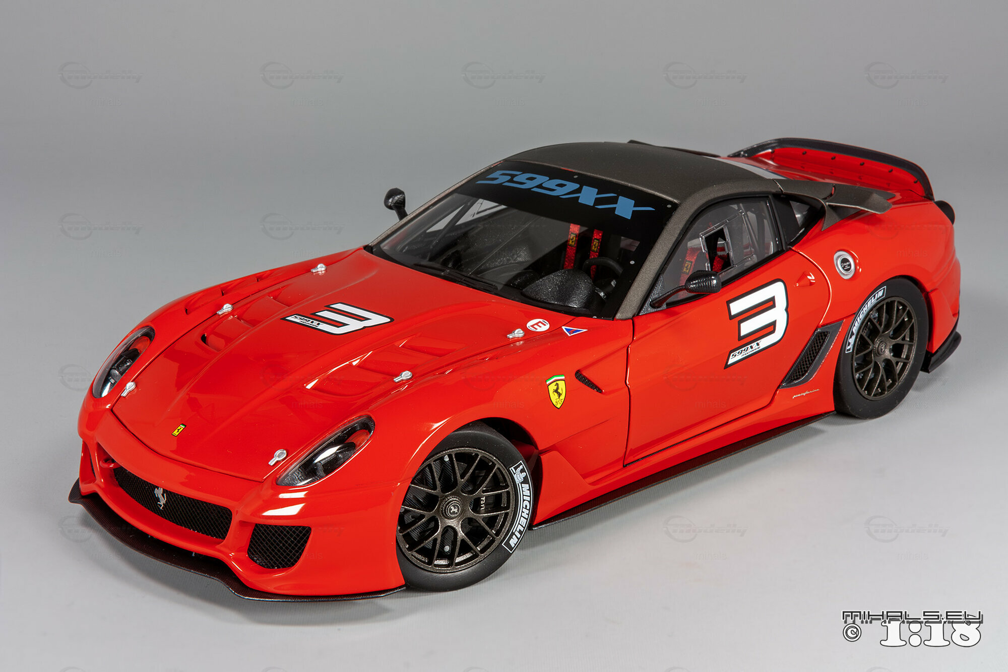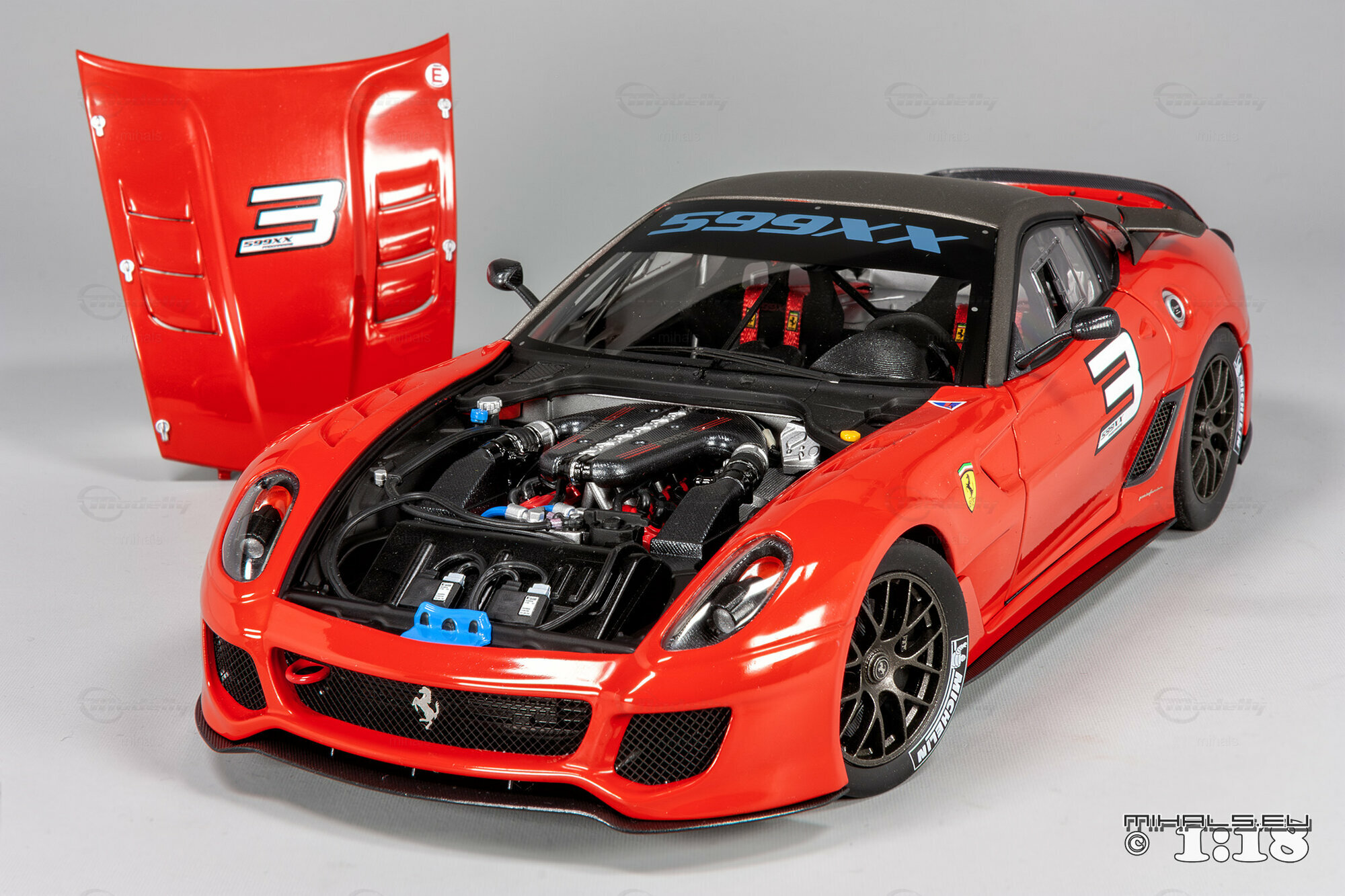 Dieses Modell im Maßstab 1:18, hergestellt von HotWheels Elite, bildet den Ferrari 599XX besonders detailgetreu nach. Die Karosserie besteht aus dem Material Die-Cast, das maßgeblich für die hohe Stabilität und Präzision des Modells verantwortlich ist. Auf den Bildern, die uns "mihals" freundlicherweise zur Verfügung gestellt hat, sticht die hochglänzende rote Lackierung ins Auge, die auf das originale "Rosso Corsa"-Farbschema von Ferrari Bezug nimmt. Die schwarzen Rennstreifen und prominente Startnummer "3" verleihen dem Modell ein sportliches Erscheinungsbild, das seinem Vorbild gerecht wird.