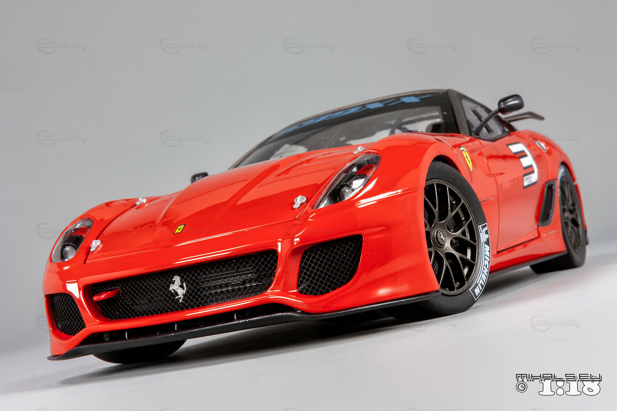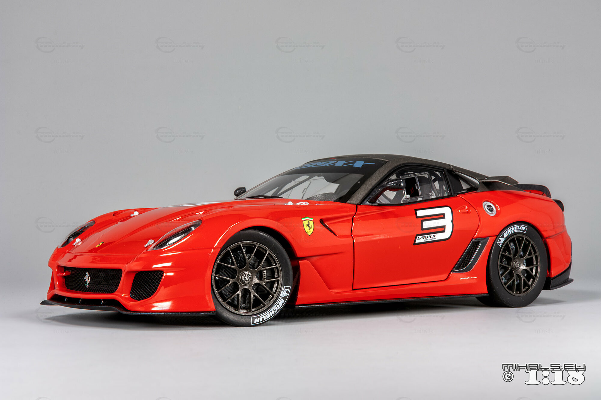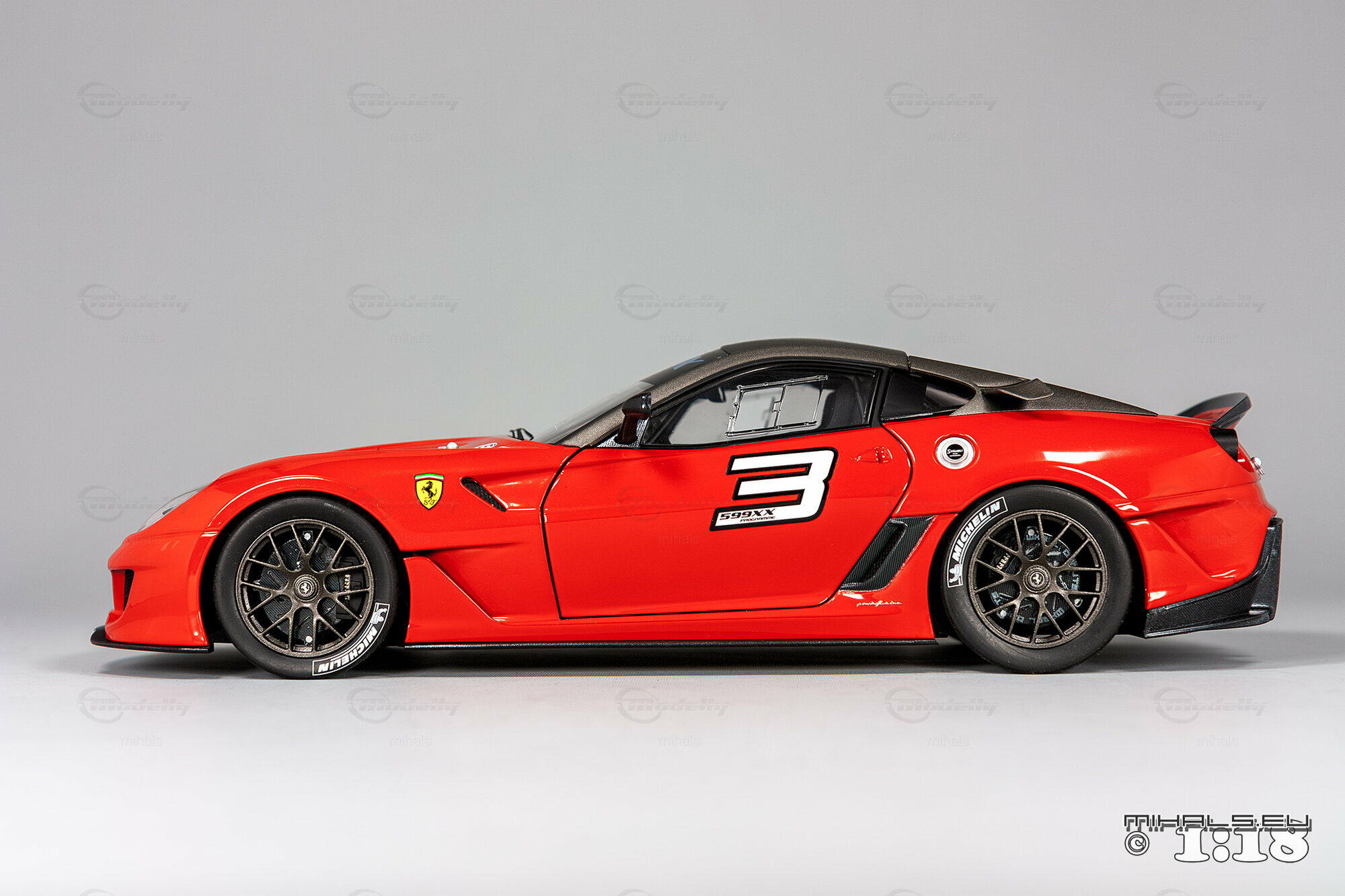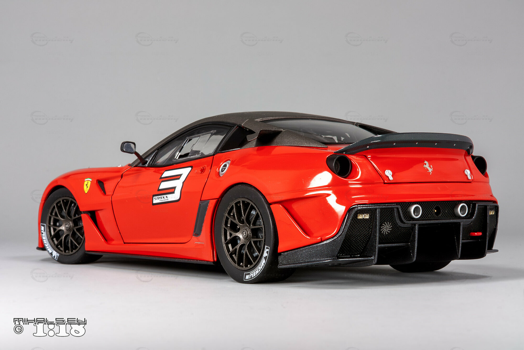 Dieses Modell im Maßstab 1:18, hergestellt von HotWheels Elite, bildet den Ferrari 599XX besonders detailgetreu nach. Die Karosserie besteht aus dem Material Die-Cast, das maßgeblich für die hohe Stabilität und Präzision des Modells verantwortlich ist. Auf den Bildern, die uns "mihals" freundlicherweise zur Verfügung gestellt hat, sticht die hochglänzende rote Lackierung ins Auge, die auf das originale "Rosso Corsa"-Farbschema von Ferrari Bezug nimmt. Die schwarzen Rennstreifen und prominente Startnummer "3" verleihen dem Modell ein sportliches Erscheinungsbild, das seinem Vorbild gerecht wird.