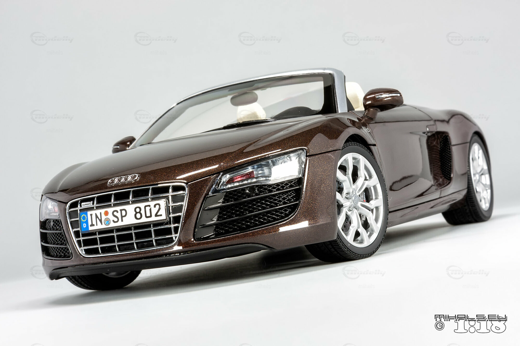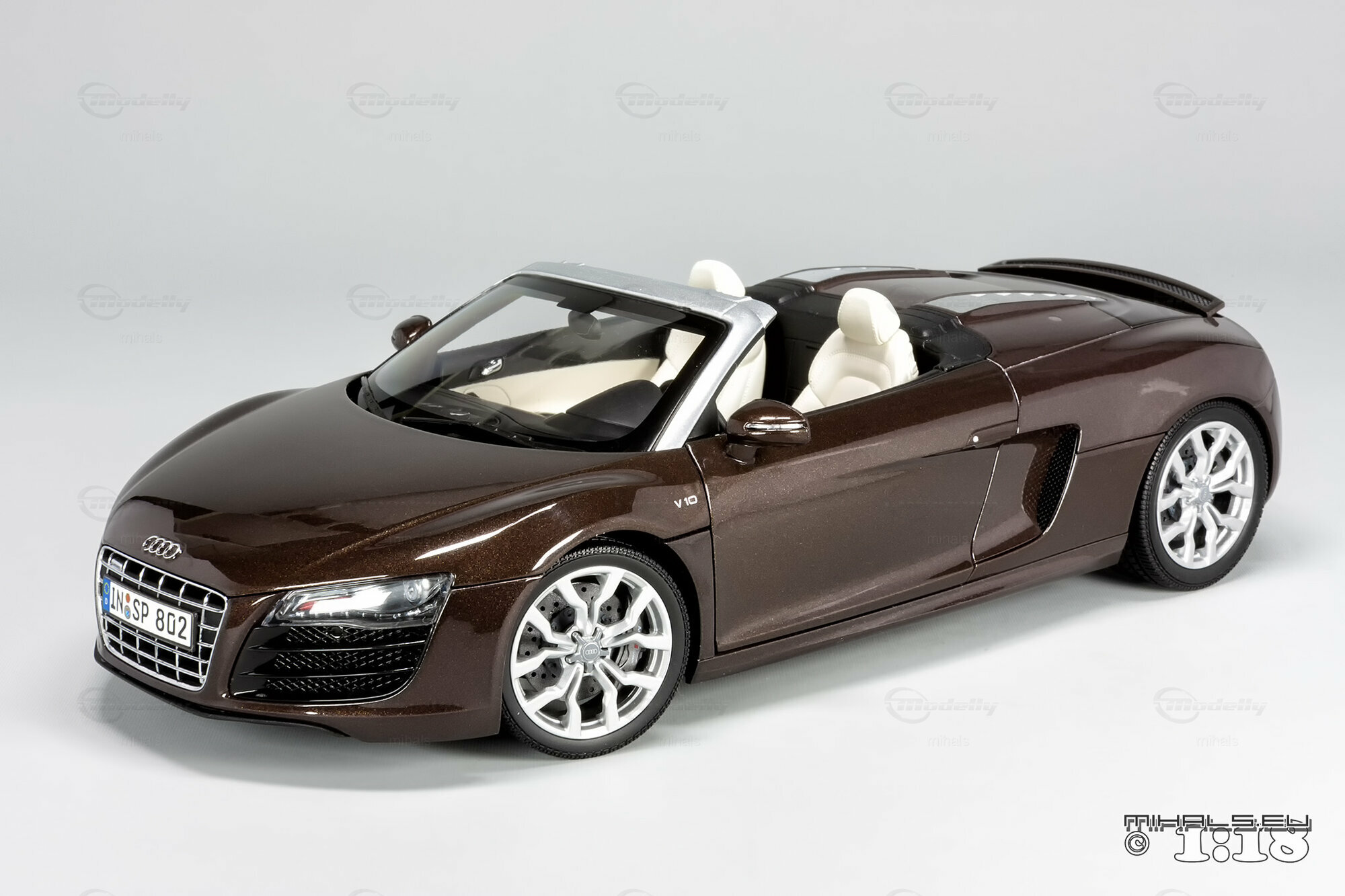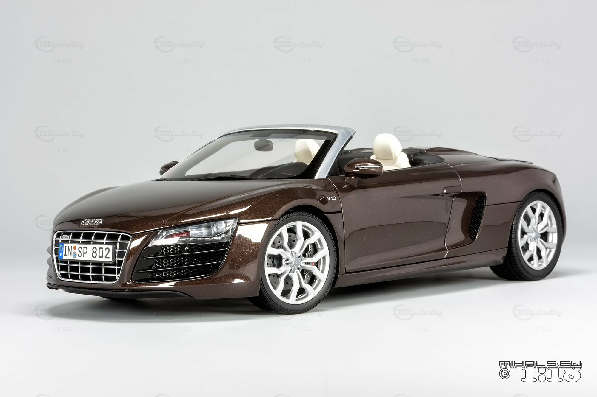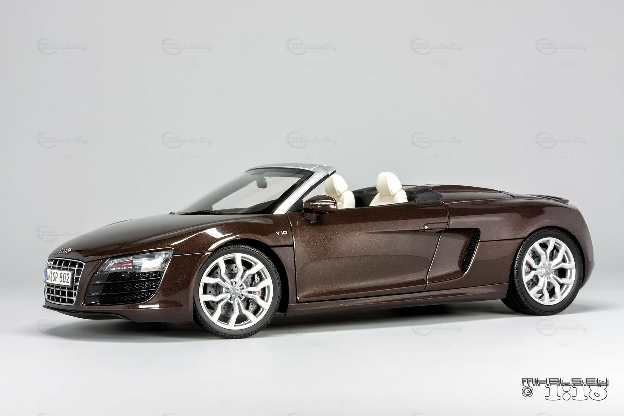 Das hier gezeigte Modellauto im Maßstab 1:18 ist ein bemaßstabgetreues Miniaturmodell des Audi R8 V10 Spyder, gefertigt von Kyosho Audi Collection, bekannt für seine qualitativen und detaillierten Replikate. Dieses Modell ist komplett aus Diecast-Material gefertigt und spiegelt die markanten Designelemente des Originals wider. Von der metallischen Lackierung in einer speziellen Braunton bis hin zu den originalgetreuen Felgen – jedes Detail wurde akkurat reproduziert. Die detailgetreuen Scheinwerfer, die einen realistischen LED-Effekt simulieren, und die präzise nachgebildeten Bremsscheiben und -sättel verdeutlichen die hohe Qualität des Modellautos. Zur weiteren Veredelung kann das Modell auch rote Bremssättel haben. Selbst das Interieur beeindruckt mit fein nachgebildeten Sportsitzen, Armaturenbrett und Lenkrad in der passenden Farbe. Dieses Modell ist zweifellos ein Highlight für jeden Sammler von Modellautos.