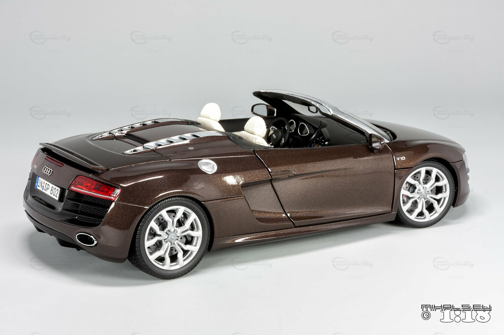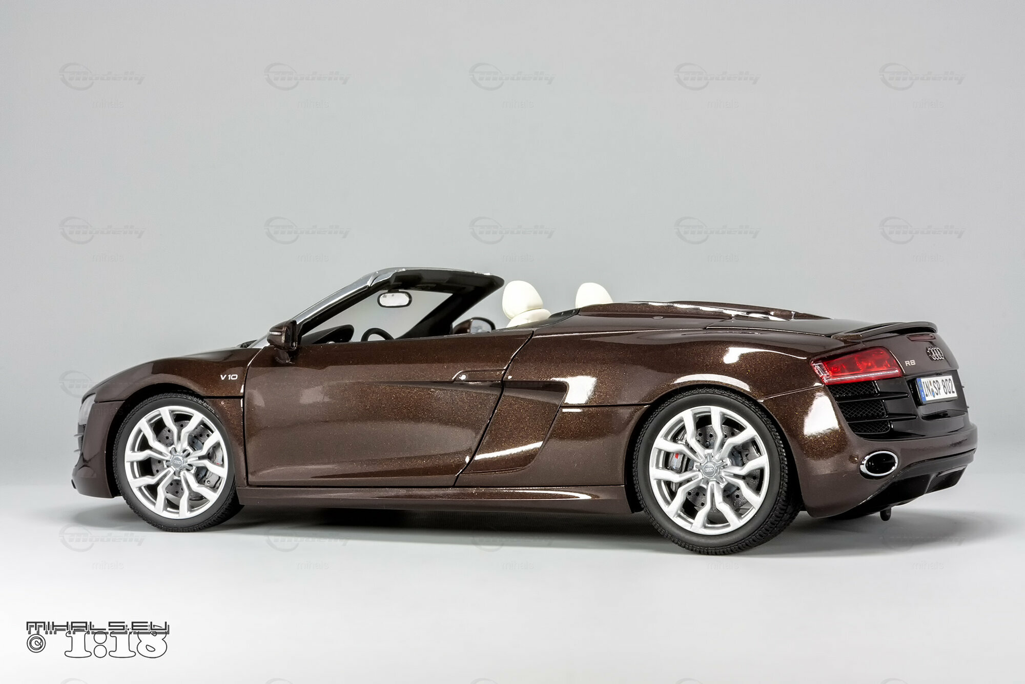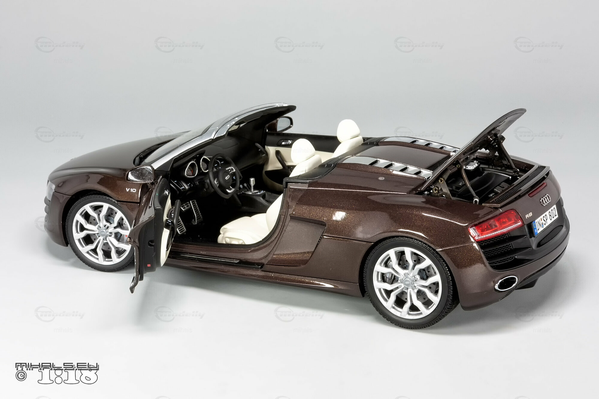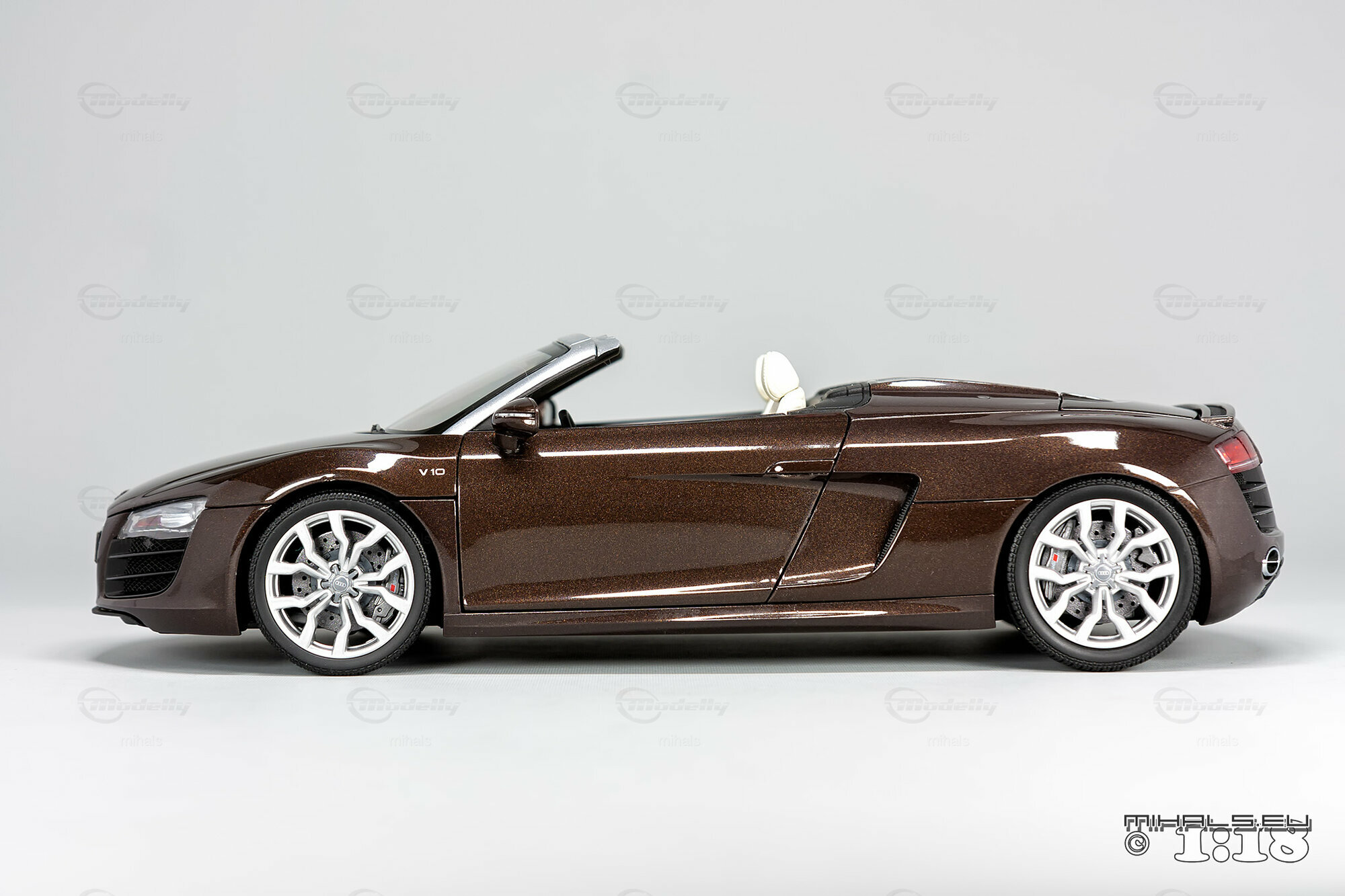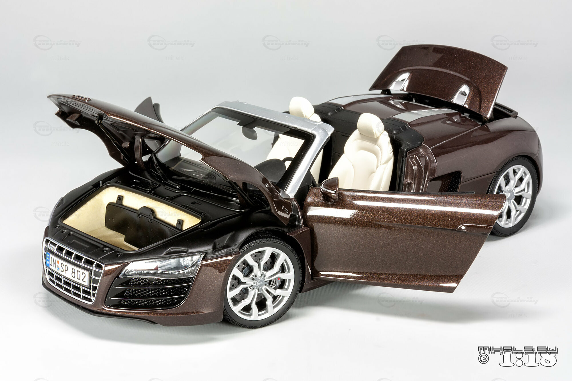 Das hier gezeigte Modellauto im Maßstab 1:18 ist ein bemaßstabgetreues Miniaturmodell des Audi R8 V10 Spyder, gefertigt von Kyosho Audi Collection, bekannt für seine qualitativen und detaillierten Replikate. Dieses Modell ist komplett aus Diecast-Material gefertigt und spiegelt die markanten Designelemente des Originals wider. Von der metallischen Lackierung in einer speziellen Braunton bis hin zu den originalgetreuen Felgen – jedes Detail wurde akkurat reproduziert. Die detailgetreuen Scheinwerfer, die einen realistischen LED-Effekt simulieren, und die präzise nachgebildeten Bremsscheiben und -sättel verdeutlichen die hohe Qualität des Modellautos. Zur weiteren Veredelung kann das Modell auch rote Bremssättel haben. Selbst das Interieur beeindruckt mit fein nachgebildeten Sportsitzen, Armaturenbrett und Lenkrad in der passenden Farbe. Dieses Modell ist zweifellos ein Highlight für jeden Sammler von Modellautos.