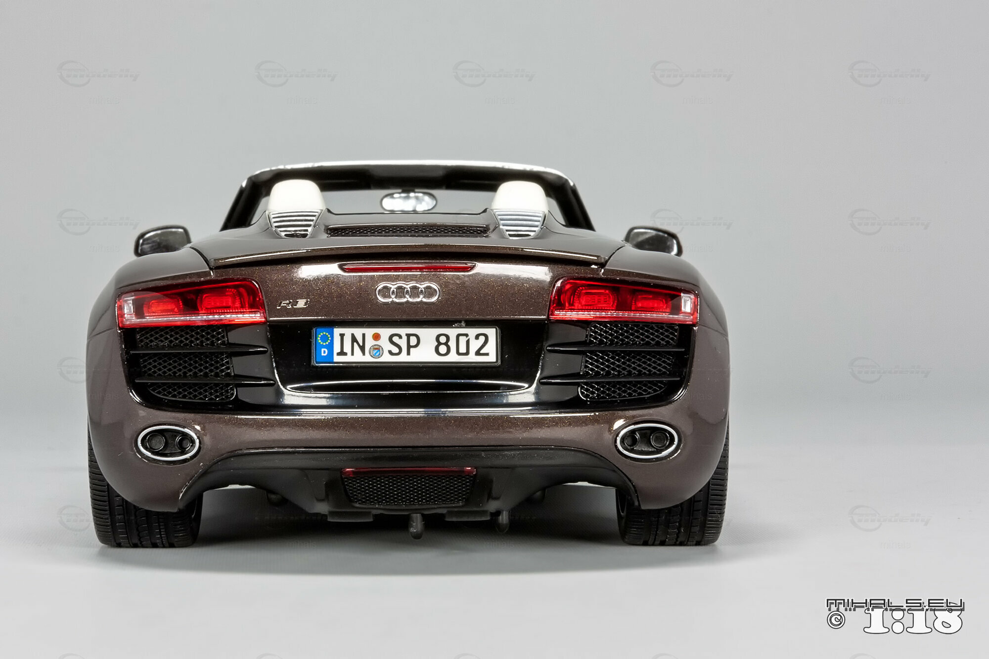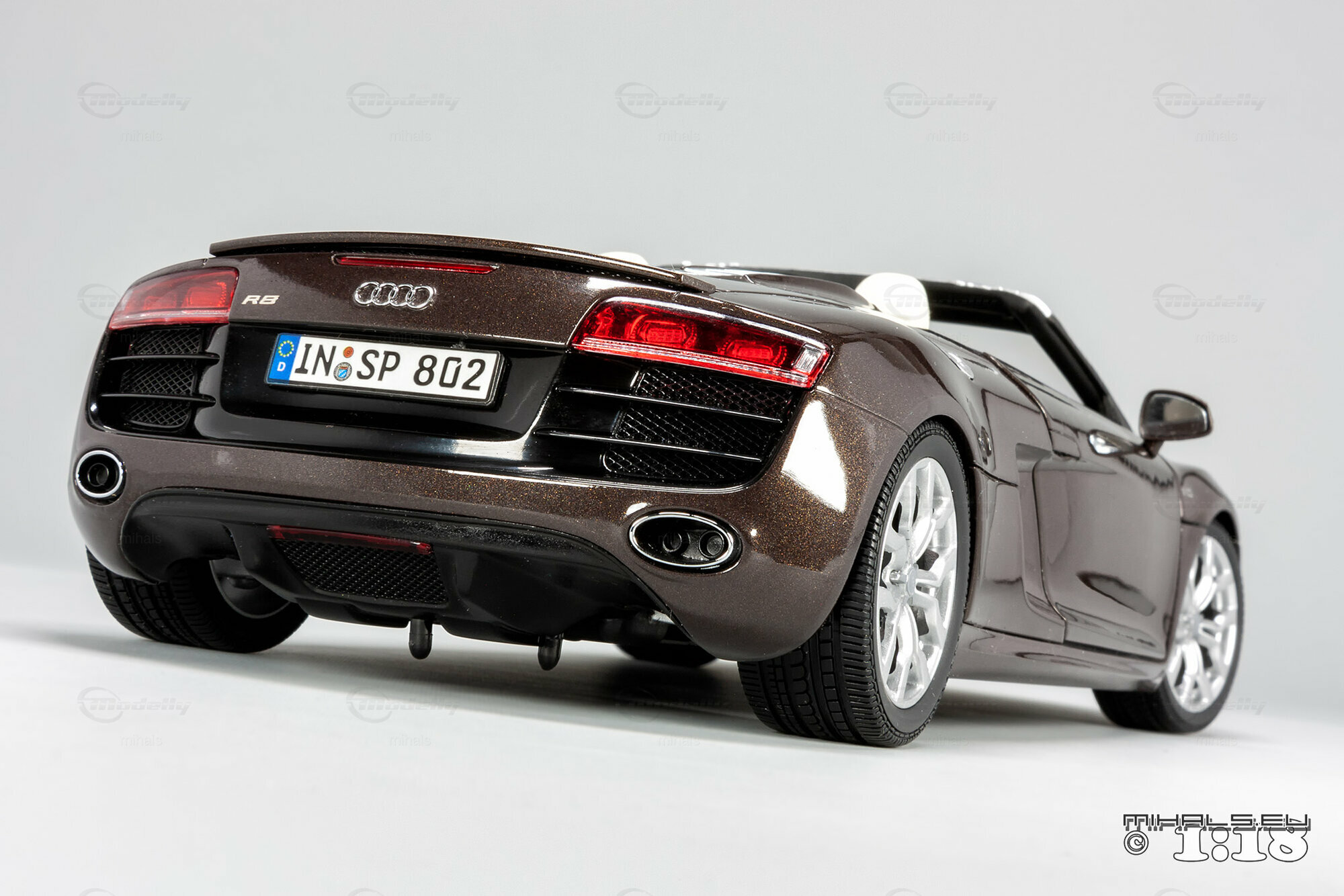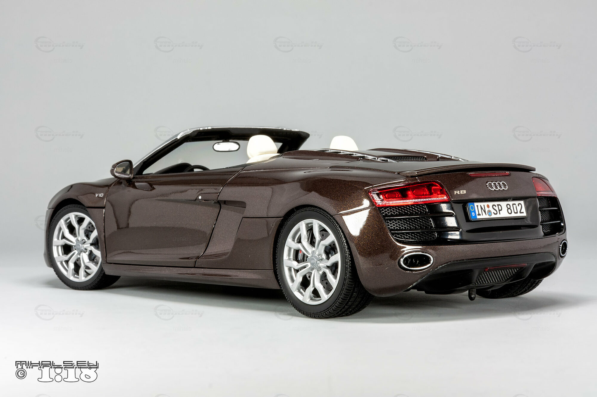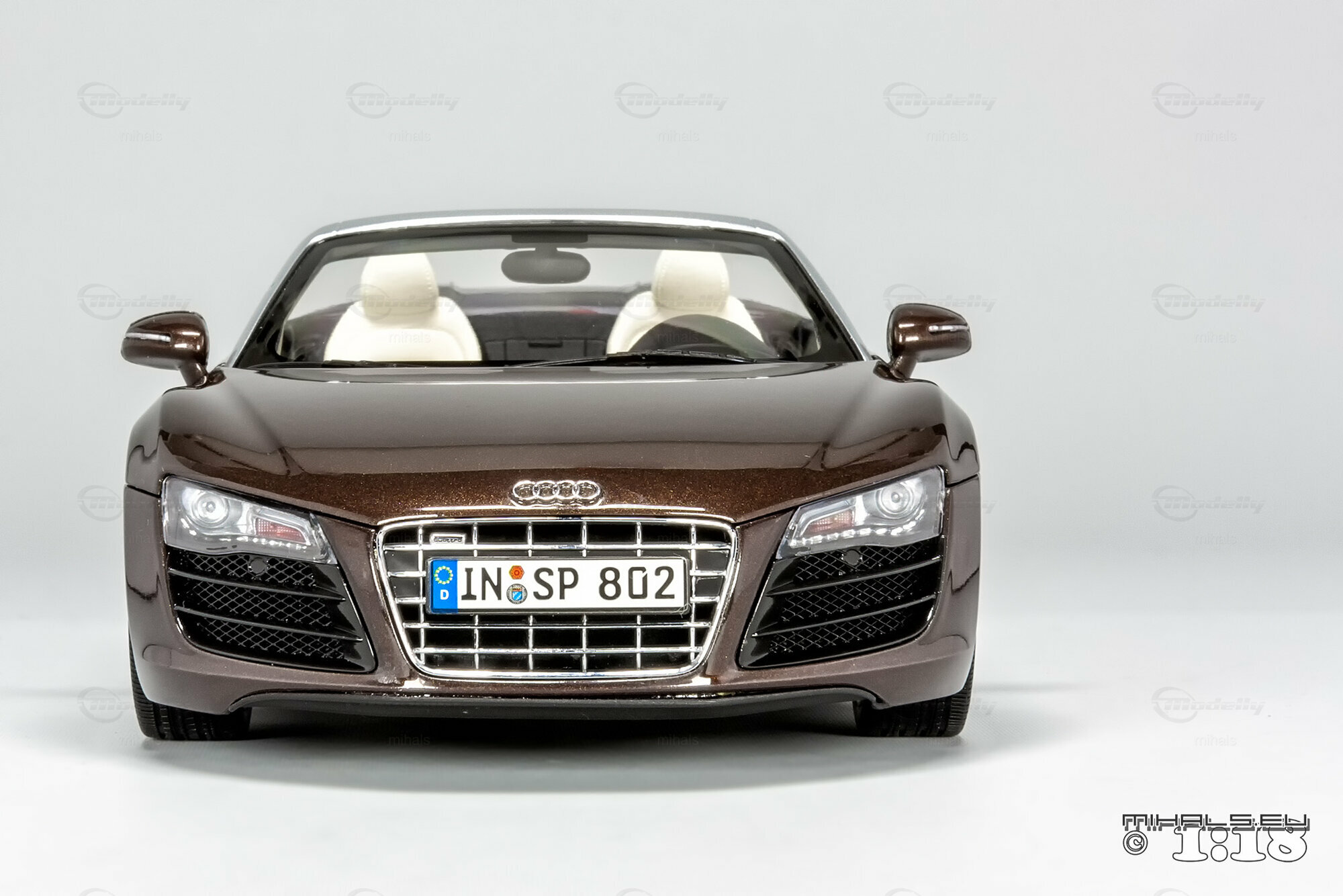 Das hier gezeigte Modellauto im Maßstab 1:18 ist ein bemaßstabgetreues Miniaturmodell des Audi R8 V10 Spyder, gefertigt von Kyosho Audi Collection, bekannt für seine qualitativen und detaillierten Replikate. Dieses Modell ist komplett aus Diecast-Material gefertigt und spiegelt die markanten Designelemente des Originals wider. Von der metallischen Lackierung in einer speziellen Braunton bis hin zu den originalgetreuen Felgen – jedes Detail wurde akkurat reproduziert. Die detailgetreuen Scheinwerfer, die einen realistischen LED-Effekt simulieren, und die präzise nachgebildeten Bremsscheiben und -sättel verdeutlichen die hohe Qualität des Modellautos. Zur weiteren Veredelung kann das Modell auch rote Bremssättel haben. Selbst das Interieur beeindruckt mit fein nachgebildeten Sportsitzen, Armaturenbrett und Lenkrad in der passenden Farbe. Dieses Modell ist zweifellos ein Highlight für jeden Sammler von Modellautos.