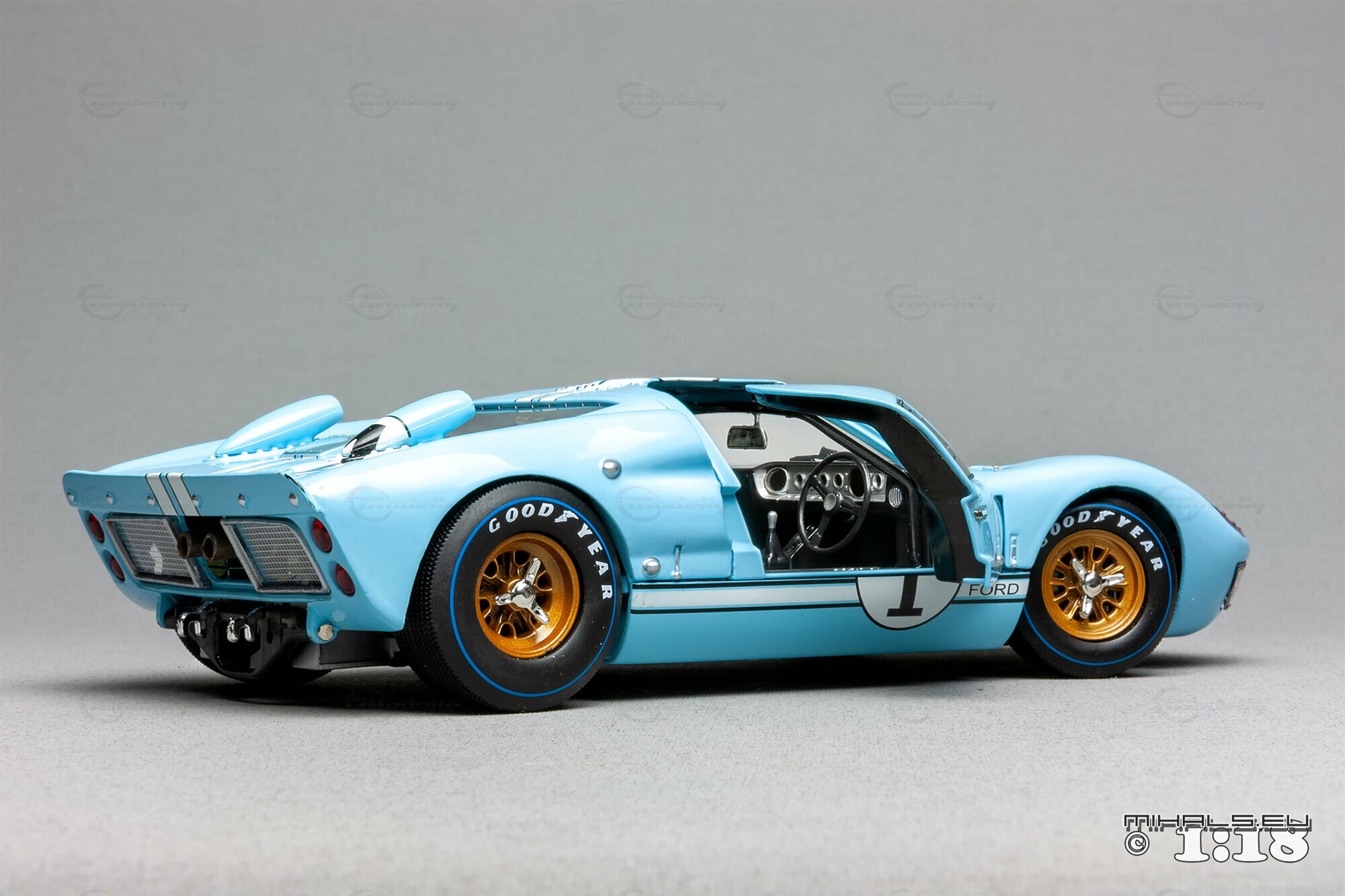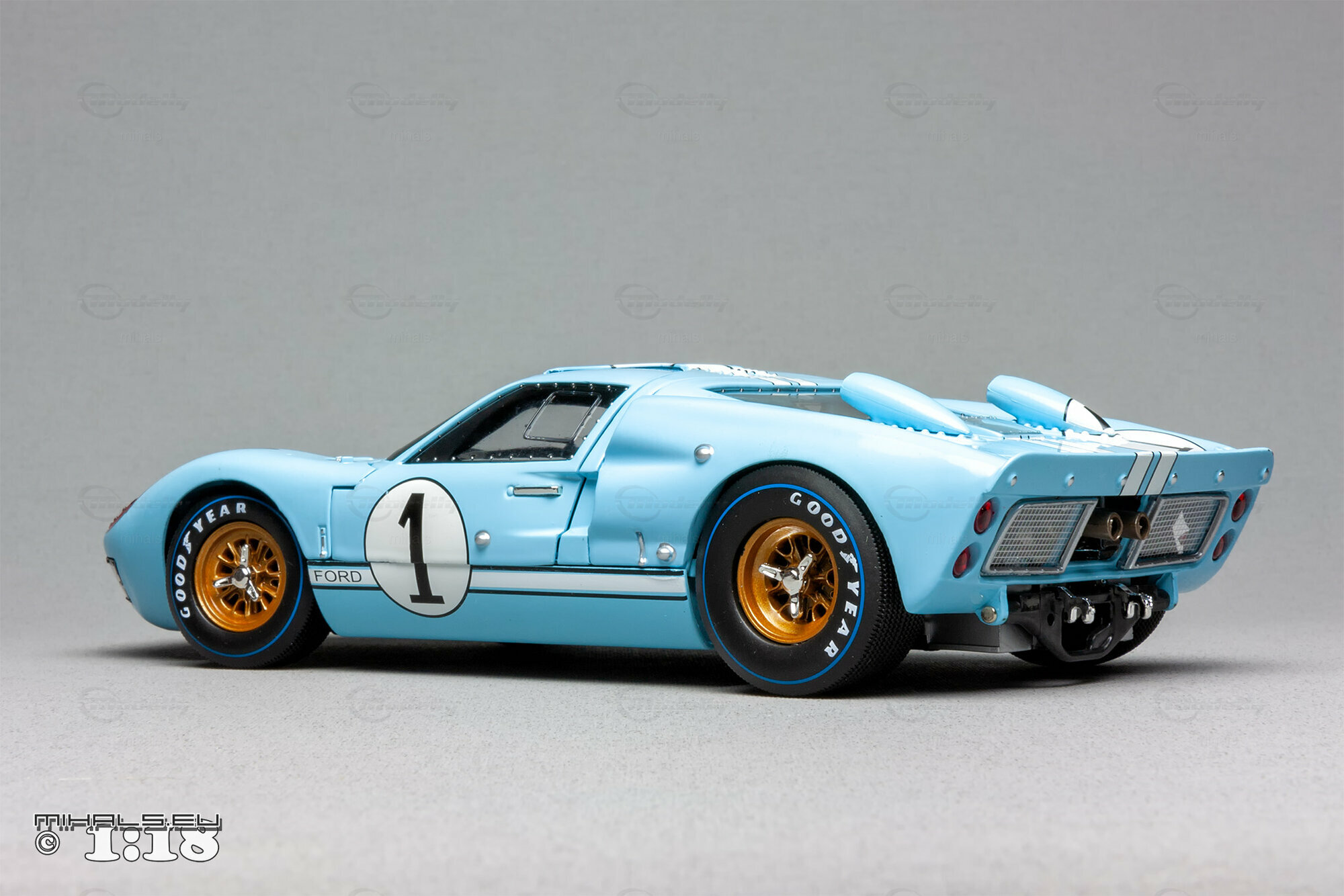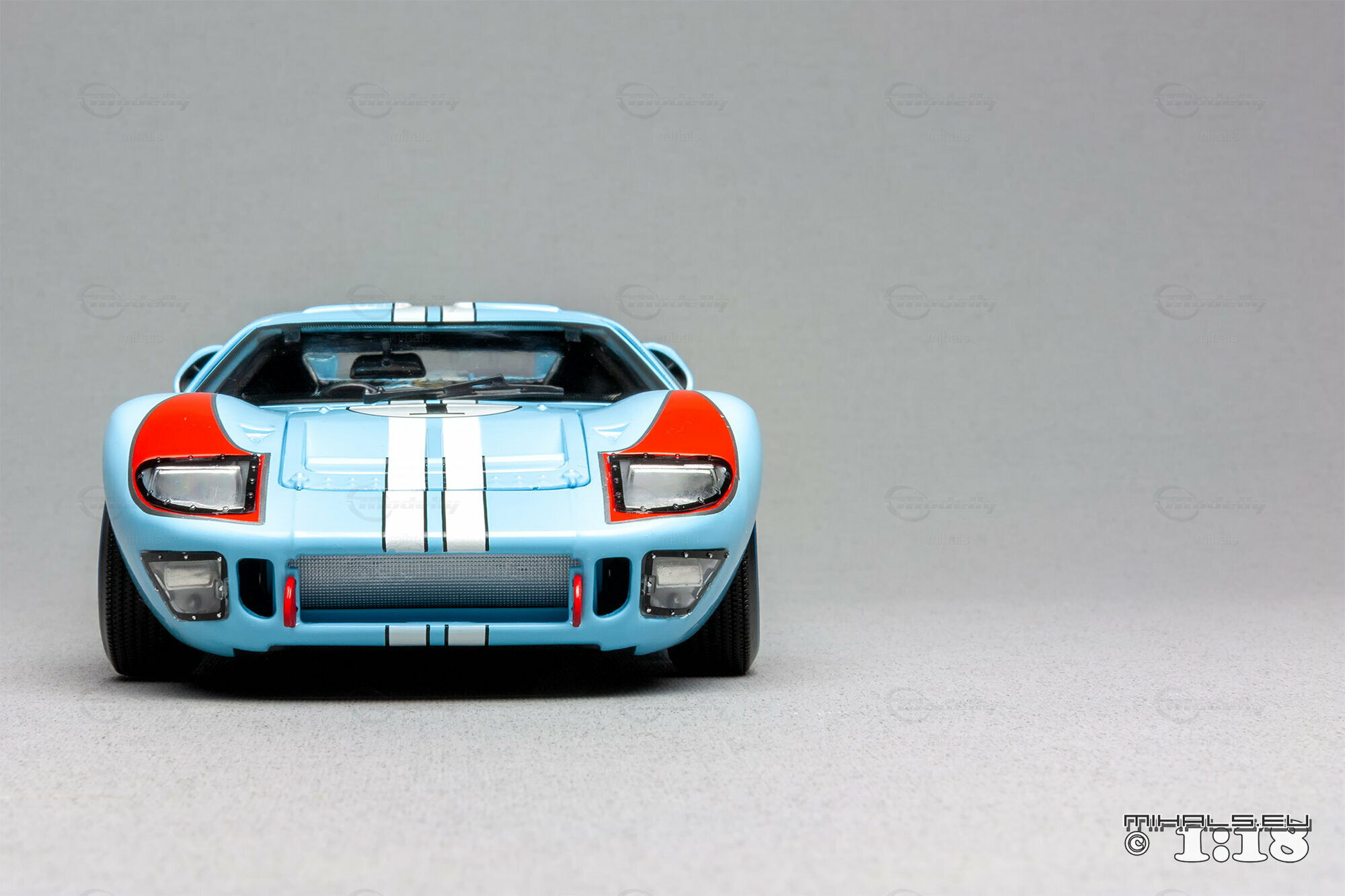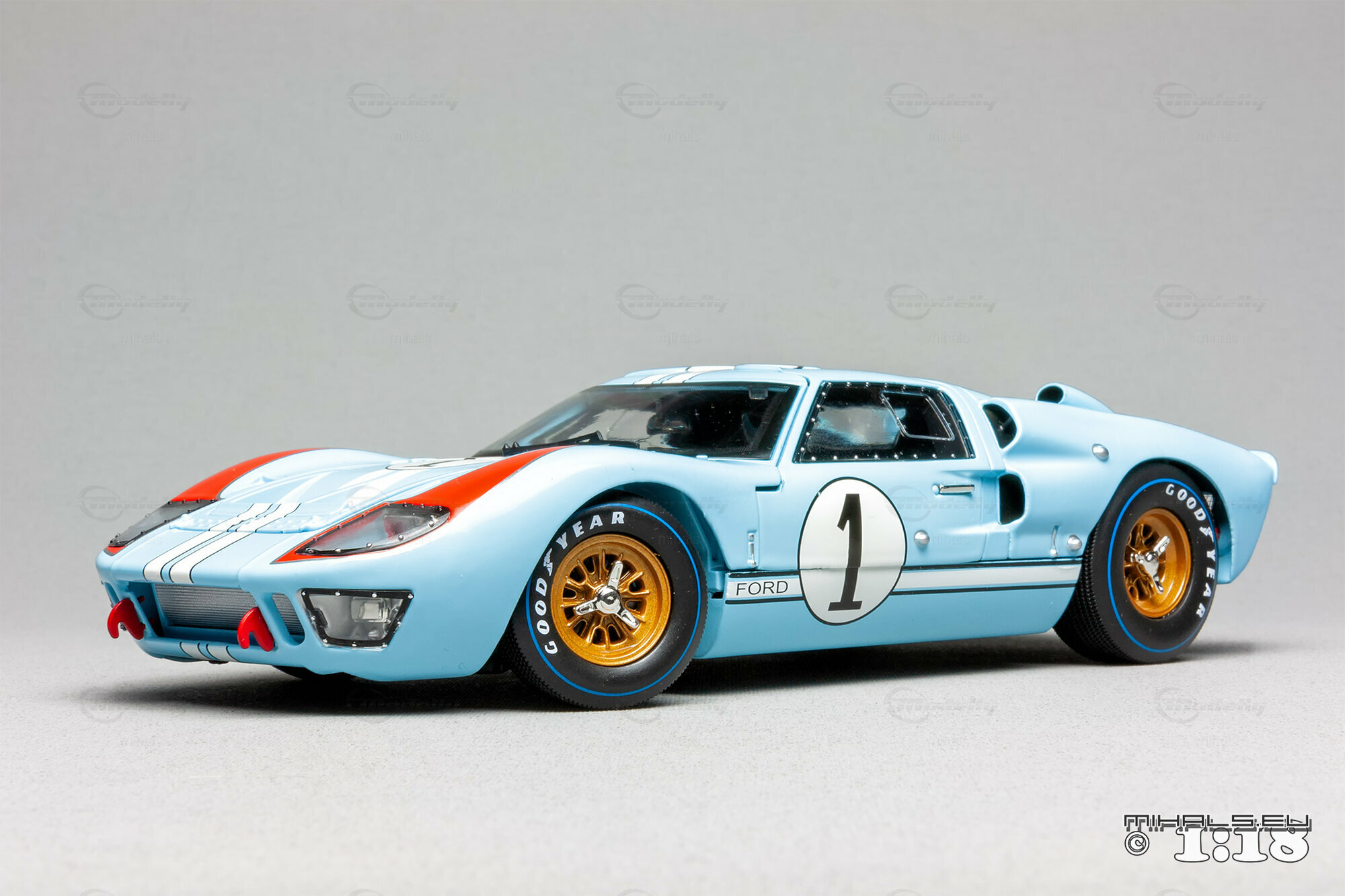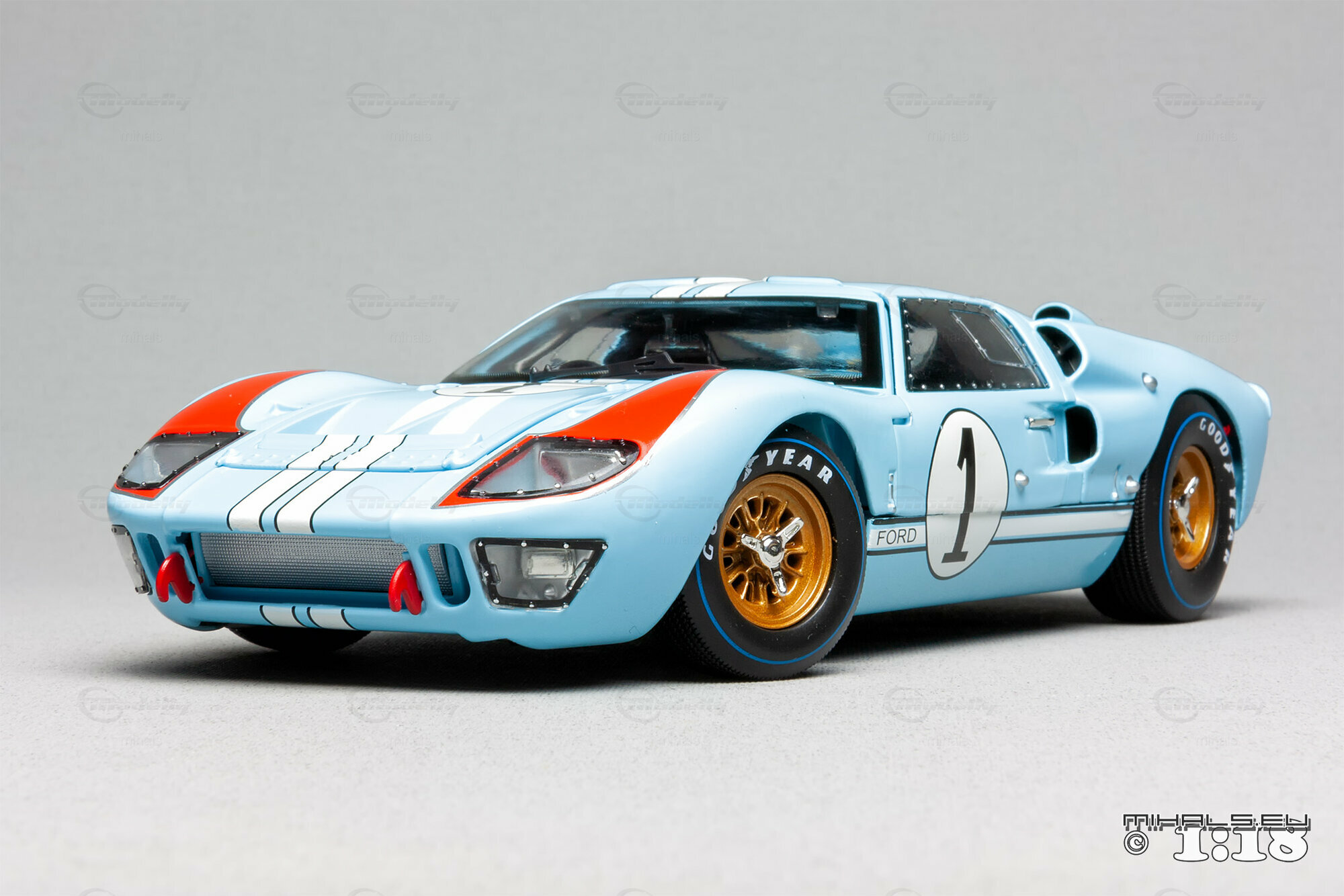 Das Miniatur-Modell des Ford GT40 MK II im 1:18-Maßstab besticht durch seine detailgetreue Nachbildung und hochwertige Verarbeitung. Hergestellt von Shelby Collectibles und basierend auf dem Material Diecast, repräsentiert es die präzisen Designmerkmale des Originalfahrzeugs. Das Modell zeigt die charakteristische hellblaue Lackierung mit orangenen Akzenten an den Scheinwerfern und dem Dach, so wie die im Motorsport häufig verwendeten Lackierungen. Es trägt zudem die Nummer „1“ auf den Türen und der Front, sowie Aufkleber berühmter Sponsoren wie Goodyear. Die goldenen Felgen und die realistischen Reifen mit Goodyear-Logo fügen zusätzliche Authentizität und Detailtreue hinzu. Das Modell ist Teil der Sammlung des Modelly-Mitglieds "mihals" und verweist durch sorgfältige Verarbeitung und präzise Details auf das ikonische Originalauto.