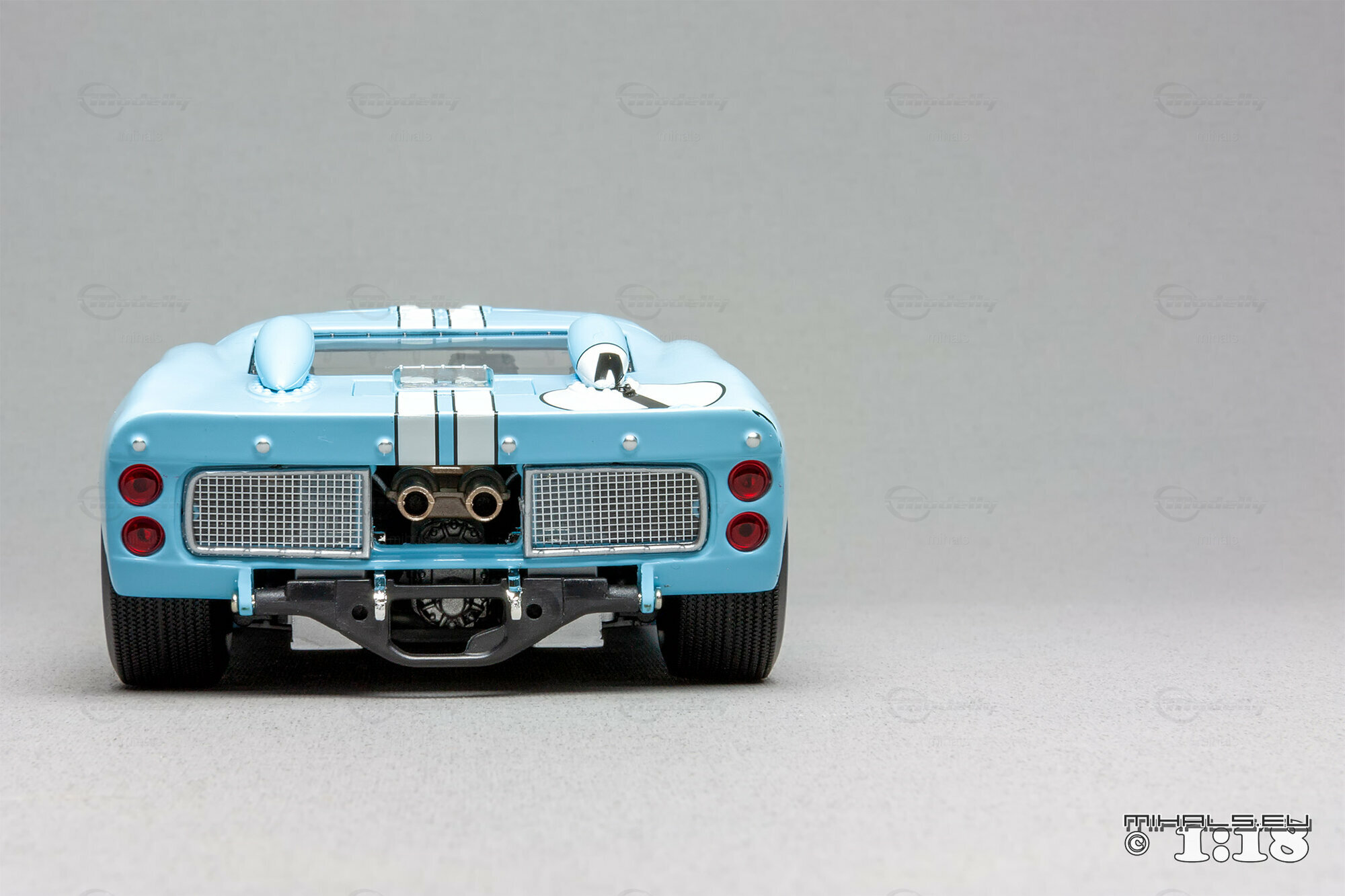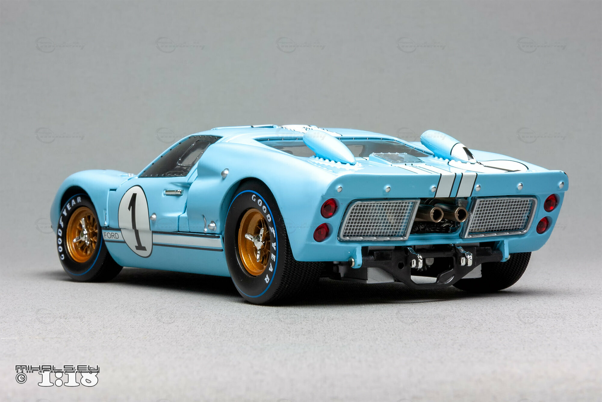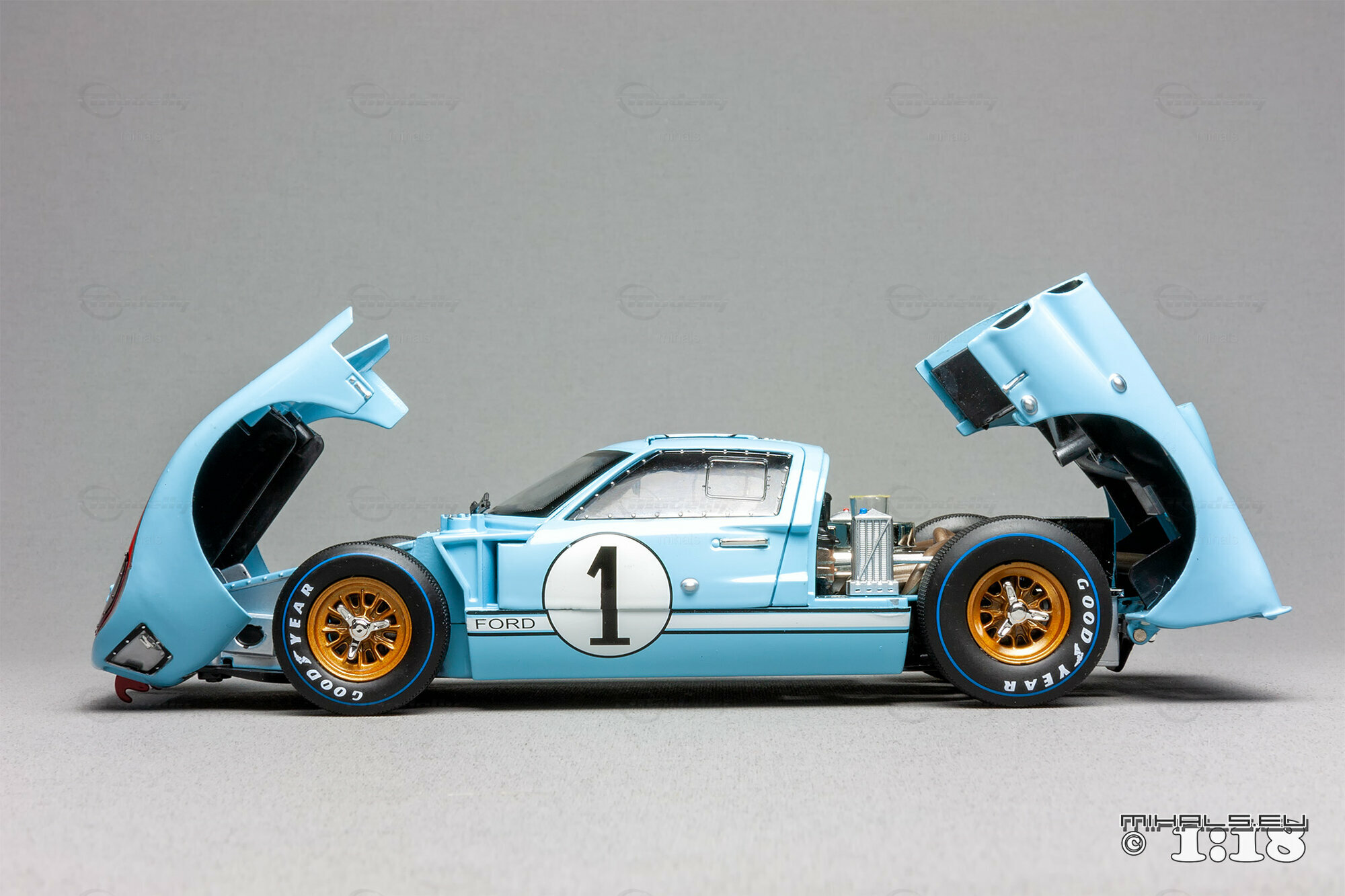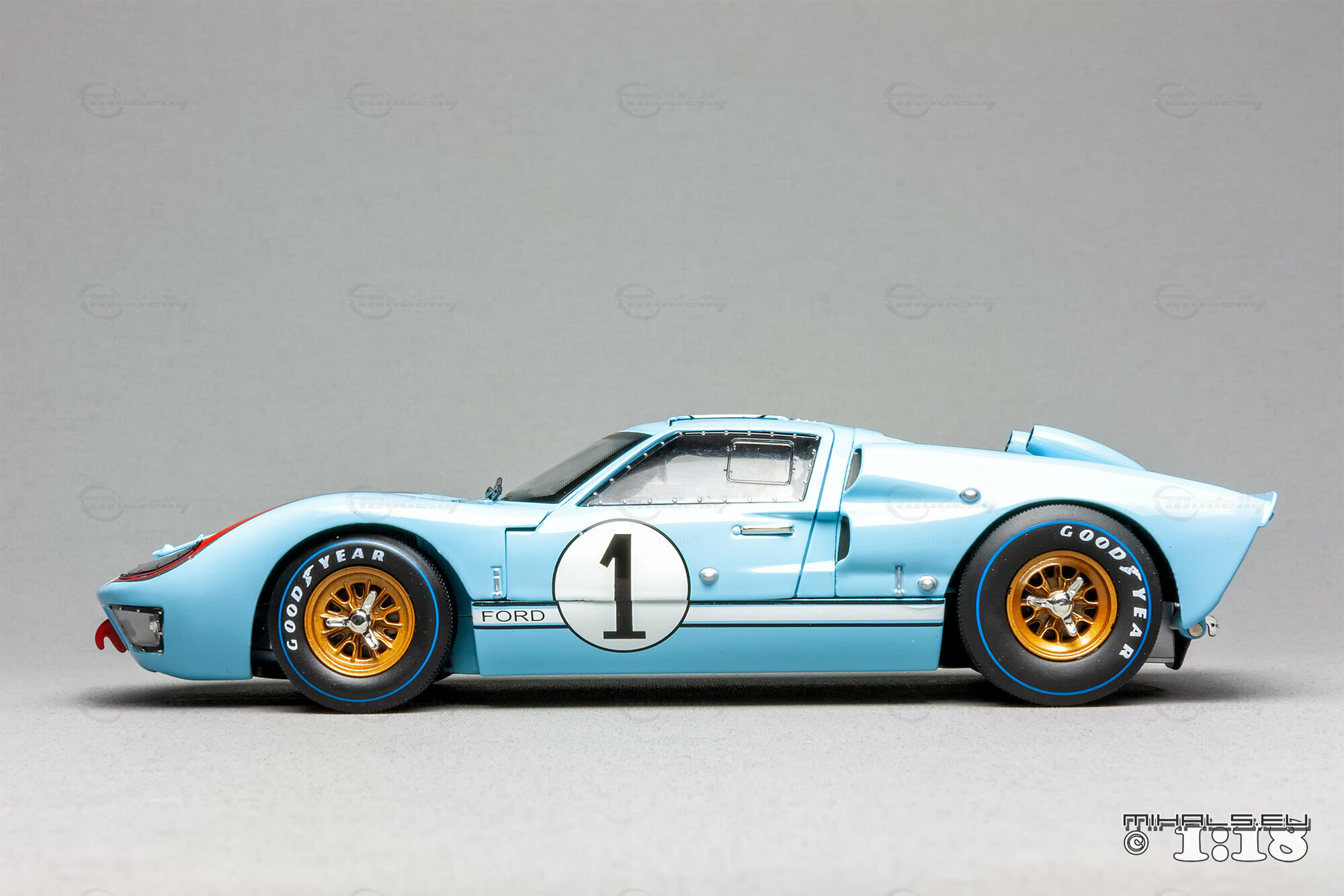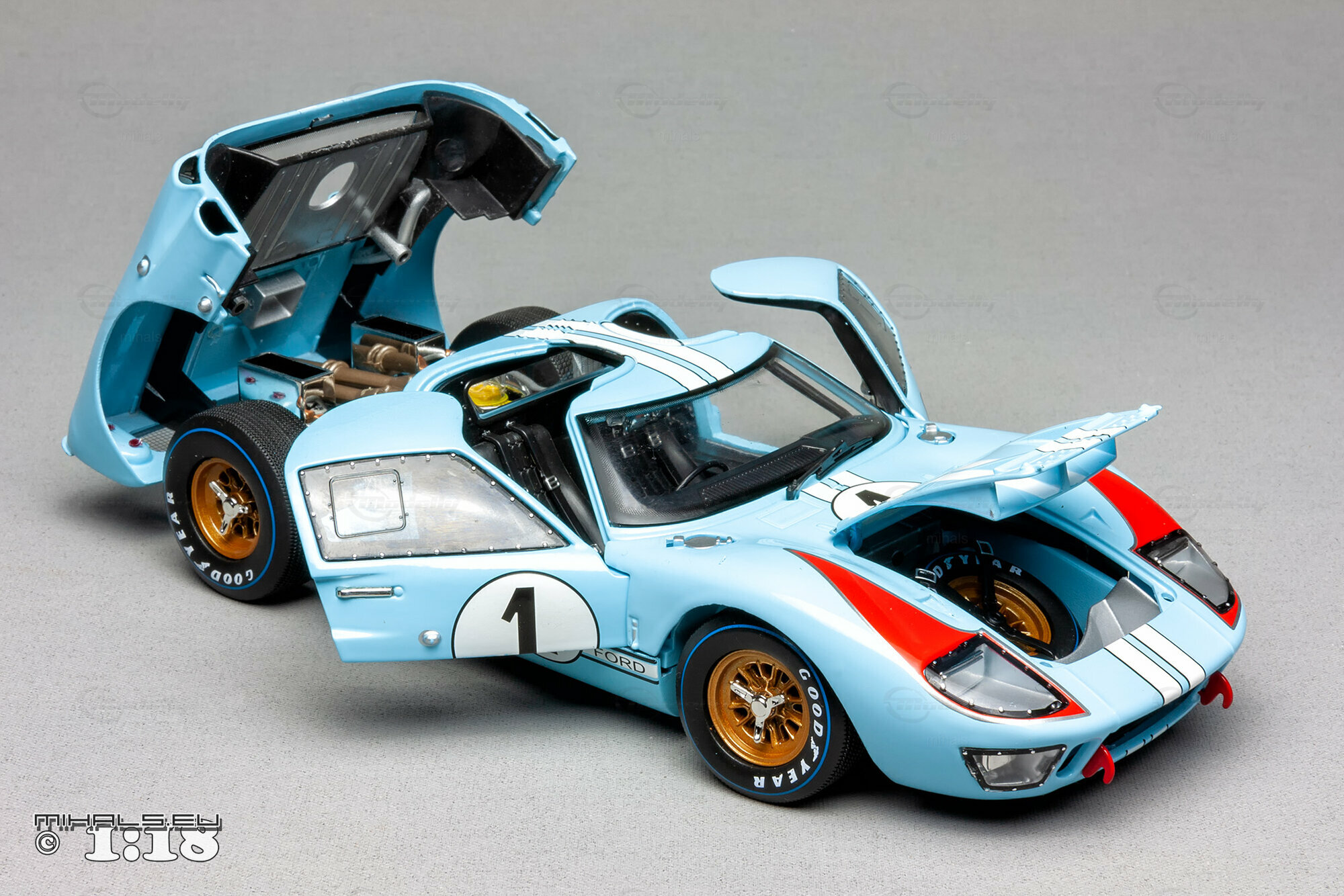 Das Miniatur-Modell des Ford GT40 MK II im 1:18-Maßstab besticht durch seine detailgetreue Nachbildung und hochwertige Verarbeitung. Hergestellt von Shelby Collectibles und basierend auf dem Material Diecast, repräsentiert es die präzisen Designmerkmale des Originalfahrzeugs. Das Modell zeigt die charakteristische hellblaue Lackierung mit orangenen Akzenten an den Scheinwerfern und dem Dach, so wie die im Motorsport häufig verwendeten Lackierungen. Es trägt zudem die Nummer „1“ auf den Türen und der Front, sowie Aufkleber berühmter Sponsoren wie Goodyear. Die goldenen Felgen und die realistischen Reifen mit Goodyear-Logo fügen zusätzliche Authentizität und Detailtreue hinzu. Das Modell ist Teil der Sammlung des Modelly-Mitglieds "mihals" und verweist durch sorgfältige Verarbeitung und präzise Details auf das ikonische Originalauto.