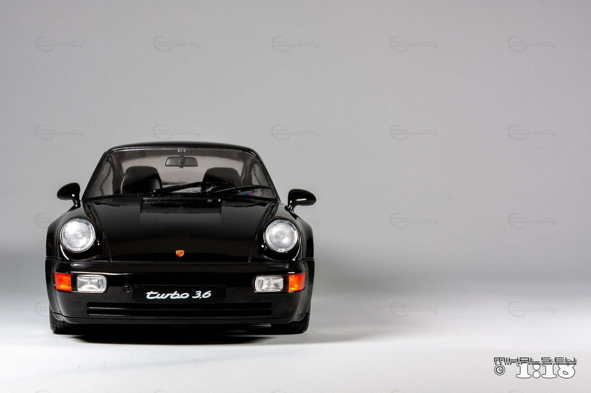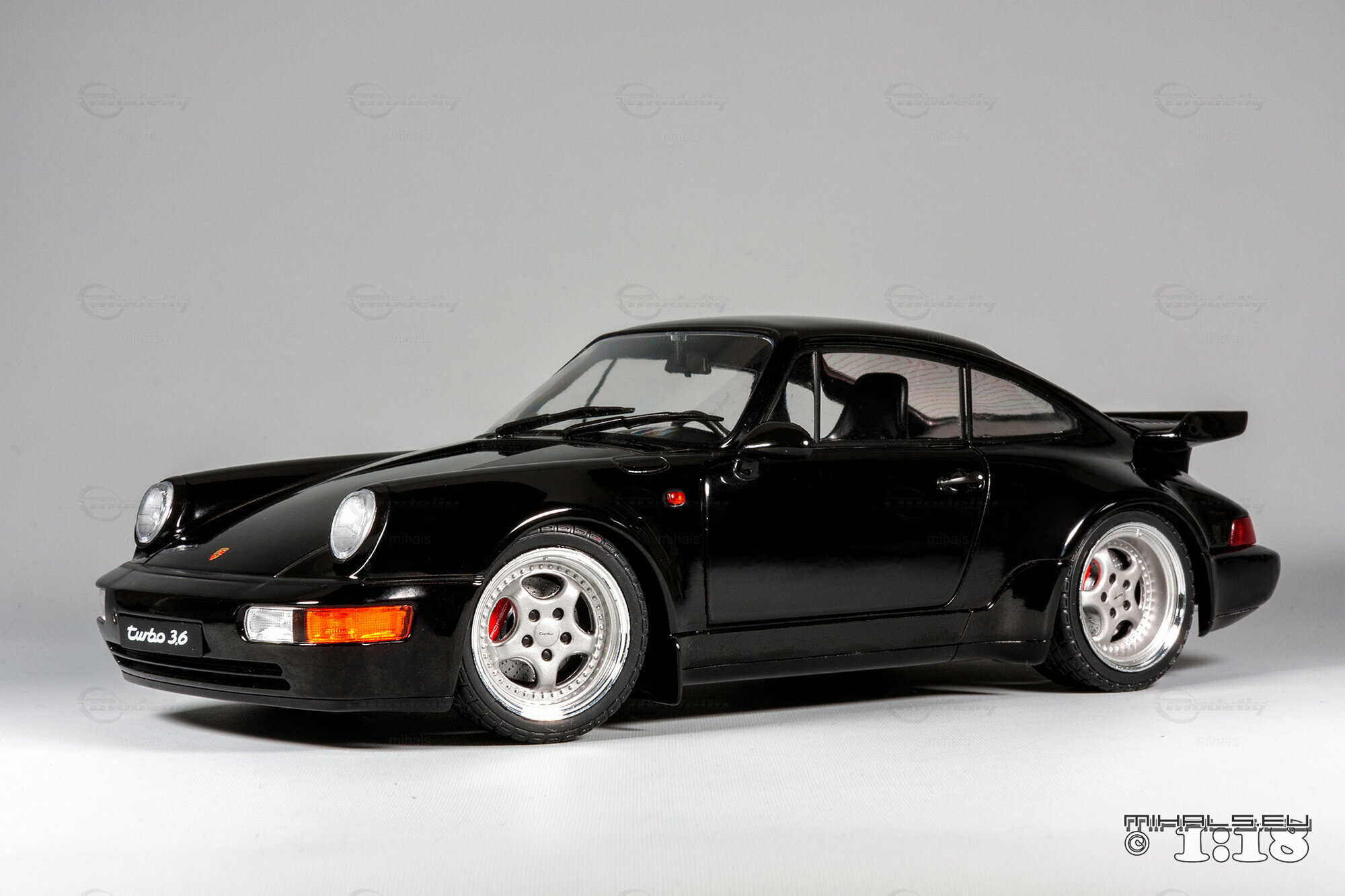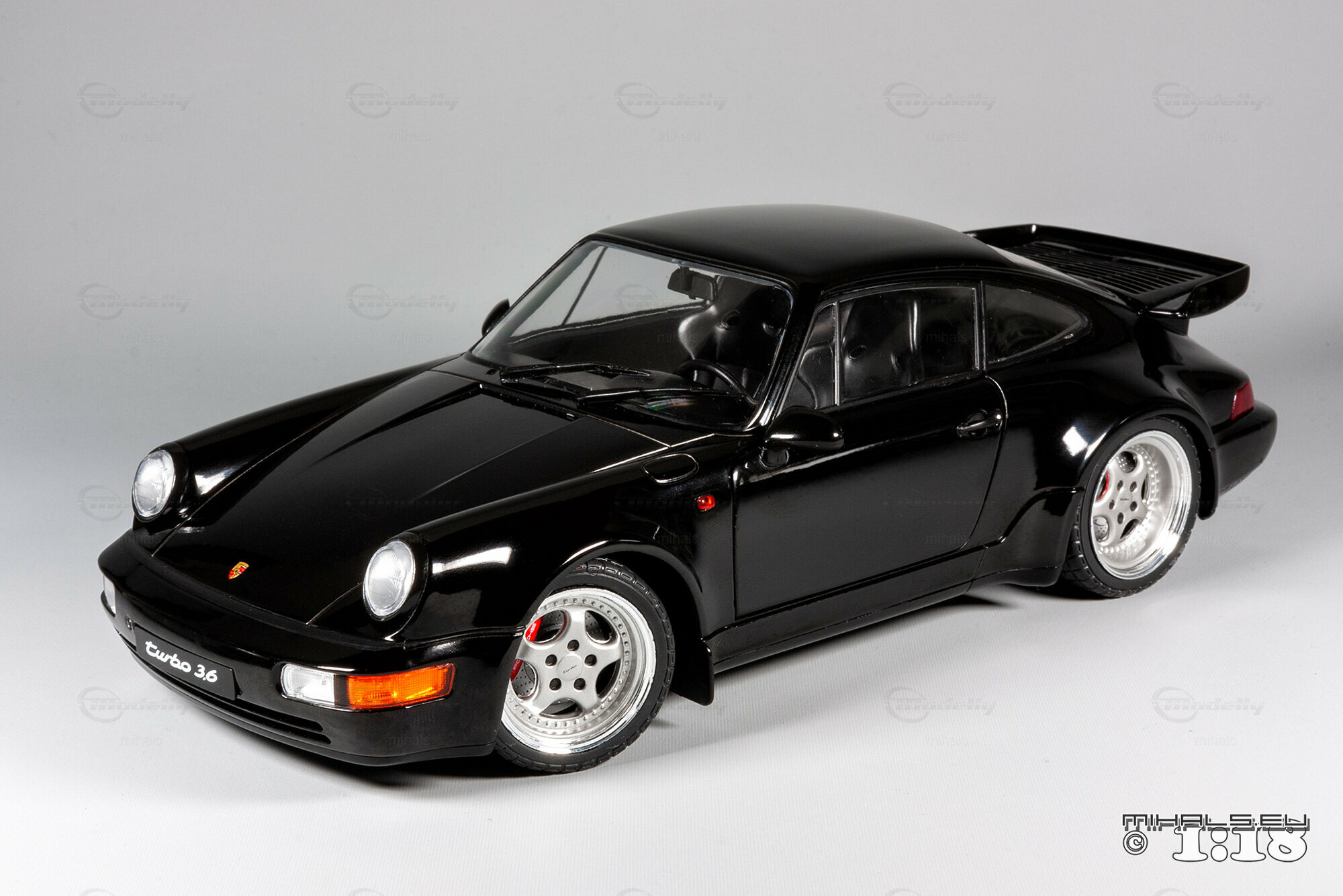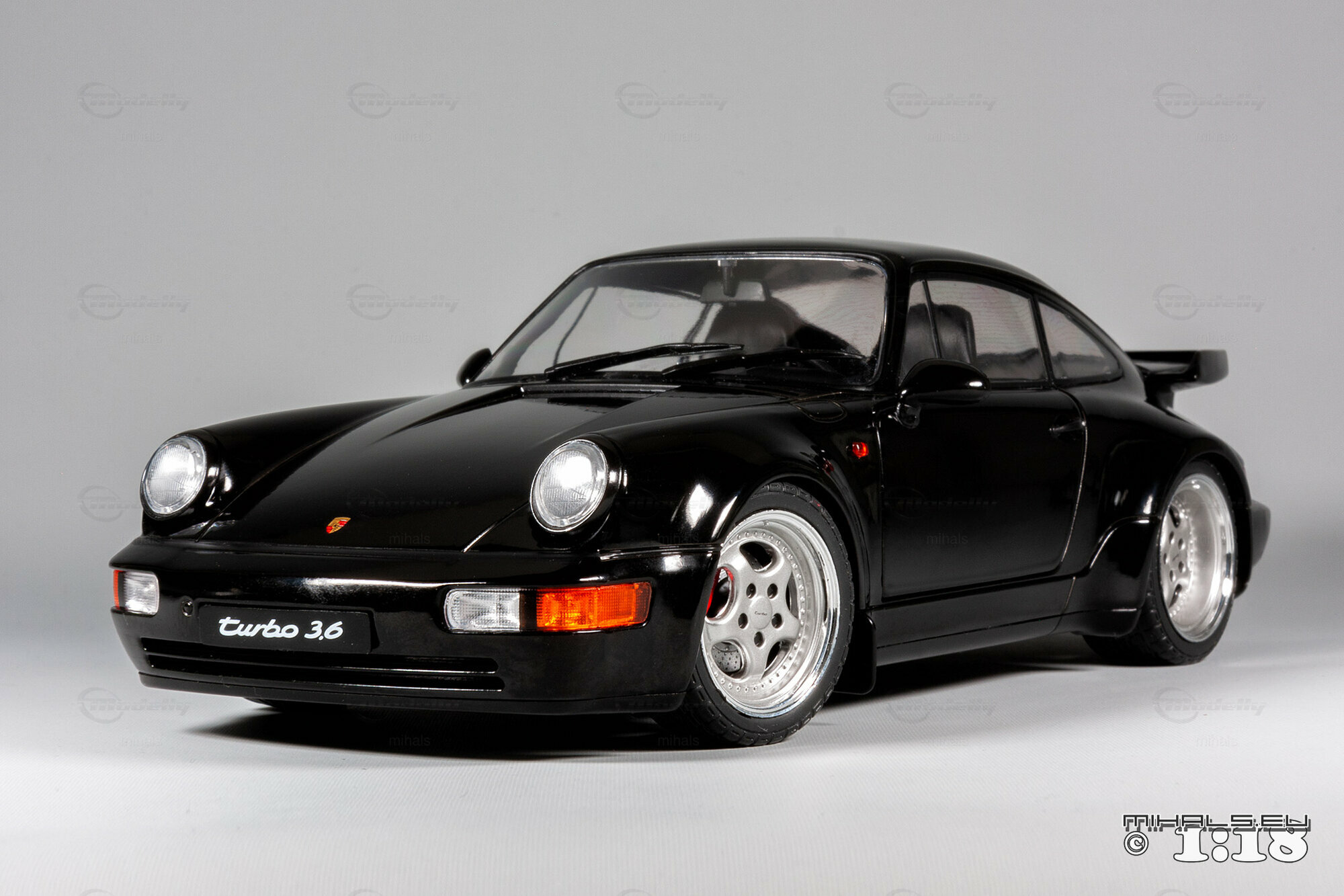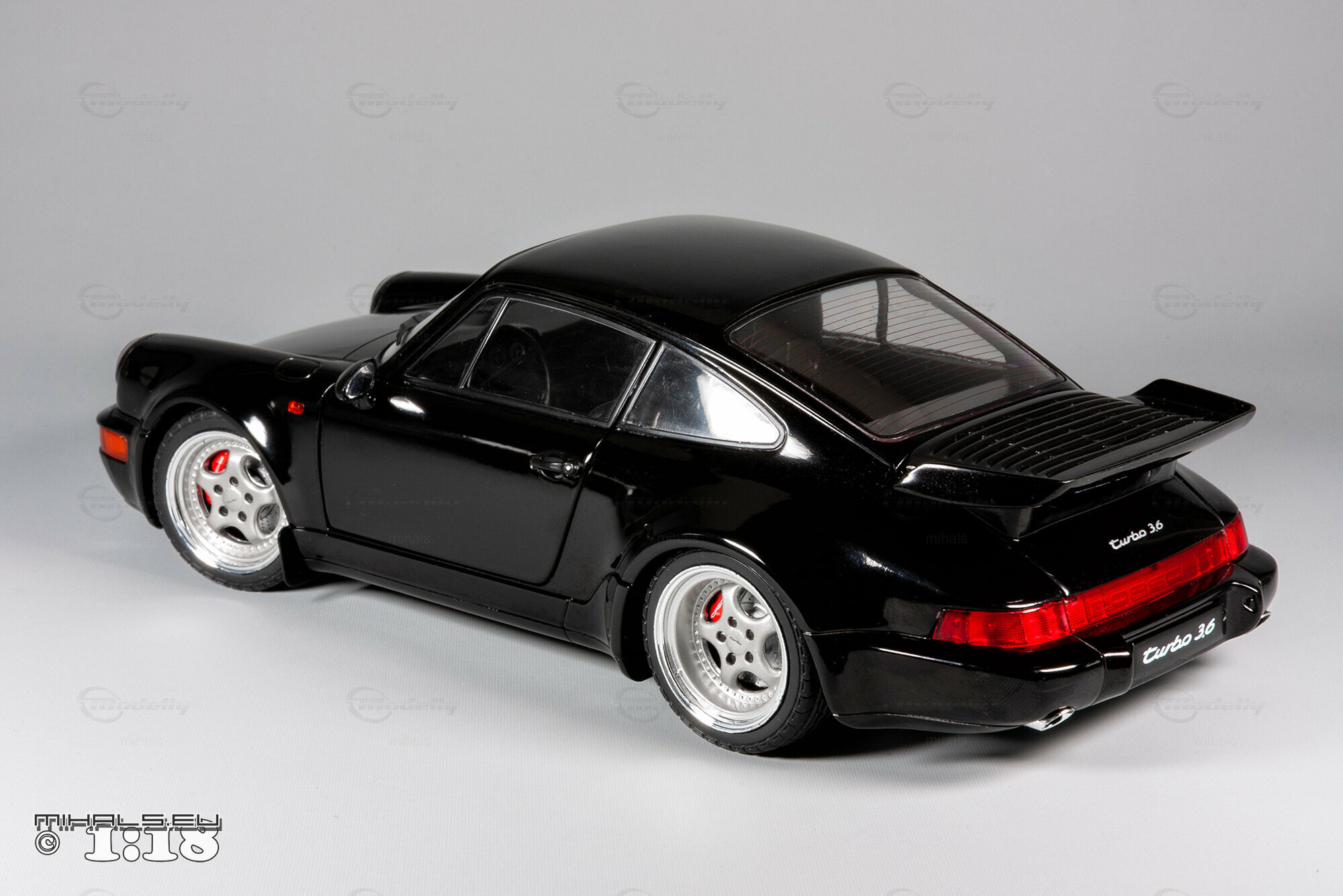 Das hier gezeigte Modellauto, hergestellt von Solido im Maßstab 1:18, stellt den Porsche 911 964 Turbo 3.6 detailgetreu dar und ist Teil der Sammlung des Modelly-Mitglieds "mihals". Diese Miniatur, in präziser 1:18 Skala, besteht aus hochwertigem Diecast-Material und zeichnet sich durch seine exakte Nachbildung des Originals aus. Die schwarze Lackierung des Modells ist glänzend und fehlerfrei, und die charakteristischen Merkmale wie die Kotflügelverbreiterungen und der Spoiler sind akkurat dargestellt. Die Frontscheinwerfer, Rücklichter und Seitenmarkierungen sind detailliert, und das Modell trägt den „Turbo 3.6“ Schriftzug, exakt wie das Original.