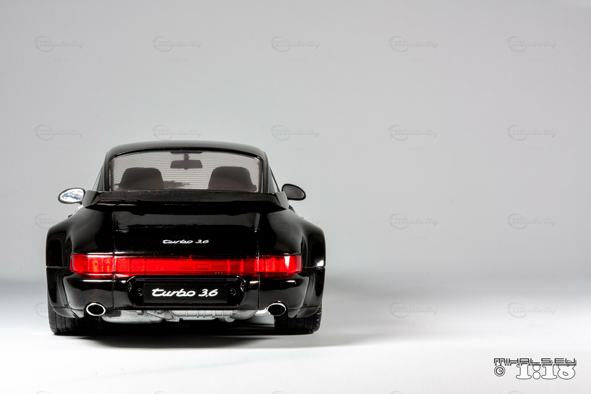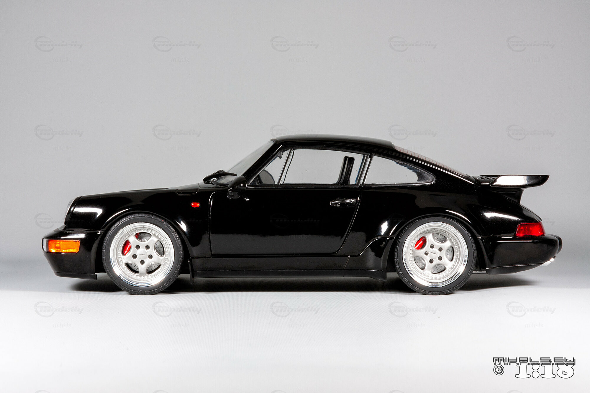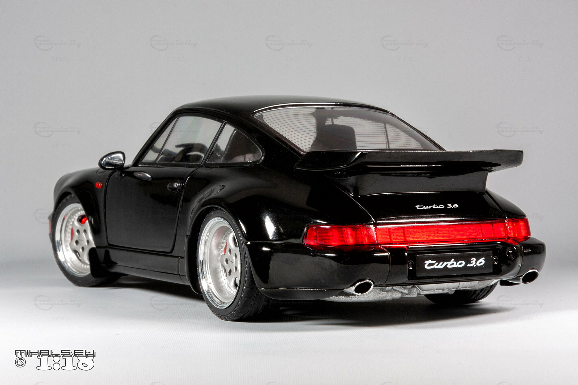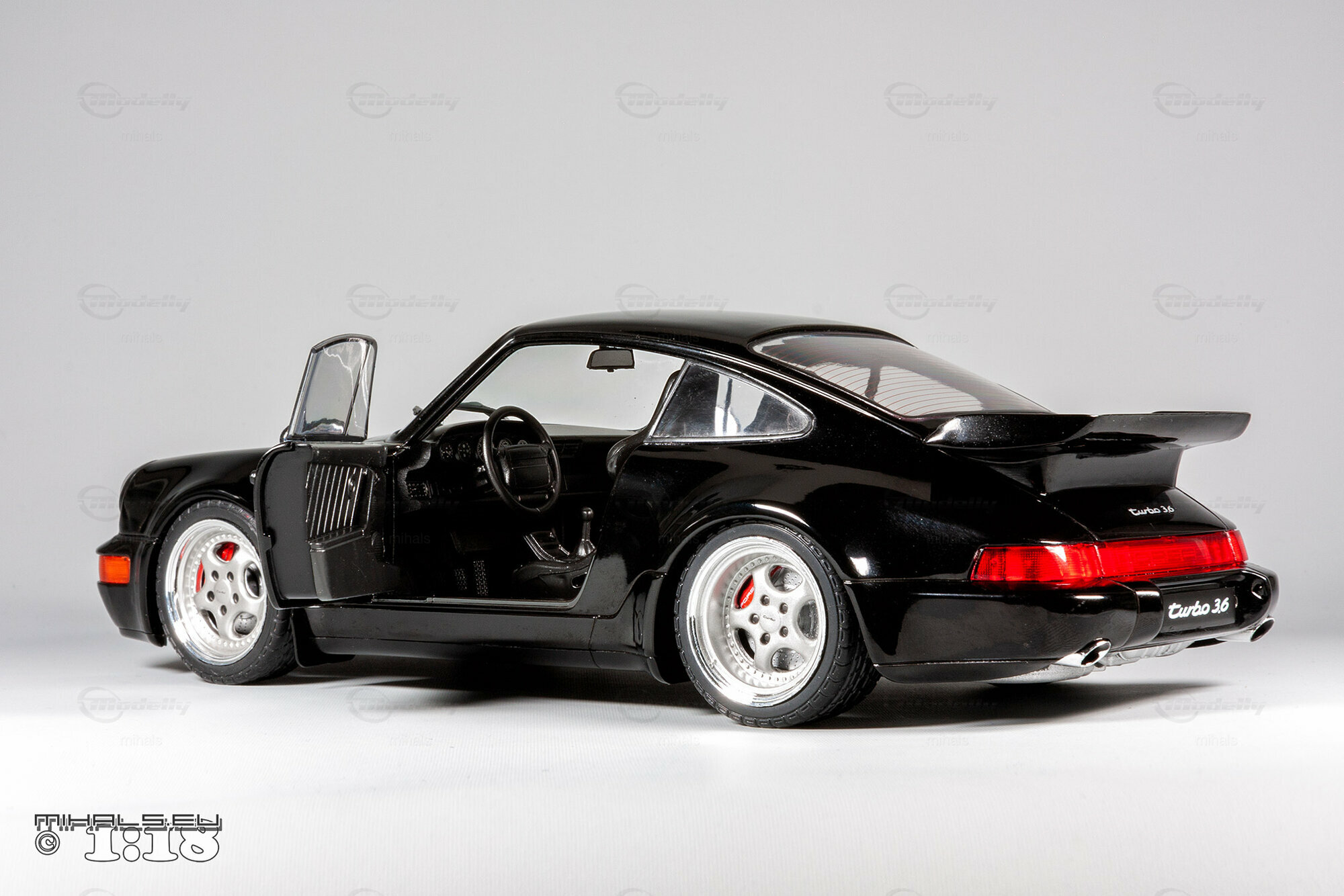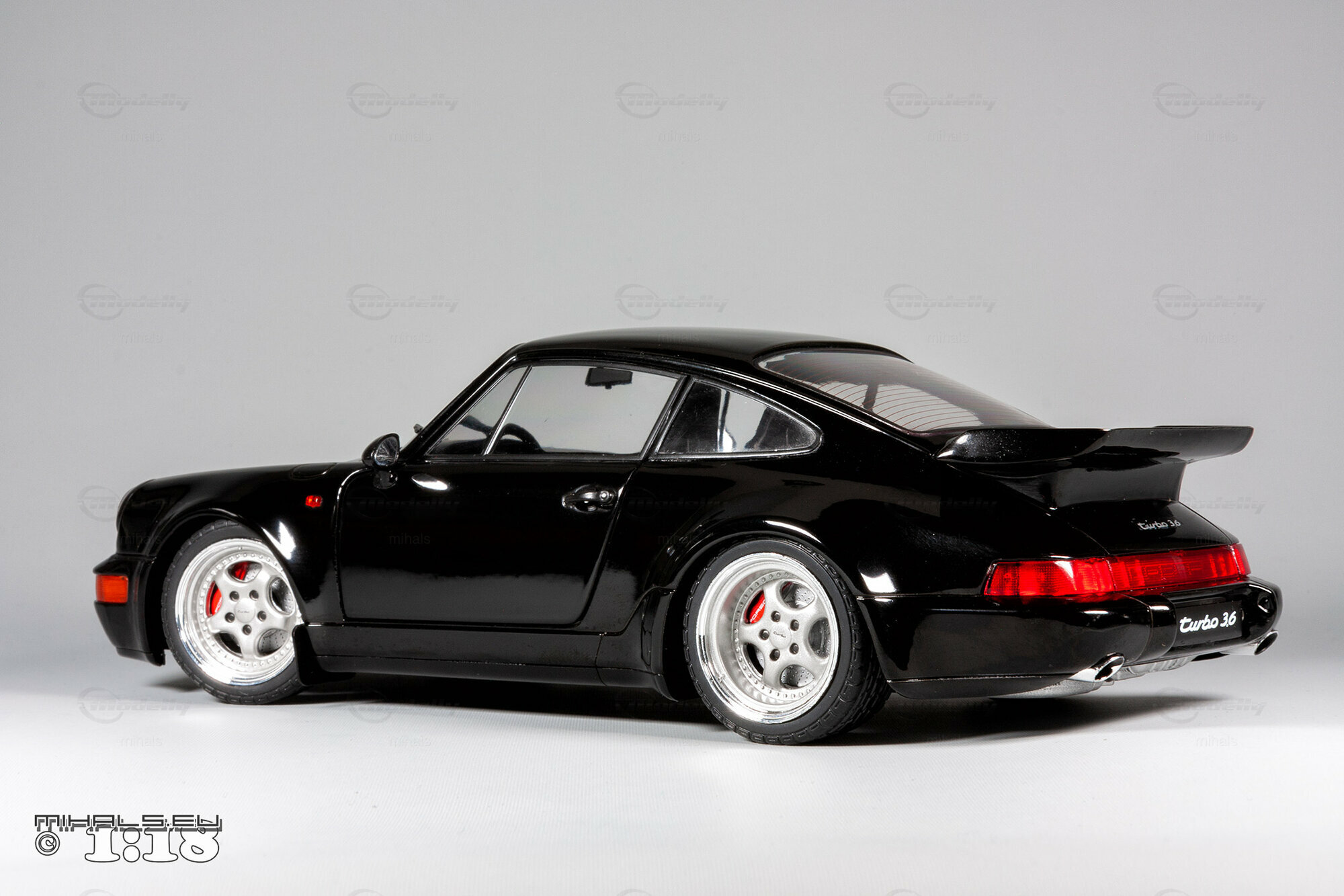 Das hier gezeigte Modellauto, hergestellt von Solido im Maßstab 1:18, stellt den Porsche 911 964 Turbo 3.6 detailgetreu dar und ist Teil der Sammlung des Modelly-Mitglieds "mihals". Diese Miniatur, in präziser 1:18 Skala, besteht aus hochwertigem Diecast-Material und zeichnet sich durch seine exakte Nachbildung des Originals aus. Die schwarze Lackierung des Modells ist glänzend und fehlerfrei, und die charakteristischen Merkmale wie die Kotflügelverbreiterungen und der Spoiler sind akkurat dargestellt. Die Frontscheinwerfer, Rücklichter und Seitenmarkierungen sind detailliert, und das Modell trägt den „Turbo 3.6“ Schriftzug, exakt wie das Original.