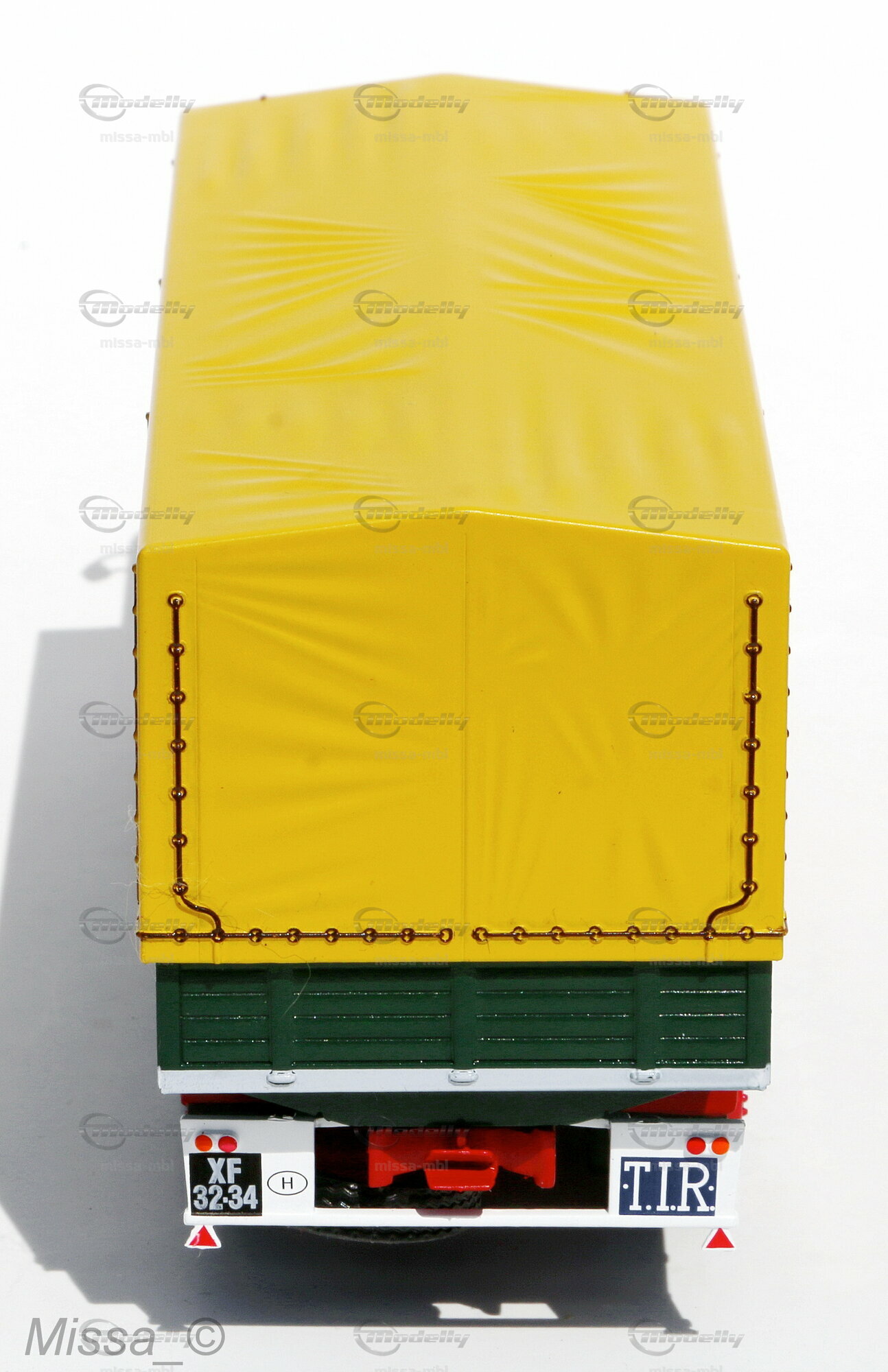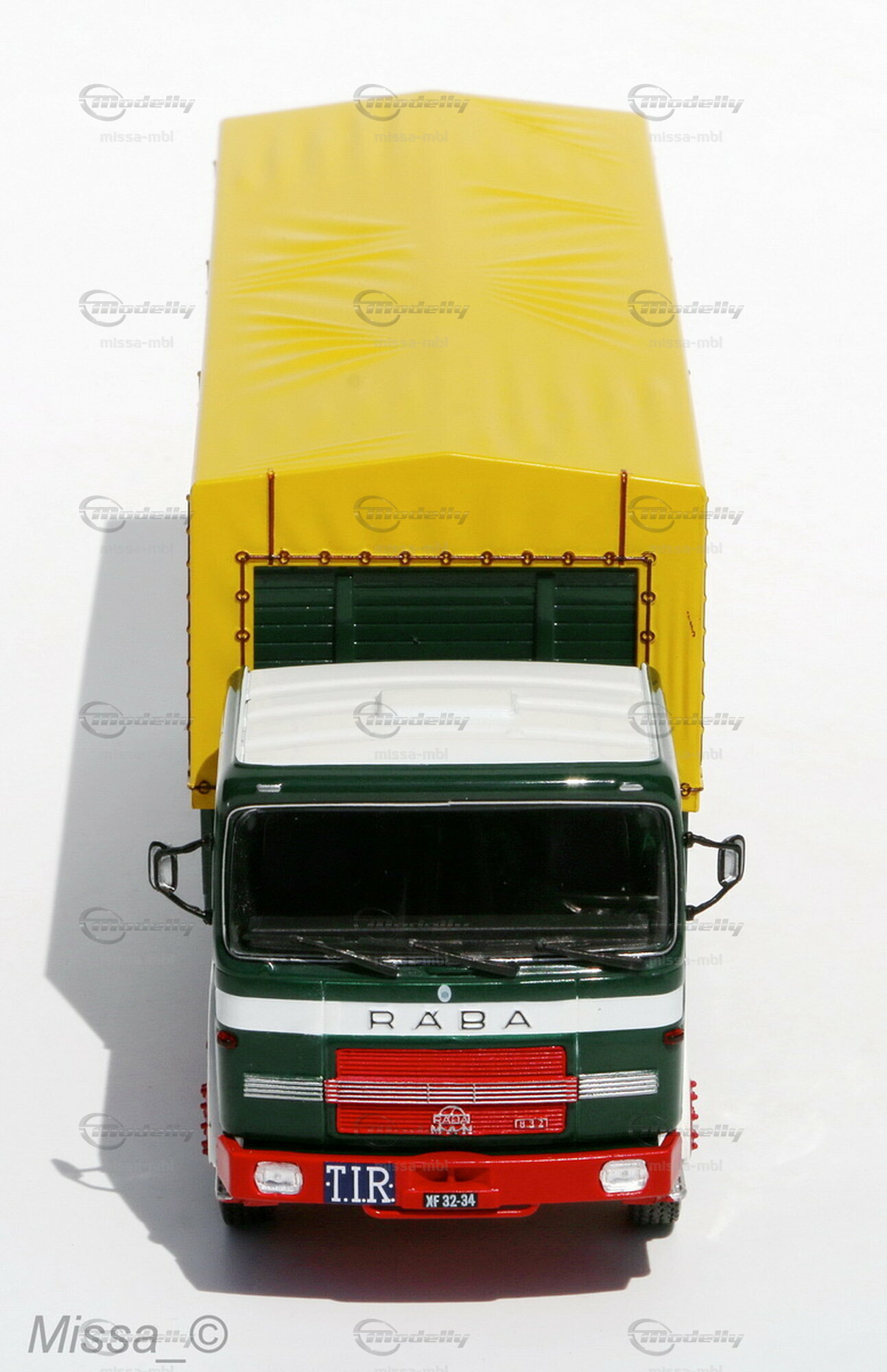 Das 1:43-Modell hebt sich durch seine markante Farbgebung hervor: Die Fahrerkabine ist in einem kräftigen Grün und Weiß gestrichen, wozu rot lackierte Felgen und Unterbaukonfigurationen hinzukommen. Dies verleiht dem Modell ein optisches Gleichgewicht und verstärkt die historische Authentizität. Die Plane des Laderaums ist in einem lebhaften Gelb gehalten und mit markanten roten Buchstaben beschriftet. Der Original Rába 832.13 war für seine optische Robustheit bekannt, was sich in der Nachbildung durch die detaillierte Darstellung von Formen, Linien und Zeichen fortsetzt.