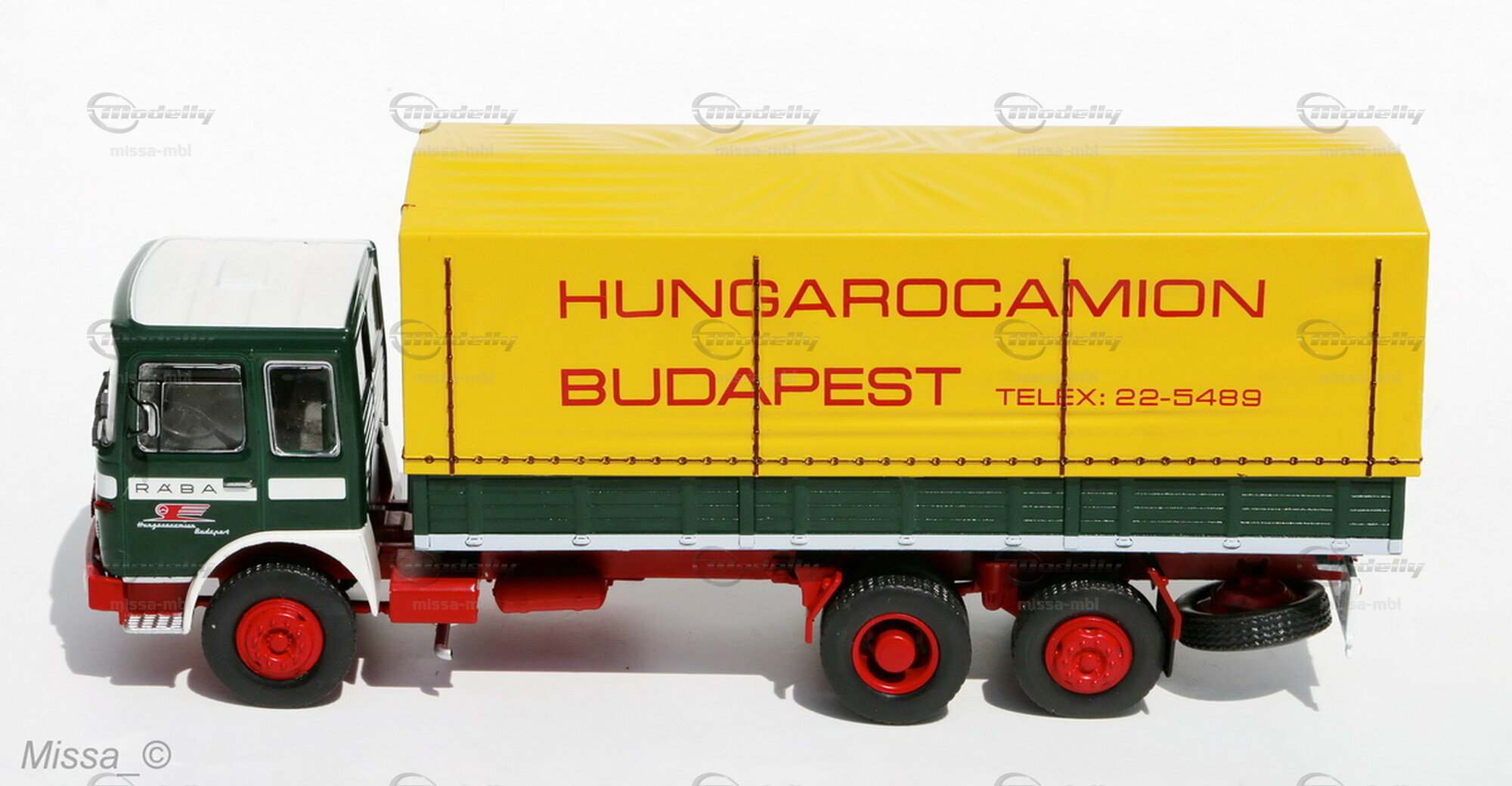 Das 1:43 Modell des Rába 832.13 wird von De Agostini hergestellt und gehört zur Sammlung von Modelly Mitglied "missa-mbl". Diese Miniatur ist ein erstklassiges Beispiel für die Detailtreue und Qualität, die von Sammlern weltweit geschätzt wird. Hergestellt aus dem patentierten Material Gemisch, welches Langlebigkeit und Präzision garantiert, fängt das Modell die Essenz des Originals perfekt ein. Der Maßstab ist deutlich und gut proportioniert, wodurch das Modell authentisch wirkt. Besonders auffällig ist die Beschriftung "HUNGAROCAMION BUDAPEST" sowie die Telefonnummer und Telex-Nummer entsprechend des Originals in den 1980er Jahren.