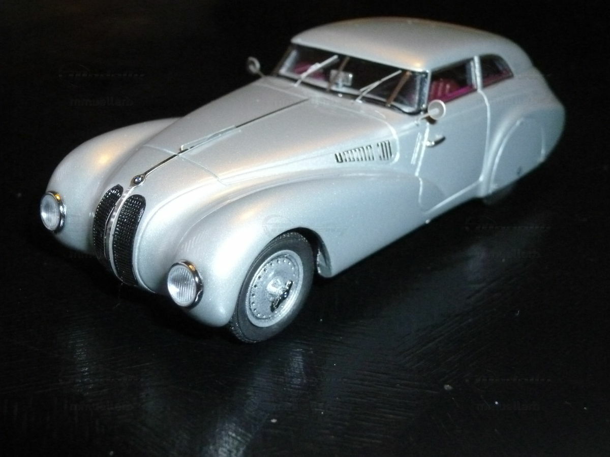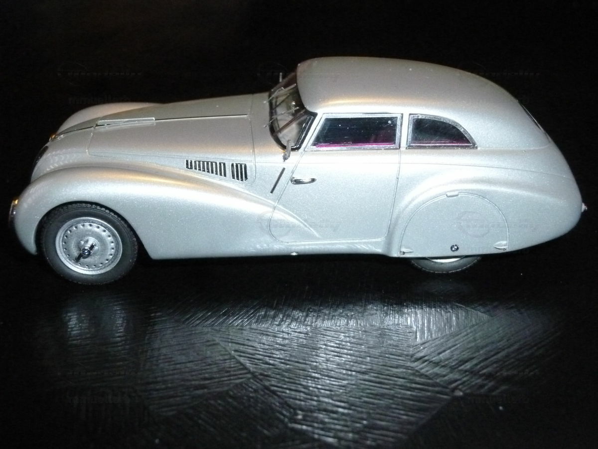 Diese 1:43 Maßstabsmodell von Autocult ist ein exquisites Sammlerstück und ein Muss für jeden Enthusiasten. Dieses spezielle Modell ist aus Resin gefertigt, was für eine besonders hohe Detailtreue und einen makellosen Glanz sorgt. Die Liebe zum Detail ist bemerkenswert, vom aerodynamisch gestalteten Kamm-Heck bis zu den präzisen Linien und Konturen, die den originalen BMW 328 Kamm-Coupe so unverwechselbar machen. Die Lackierung dieses Modells ist in einem klassischen Silber gehalten, was die zeitlose Eleganz des Originals perfekt einfängt. Besonders hervorzuheben ist der akkurate Nachbau der Frontpartie, inklusive der charakteristischen Doppelniere und der Scheinwerfer, die exakt modelliert sind. Der Innenraum ist ebenfalls detailgetreu mit rotem Interieur nachgebildet und verleiht dem Modell eine zusätzliche Ebene der Autenthizität.