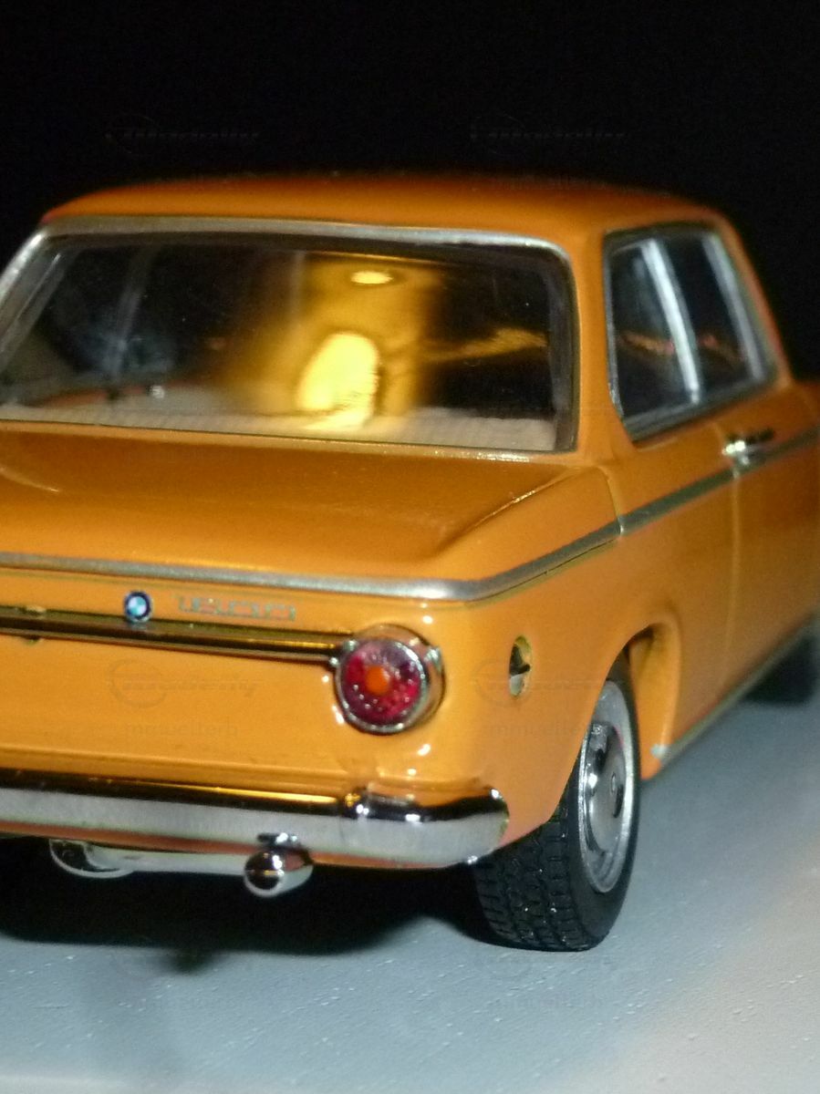 Das Minichamps-Modell repräsentiert die Eleganz des BMW 1600-2 durch präzise Anordnung aller Details. Besonders auffallend ist die Gestaltung der hinteren Rücklichter, die sich farblich perfekt vom orangefarbenen Lack abheben. Die minimalistische Frontpartie mit den klassischen BMW-Nieren und den runden Scheinwerfern ist akkurat nachgebildet. Auch der Innenraum besticht durch die Liebe zum Detail: Lenkrad, Instrumententafel und Sitze sind im beigeähnlichen Farbton gehalten, der optimal mit dem Außenlack harmoniert. Obwohl keine spezifischen Tuning- oder Raddesigns auf den Fotos ersichtlich sind, bleibt der Wert dieses Miniaturfahrzeugs durch seine hohe Fertigungsqualität und Materialwahl unbestreitbar, was es zu einem begehrenswerten Sammlerobjekt für Liebhaber macht.