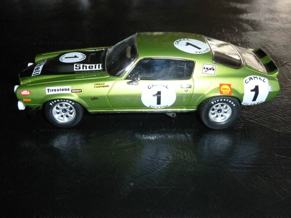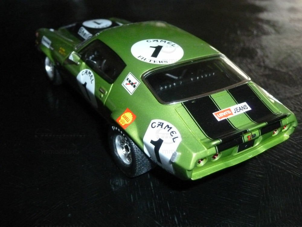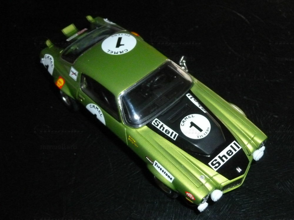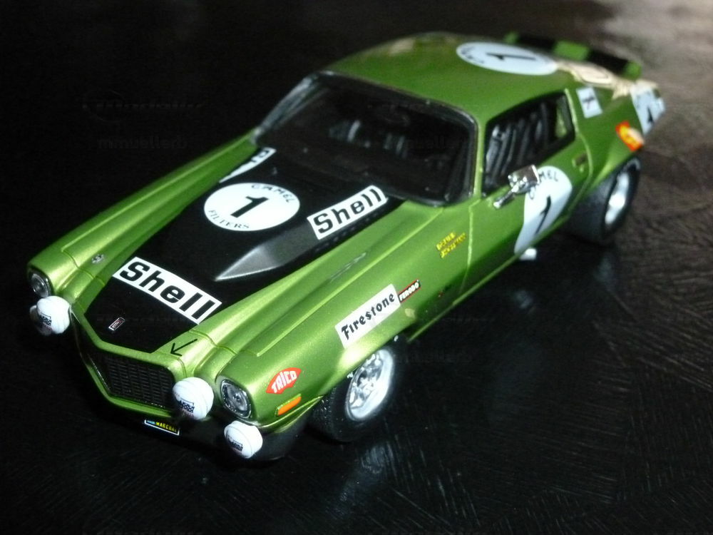Das Modellauto im 1:43 Maßstab, hergestellt von PremiumX, zeigt eindrucksvoll die markanten Merkmale des originalen Chevrolet Camaro Z28. Die grüne Lackierung mit den schwarzen Akzenten auf Haube und Dach verleiht dem Modell eine authentische Rennsportoptik. Auffällige Sponsorenaufkleber wie Shell, Camel und Firestone sind fein und detailgetreu aufgebracht, was die Rennsportgeschichte dieses Fahrzeugs unterstreicht. Die präzise Nachbildung des Innenraums und der Motorhaube zeigt die hohe Qualität und Handwerkskunst von PremiumX. Das Modell gehört zur beeindruckenden Sammlung des Modelly-Mitglieds "mmuellerb".