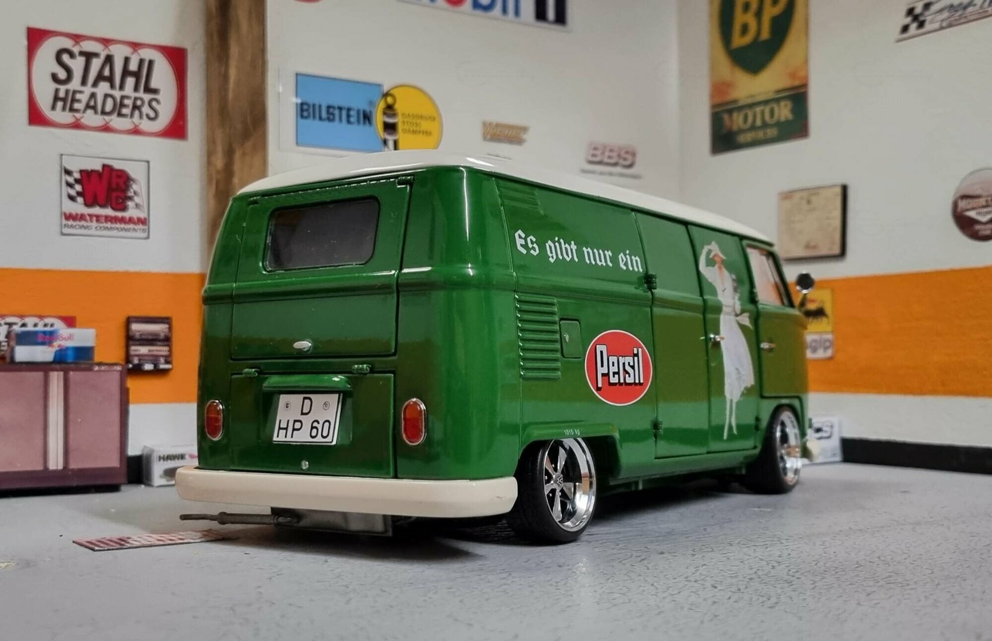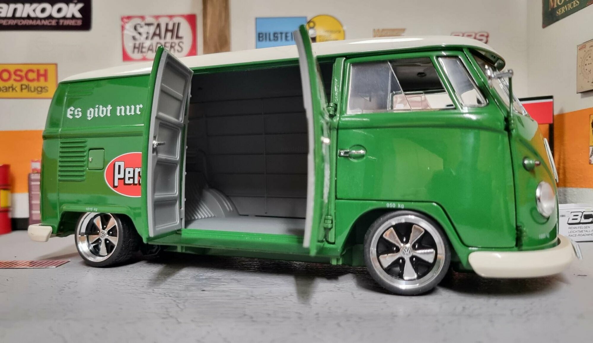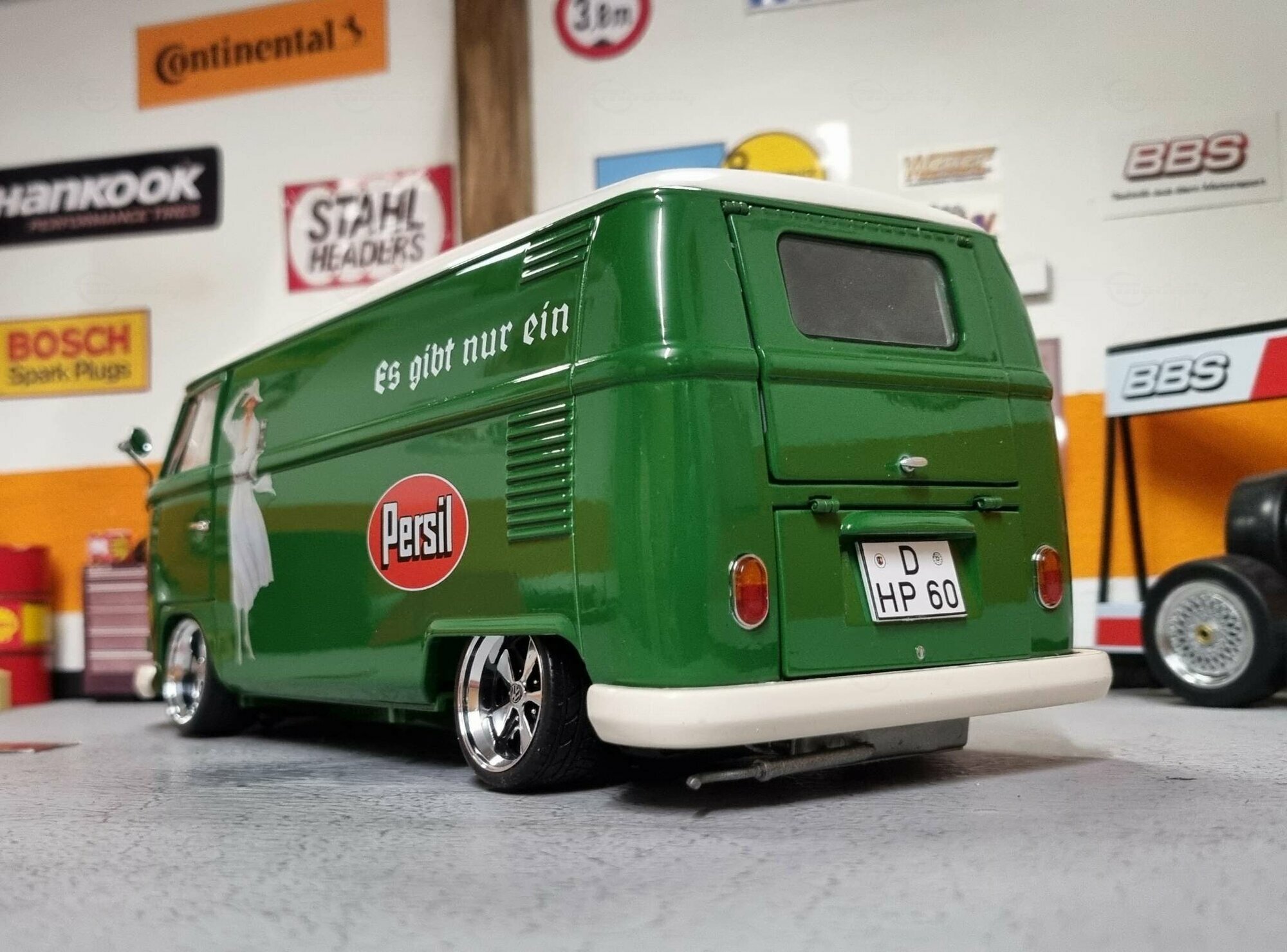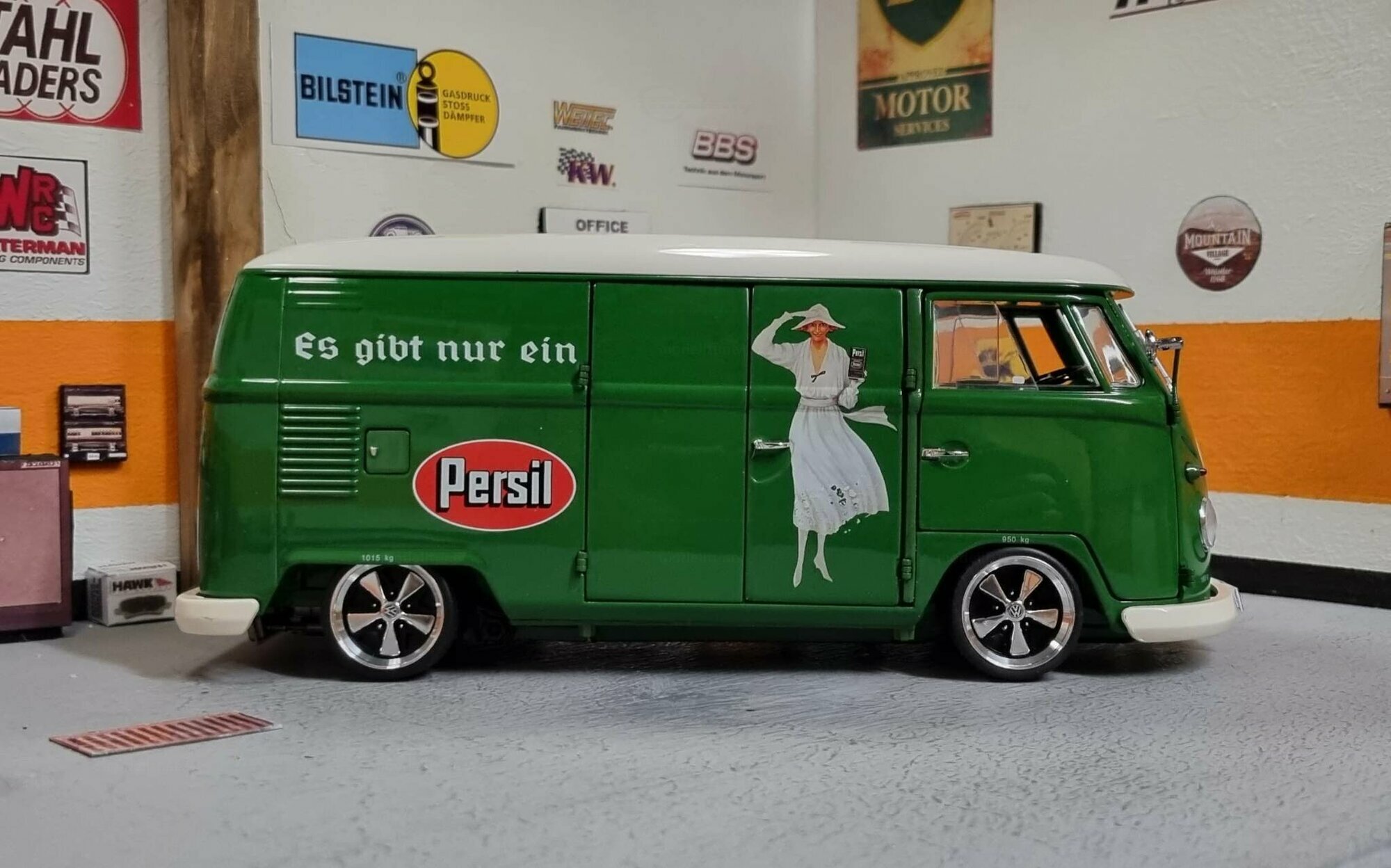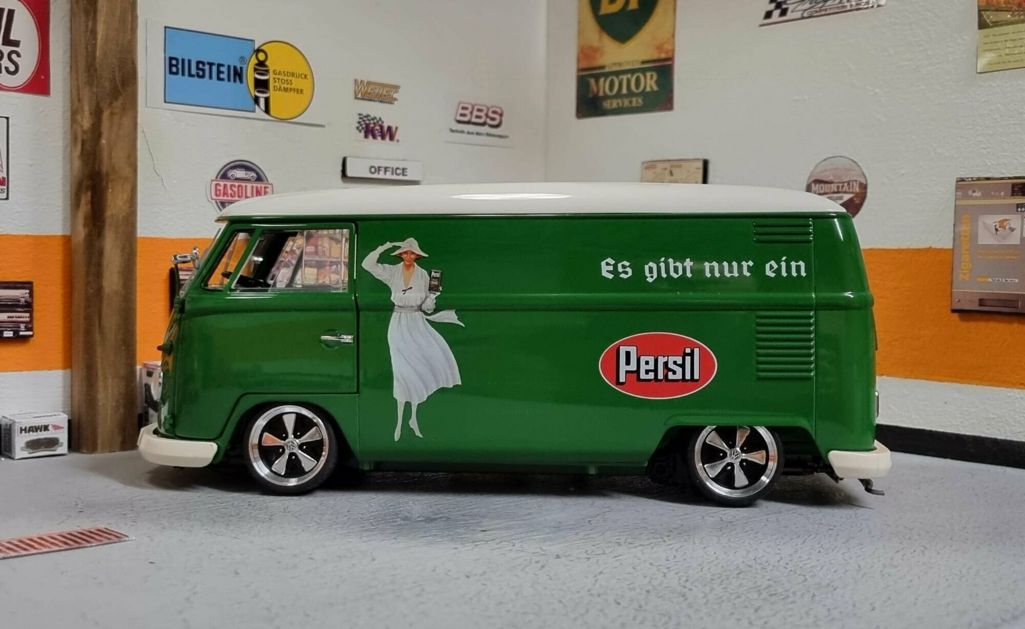 Das abgebildete Modell ist ein 1:18 Maßstab Replikat, präzise gefertigt von Schuco aus Diecast-Material. Es handelt sich um eine modifizierte Version, die nicht das ursprünglich von Schuco hergestellte Produkt darstellt. Dieses Modell wurde von einem Mitglied der Modellly-Community, "modelltuner", individuell verändert. Das Modell besticht durch sein detailgetreues Design, das dem Original in vielerlei Hinsicht alle Ehre macht. Die Lackierung ist in einem auffälligen, glänzenden Grün gehalten, das den originalen Marketingfarben der Persil-Kampagne entspricht. Diese Wahl zeigt die Kreativität und das Geschick des Modellbauers. Dekoriert mit einem Retro-Werbemotiv und dem Schriftzug „Es gibt nur ein…“, hebt das Modell den historischen und kulturellen Wert des Volkswagen T1 hervor.