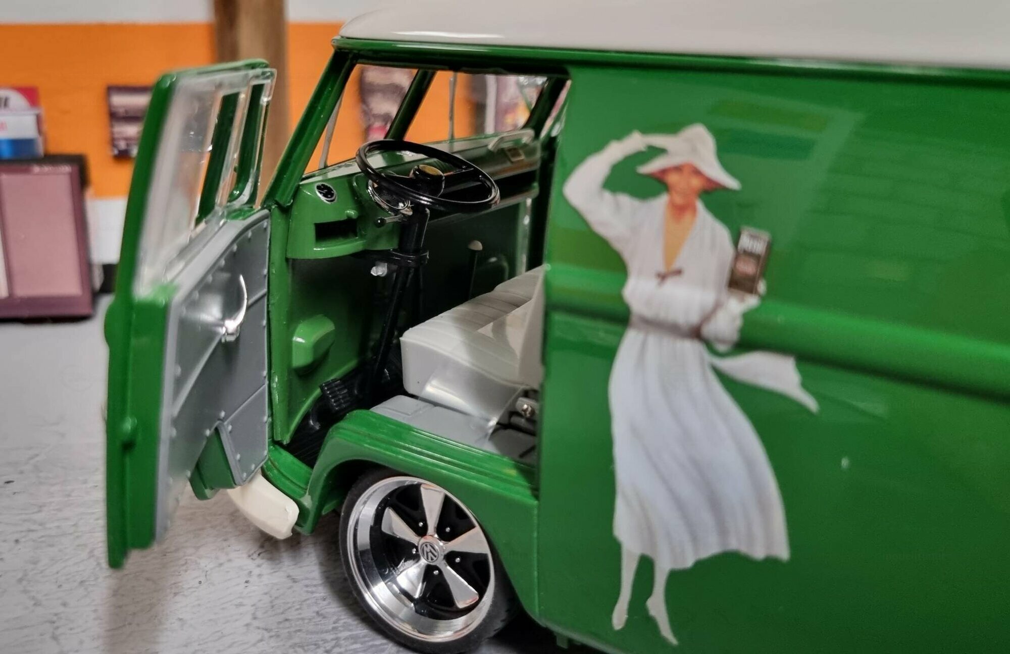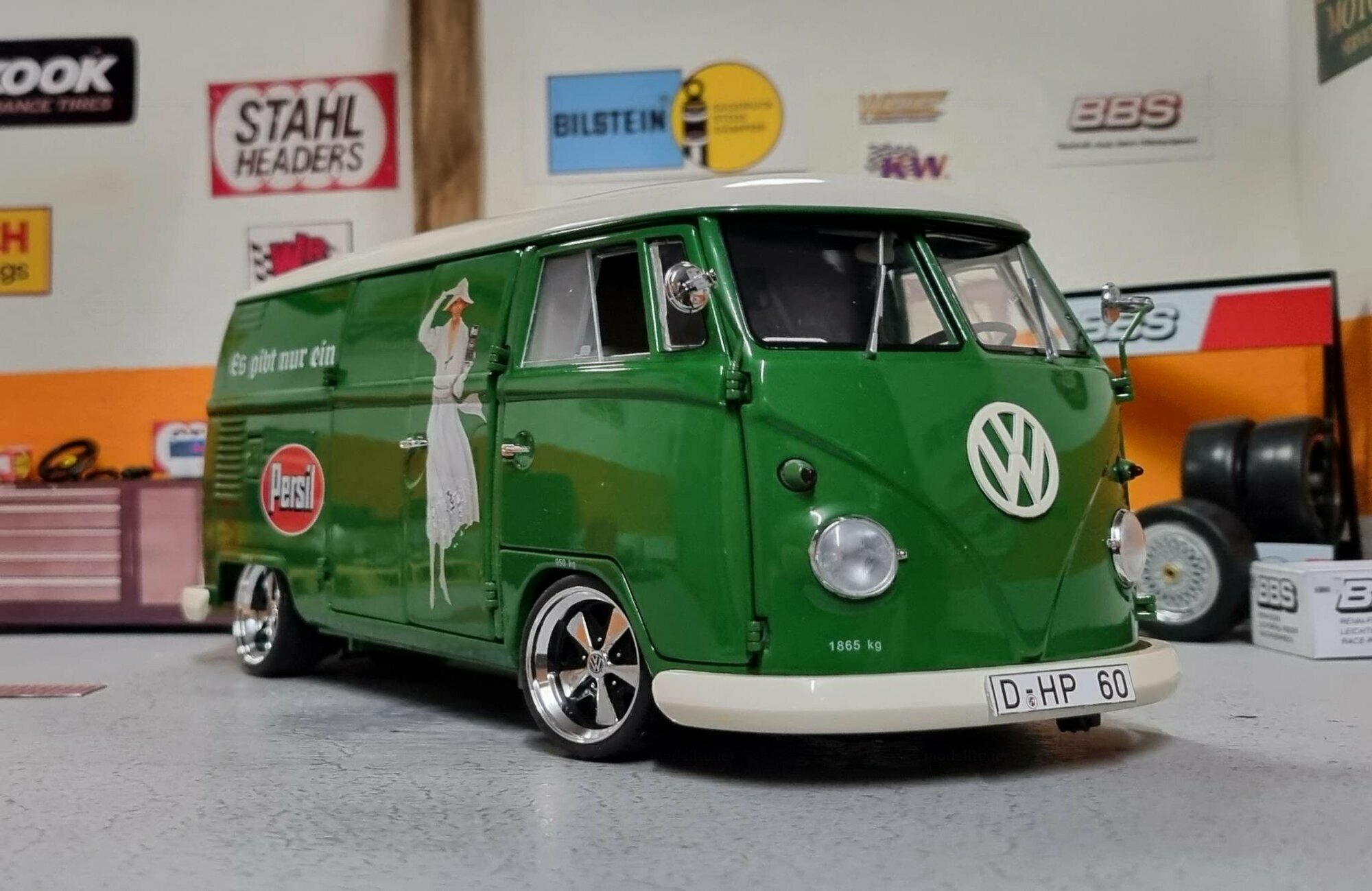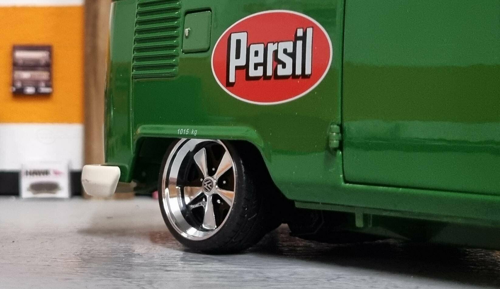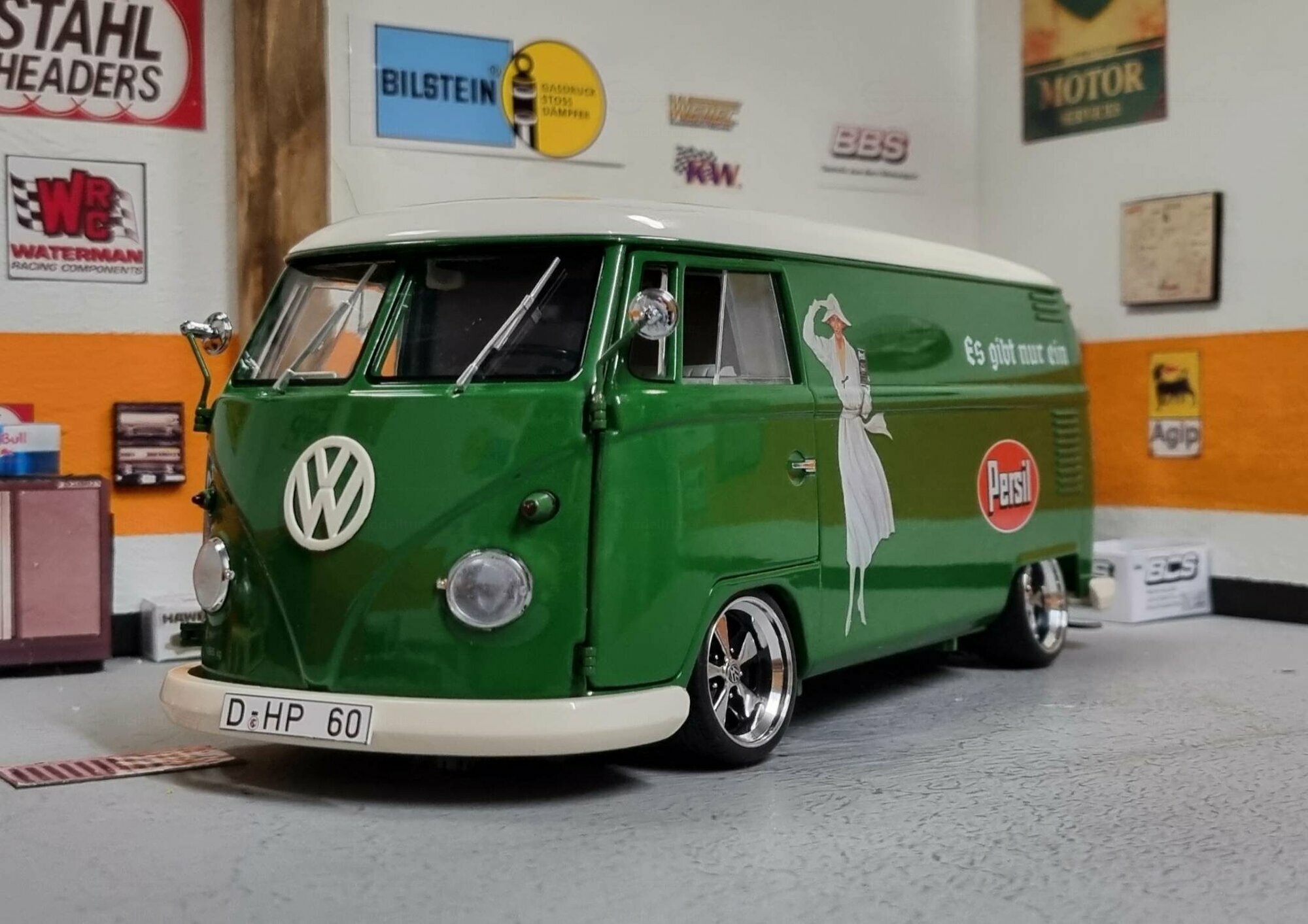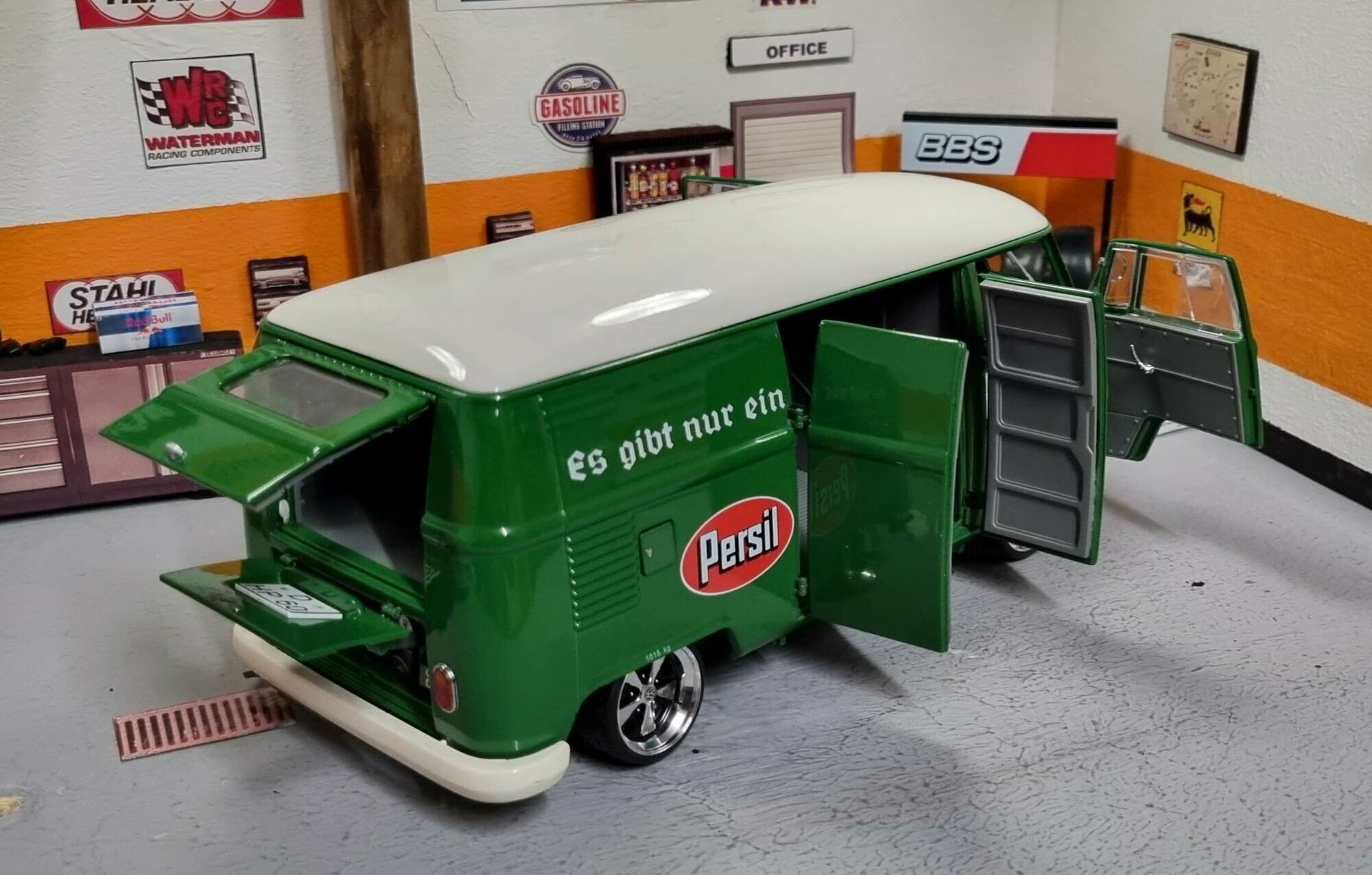 Das abgebildete Modell ist ein 1:18 Maßstab Replikat, präzise gefertigt von Schuco aus Diecast-Material. Es handelt sich um eine modifizierte Version, die nicht das ursprünglich von Schuco hergestellte Produkt darstellt. Dieses Modell wurde von einem Mitglied der Modellly-Community, "modelltuner", individuell verändert. Das Modell besticht durch sein detailgetreues Design, das dem Original in vielerlei Hinsicht alle Ehre macht. Die Lackierung ist in einem auffälligen, glänzenden Grün gehalten, das den originalen Marketingfarben der Persil-Kampagne entspricht. Diese Wahl zeigt die Kreativität und das Geschick des Modellbauers. Dekoriert mit einem Retro-Werbemotiv und dem Schriftzug „Es gibt nur ein…“, hebt das Modell den historischen und kulturellen Wert des Volkswagen T1 hervor.