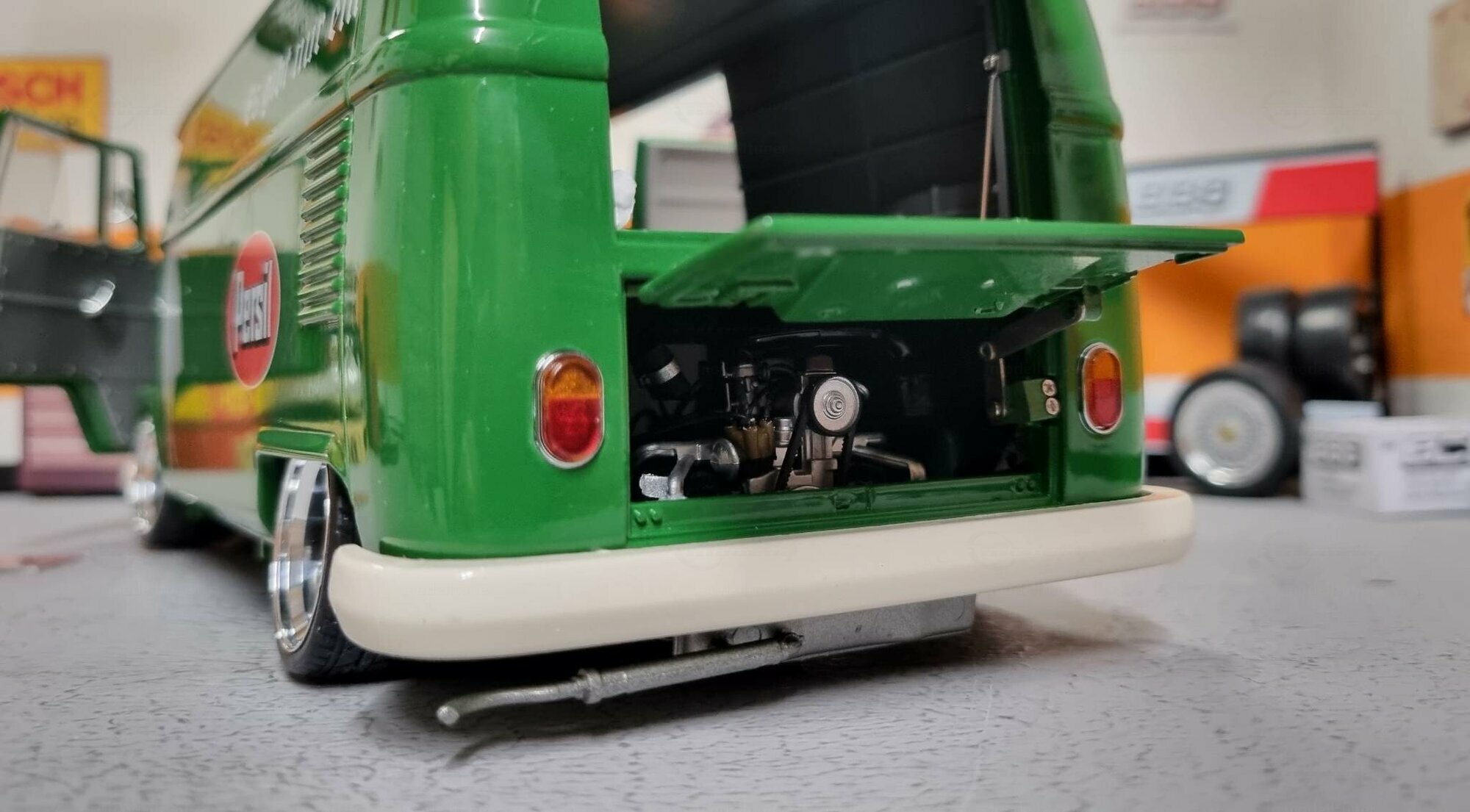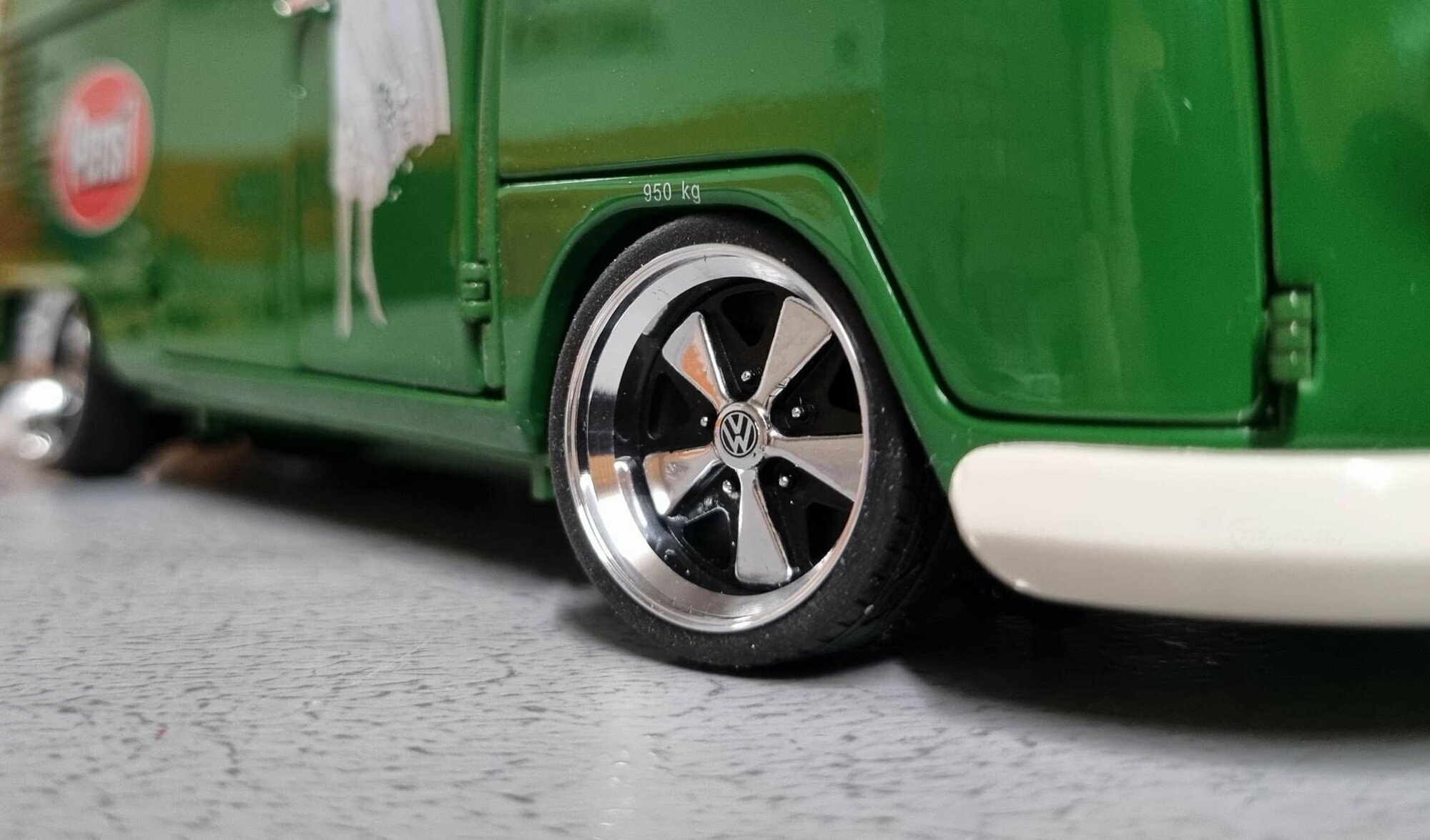 Die spezielle Gestaltung des Modells umfasst nicht nur die farbliche Anpassung, sondern auch Änderungen an den Rädern. Das Modell ist mit sportlichen, chromglänzenden Felgen ausgestattet, die die Dynamik und Leistungsfähigkeit des Volkswagen T1 unterstreichen. Leider kann der Hersteller der Felgen auf den Bildern nicht eindeutig identifiziert werden. Ein interessantes Detail ist auch das stilechte Nummernschild mit der Aufschrift "D-HP 60", was auf das Baujahr 1960 schließen lässt. Die detaillierte Nachbildung der Scheinwerfer und Rückleuchten steht ebenfalls für hohe Modellbaukunst. Daneben geben verschiedene vereinzelte Logos im Hintergrund der Werkstatt eine echte Werkstatt-Atmosphäre.