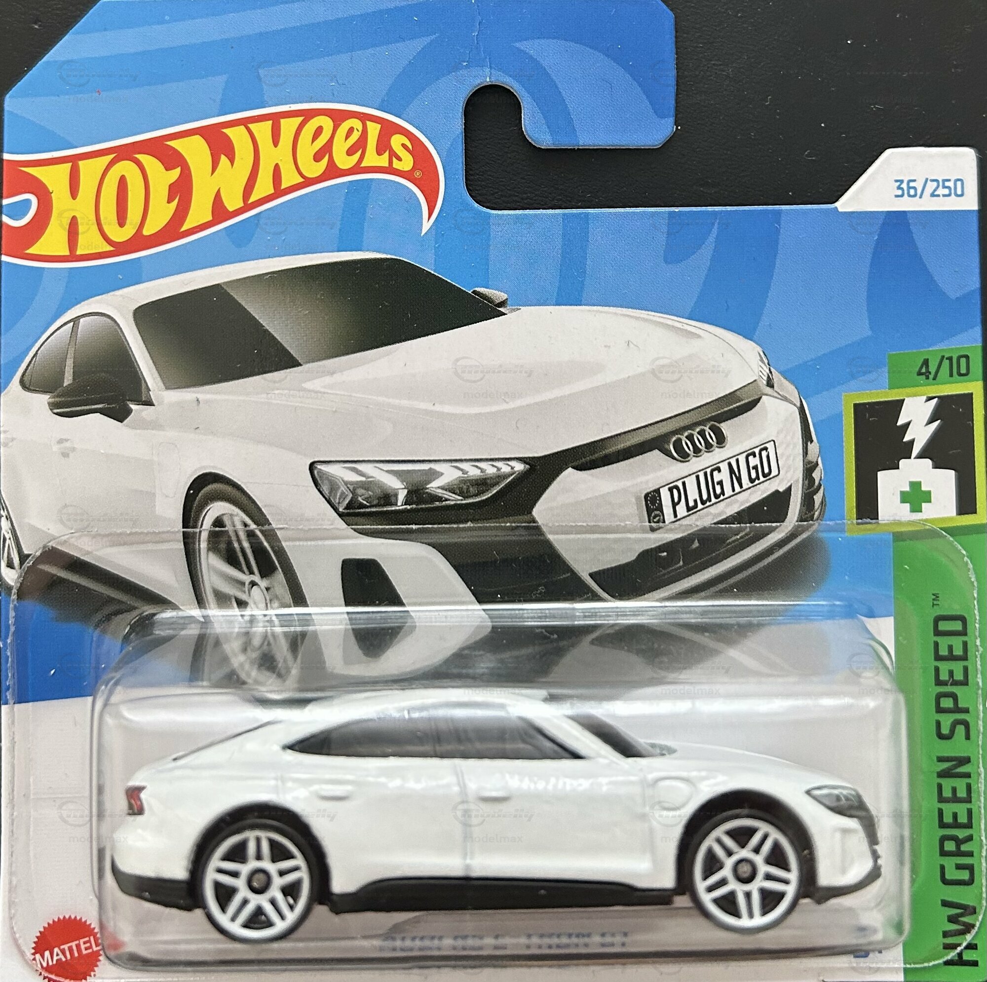 Das hier gezeigte Fahrzeug ist ein Modellauto im Maßstab 1:64 von Hot Wheels und gehört zur Sammlung des Modelly-Mitglieds „modelmax“. Die Miniatur bildet die Linien des Audi RS e-tron GT/Audi e-tron GT mit klar erkennbarer Frontsignatur, den schmalen Scheinwerfern und der seitlich angedeuteten Ladebuchse am vorderen Kotflügel nach. Auf der Blisterkarte steht „HW Green Speed“, das Modell ist als „4/10“ der Serie markiert und trägt die Sammlernummer „36/250“. Auf dem Kartonmotiv erscheint ein fiktives Kennzeichen „PLUG N GO“, dazu das grüne Energie-Symbol mit Blitz und Akku. Das Exemplar ist in Weiß ausgeführt; schwarze Einsätze an Schwellern und Stoßfängern setzen Kontraste, die Audi-Ringe sind vorn als Druck wiedergegeben. Die Rückleuchten sind rot bedruckt, der Singleframe ist dunkel abgesetzt. Der Innenraum wirkt ab Werk stark getönt, was der typischen Gestaltung dieser Reihe entspricht. Die Felgen sind fünfspeichig und weiß lackiert; es handelt sich um eine interne Felgenform von Hot Wheels, kein lizenzierter Felgenhersteller. Das Modell besteht aus Druckguss – also klassischem diecast-Material – mit Kunststoff-Bodenplatte und transparenten Scheiben. Geliefert wird es in der üblichen Blisterverpackung; das rote Mattel-Logo ist auf der Karte sichtbar. Dieses Modellauto im Maßstab 1:64 von Hot Wheels eignet sich damit gut für Sammler, die die Elektrobaureihe in kompakter Form dokumentieren möchten.