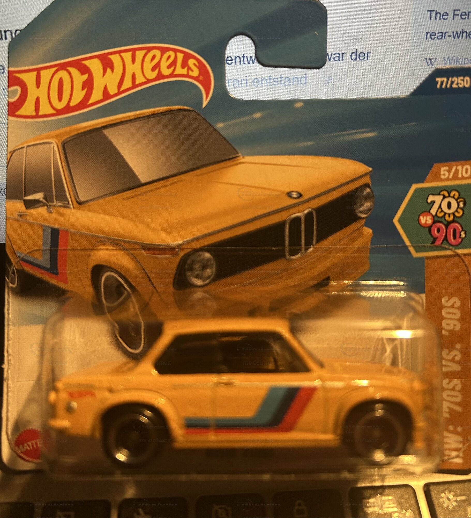 Der abgebildete Miniaturwagen ist ein Modellauto im Maßstab 1:64 von Hot Wheels aus Druckguss. Das Exemplar befindet sich in der Sammlung des Modelly-Mitglieds „modelmax“. Die Fotos zeigen eine gelbe Karosserie mit seitlichem Streifendekor in Hellblau, Dunkelblau und Rot, das optisch an die Farbwelt der BMW Motorsport GmbH erinnert. Auf der Motorhaube ist das BMW-Rundel zu erkennen, vorne ein schwarzen Grill mit silbern gefasstem Doppelniere-Motiv und angedeuteten Rundscheinwerfern. Der Kartonträger trägt den Hinweis „70’s vs 90’s“ und die Positionsangabe „5/10“, was auf eine thematische Serie schließen lässt. Das Modell nutzt eine Karosserie aus Diecast-Metall, kombiniert mit einem Kunststoff-Chassis und einem ebenfalls schwarzen Interieur. Die Scheiben erscheinen leicht getönt. Die Räder sind schwarze Mehrspeichenräder im typischen internen Design, ein realer Felgenhersteller ist dabei nicht eindeutig erkennbar. Maßstäblich entspricht die Länge eines realen BMW 2002 von ungefähr 4,23 m in 1:64 etwa 66 mm, was gut mit dem hier gezeigten Modell übereinstimmt. Das Finish zeigt saubere Tampondrucke an Front und Flanken; die Rückseite wirkt bei dieser Gussform eher schlicht, was der typischen Reduktionsweise für diese Serie entspricht.