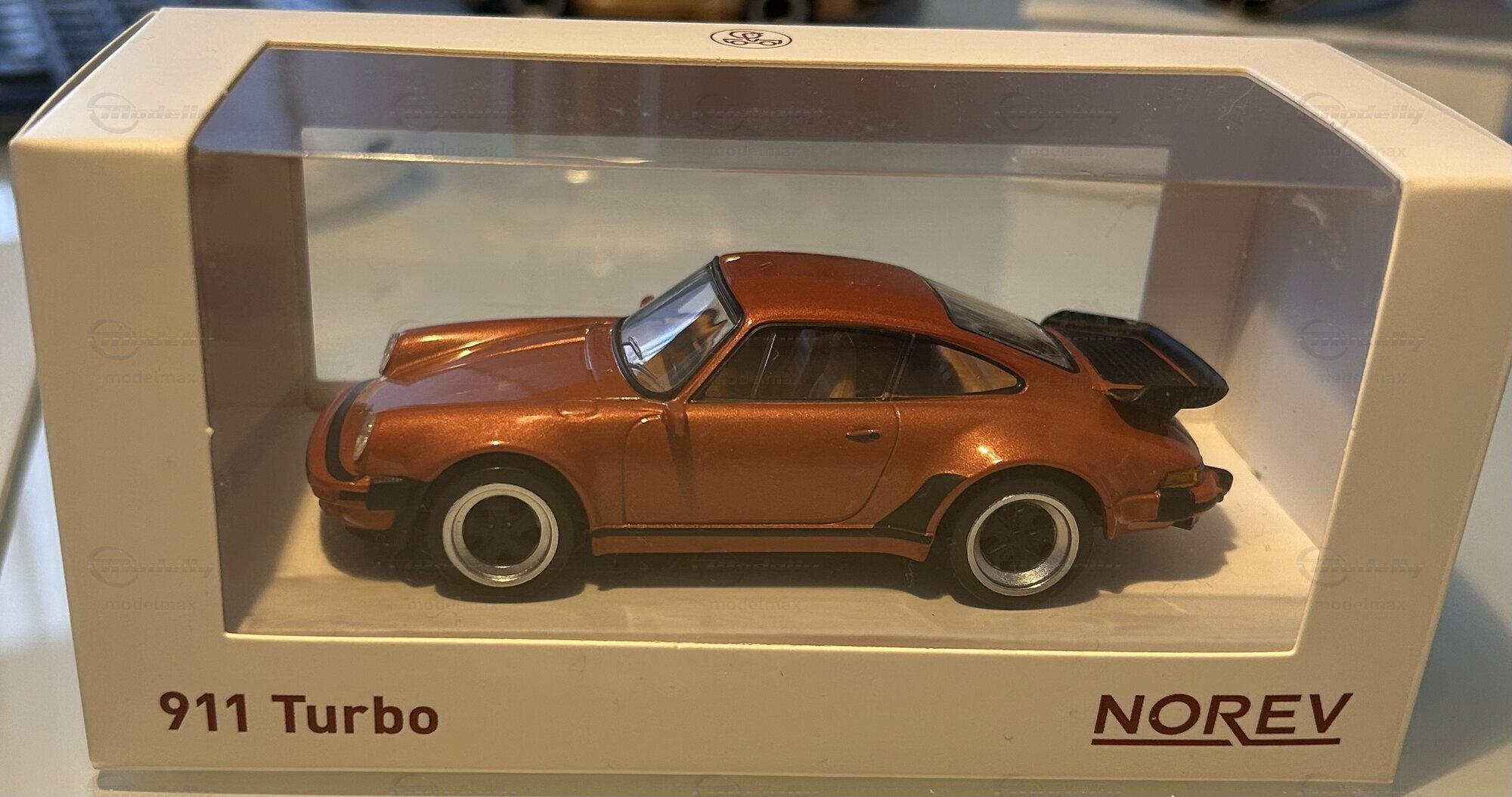 Das hier gezeigte Miniaturfahrzeug gehört zur Sammlung des Modelly-Mitglieds „modelmax“ und bildet den Porsche 911 Turbo in der gängigen Vitrinengröße 1:43 ab. Es handelt sich um ein Modellauto im Maßstab 1:43 des Herstellers Norev. Gefertigt ist die Karosserie aus Diecast-Druckguss, was eine gleichmäßige Oberflächenqualität und ein spürbares Eigengewicht ermöglicht. Die Fotos zeigen eine Lackierung in einem kupferbraunen Metallic-Ton, der an zeitgenössische Porsche-Farbprogramme wie „Copper Brown Metallic“ erinnert. Der Glanzgrad und die sichtbaren Metallic-Partikel unterstreichen die Linien des 930: die vorderen Kotflügelwölbungen, die stark ausgeformten hinteren Backen und den schwarzen „Walschwanz“-Heckspoiler. Front- und Heckschürzen sind mit schwarzen Gummileisten versehen, wie beim Original. Die Räder greifen die Optik der Fuchs-Felgen mit schwarzem Stern und poliertem Felgenhorn auf; diese Radgestaltung war eine der markanten Erkennungen des Porsche 911 Turbo. Hinter den klaren Scheiben ist eine dunkelbraune Innenausstattung zu erkennen, einschließlich Vordersitzen, Rückbank und Armaturenbrett. Der Gesamteindruck wirkt maßstäblich geschlossen: kurze Überhänge, flach ansteigende Fronthaube, sanft abfallendes Dach und die steil stehende Heckklappe. Verpackt ist das Modell in einer weißen Vitrinenbox mit transparentem Sichtfenster; auf dem Sockel ist „911 Turbo“ angegeben, und die Herstellerkennung Norev ist deutlich aufgedruckt.
