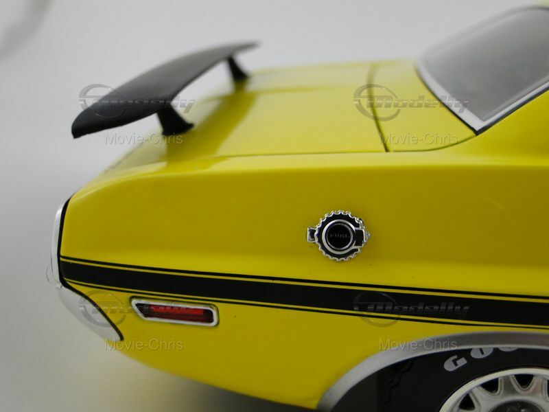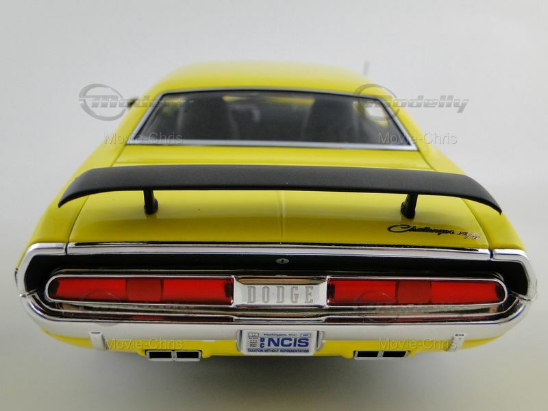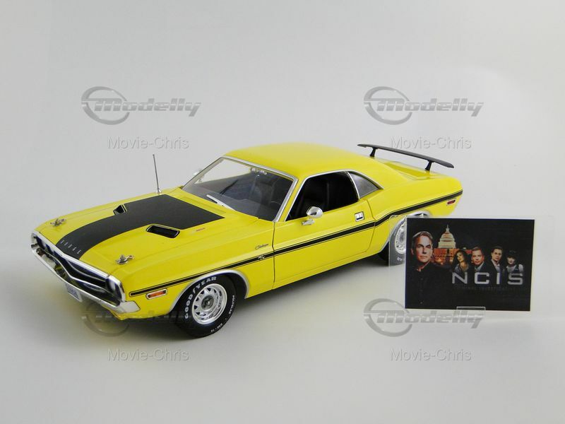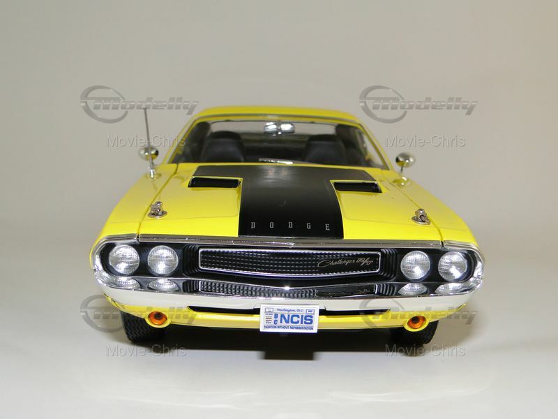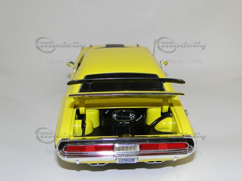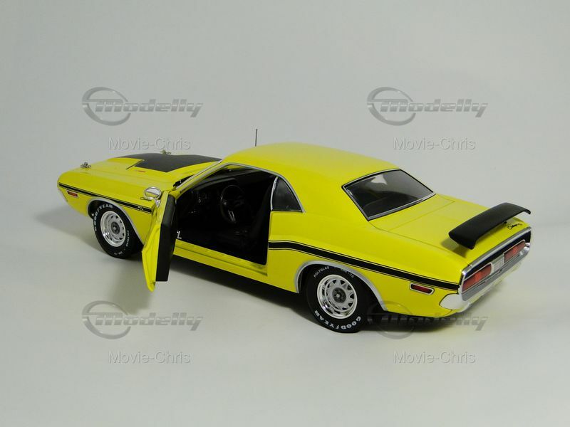 Dieses Modellauto im Maßstab 1:18, hergestellt von Greenlight, ist besonders detaillgetreu und ein wertvolles Sammlerstück. Es ist Teil der Sammlung des Modelly-Mitglieds "Movie-Chris". Der Miniatur-Nachbau des Dodge Challenger R/T zeigt bemerkenswerte Detailgenauigkeit und ist in einem auffälligen Gelb mit schwarzen Streifen lackiert. Auf den Fotos ist zu sehen, dass der Modellnachbau bewegliche Türen und ein detaillierter Innenraum hat. Die präzise Nachbildung des Cockpits, der Sitze und der Armaturen hebt die Qualität dieses Modellfahrzeugs hervor. Ein weiteres Highlight des Modells sind die originalgetreuen Goodyear-Reifen und die detaillgetreue Nachbildung der Lackierung des Originals mit den charakteristischen schwarzen Streifen und der mattschwarzen Motorhaube.